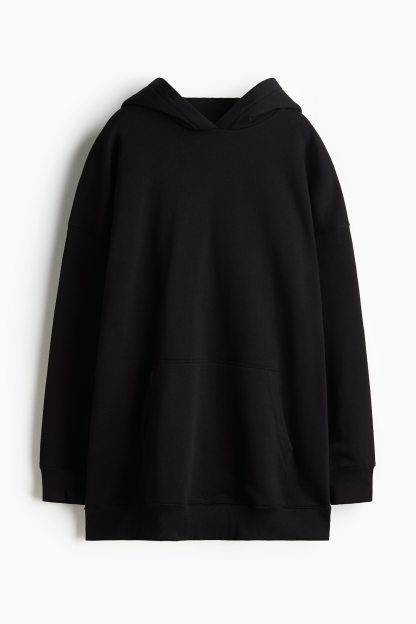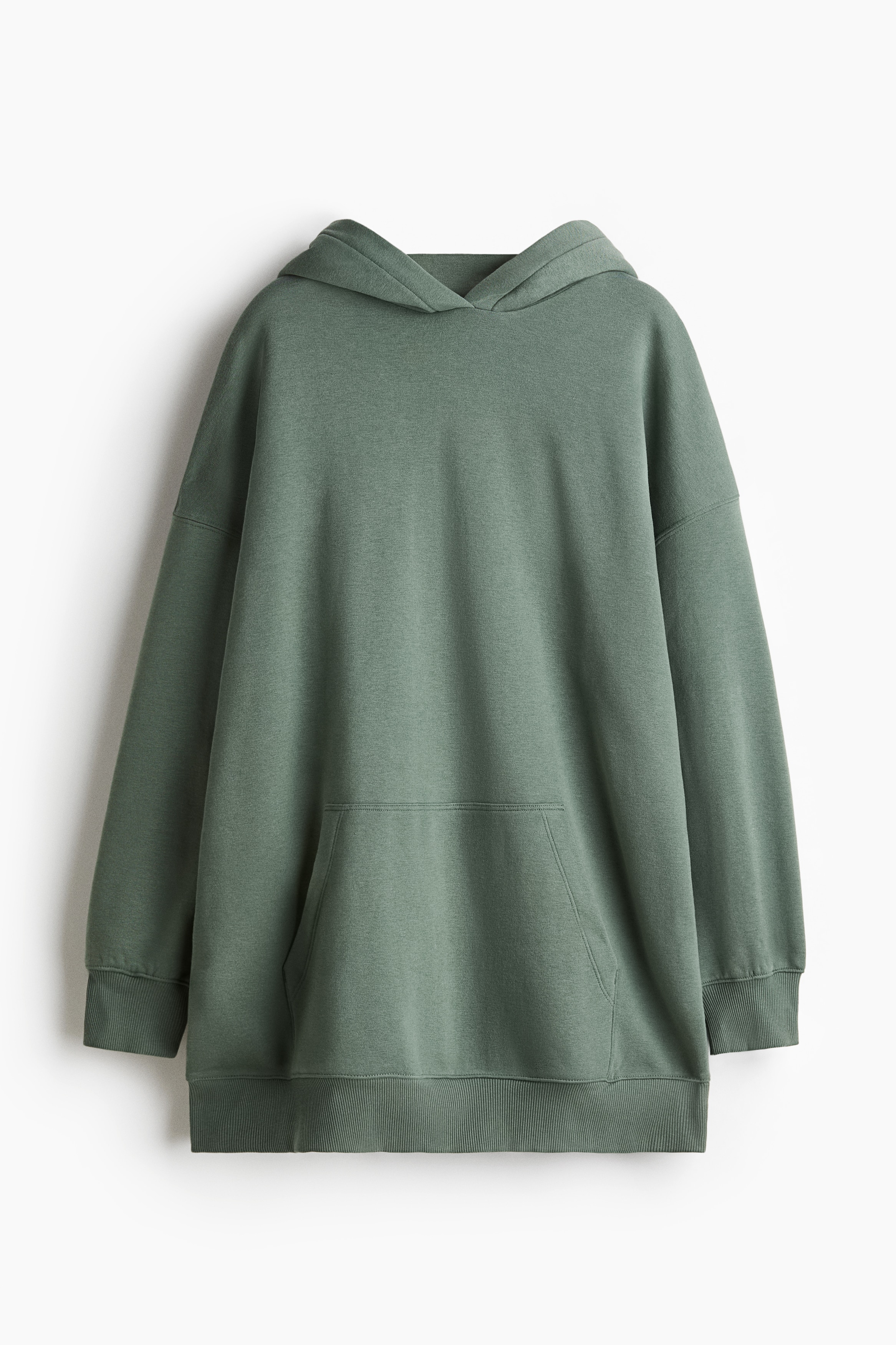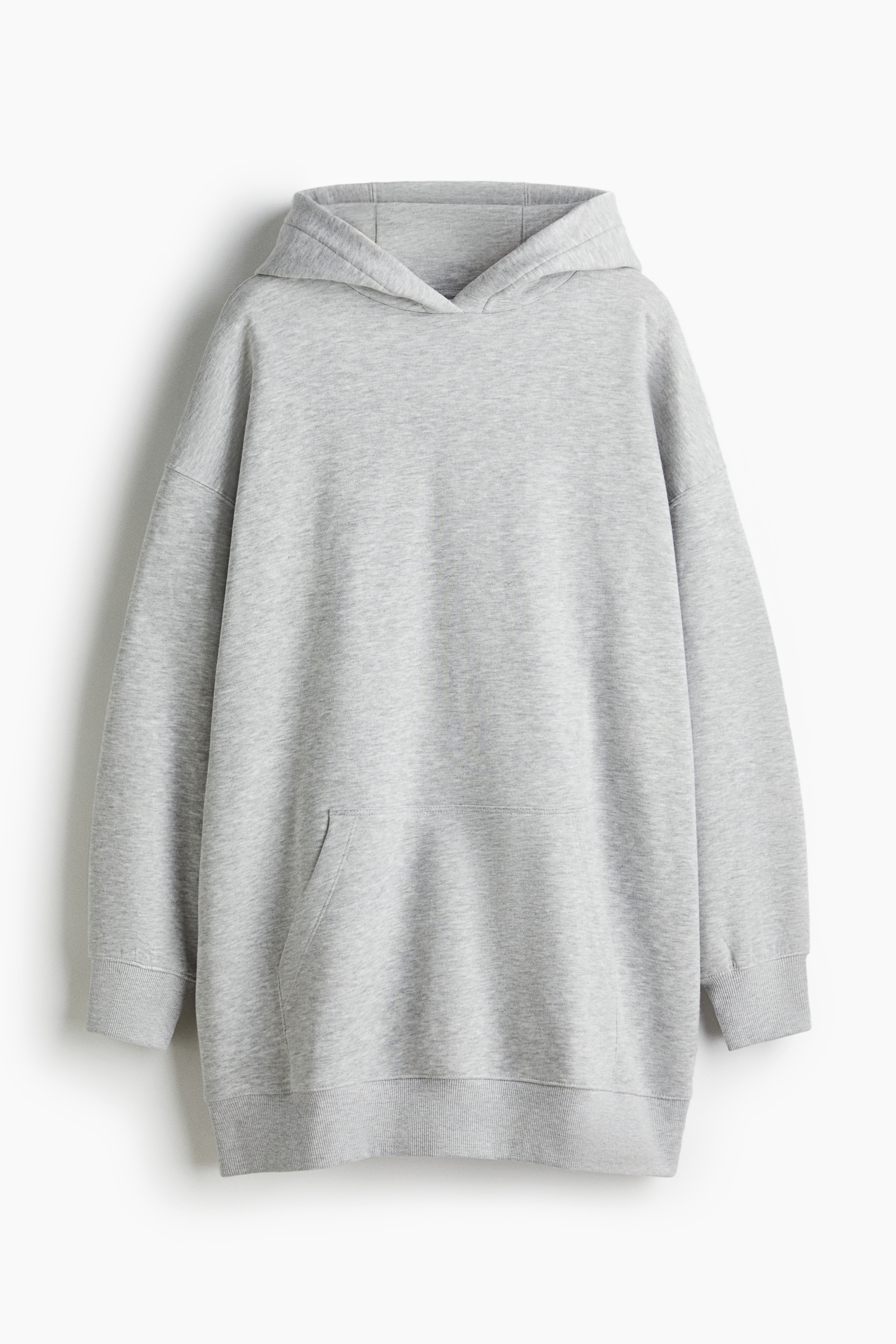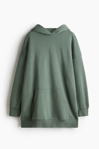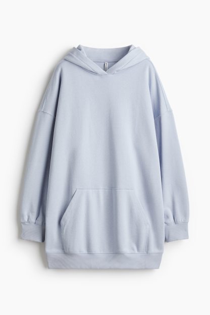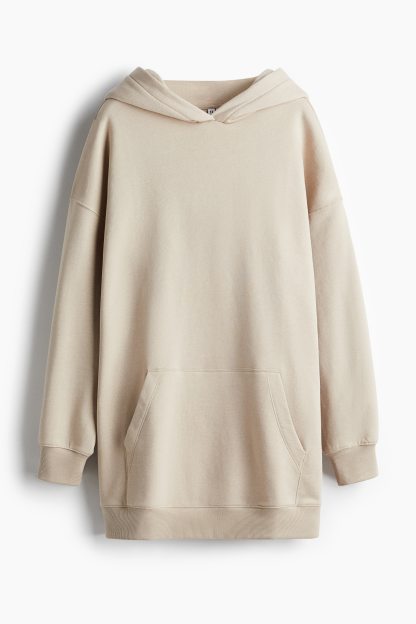 Short, oversized dress in sweatshirt fabric with a soft brushed inside. Lined, wrapover hood, low dropped shoulders and long sleeves. Kangaroo pocket and ribbing at the cuffs and hem.