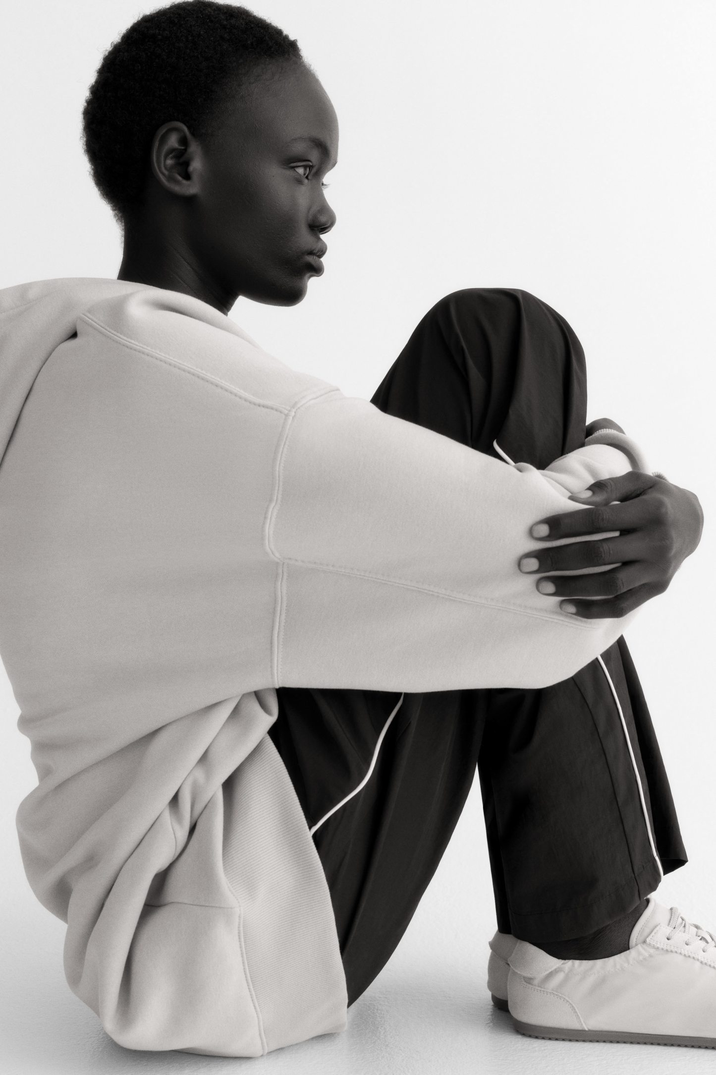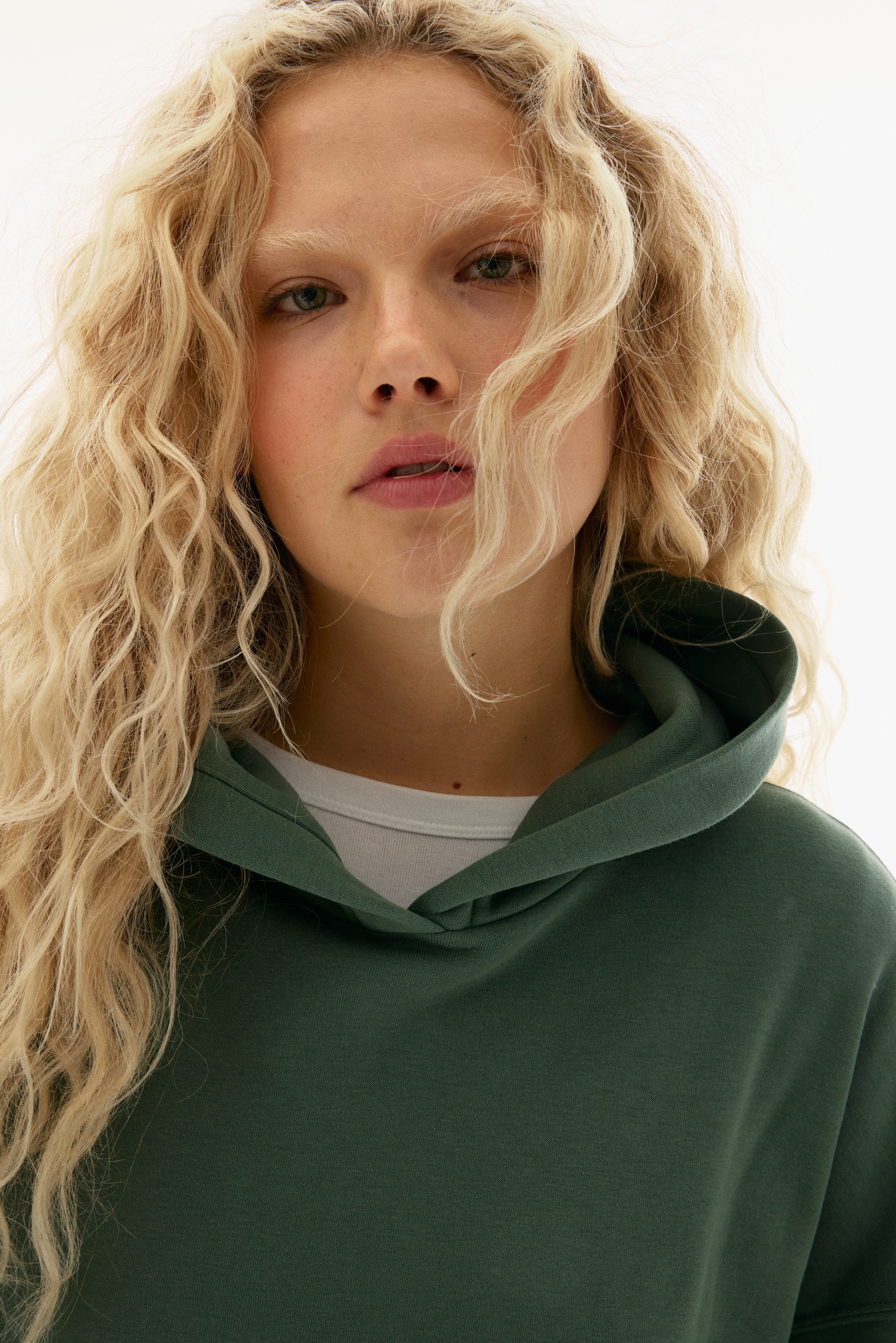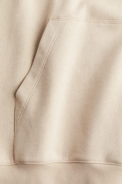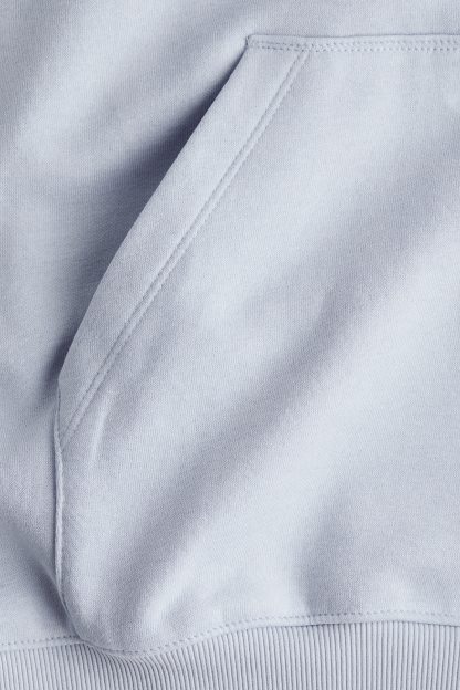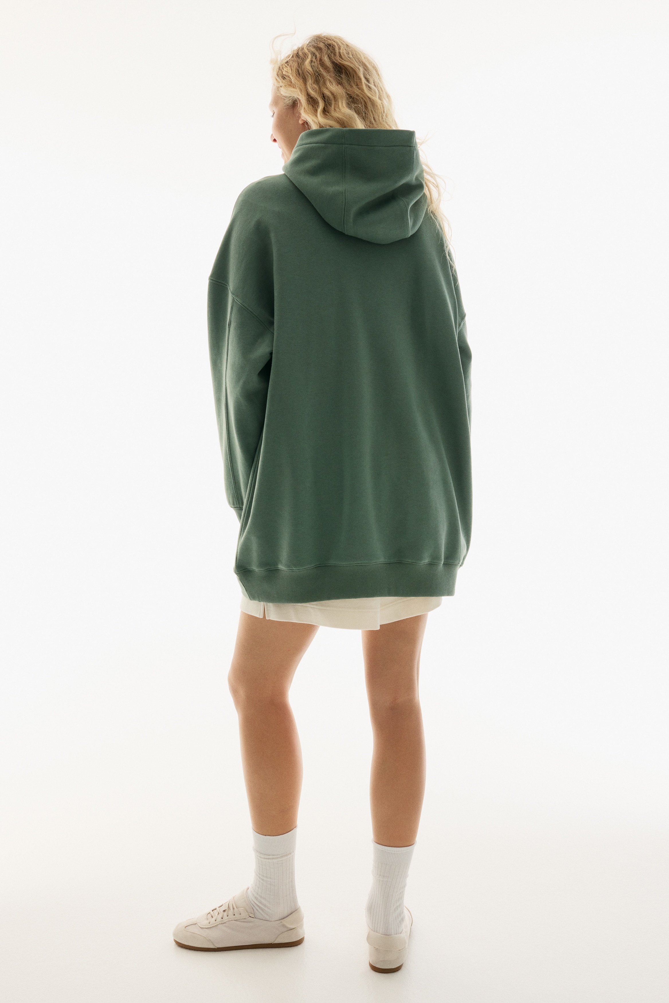Short, oversized dress in sweatshirt fabric with a soft brushed inside. Lined, wrapover hood, low dropped shoulders and long sleeves. Kangaroo pocket and ribbing at the cuffs and hem.