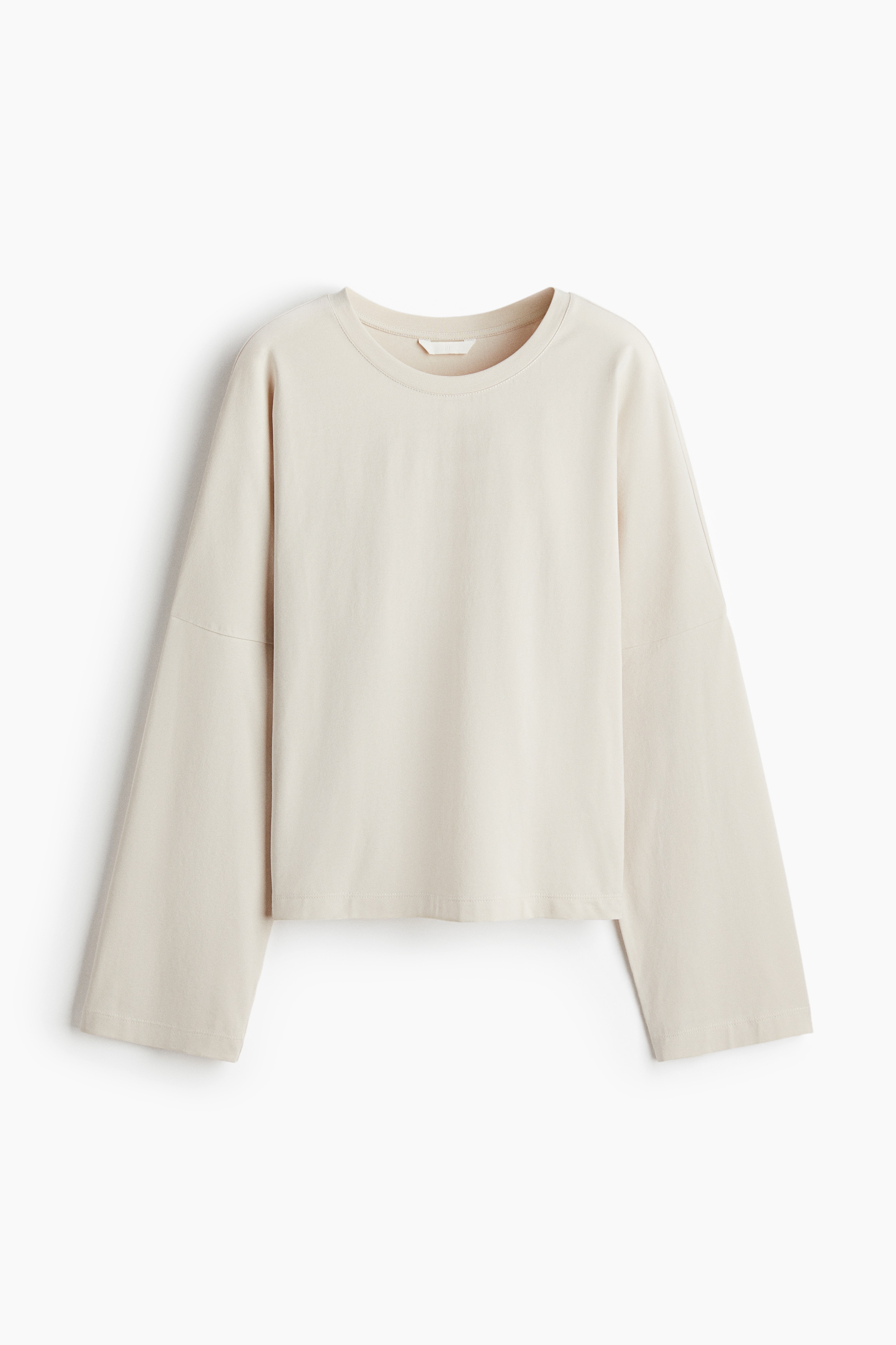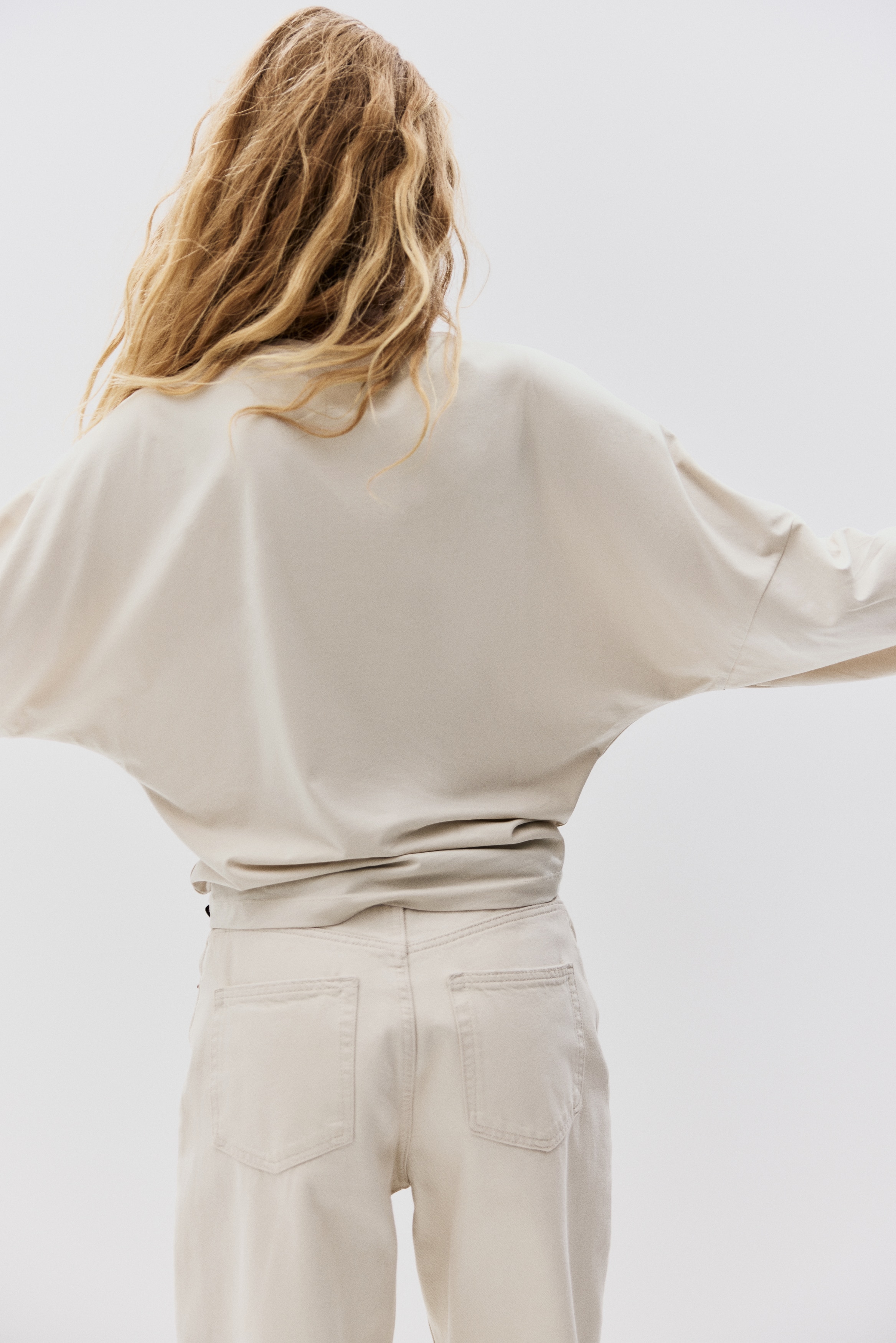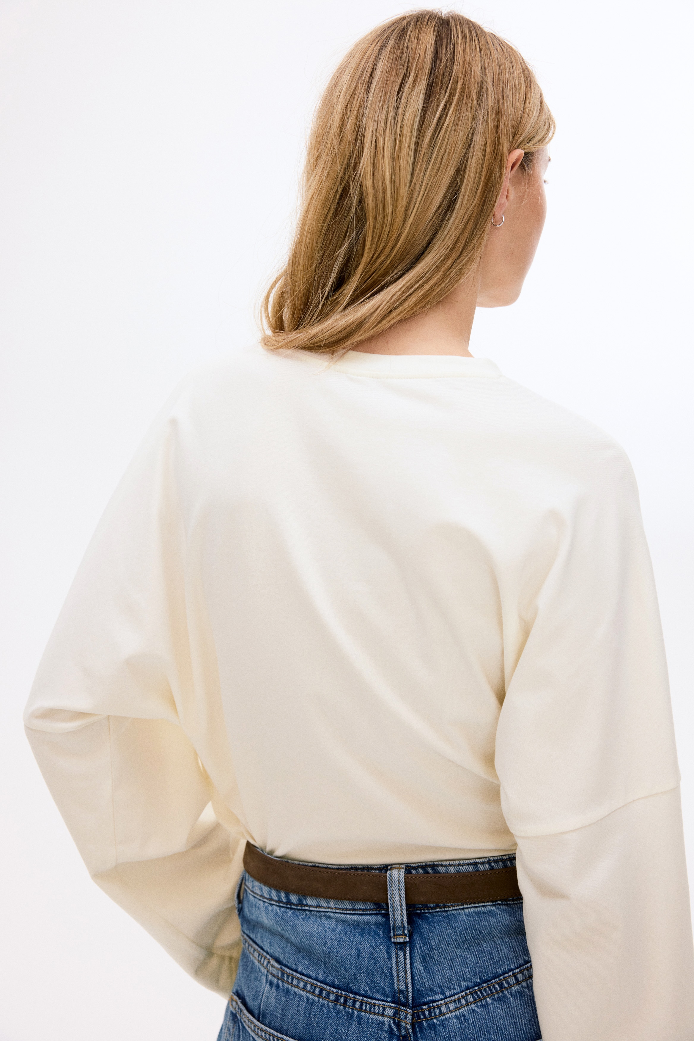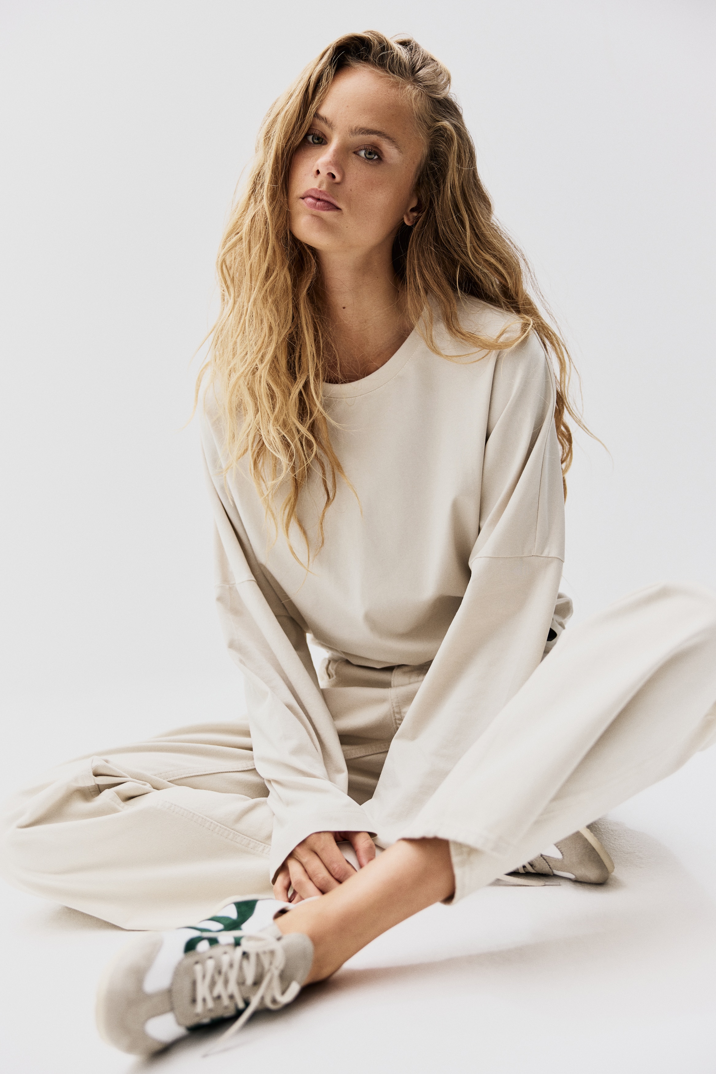 Fitted top in soft cotton jersey with a round neckline and long sleeves. Low dropped shoulders that add a slouchy effect.