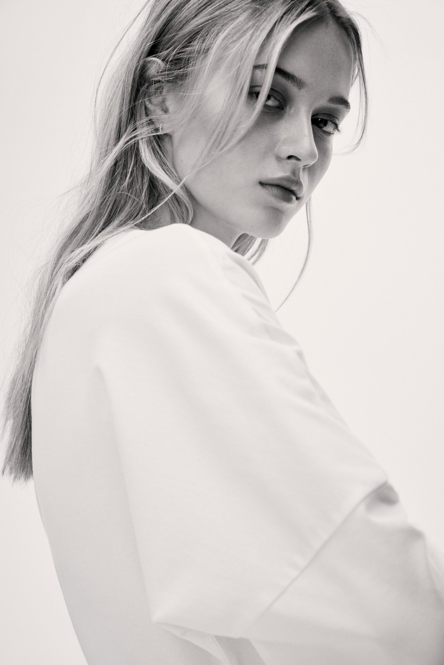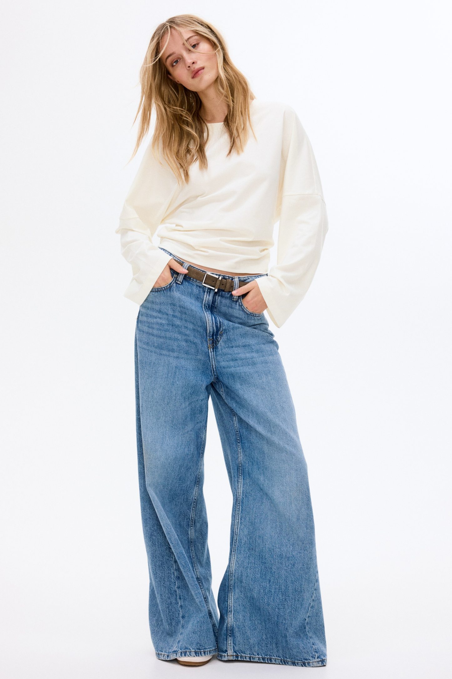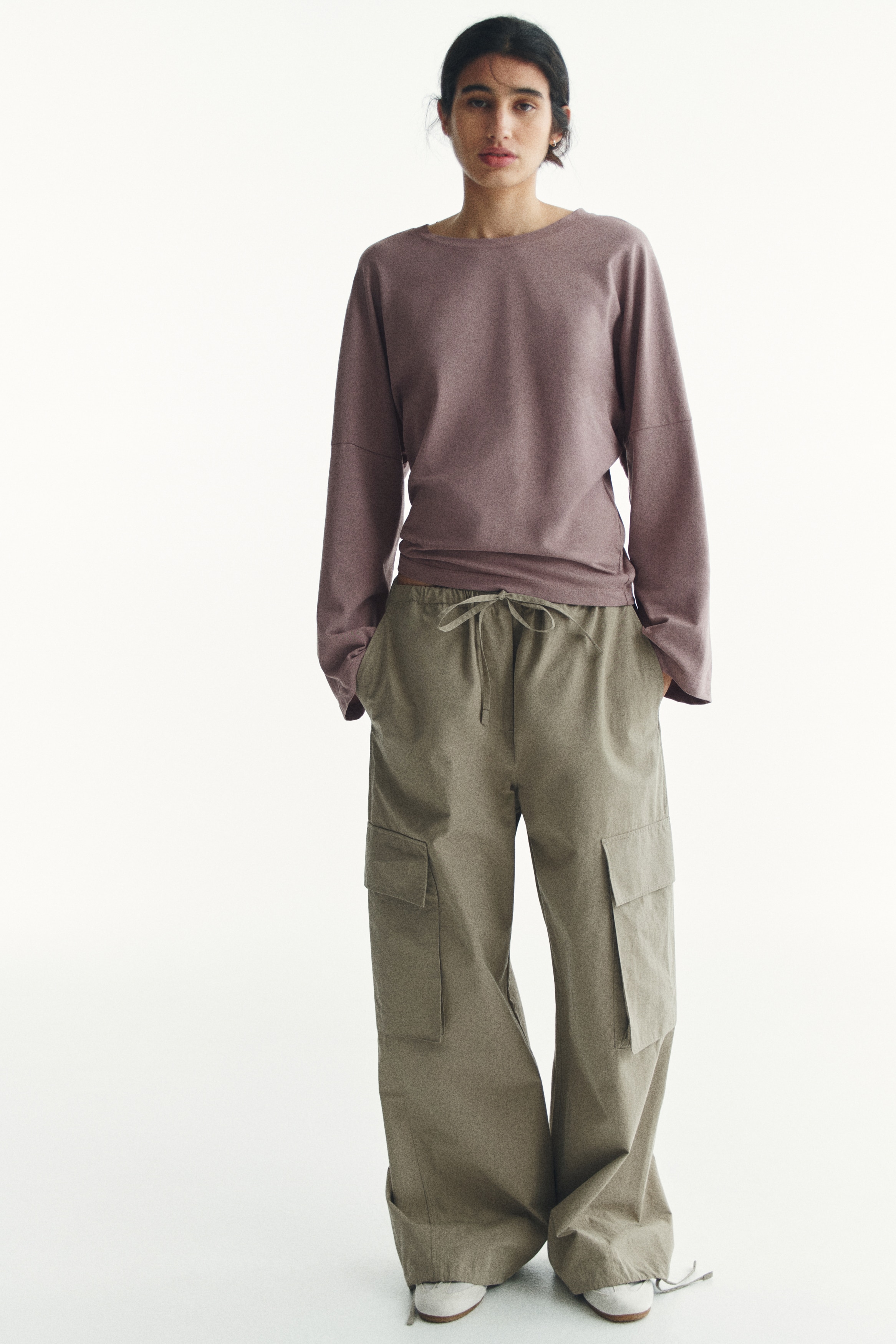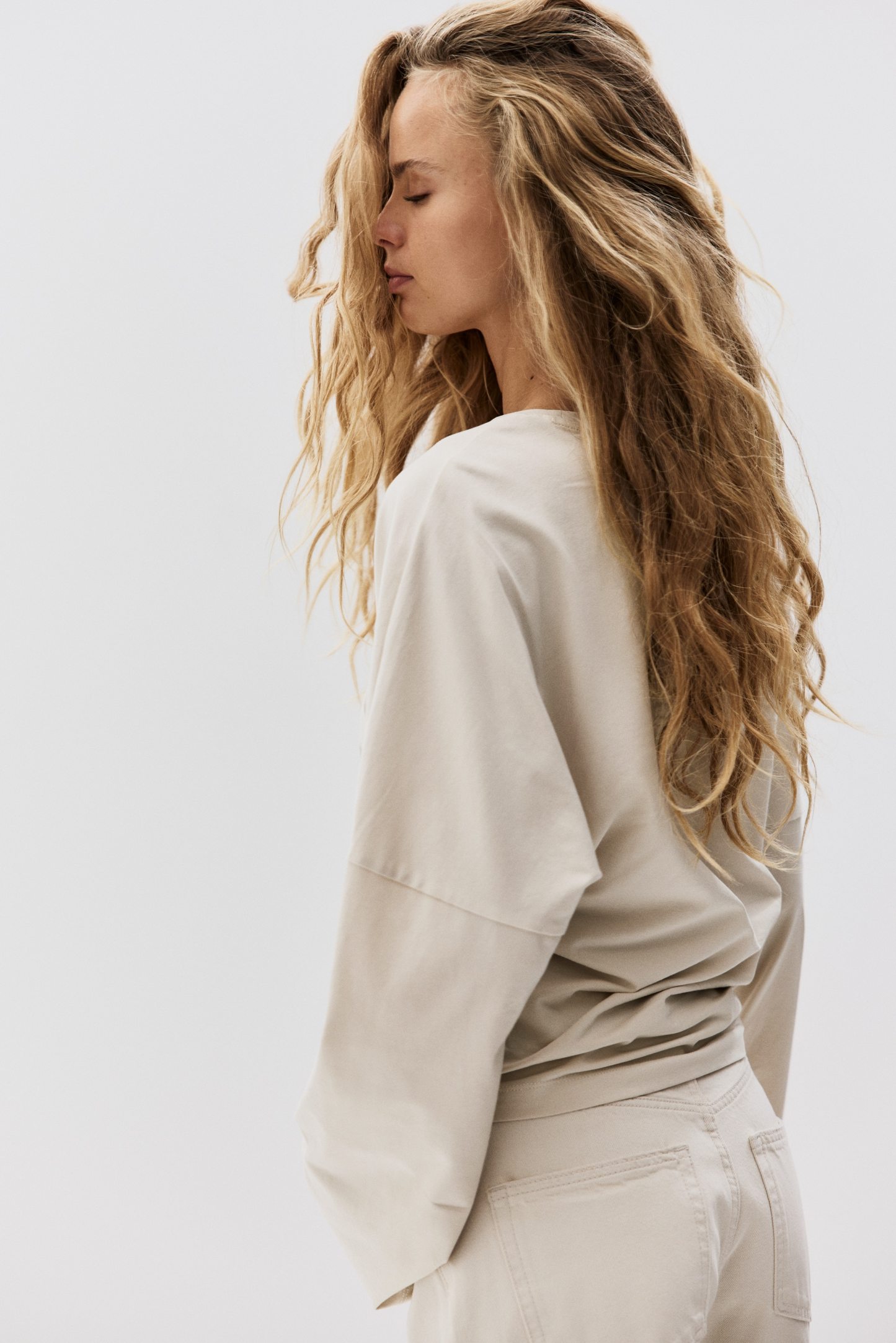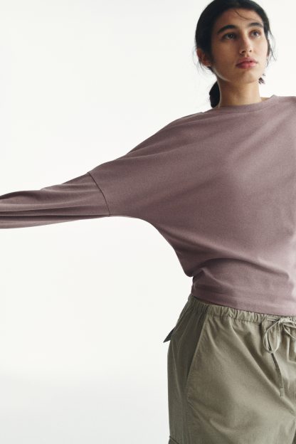 Fitted top in soft cotton jersey with a round neckline and long sleeves. Low dropped shoulders that add a slouchy effect.