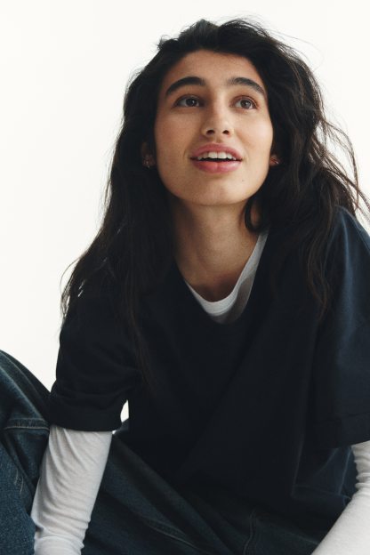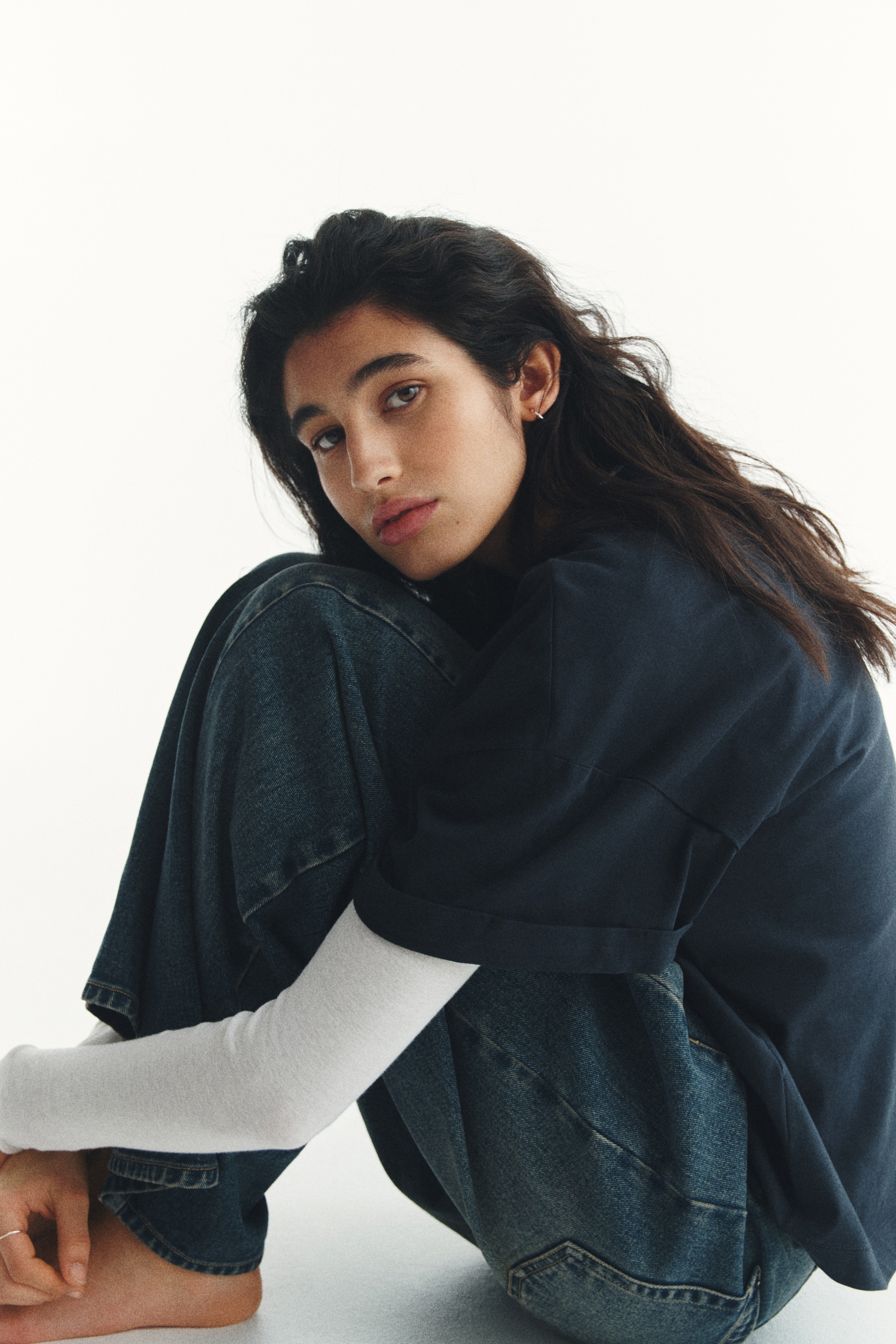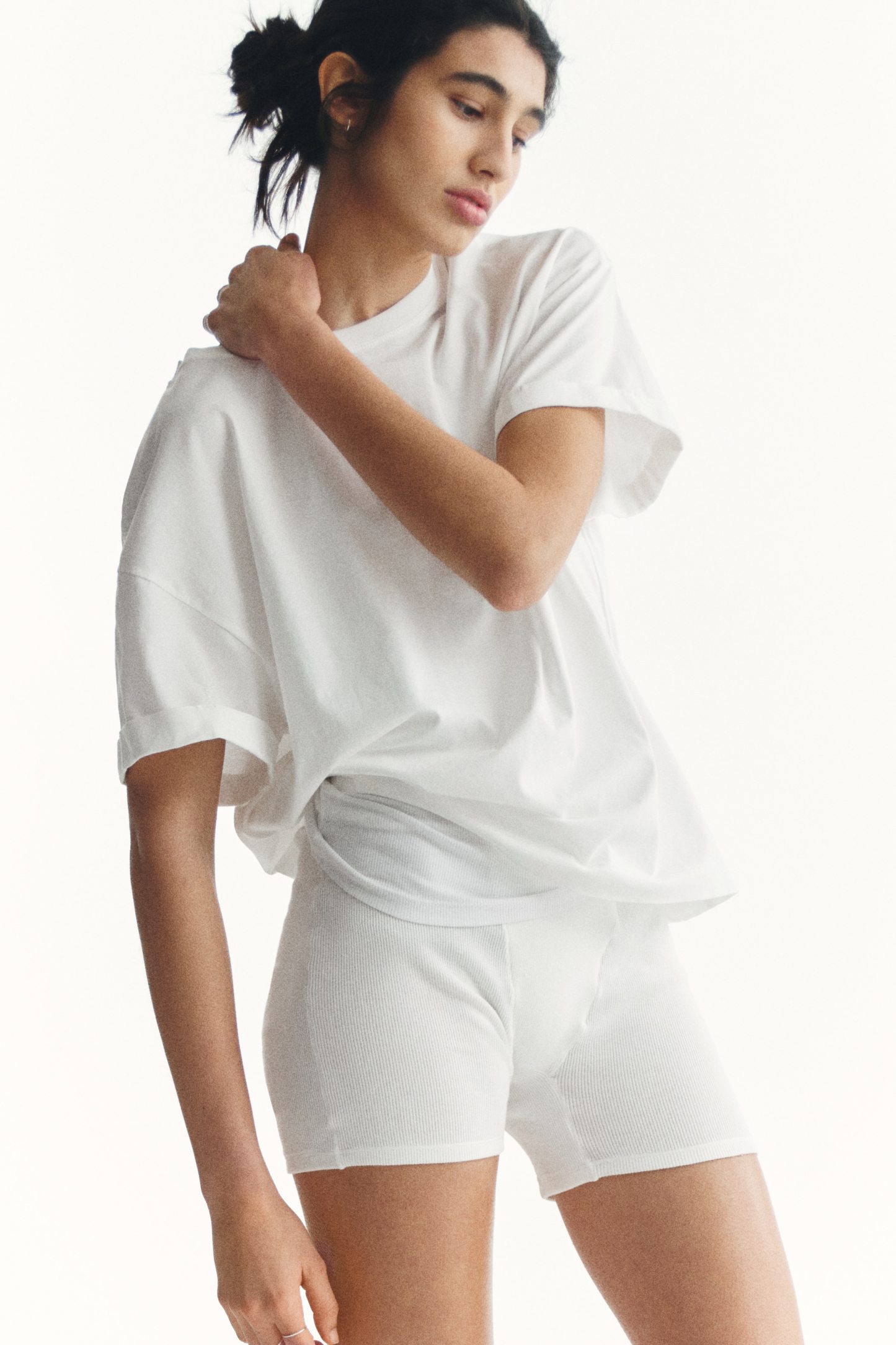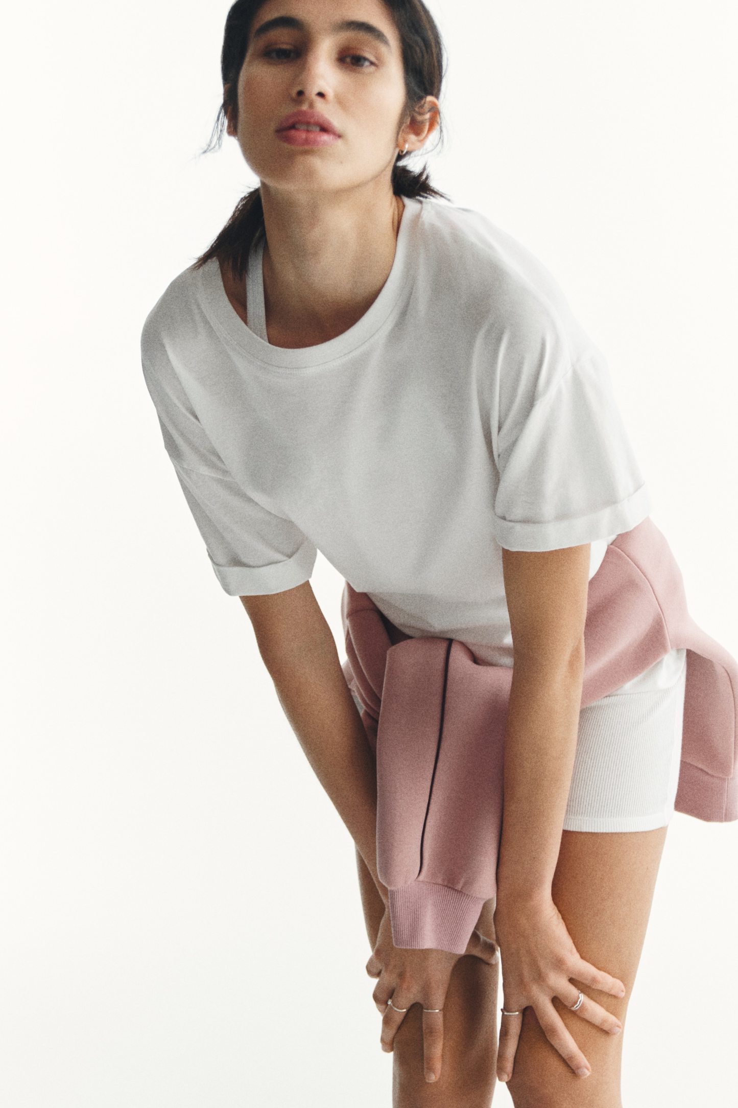 Loose-fit T-shirt in soft cotton jersey with a ribbed trim around the neckline, dropped shoulders and a sewn-in turn-up at the cuffs.