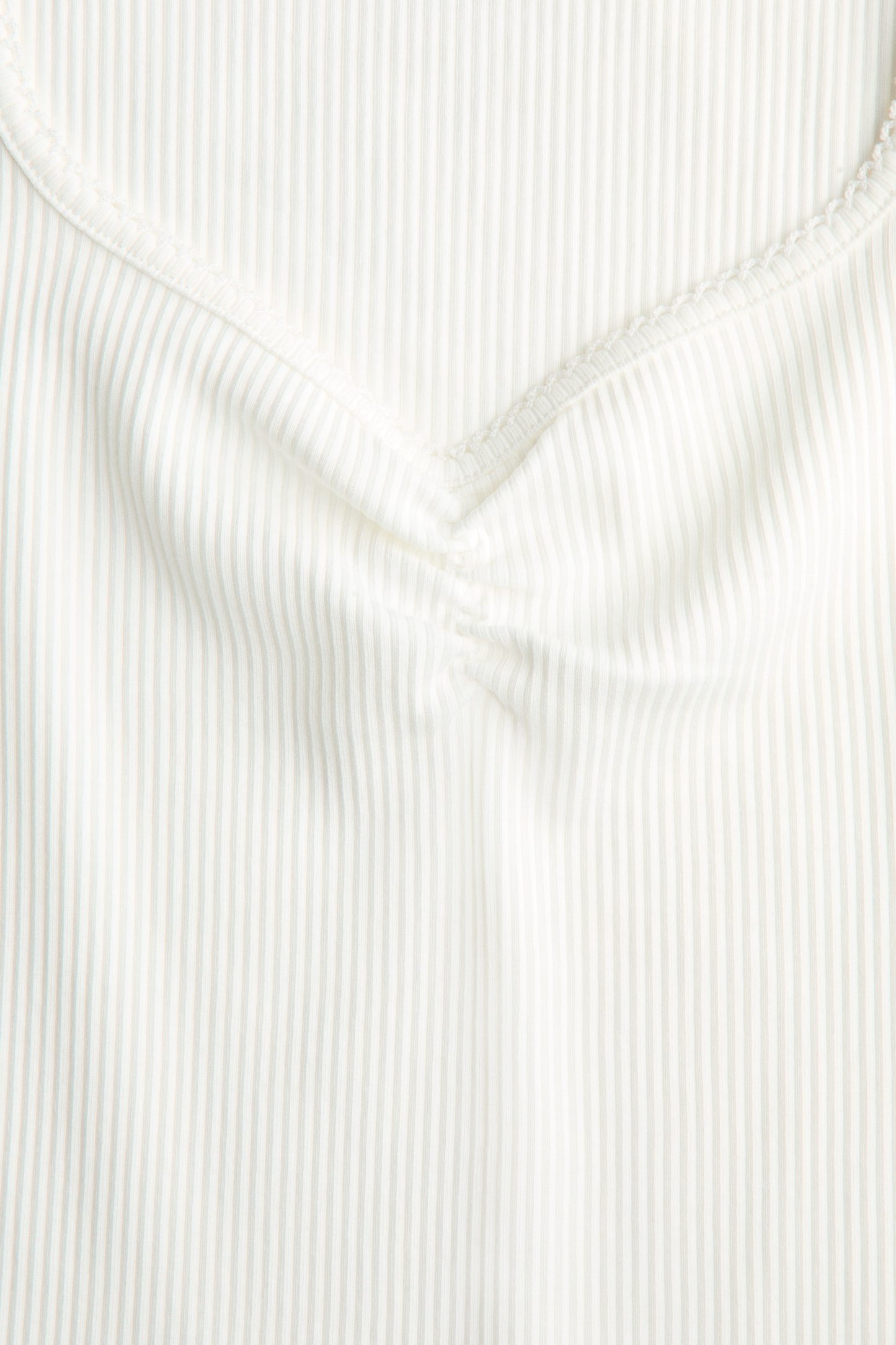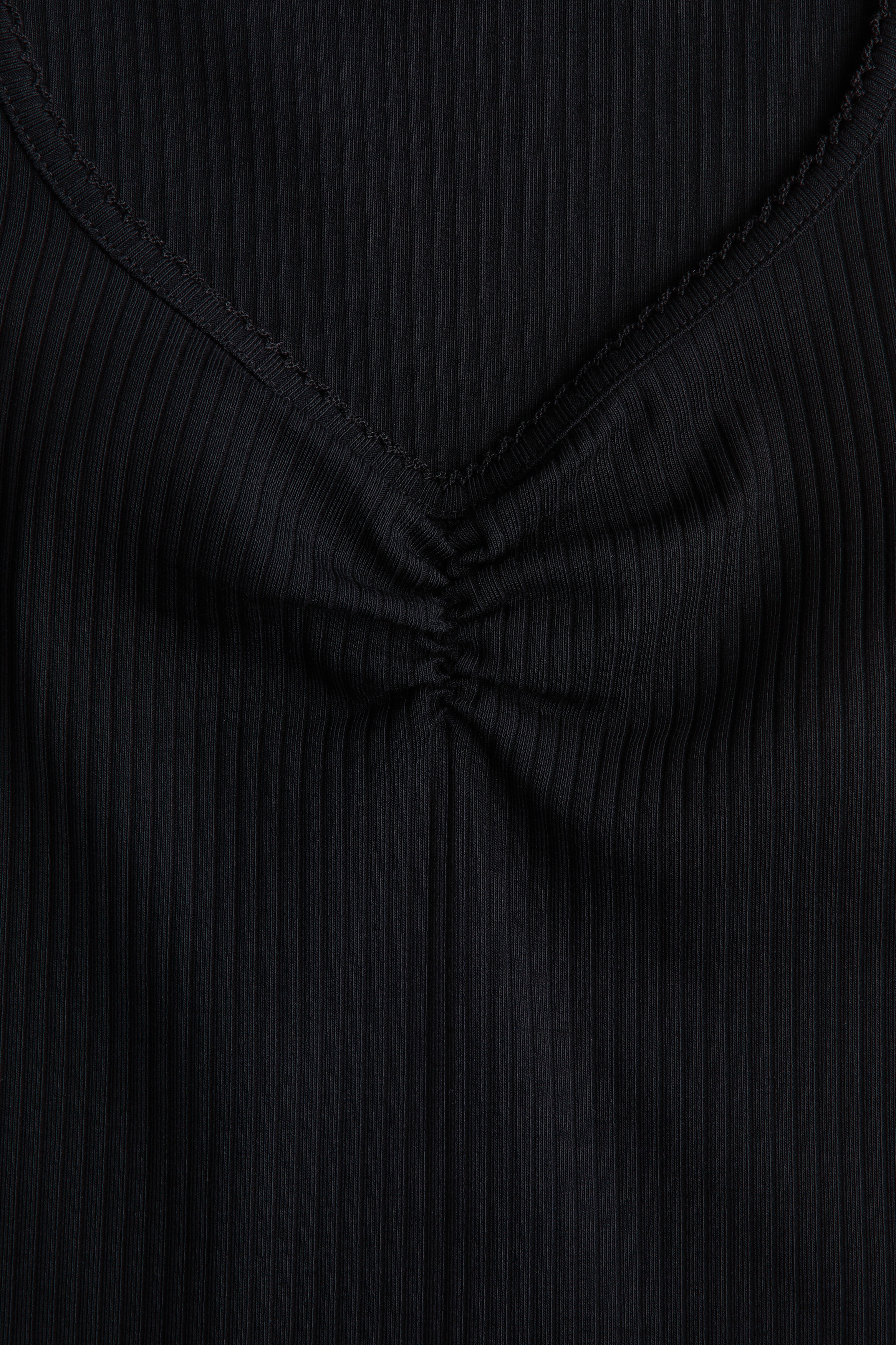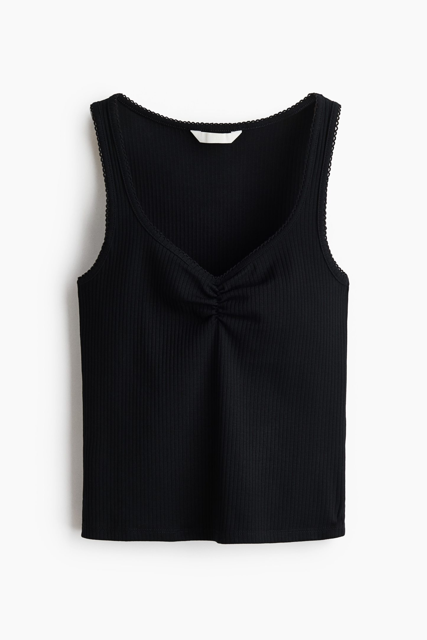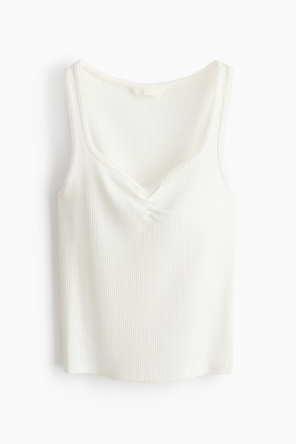 Fitted vest top in ribbed cotton jersey with a sweetheart neckline and a ruched seam at the front. Features a delicate picot trim around the neckline and armholes.