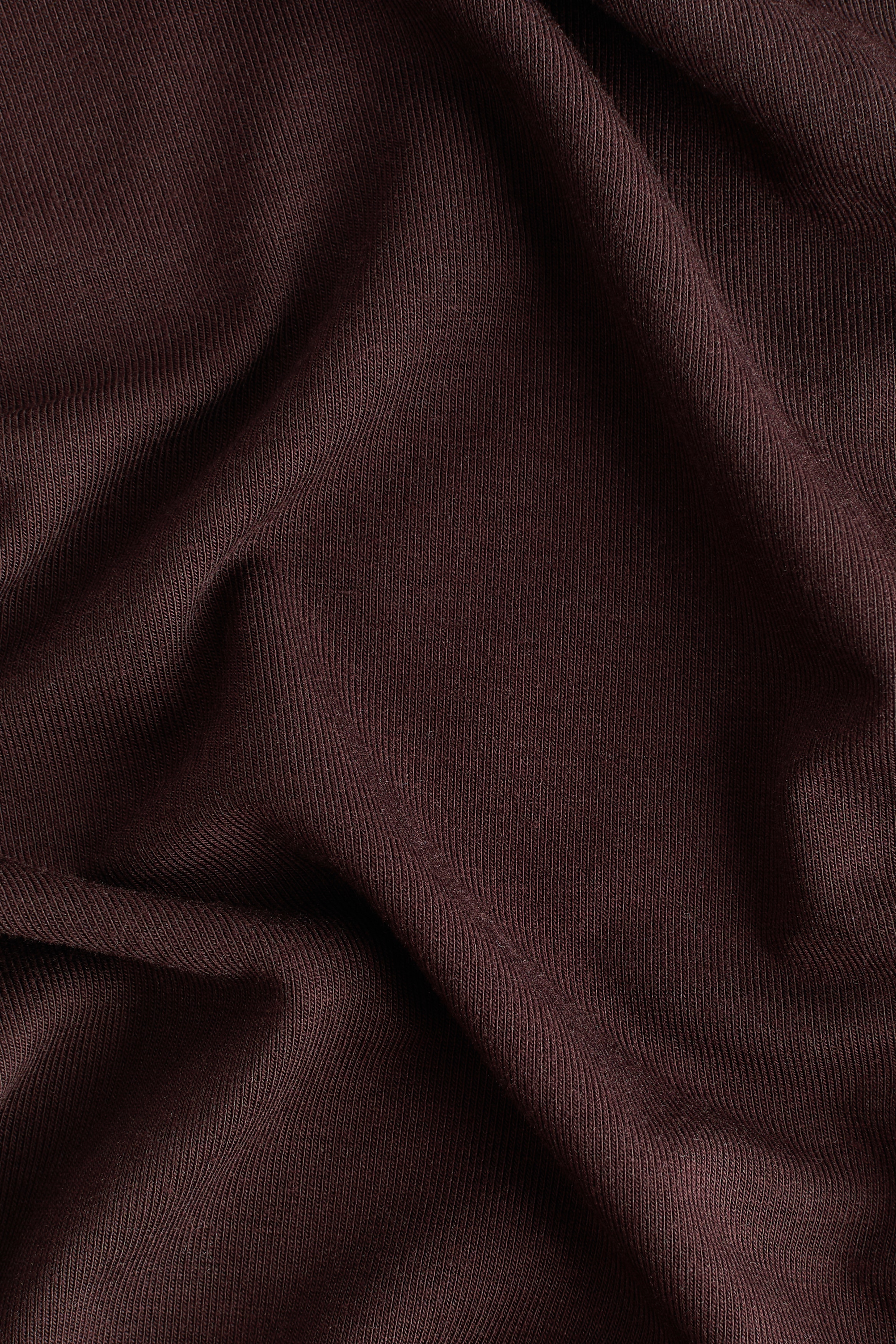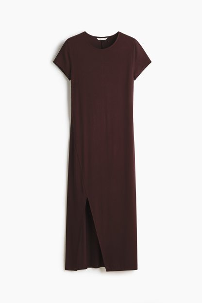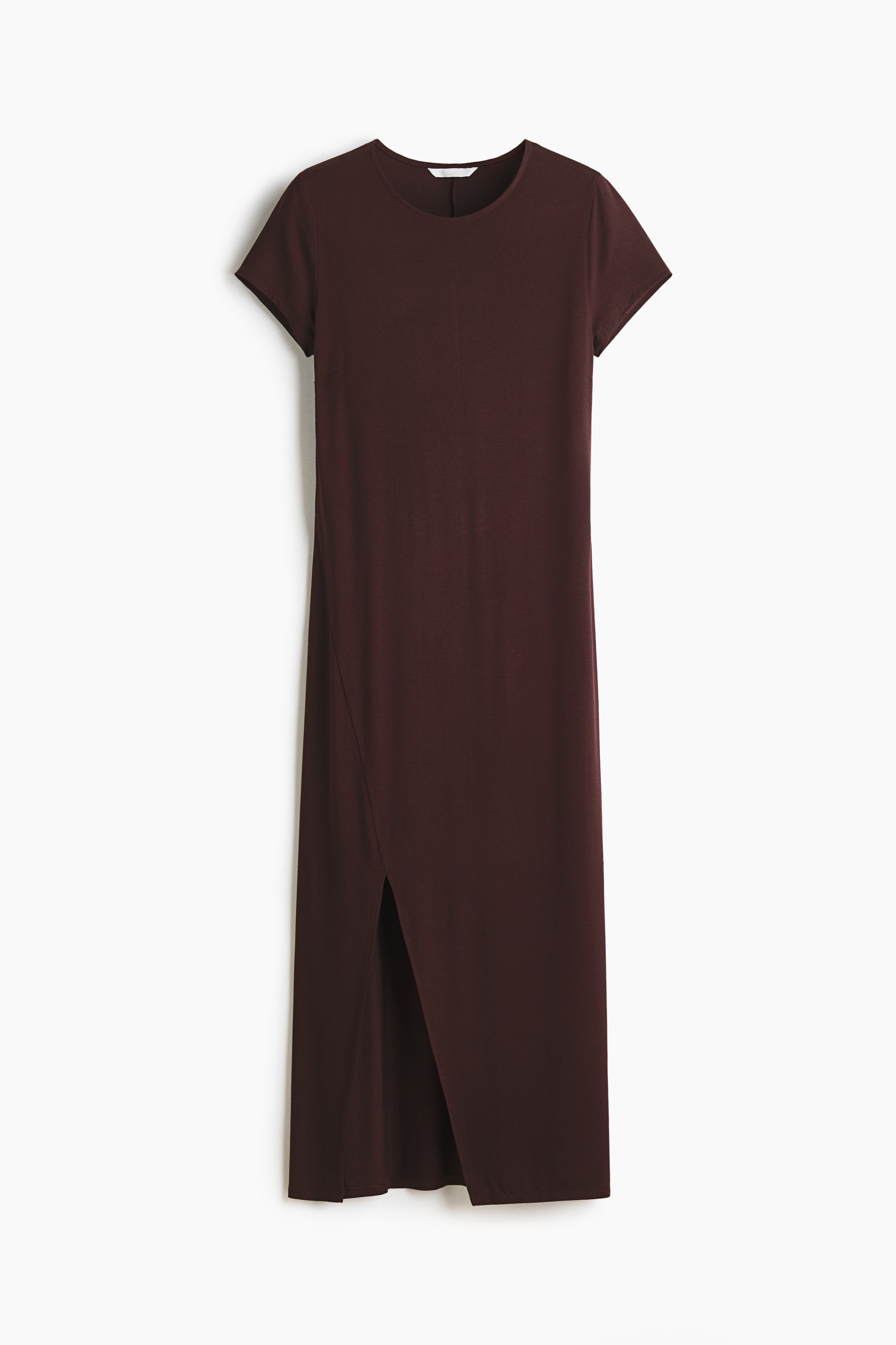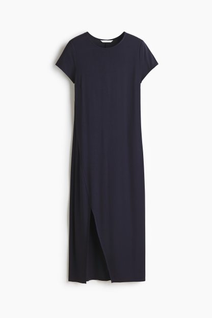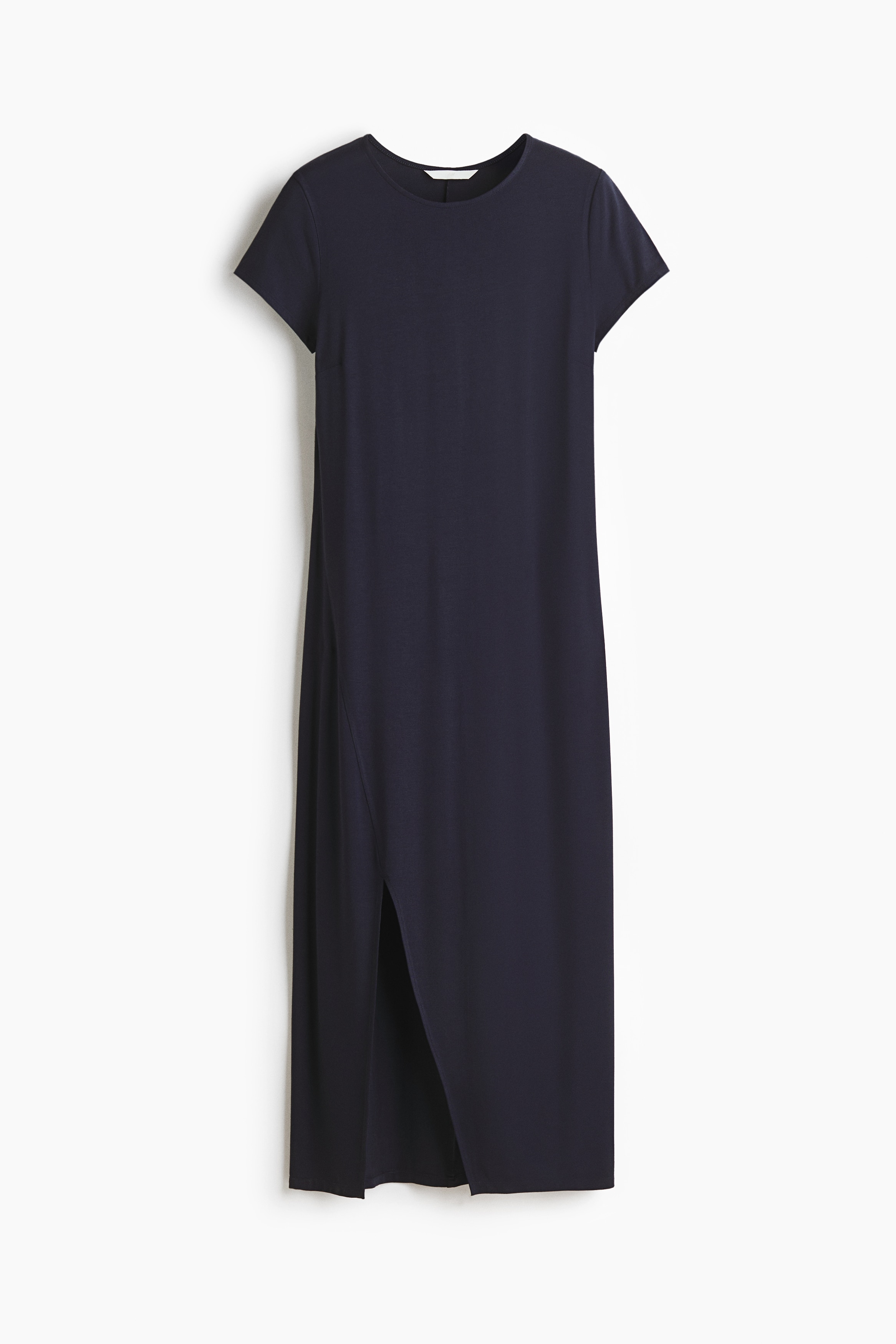 Calf-length dress in stretch viscose jersey with a round neckline, short sleeves and a forward-facing side seam that opens up to a slit towards the hem.