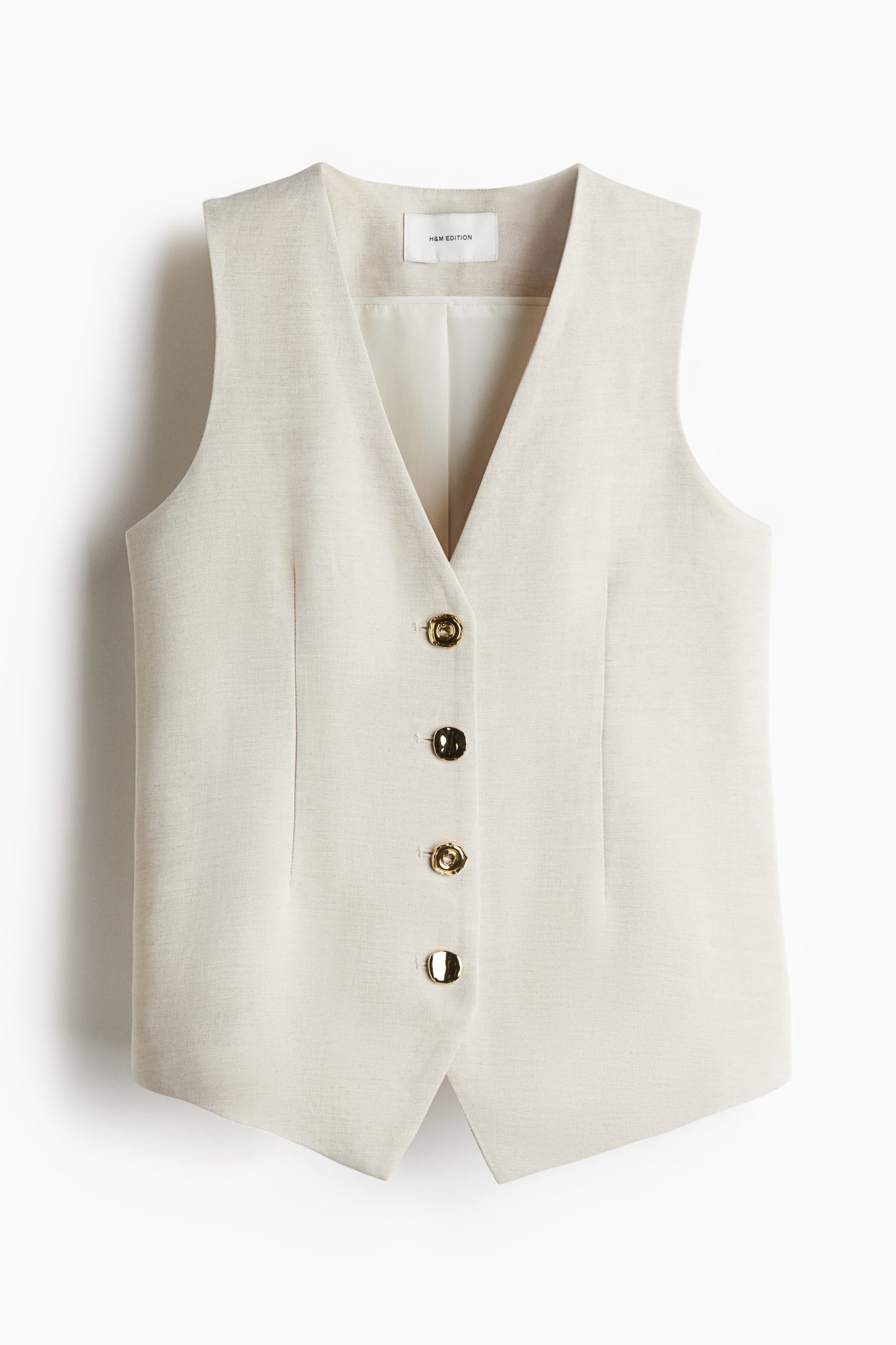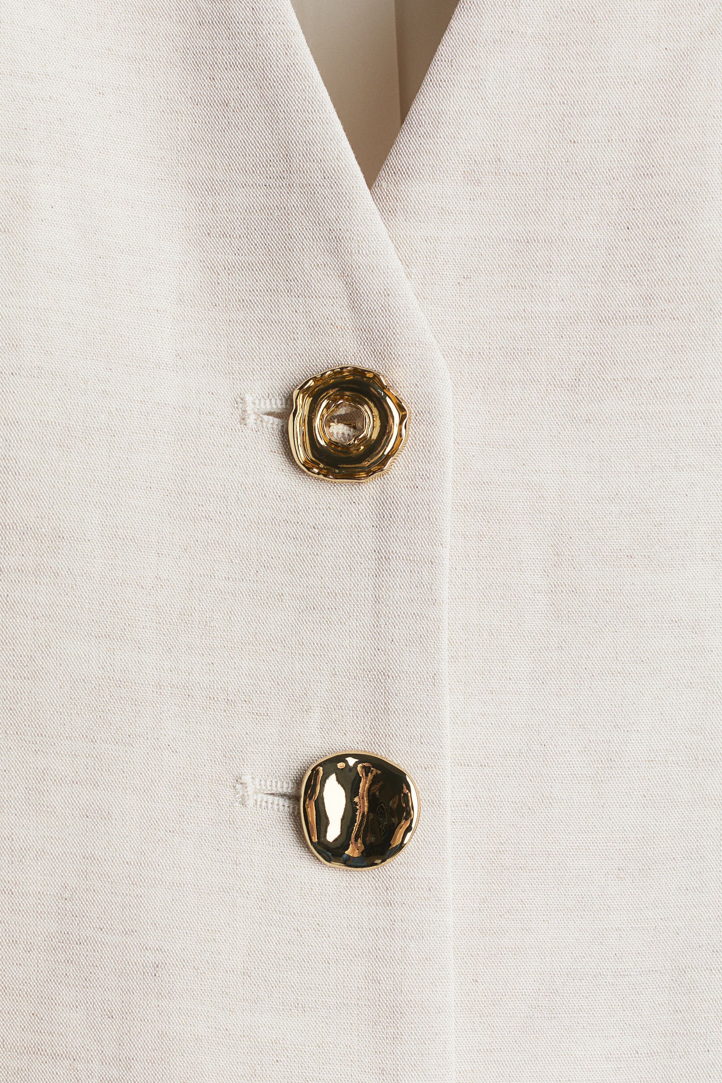 Suit waistcoat in a linen and viscose weave with a V-neckline and metal divs down the front, each in a different design. Lined.