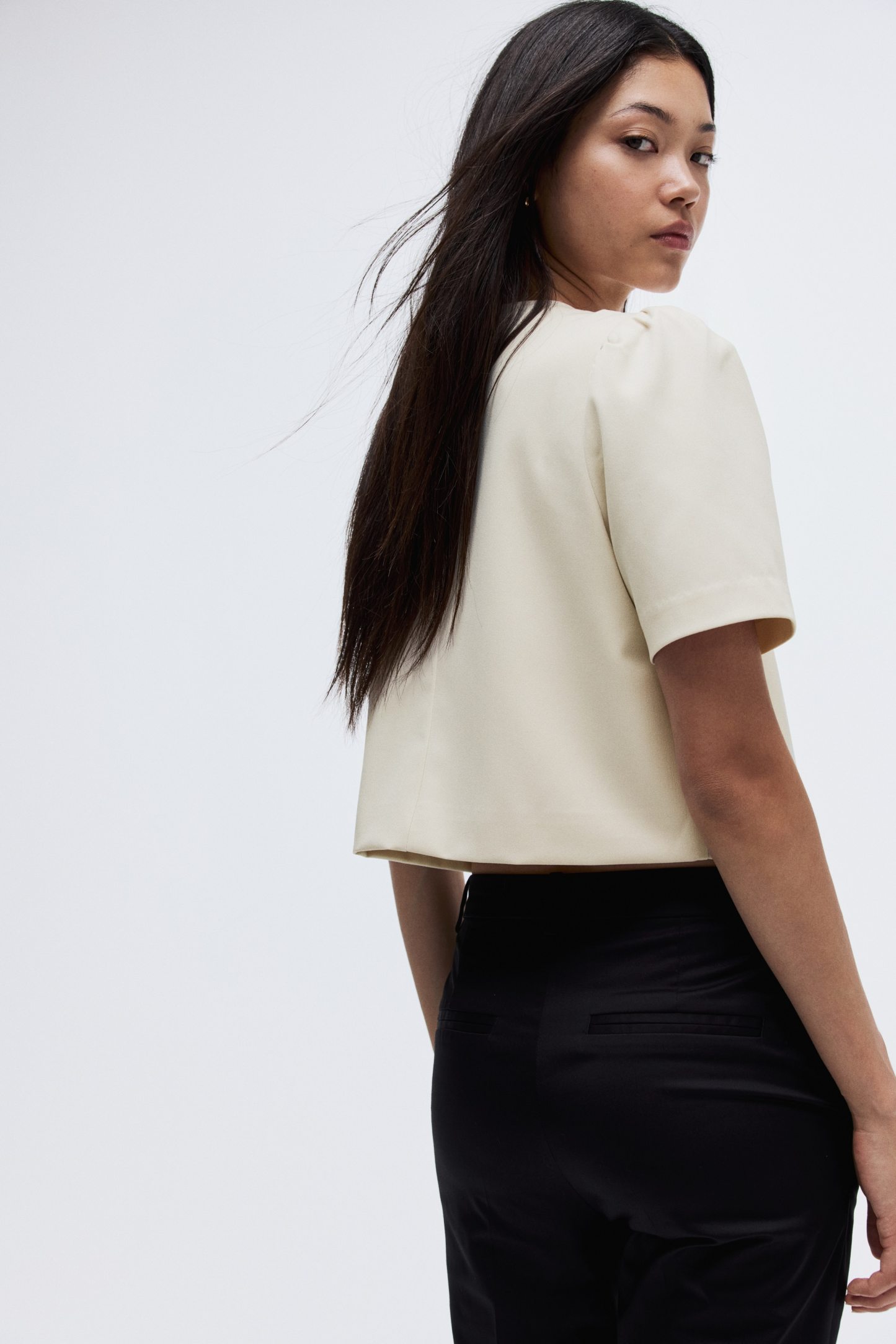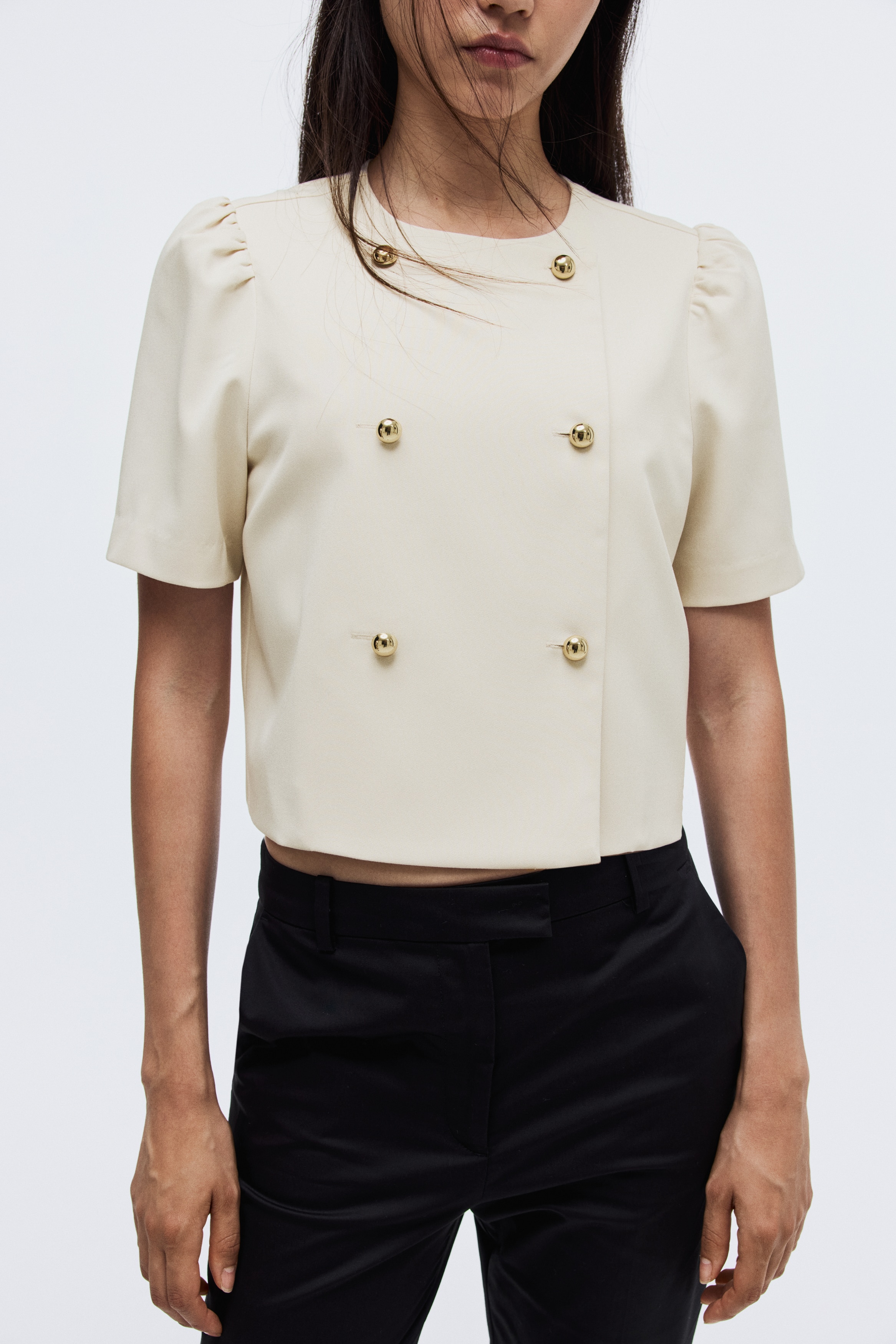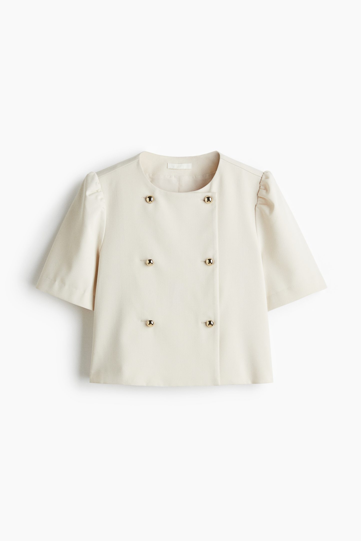 Jacket in twill with a round neckline and a double-breasted front with domed metal divs. Short puff sleeves and a straight-cut hem. Lined.