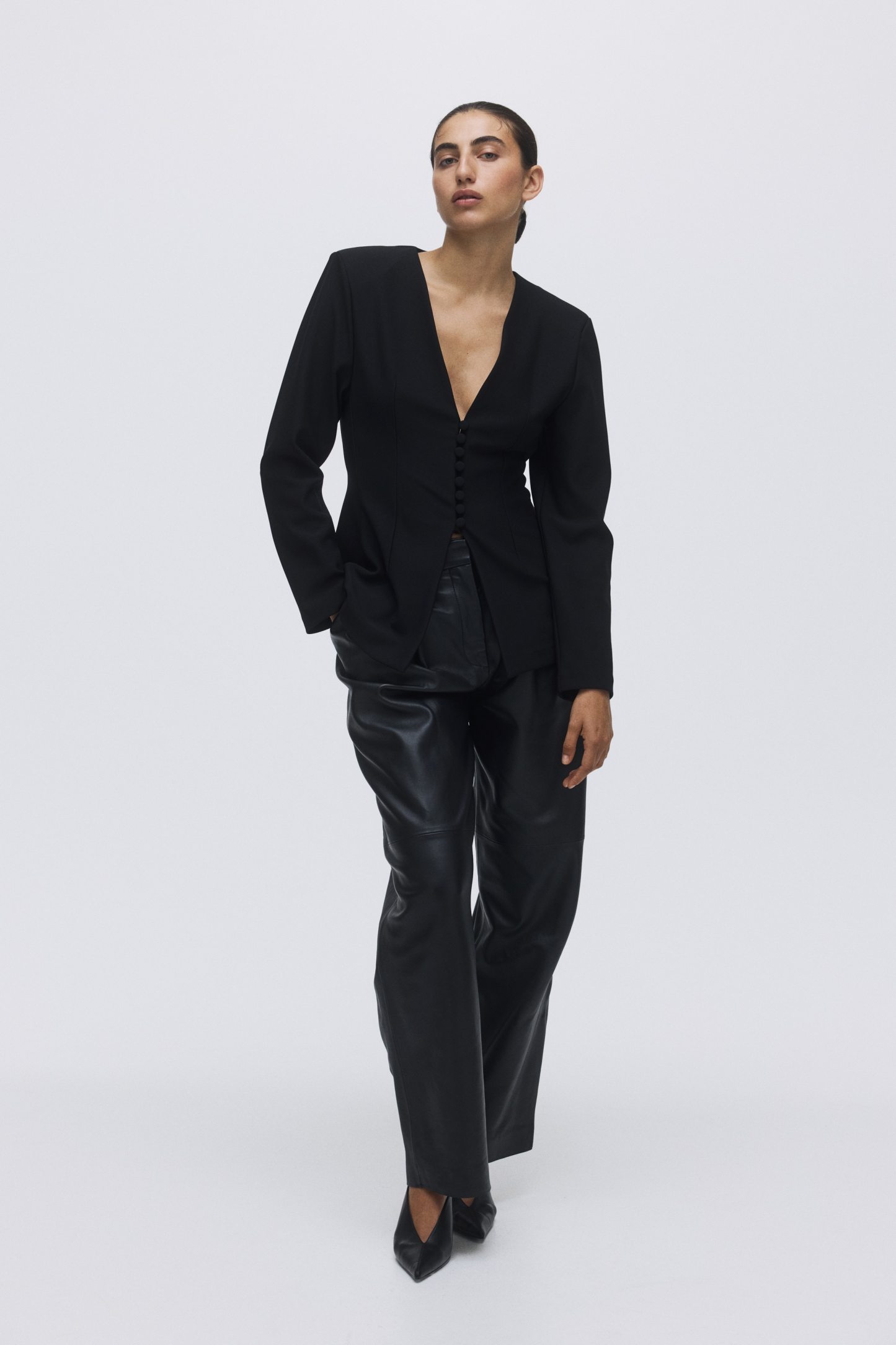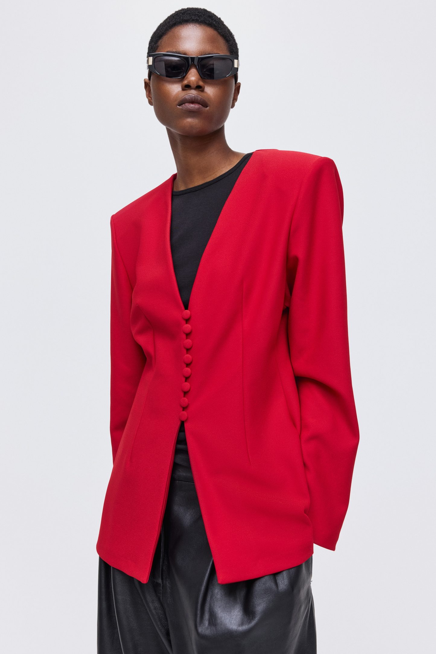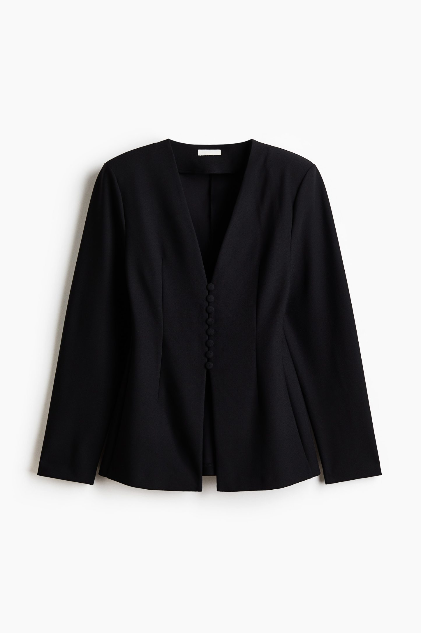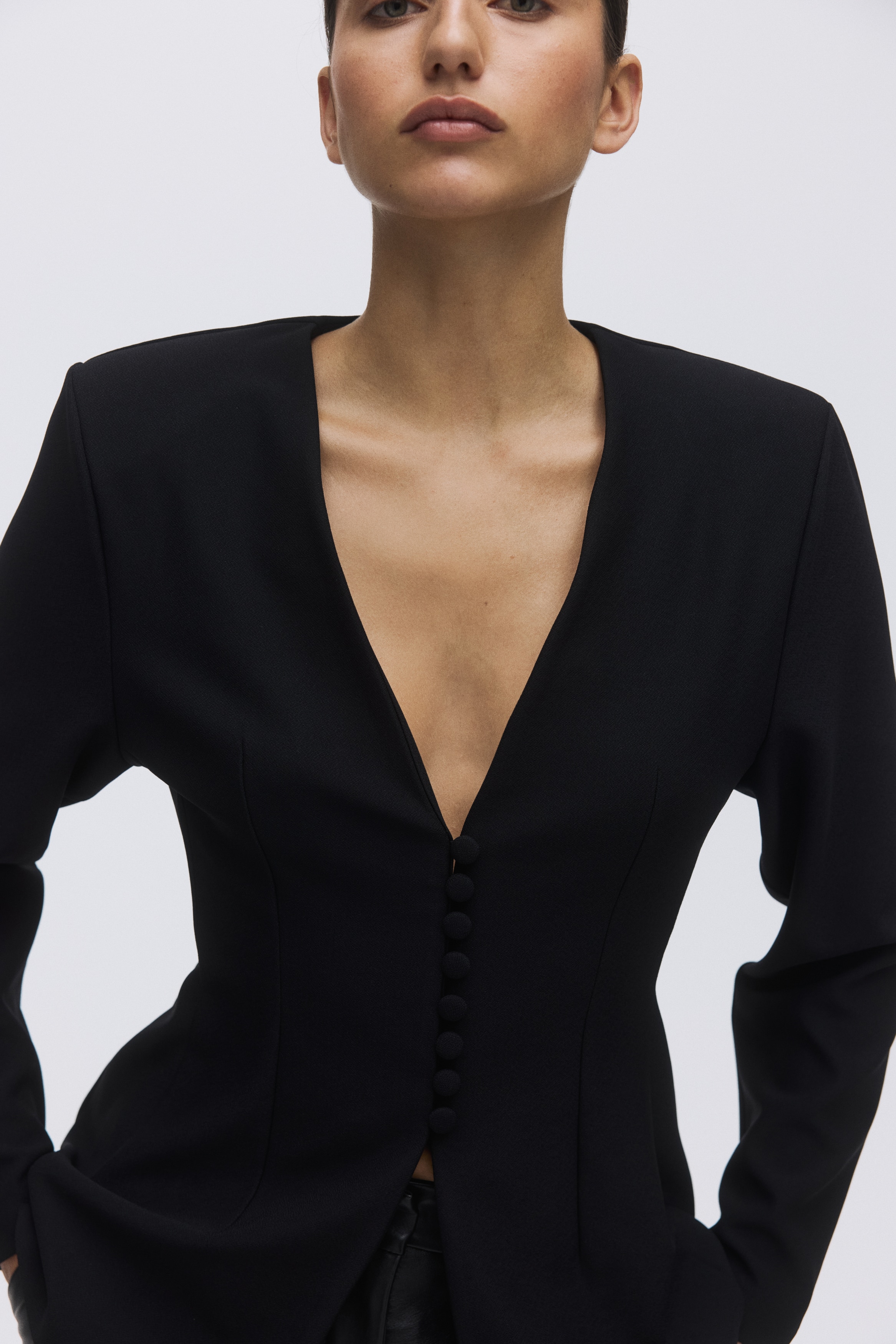 Single-breasted blazer in heavy jersey with strong shoulder pads, a deep V-neckline, covered divs at the front and a nipped-in waist for a defined hourglass silhouette.