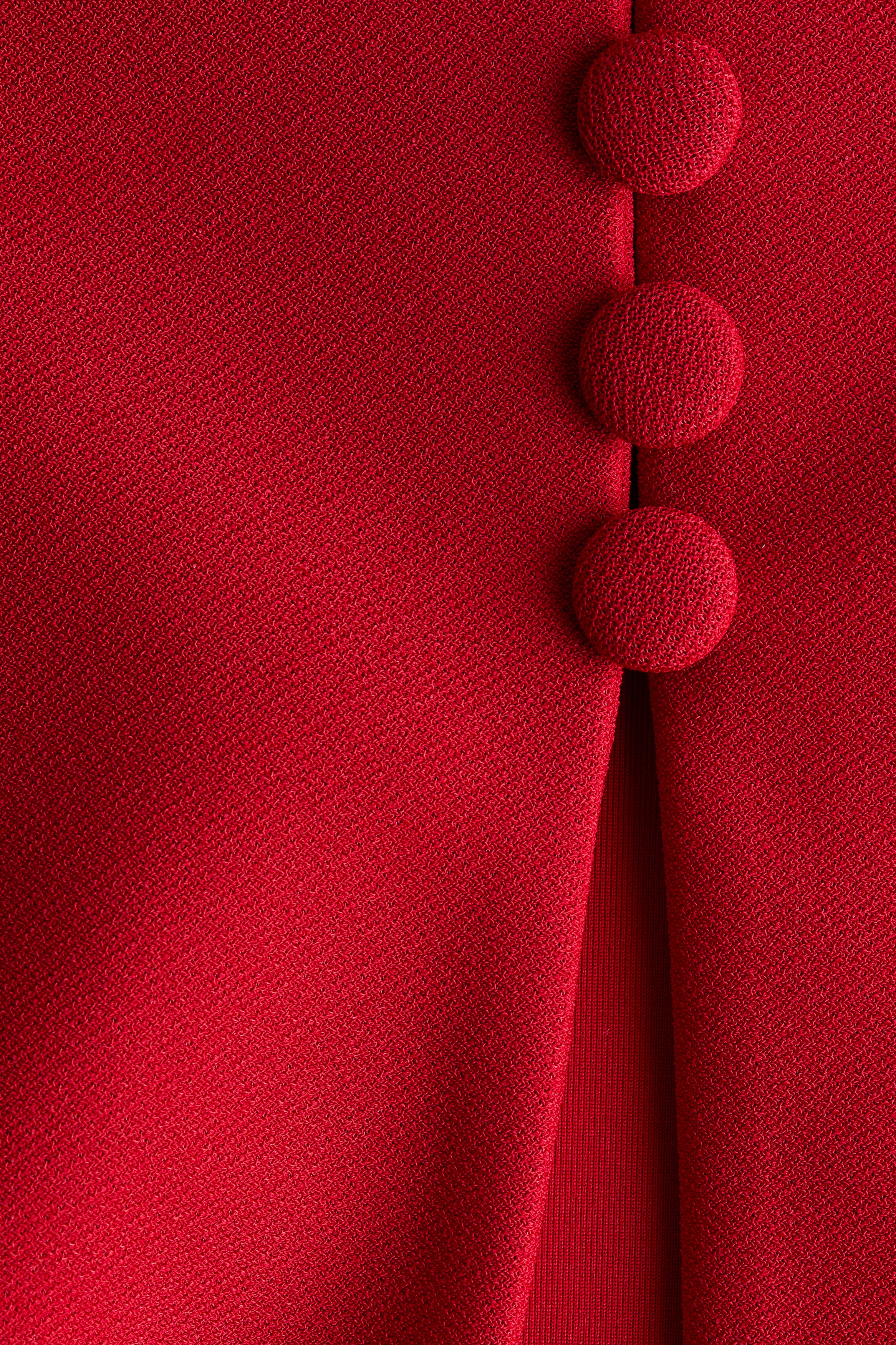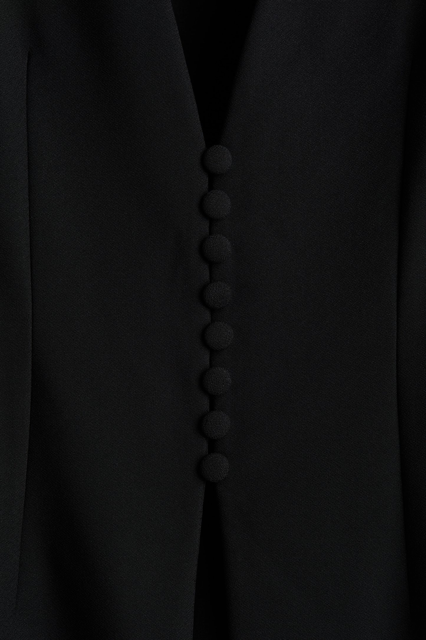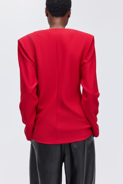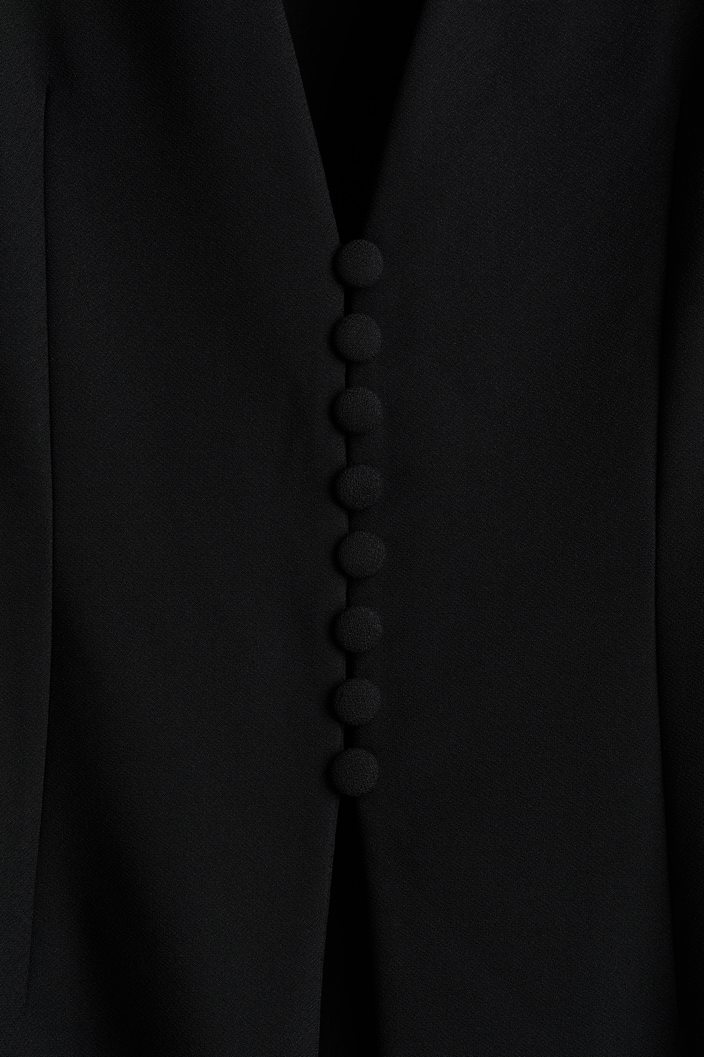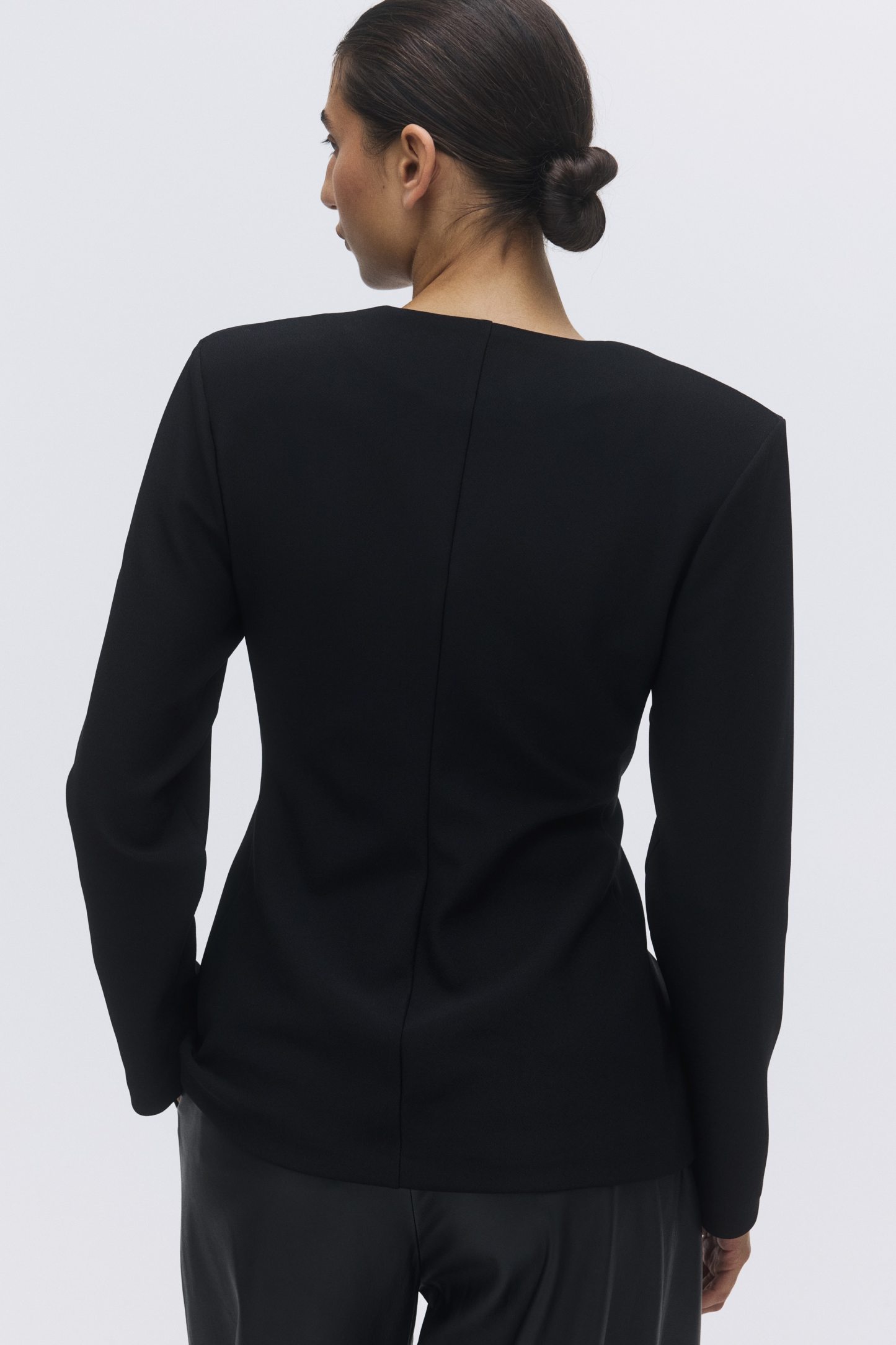 Single-breasted blazer in heavy jersey with strong shoulder pads, a deep V-neckline, covered divs at the front and a nipped-in waist for a defined hourglass silhouette.