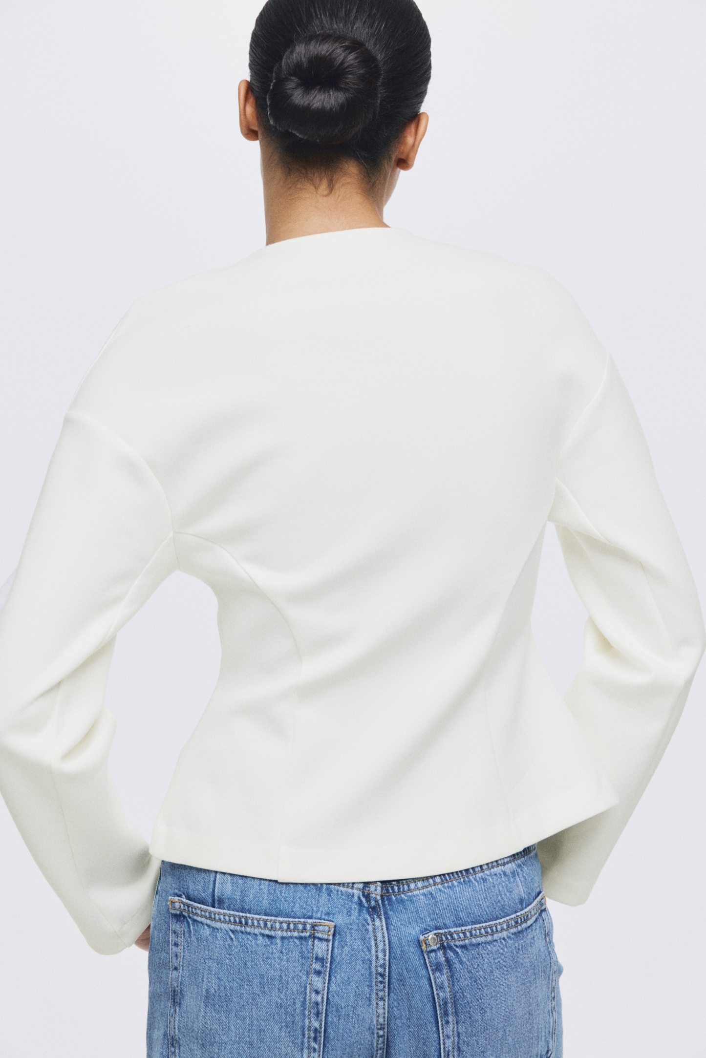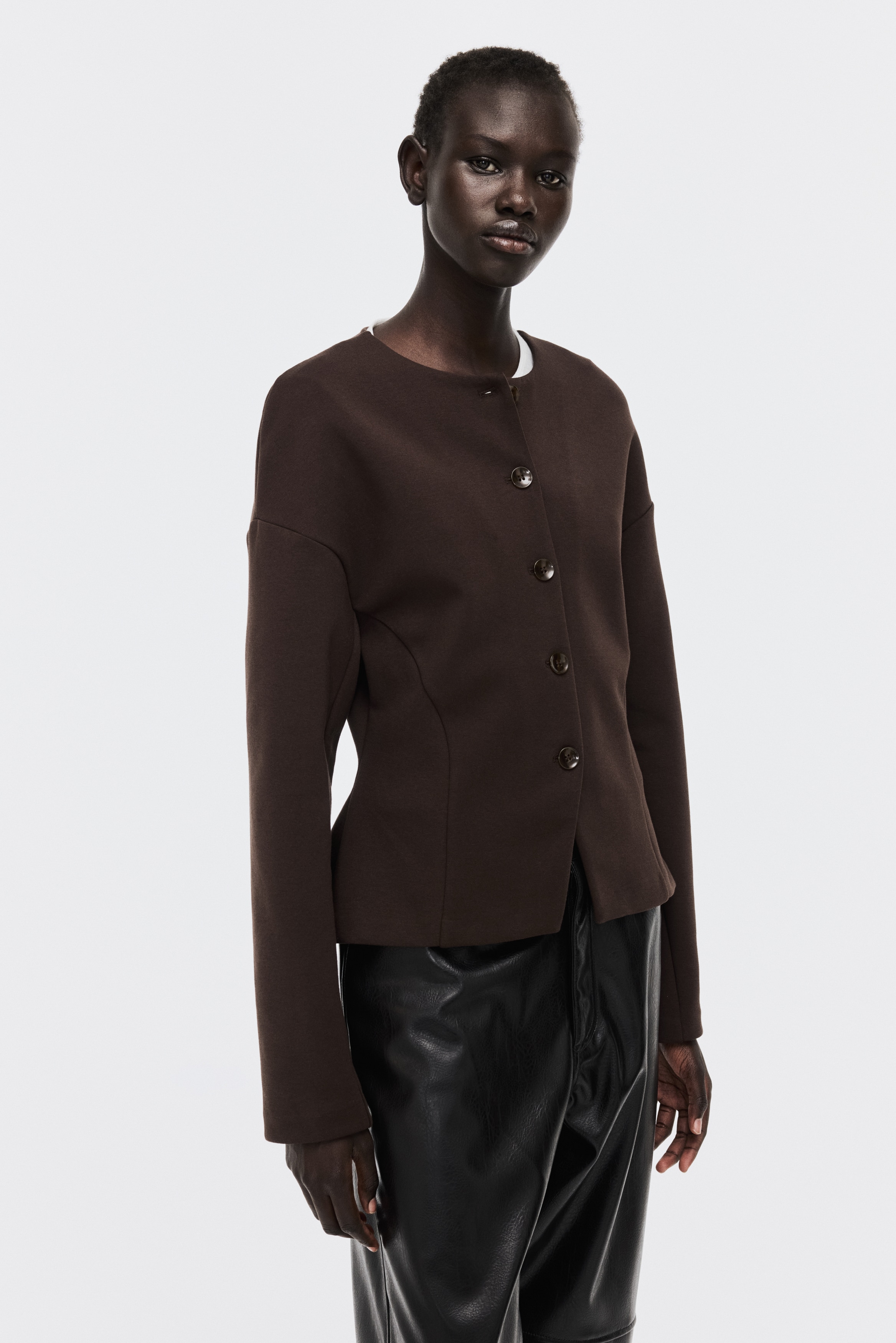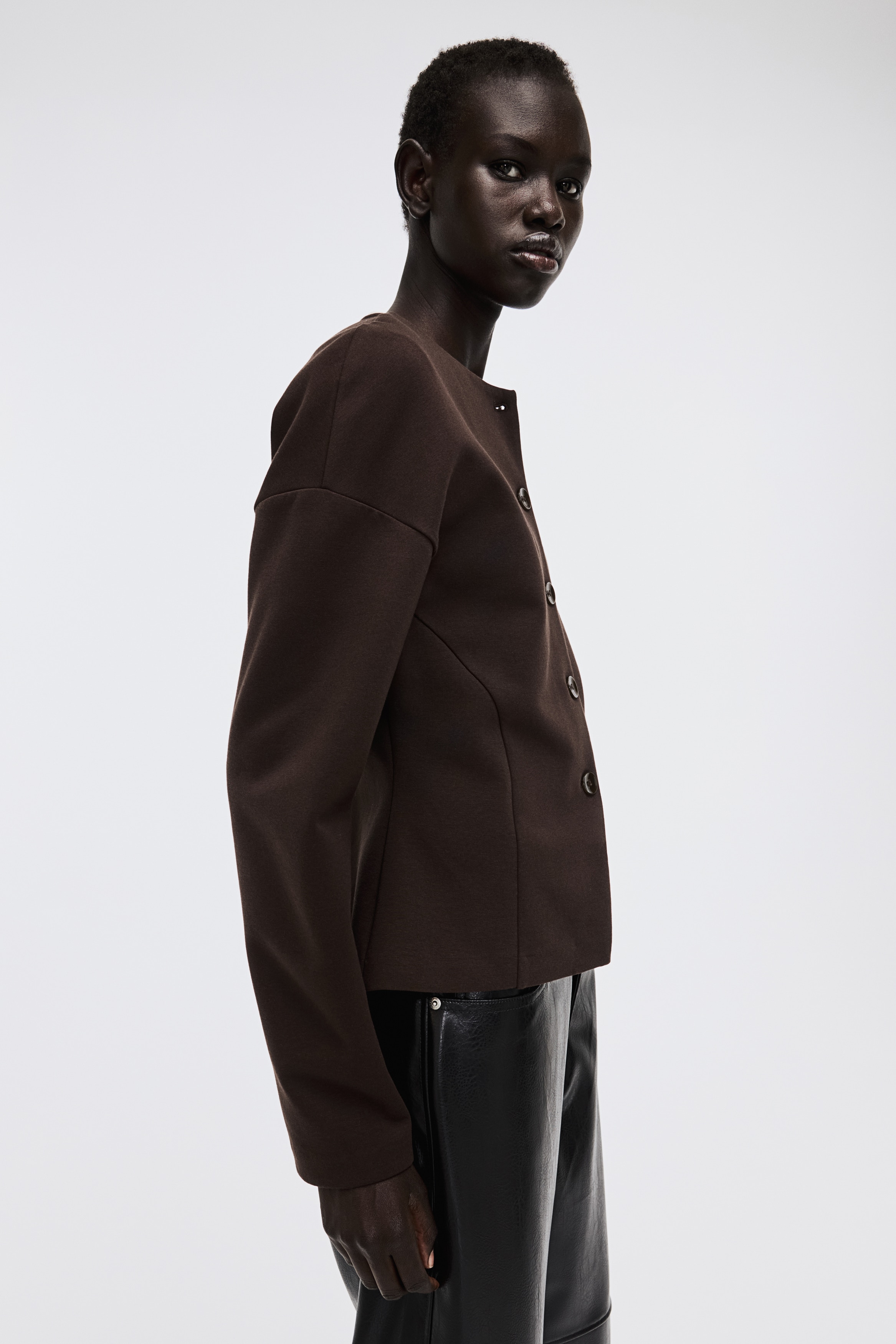 Single-breasted blazer in scuba fabric with a round neckline, divs down to the waist and a flared cut from the waist to the hem. Dropped shoulders and long sleeves.