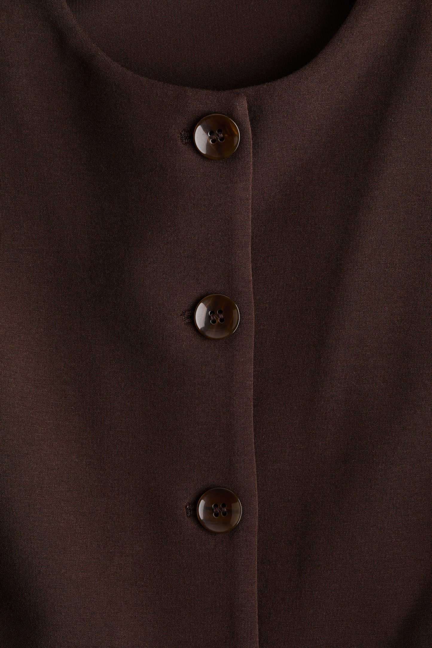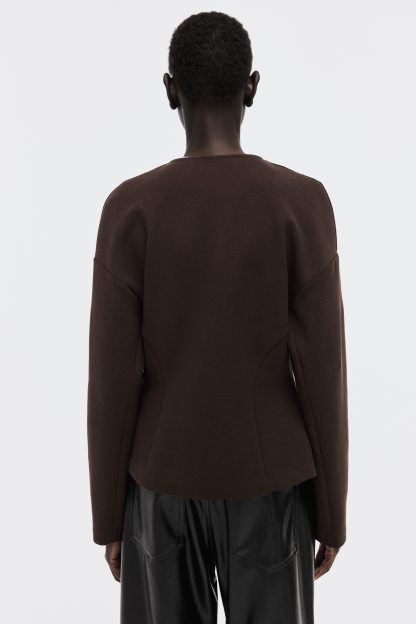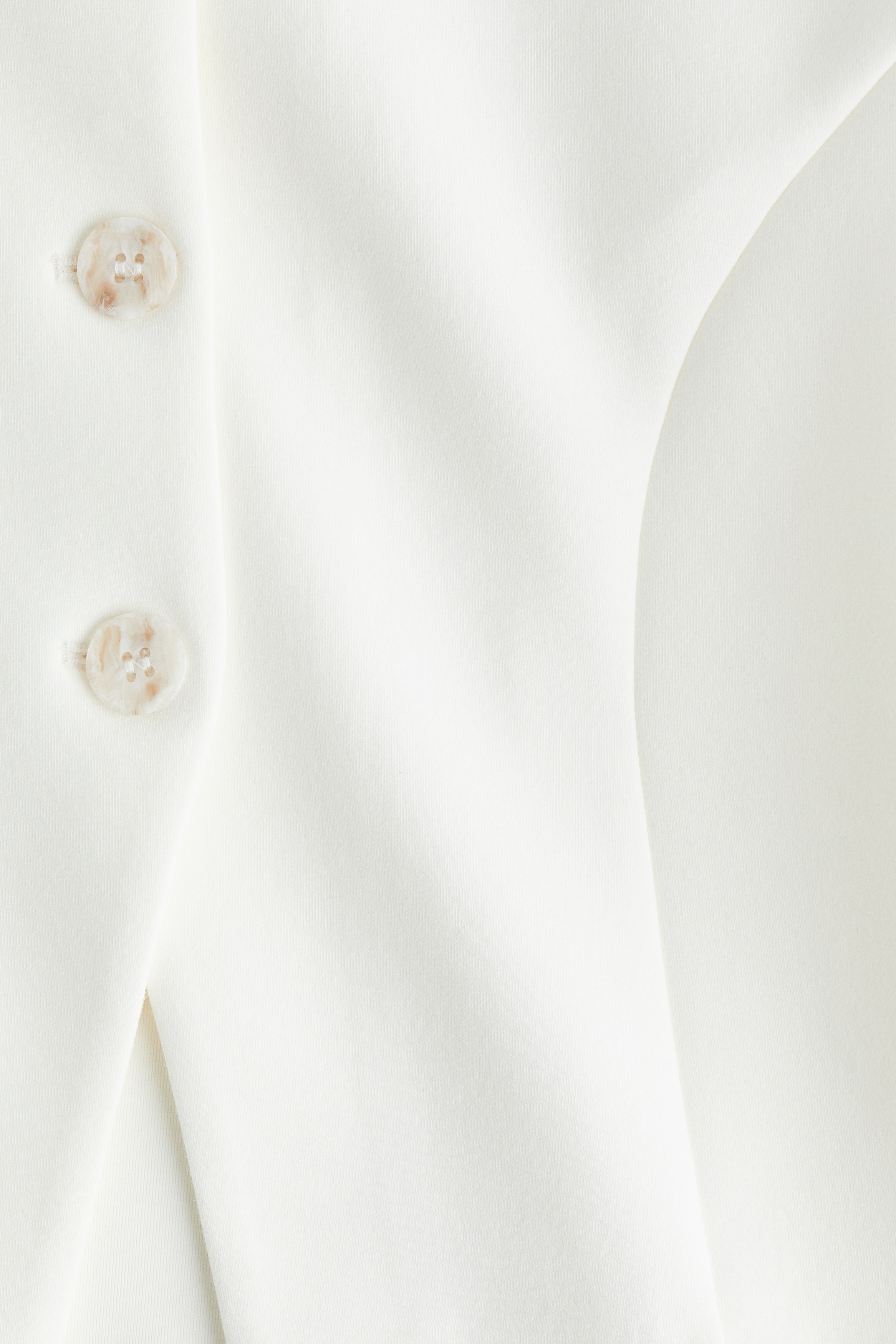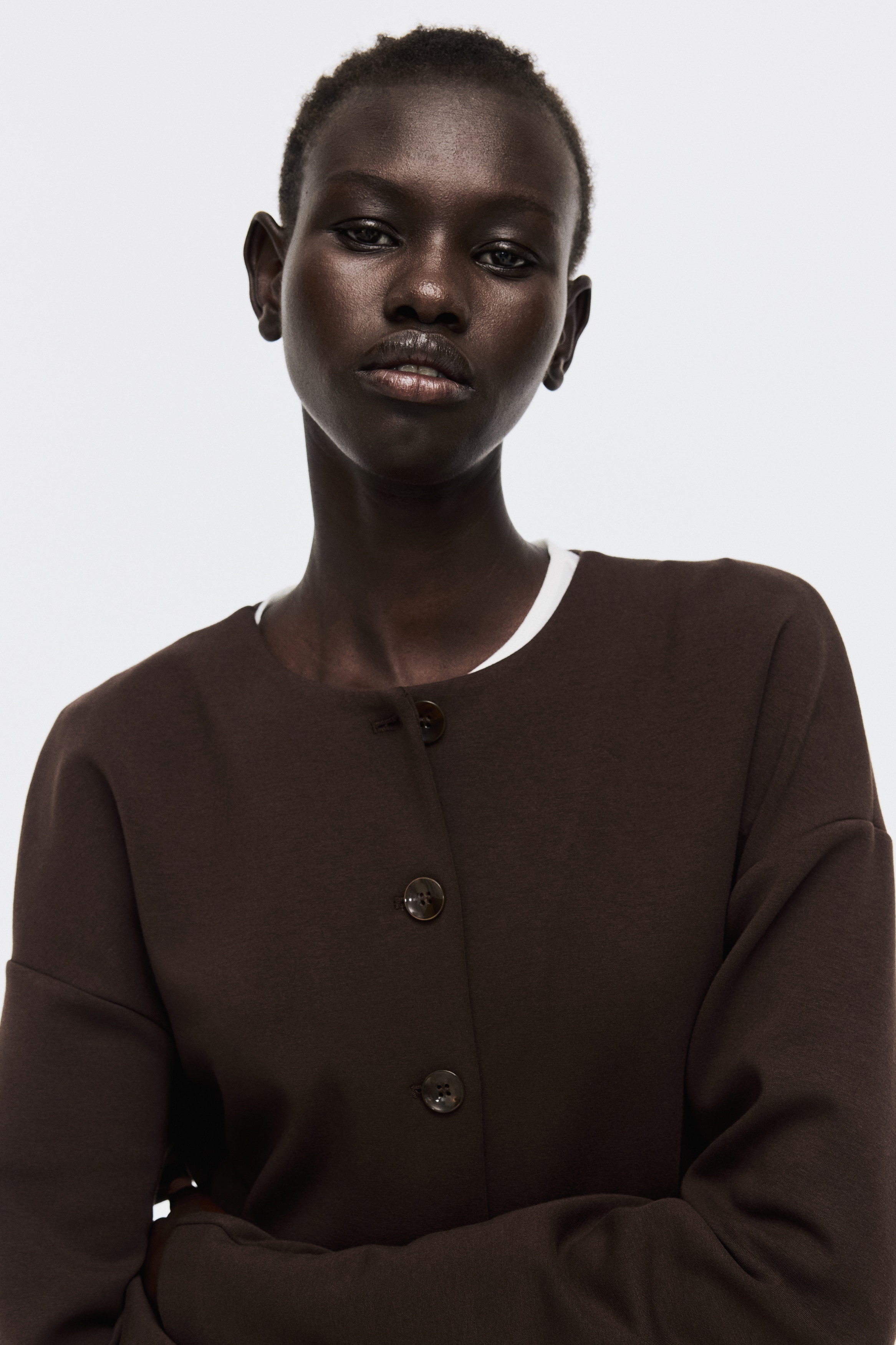 Single-breasted blazer in scuba fabric with a round neckline, divs down to the waist and a flared cut from the waist to the hem. Dropped shoulders and long sleeves.