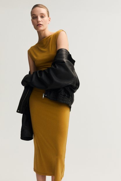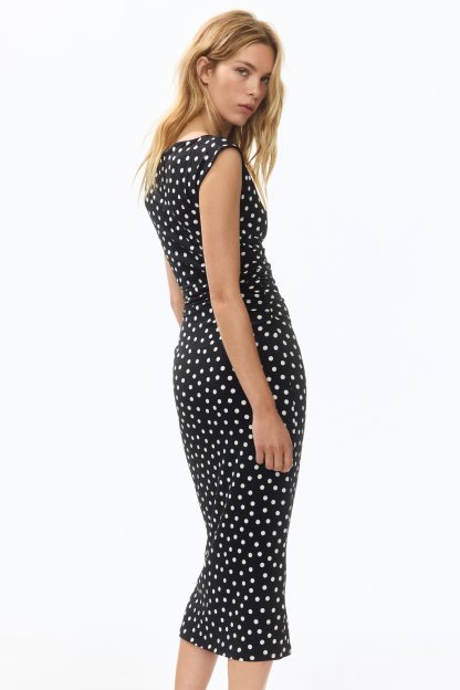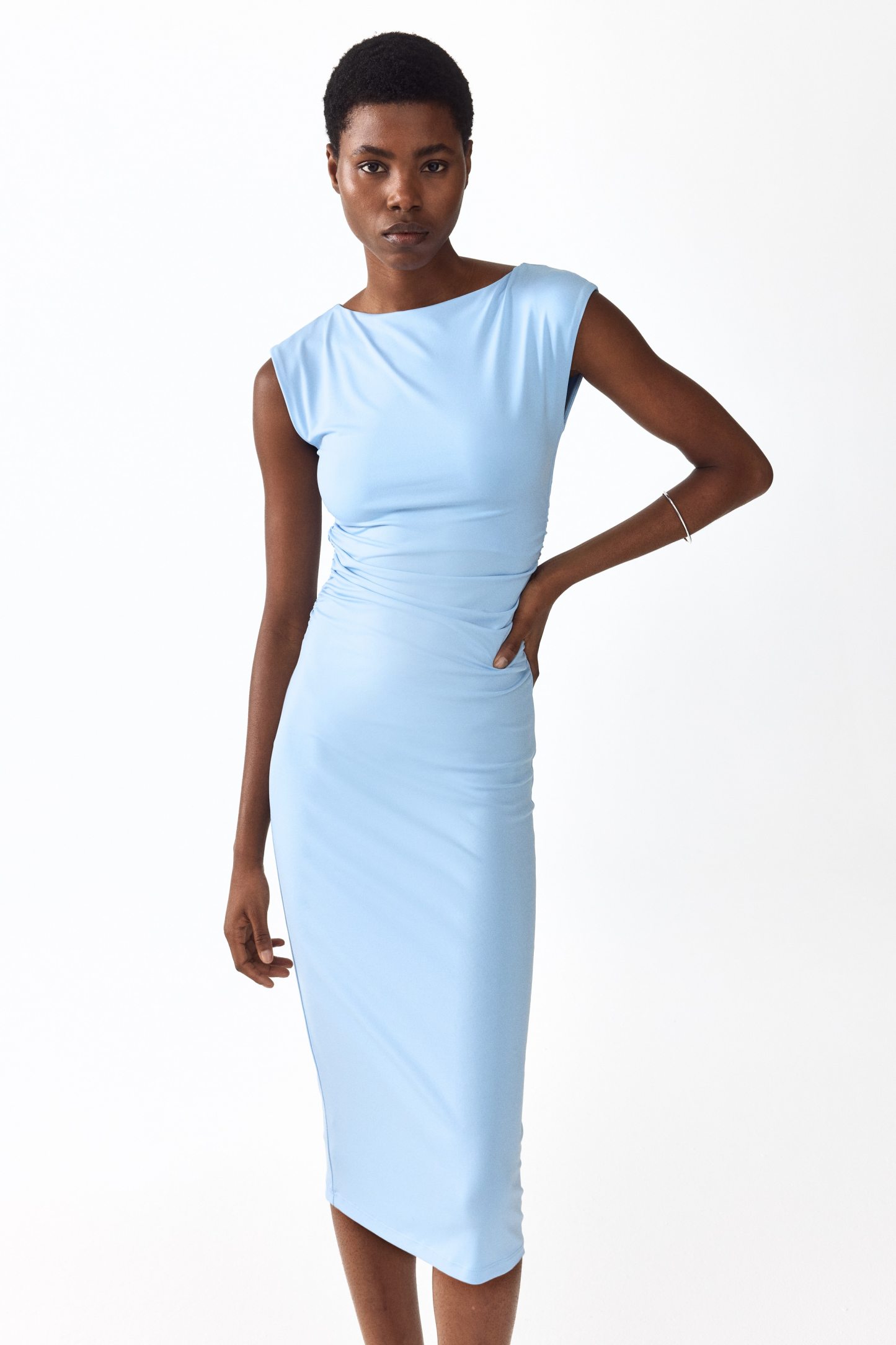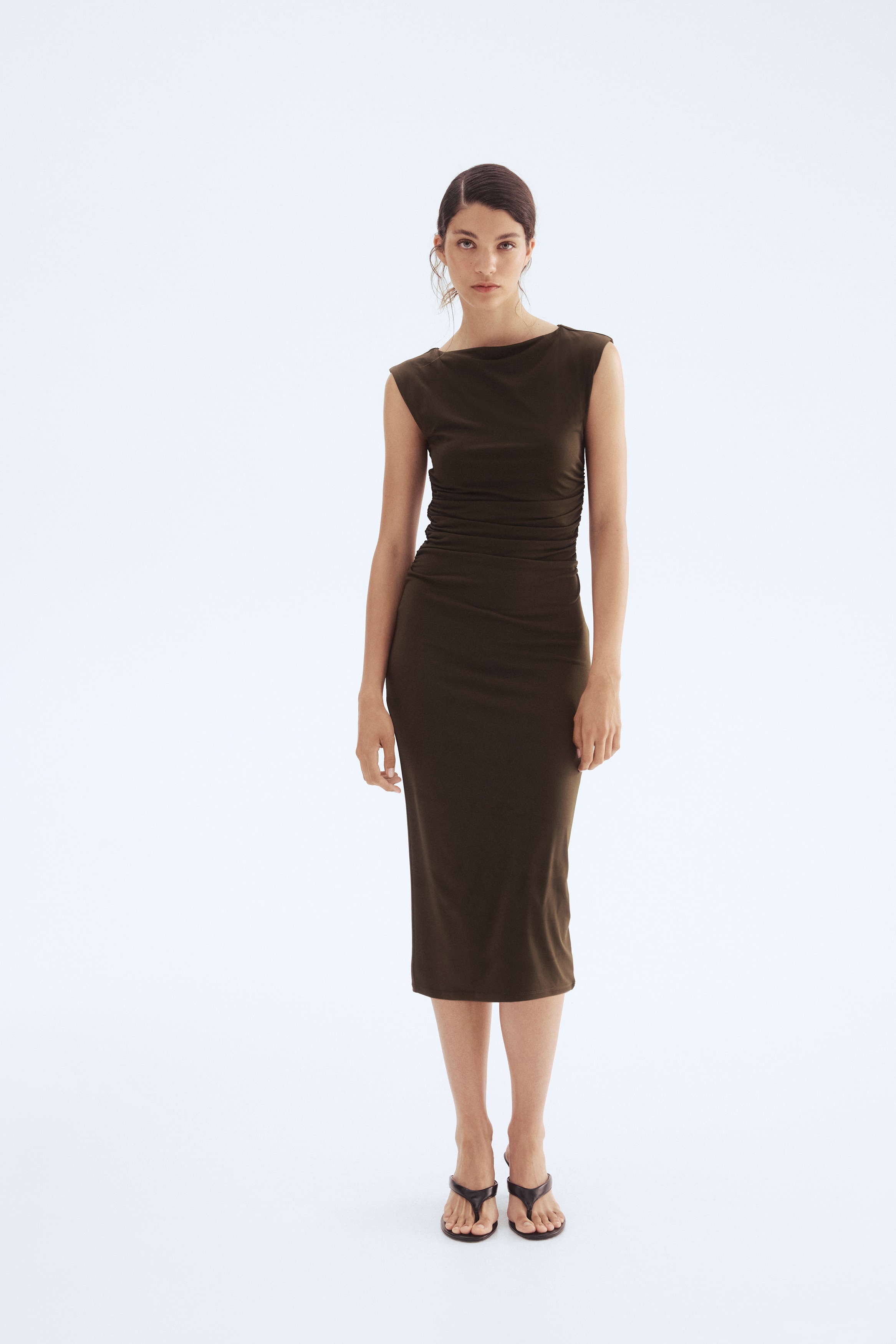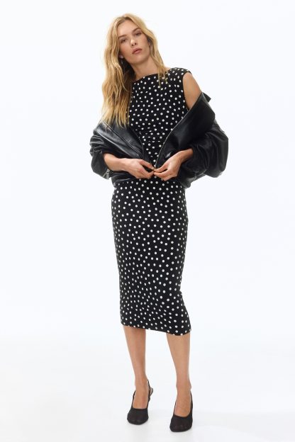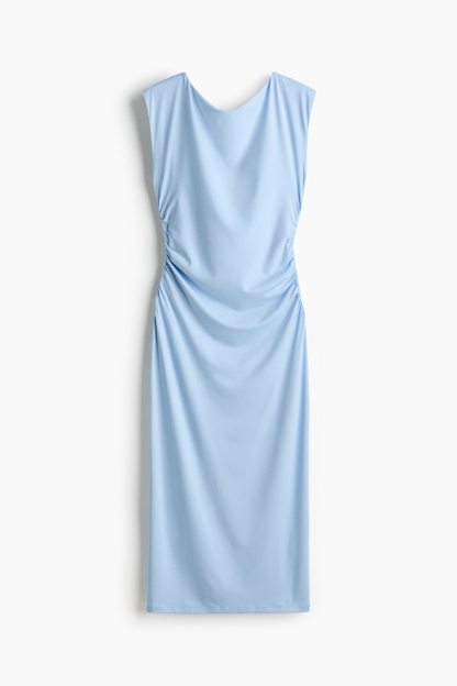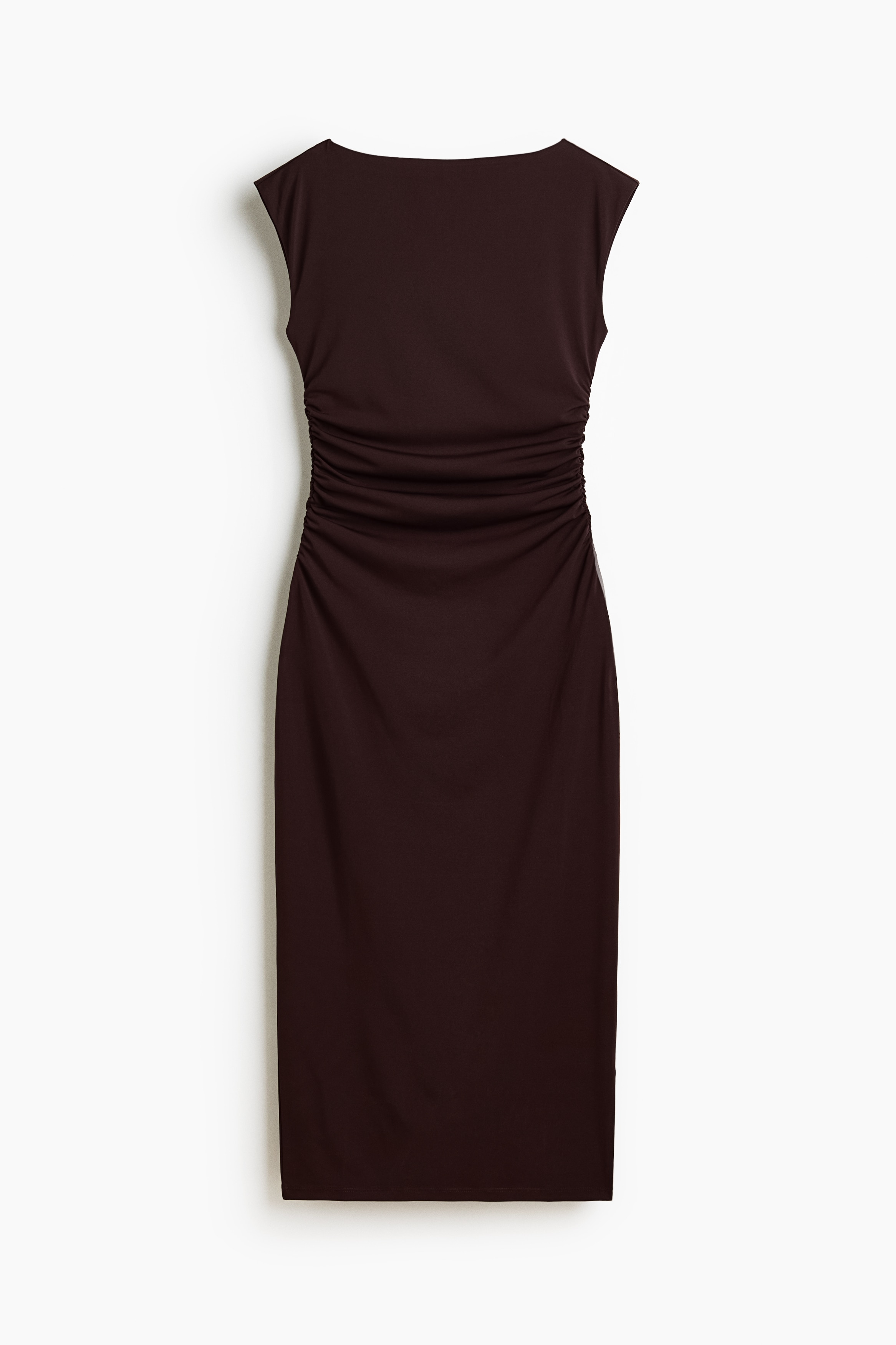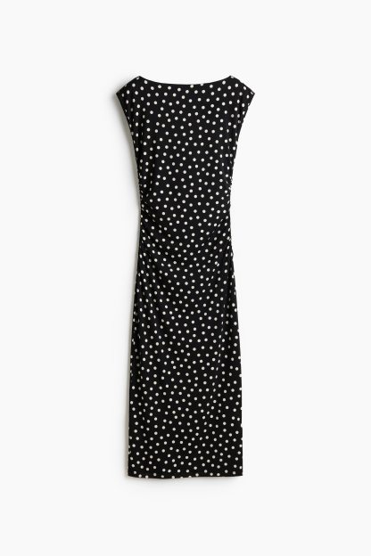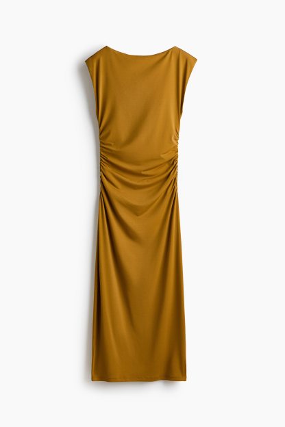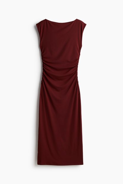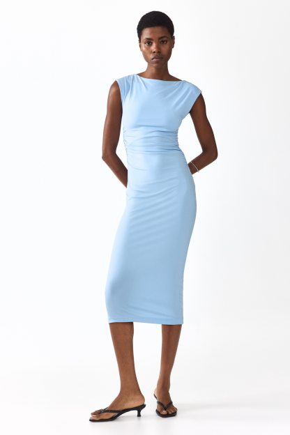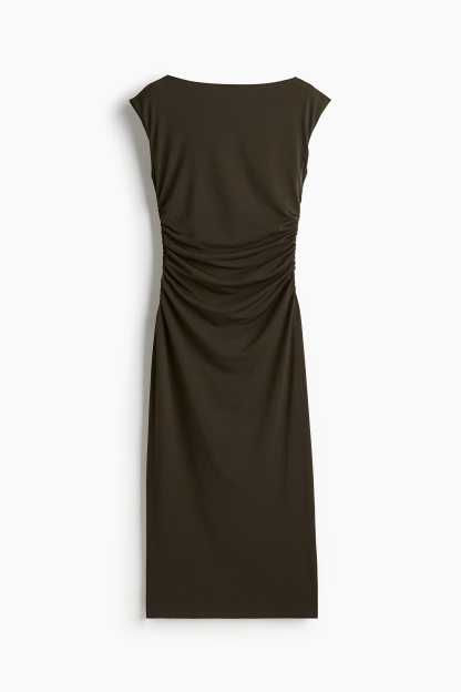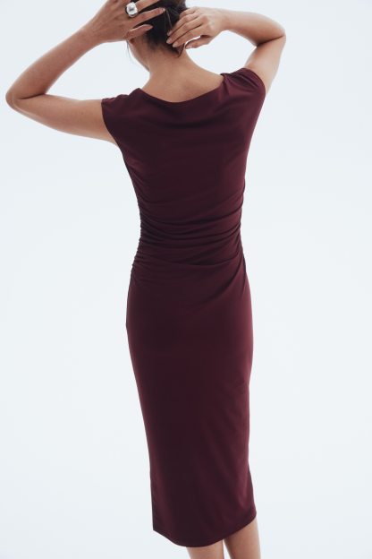 Calf-length, fitted dress in stretch jersey with a boat neckline, cap sleeves and gathers at the waist. Lined at the top.