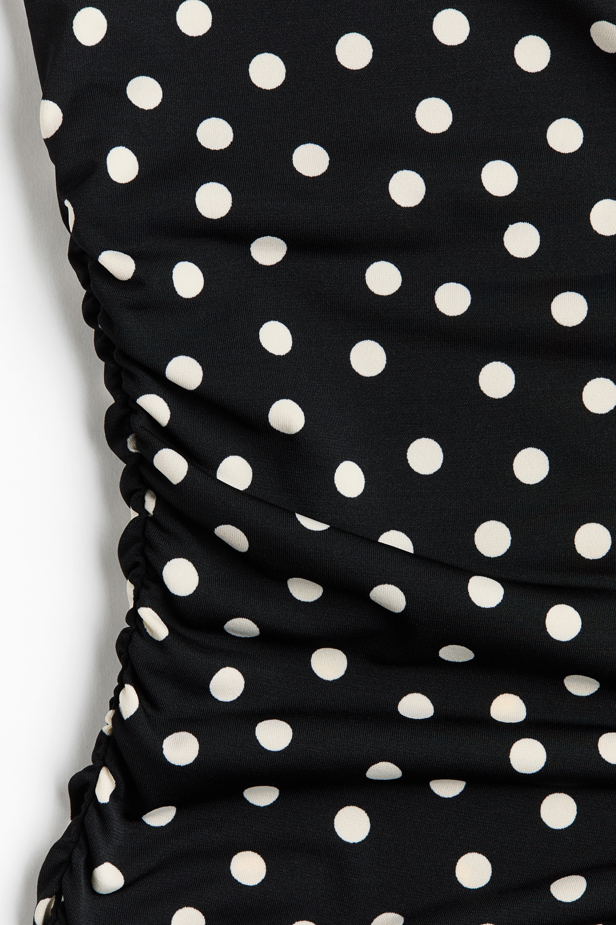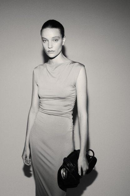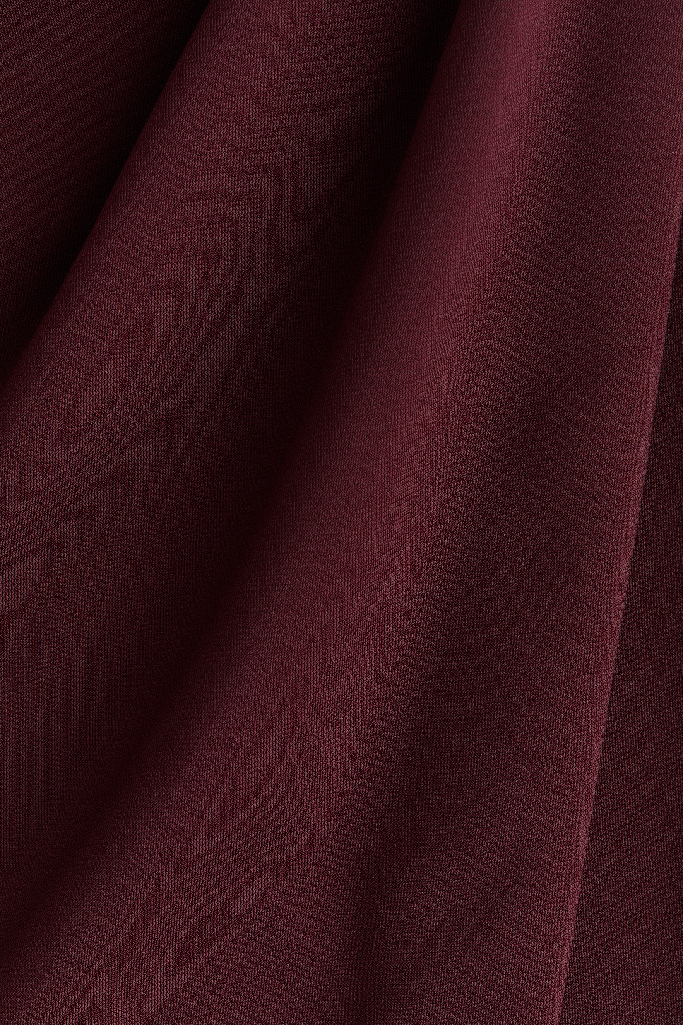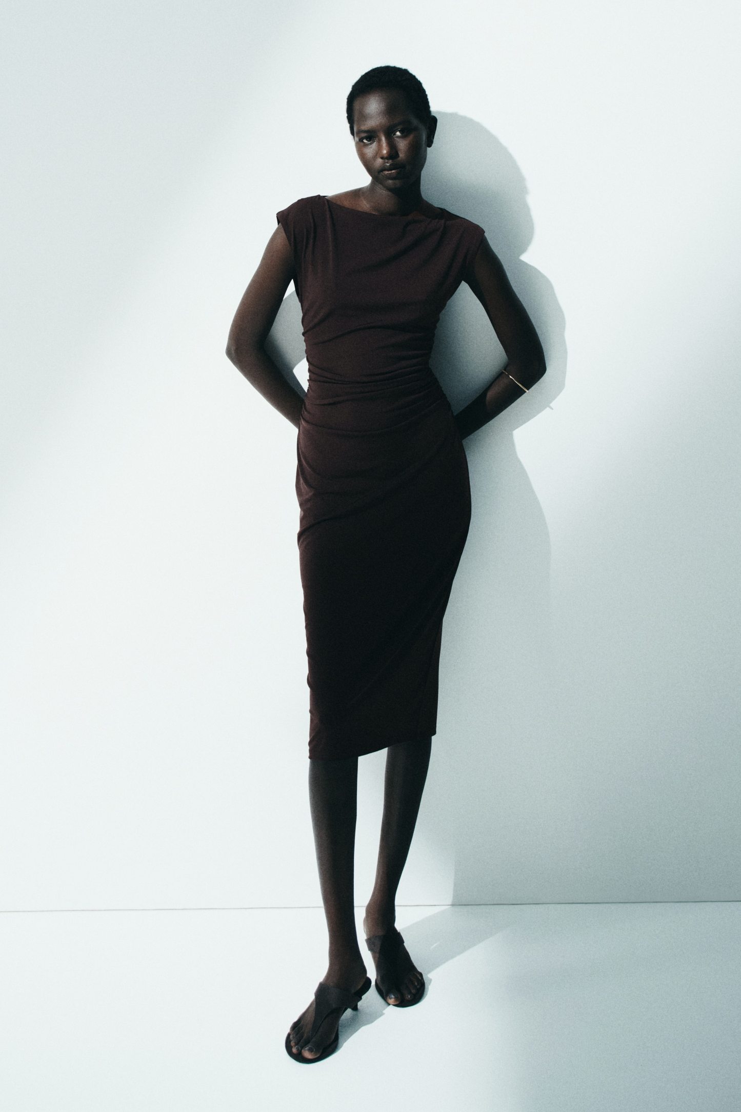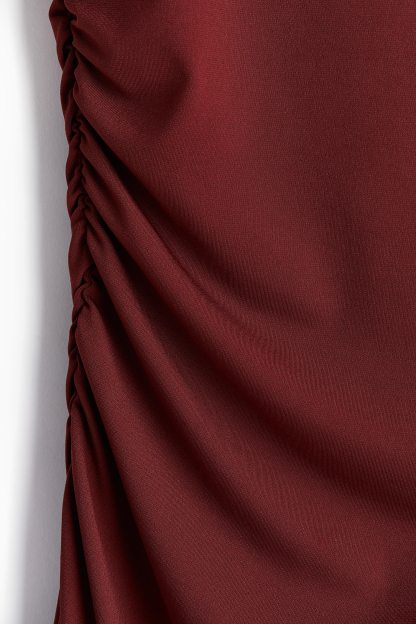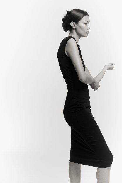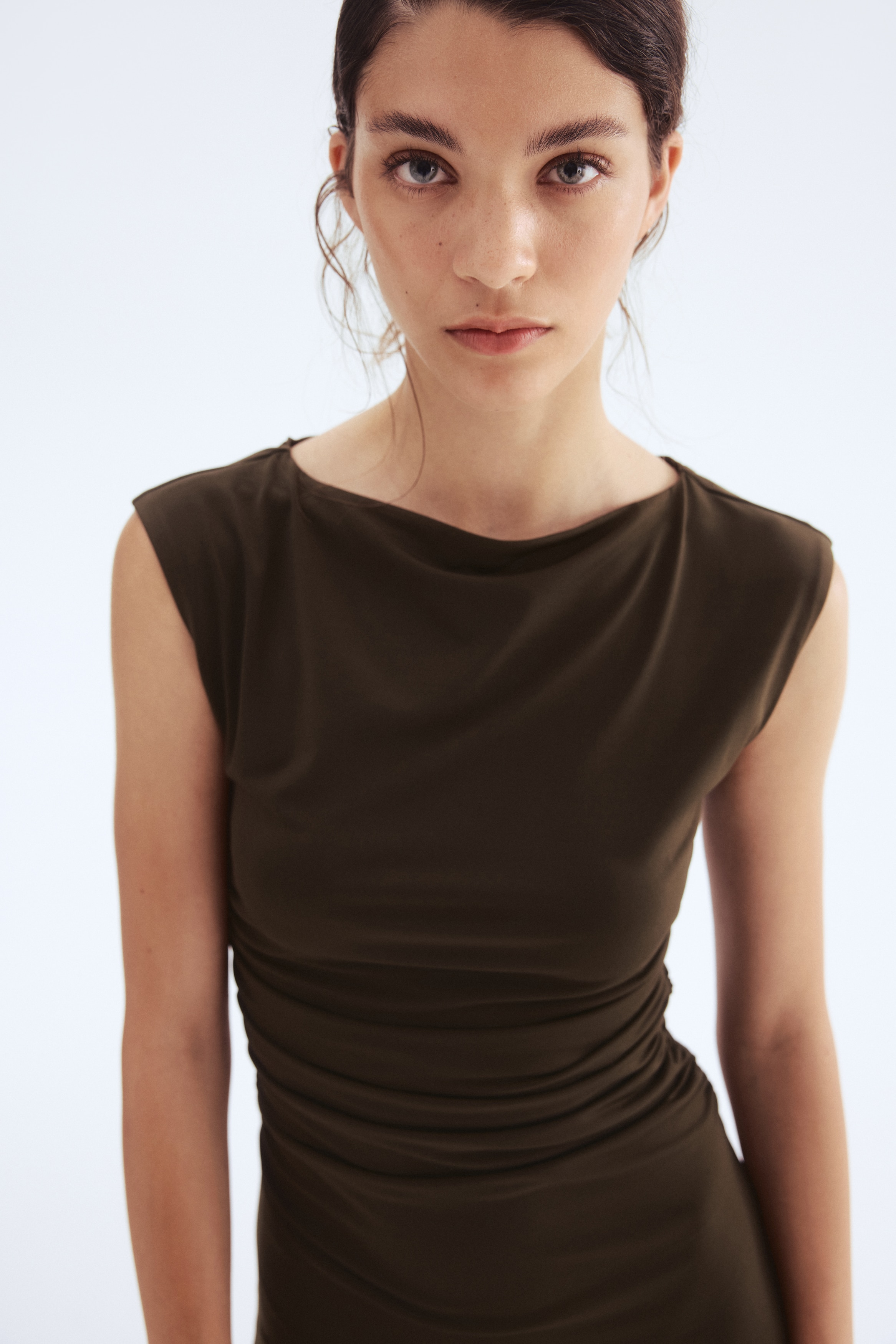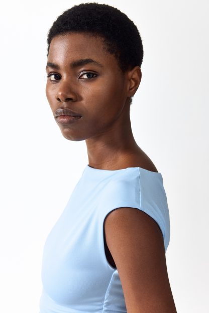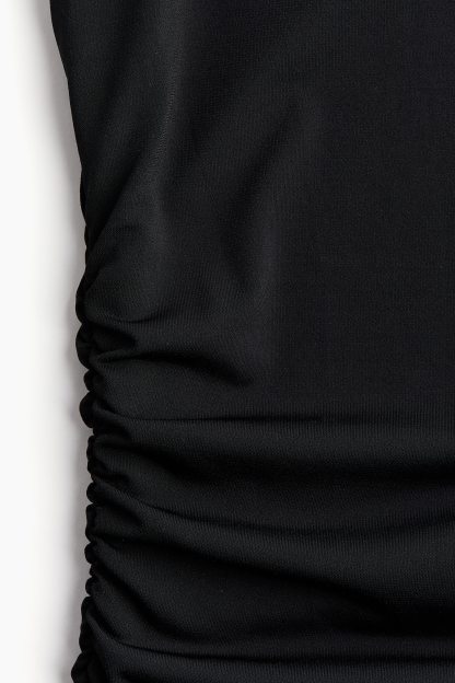 Calf-length, fitted dress in stretch jersey with a boat neckline, cap sleeves and gathers at the waist. Lined at the top.