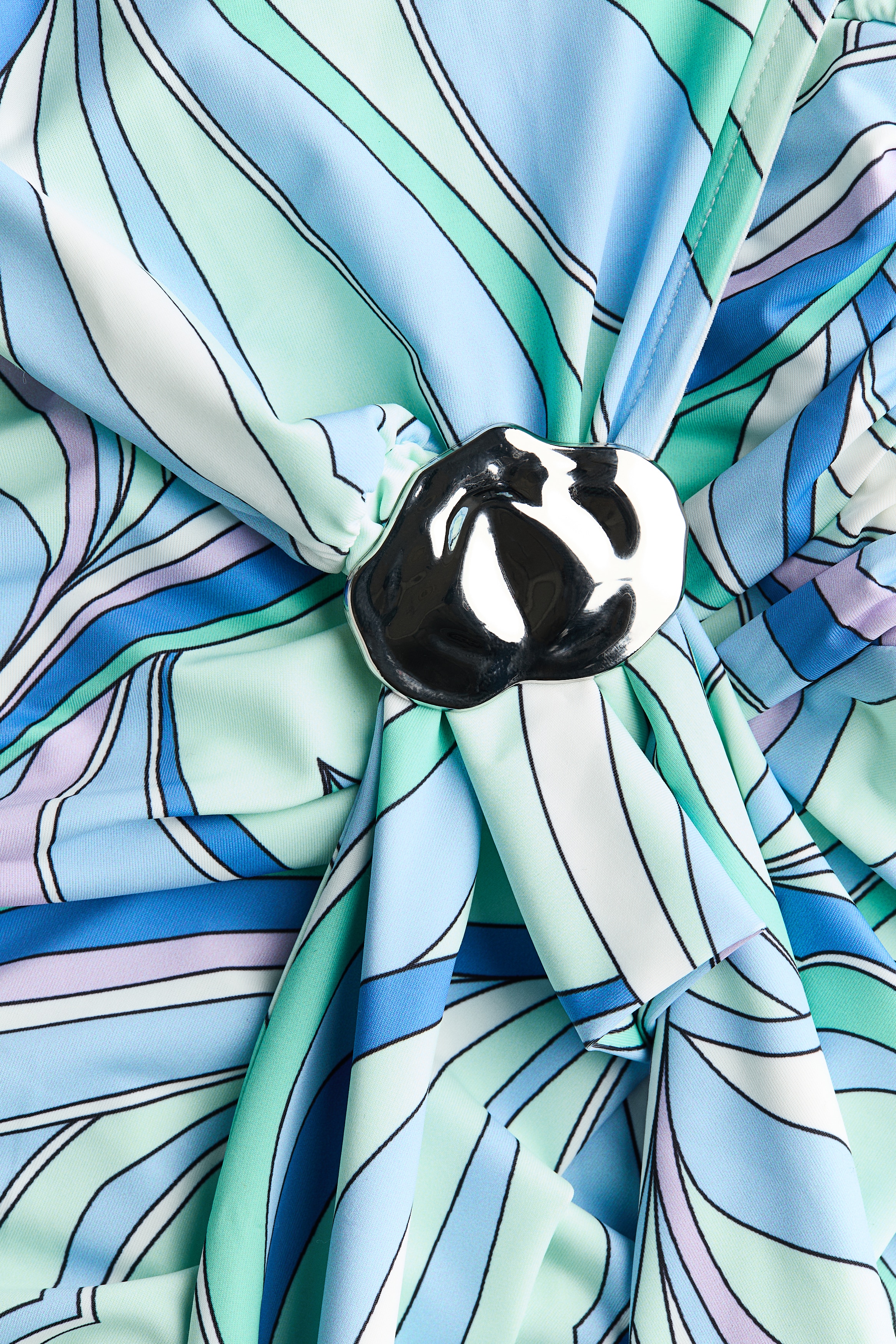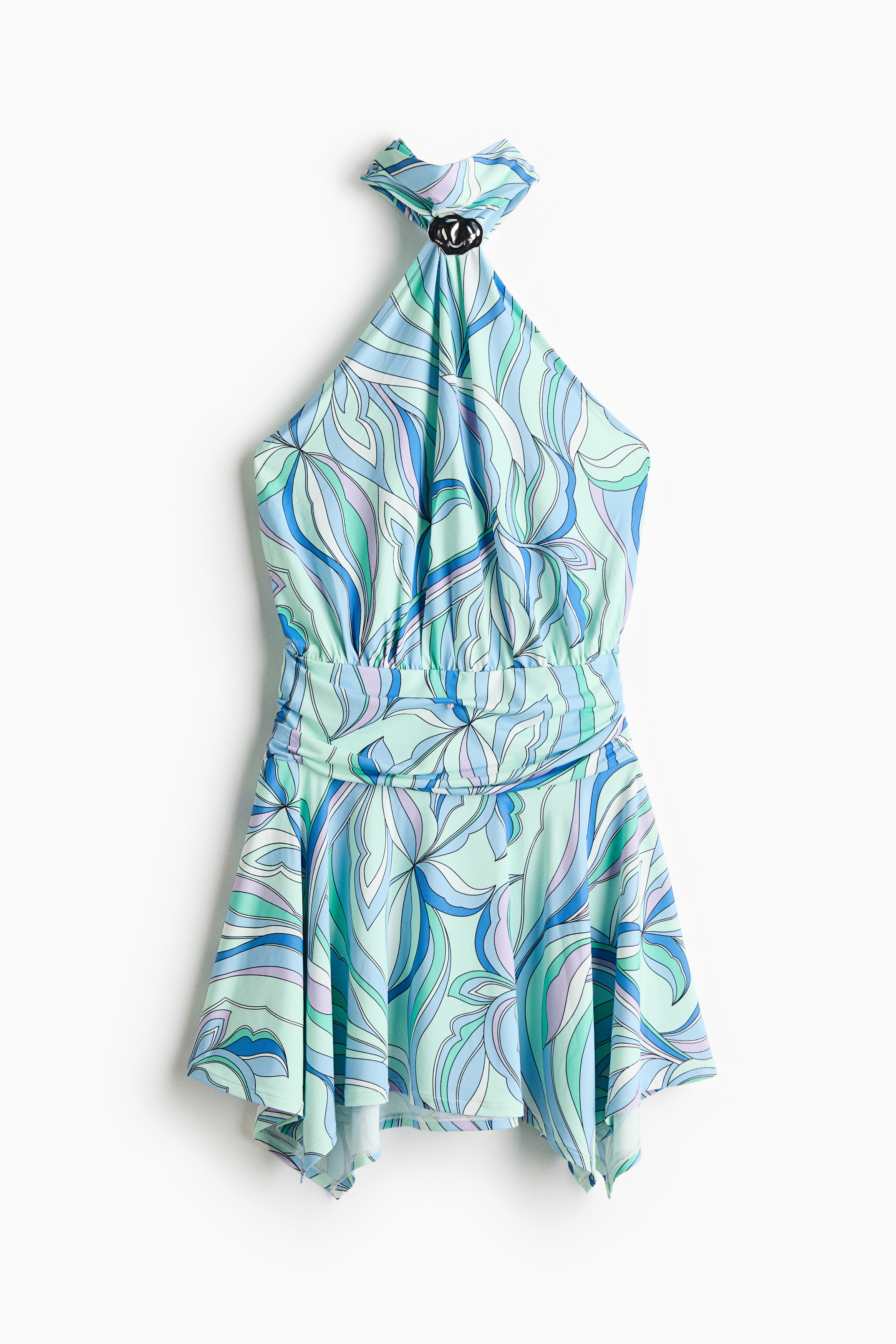 Mini dress in stretch jersey featuring an extra-narrow cut at the top with a hammered metal detail. Stand collar with wide halterneck ties, a ruched waistband and a flared skirt with a handkerchief hem.