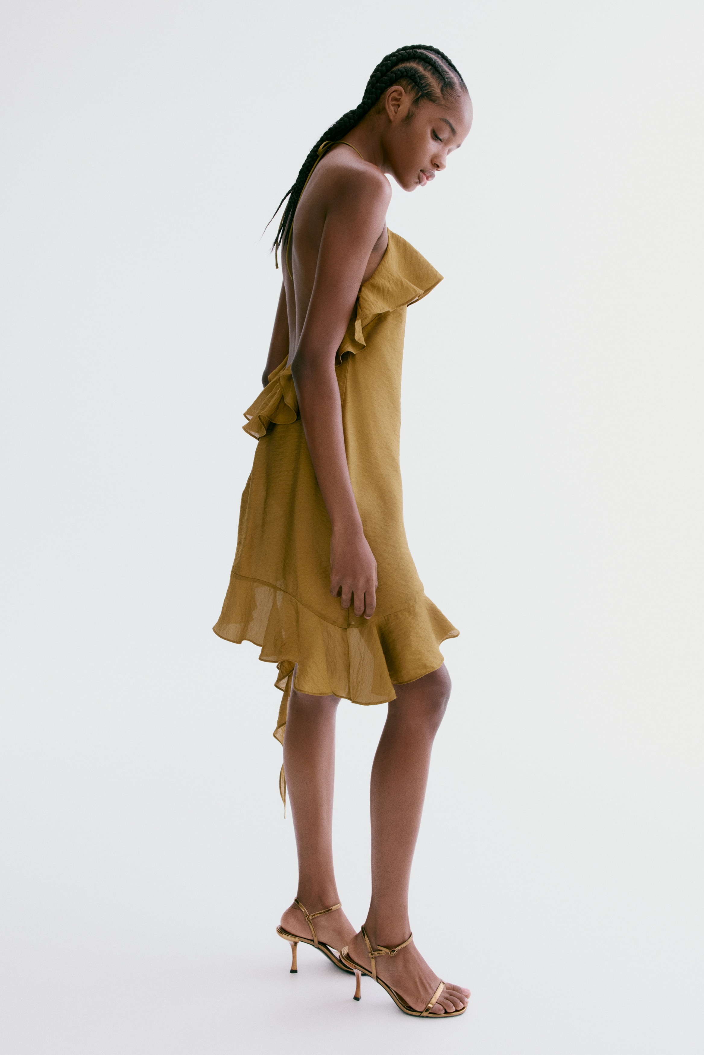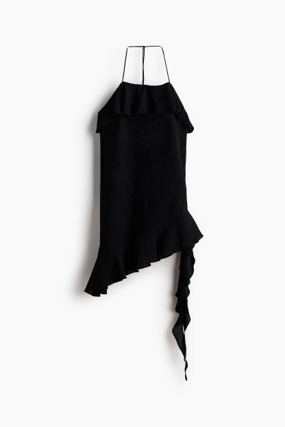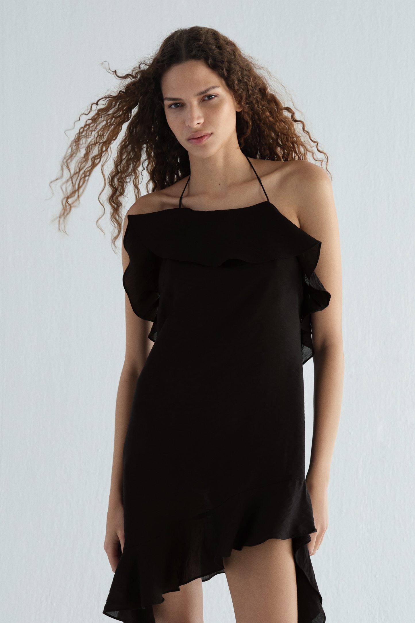 Short dress in woven fabric featuring a square neckline with a wide flounce, narrow halterneck ties and a concealed zip at the back. Asymmetric hem with a wide flounce that has long ends. Unlined.