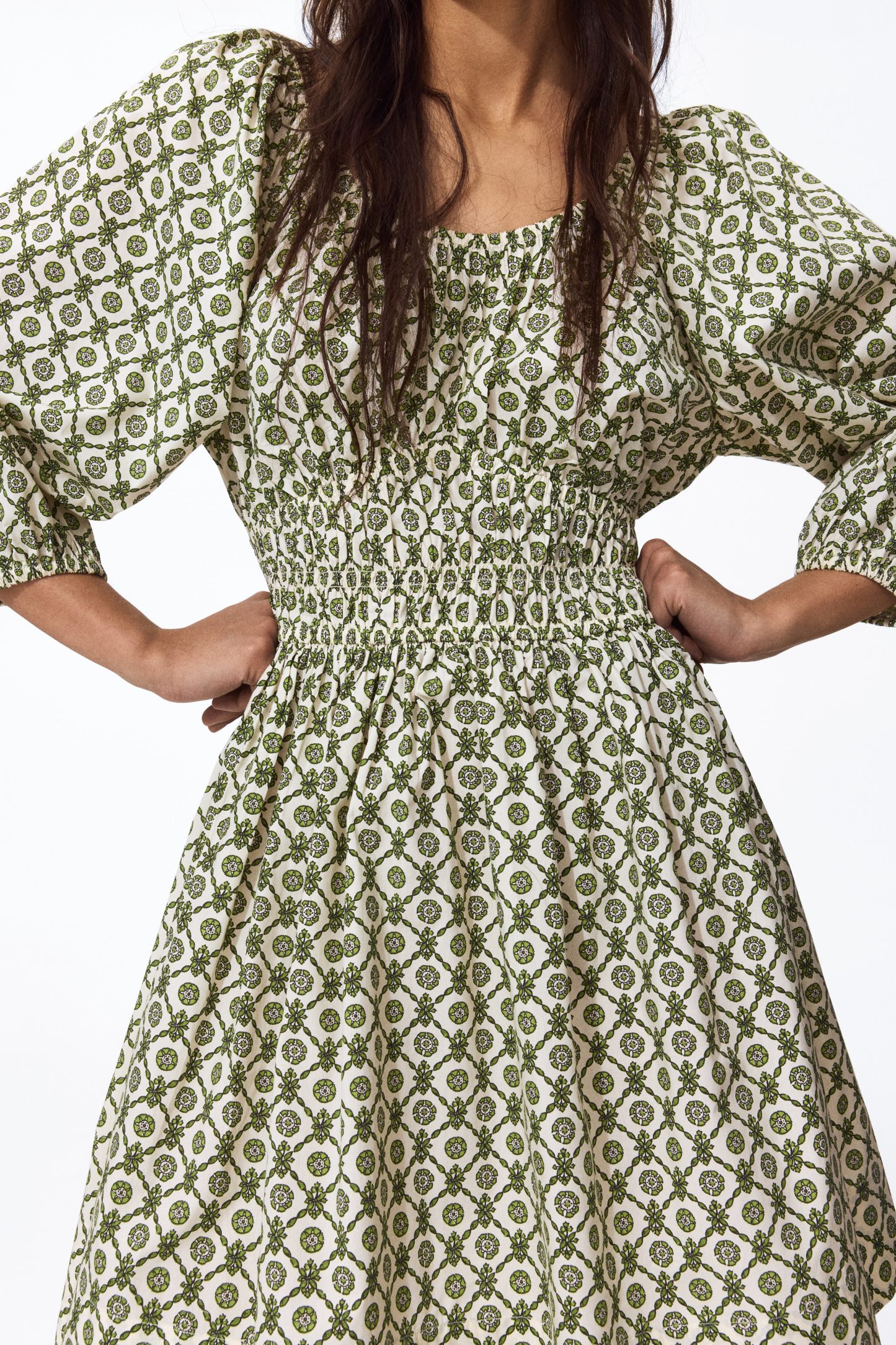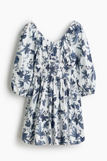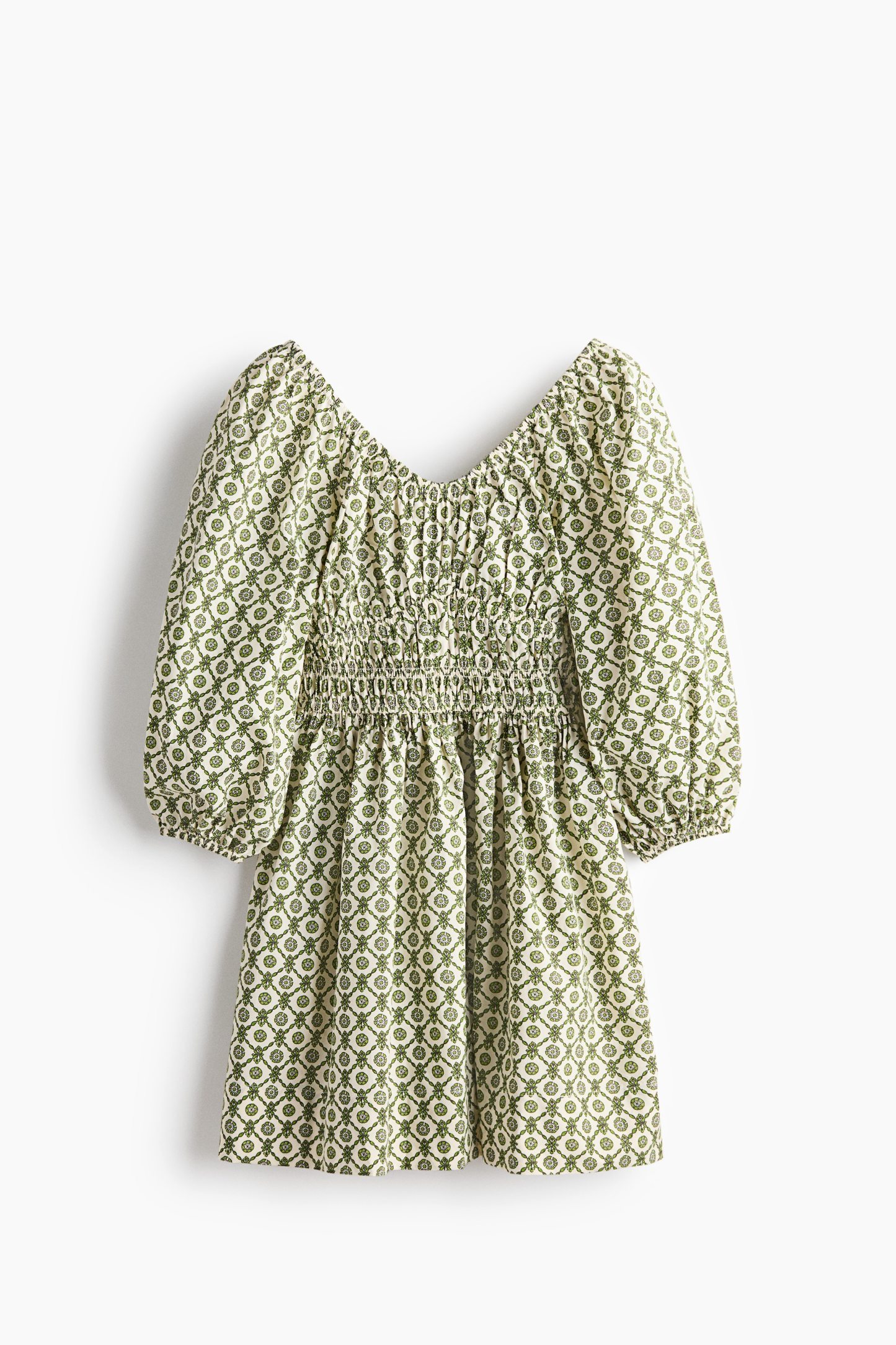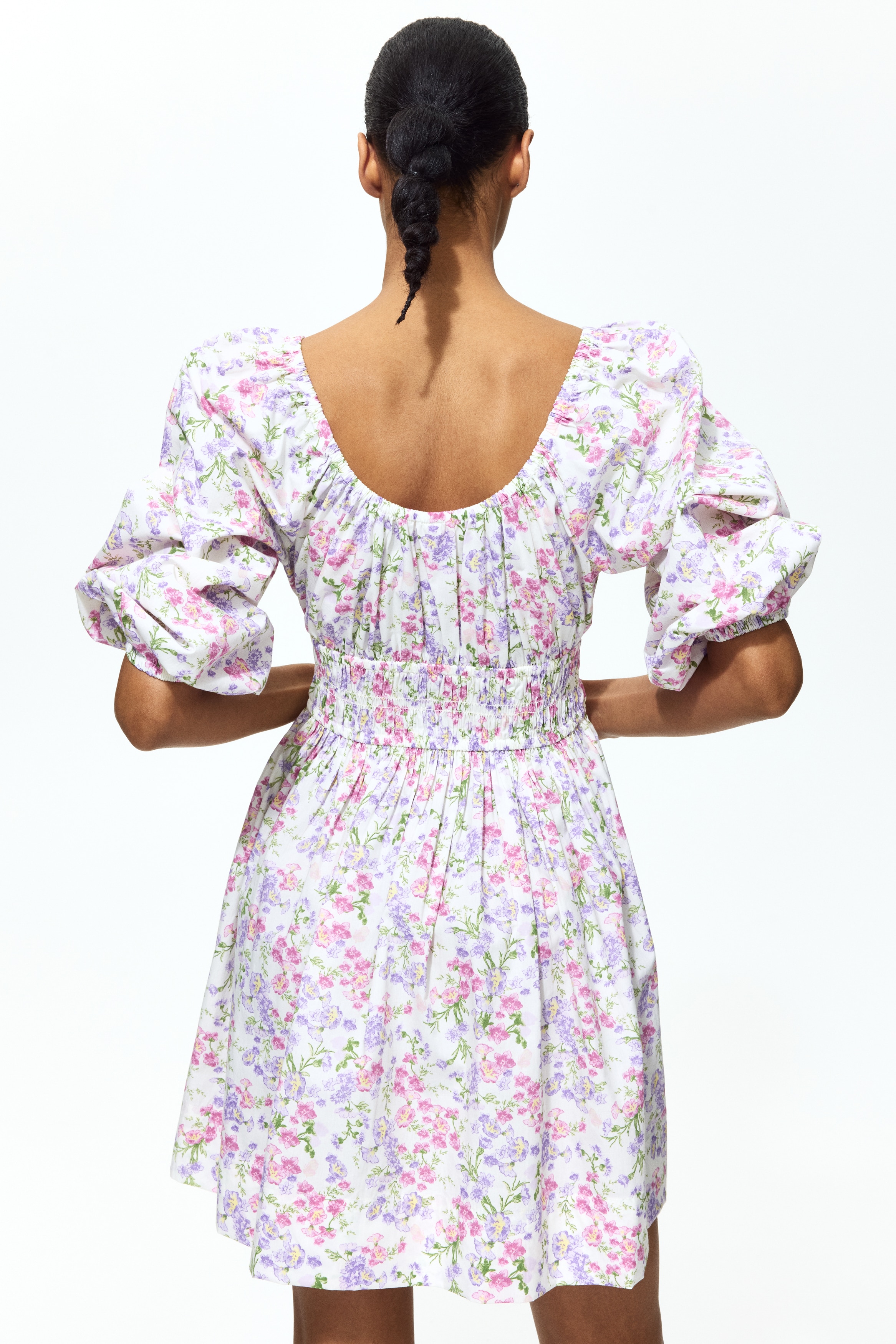 Short dress in a cotton weave with an elasticated, V-shaped neckline and elbow-length balloon sleeves with narrow elastication at the cuffs. Fitted bodice with a smocked section at the waist and a flared skirt. Unlined.