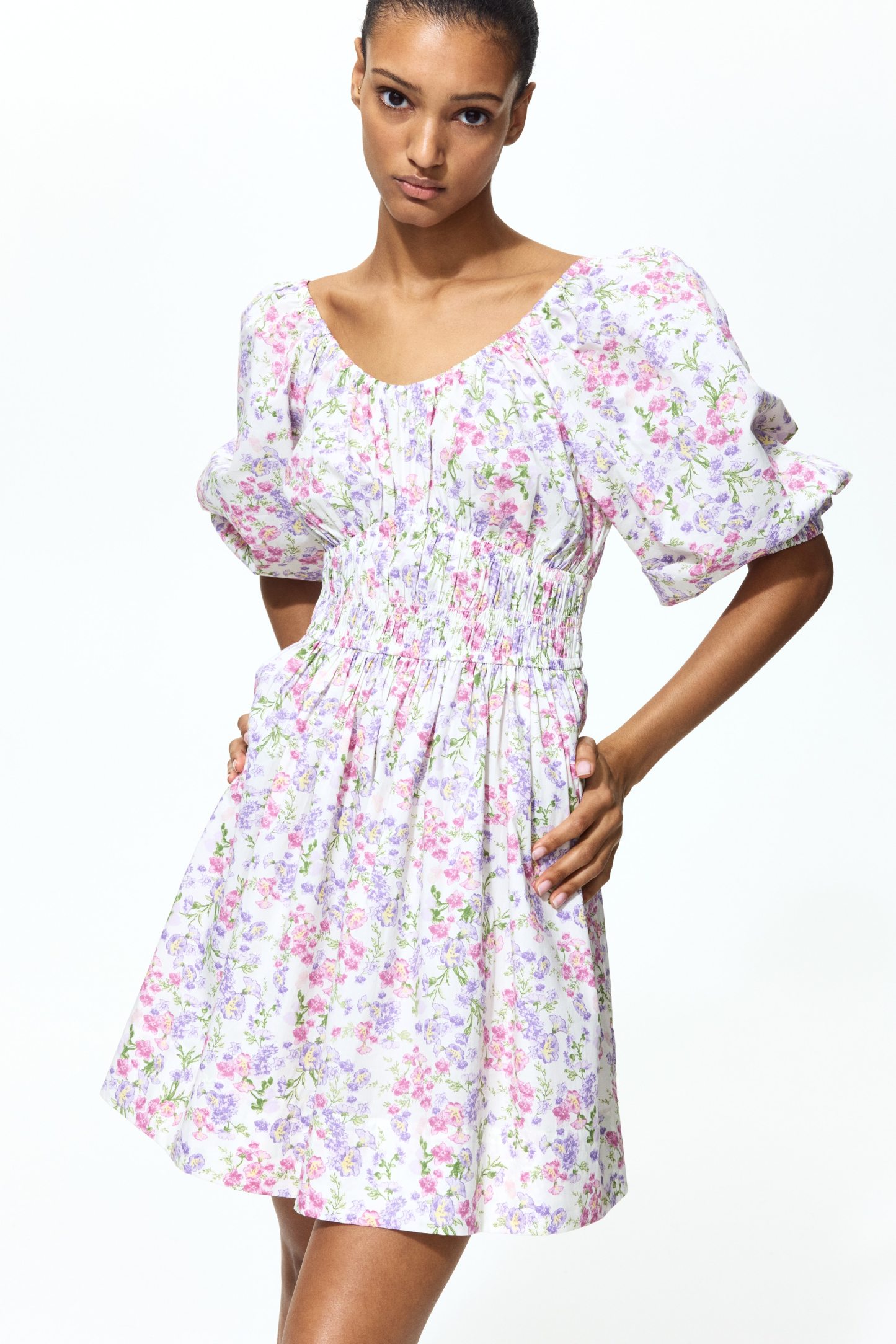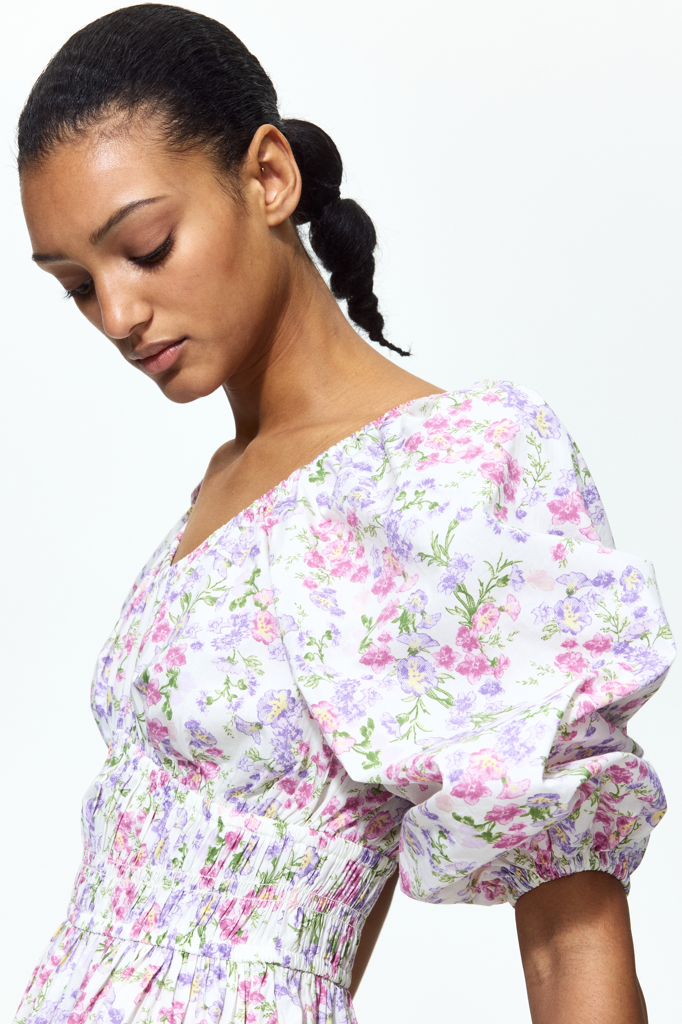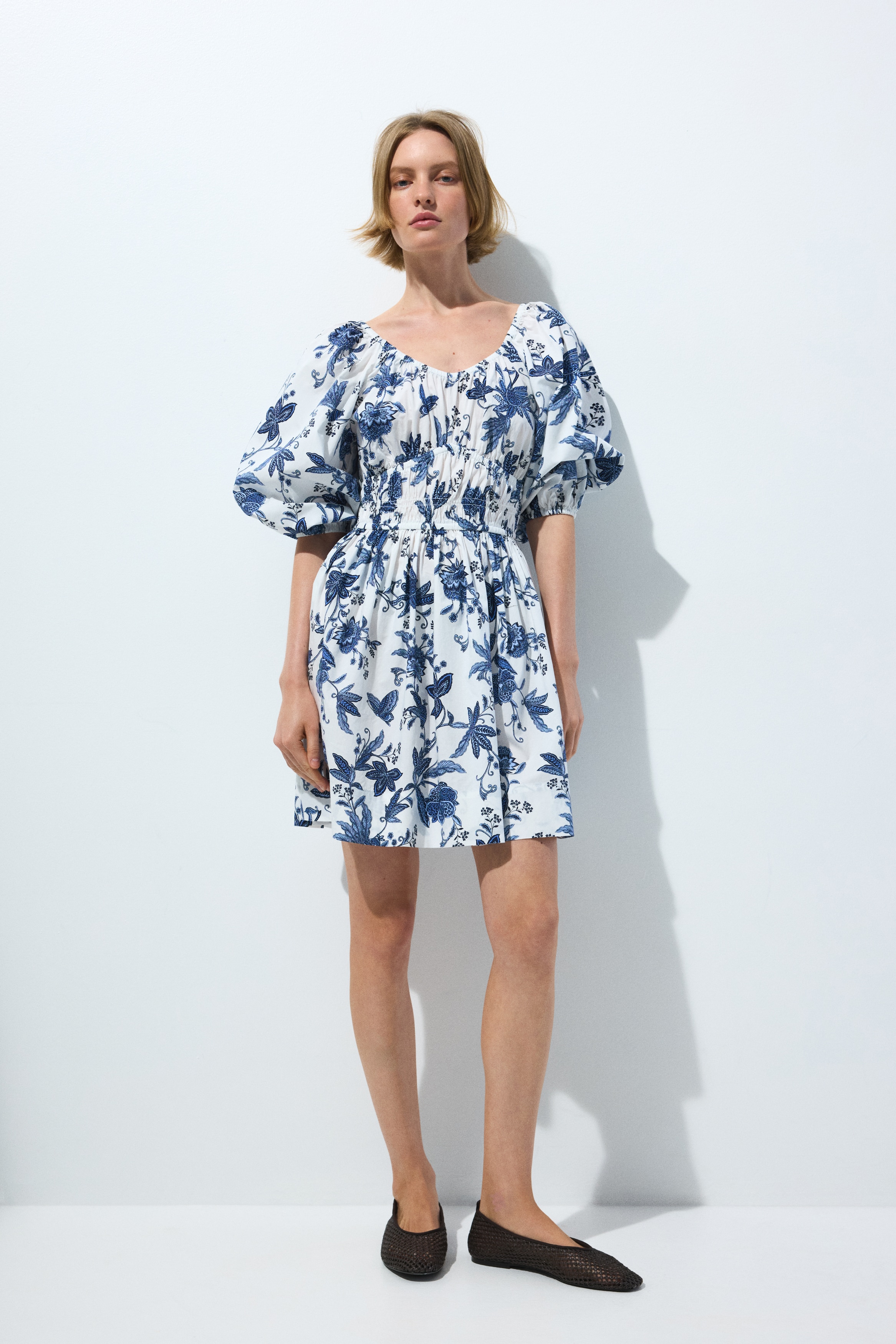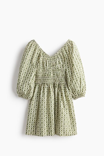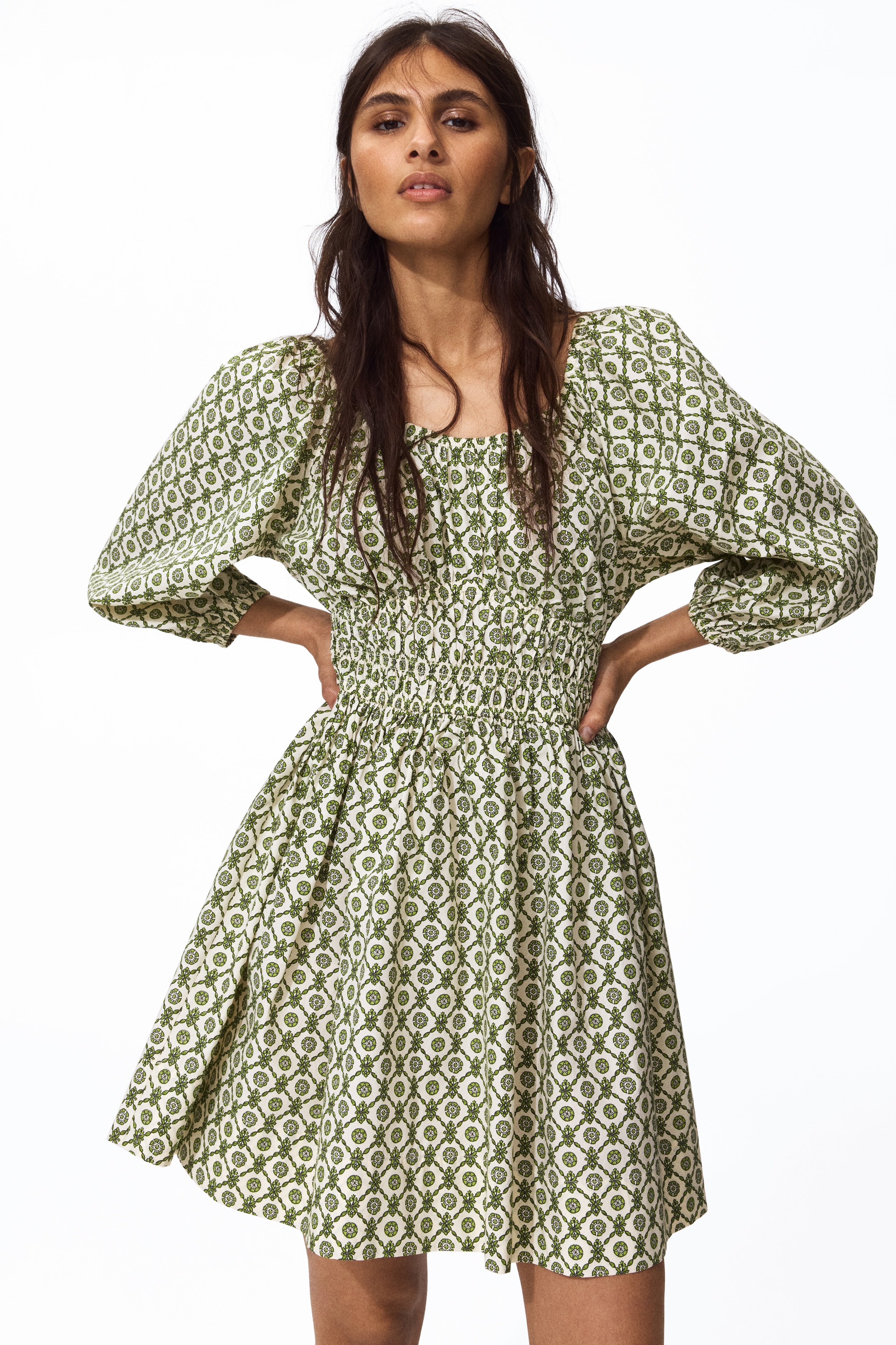 Short dress in a cotton weave with an elasticated, V-shaped neckline and elbow-length balloon sleeves with narrow elastication at the cuffs. Fitted bodice with a smocked section at the waist and a flared skirt. Unlined.