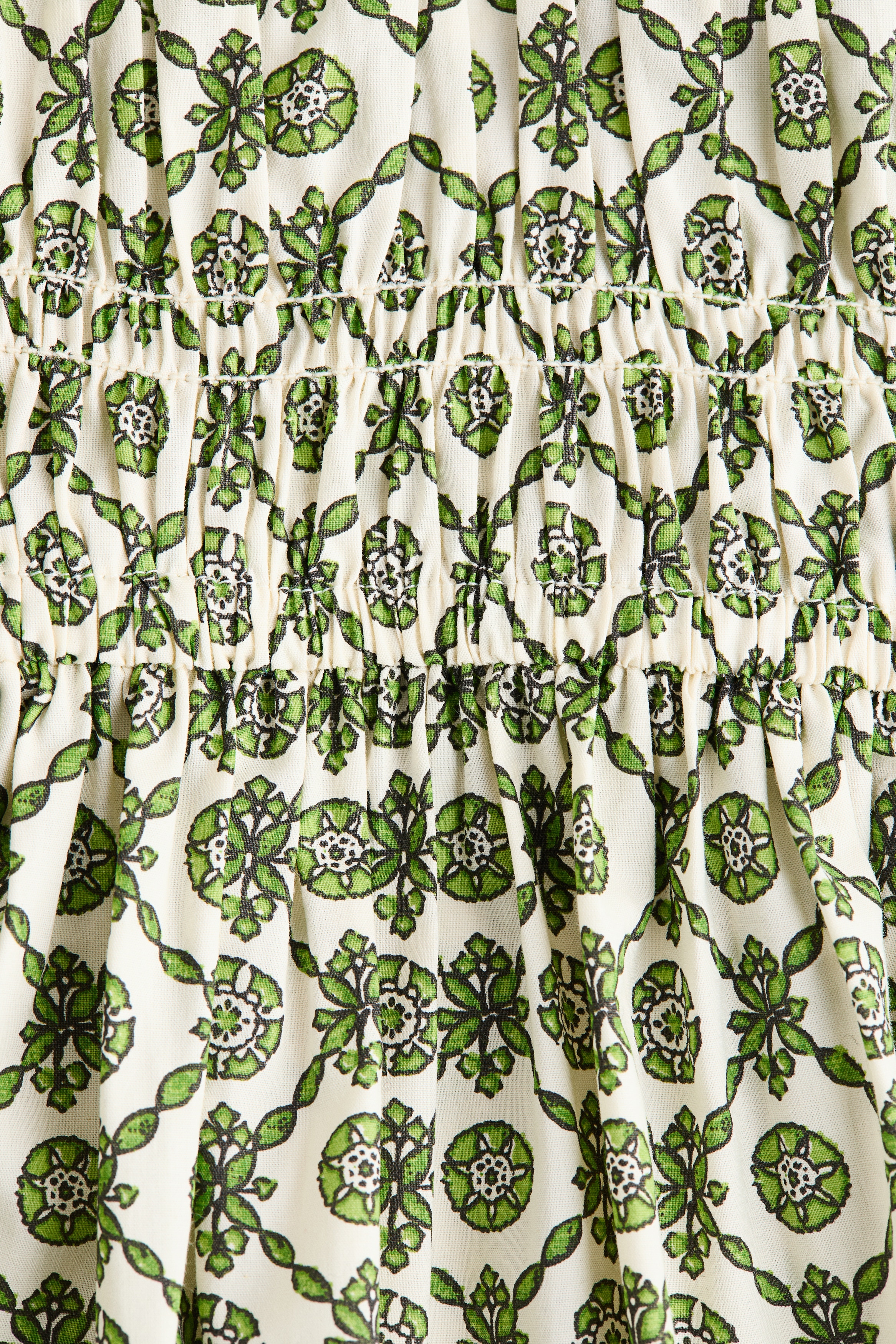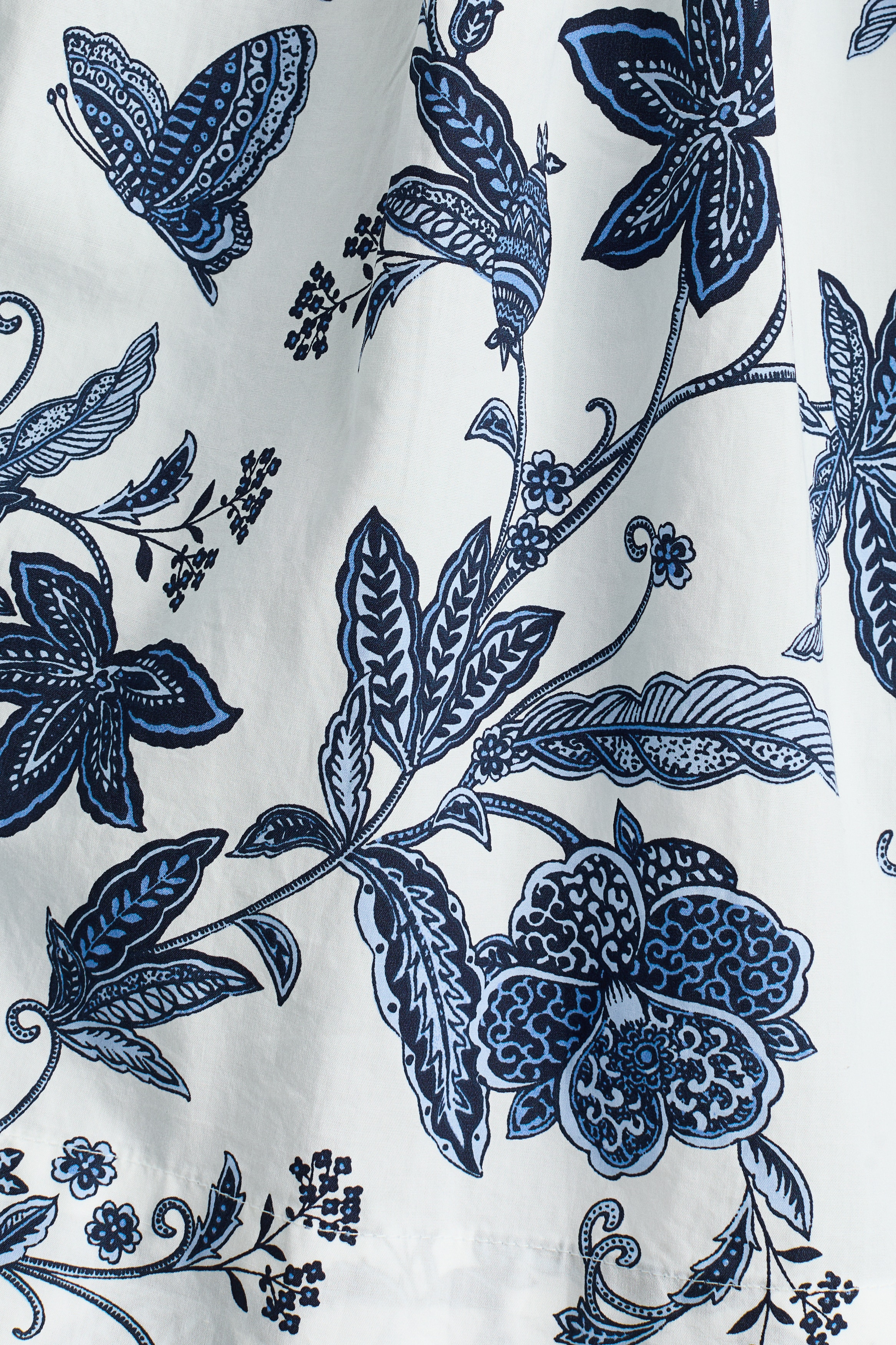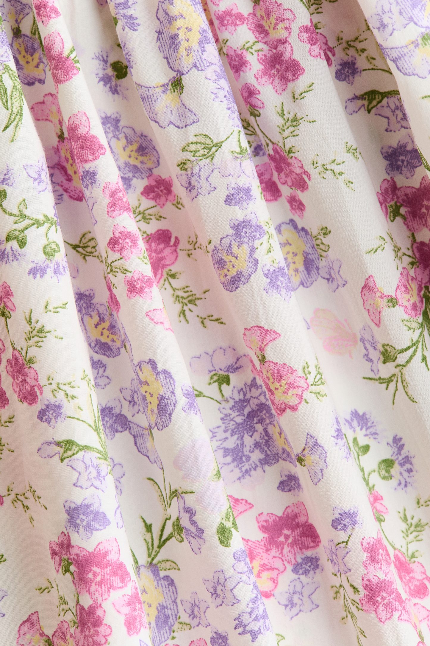 Short dress in a cotton weave with an elasticated, V-shaped neckline and elbow-length balloon sleeves with narrow elastication at the cuffs. Fitted bodice with a smocked section at the waist and a flared skirt. Unlined.