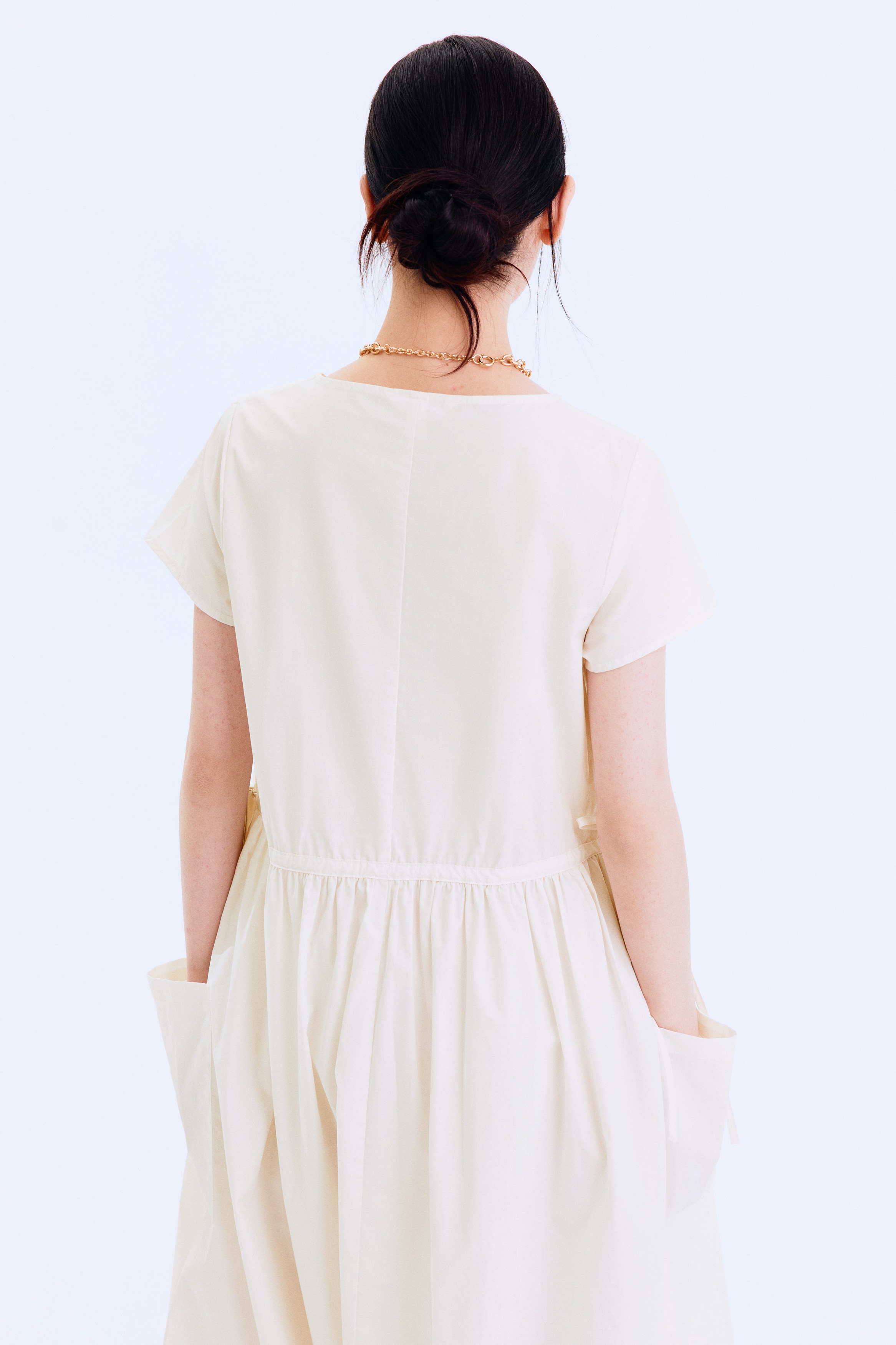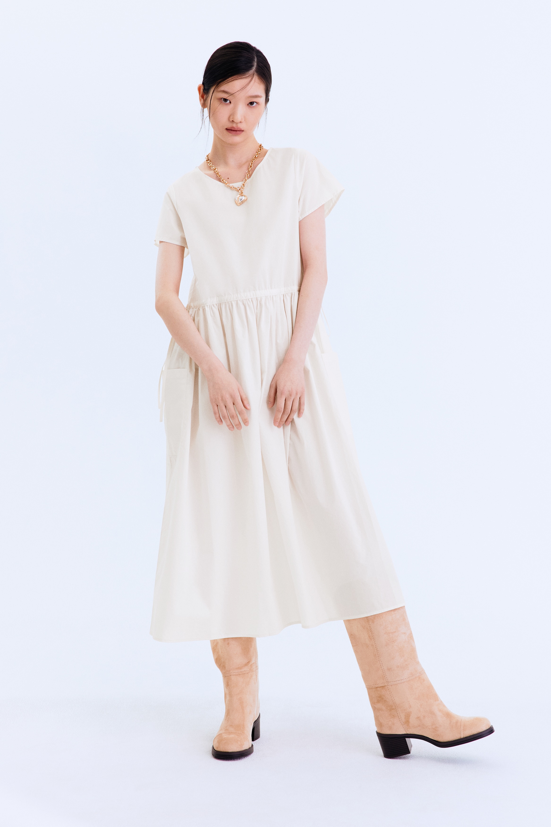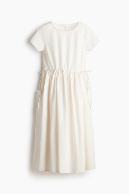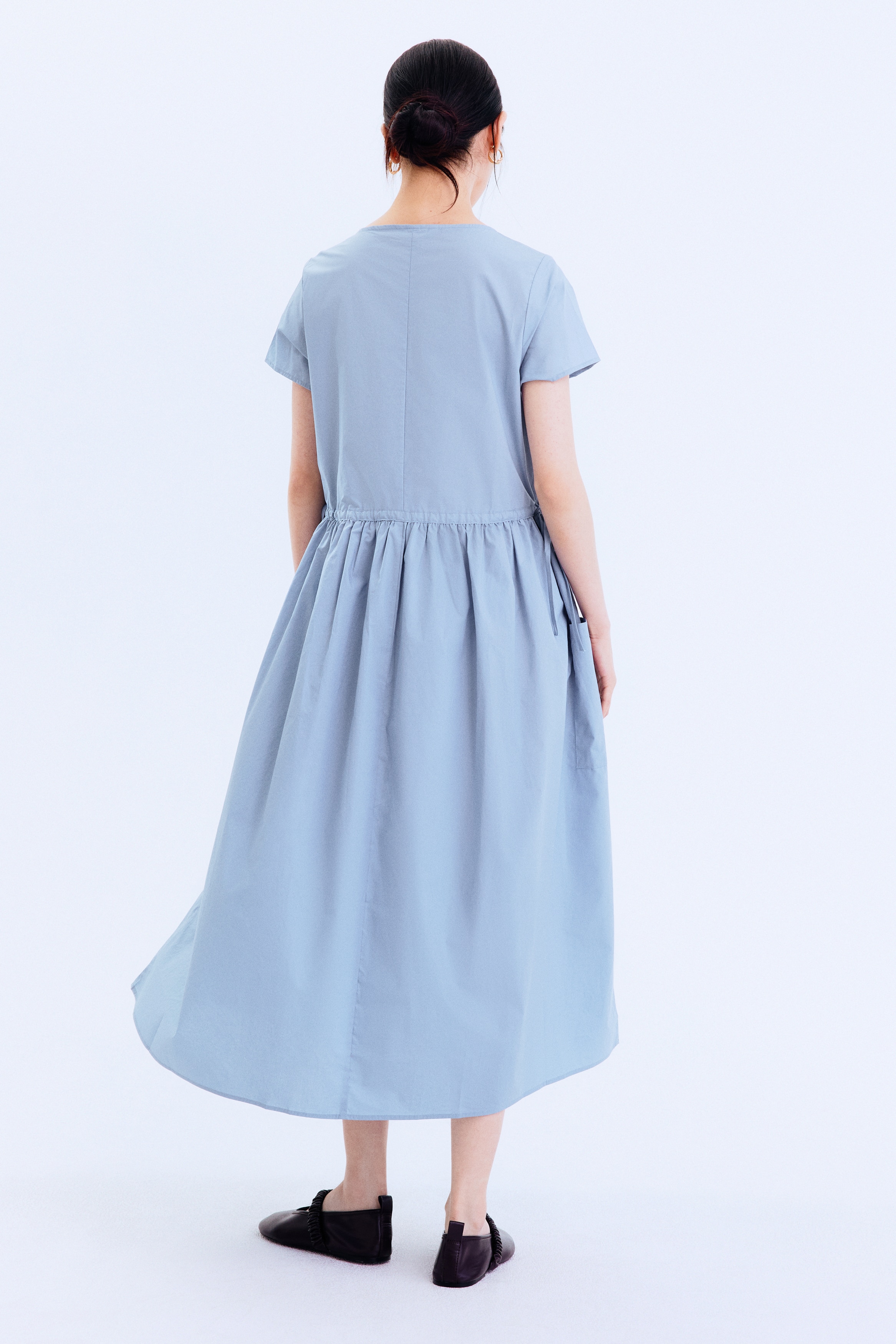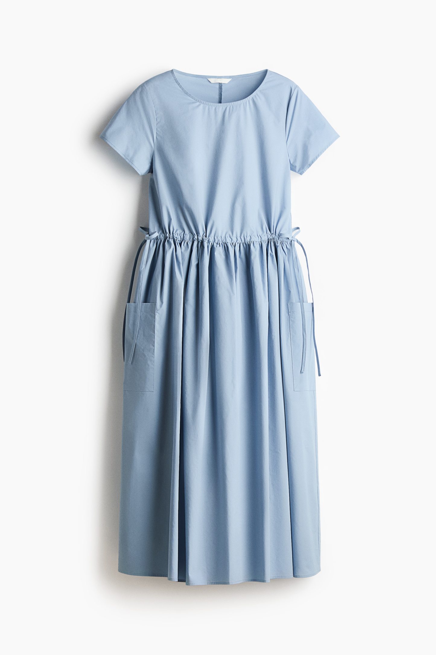 Calf-length dress in crisp cotton poplin. Relaxed fit with a round neckline, short sleeves and double drawstring at the waist with ties at each side. Gently flared skirt with patch pockets at the sides. Unlined.
