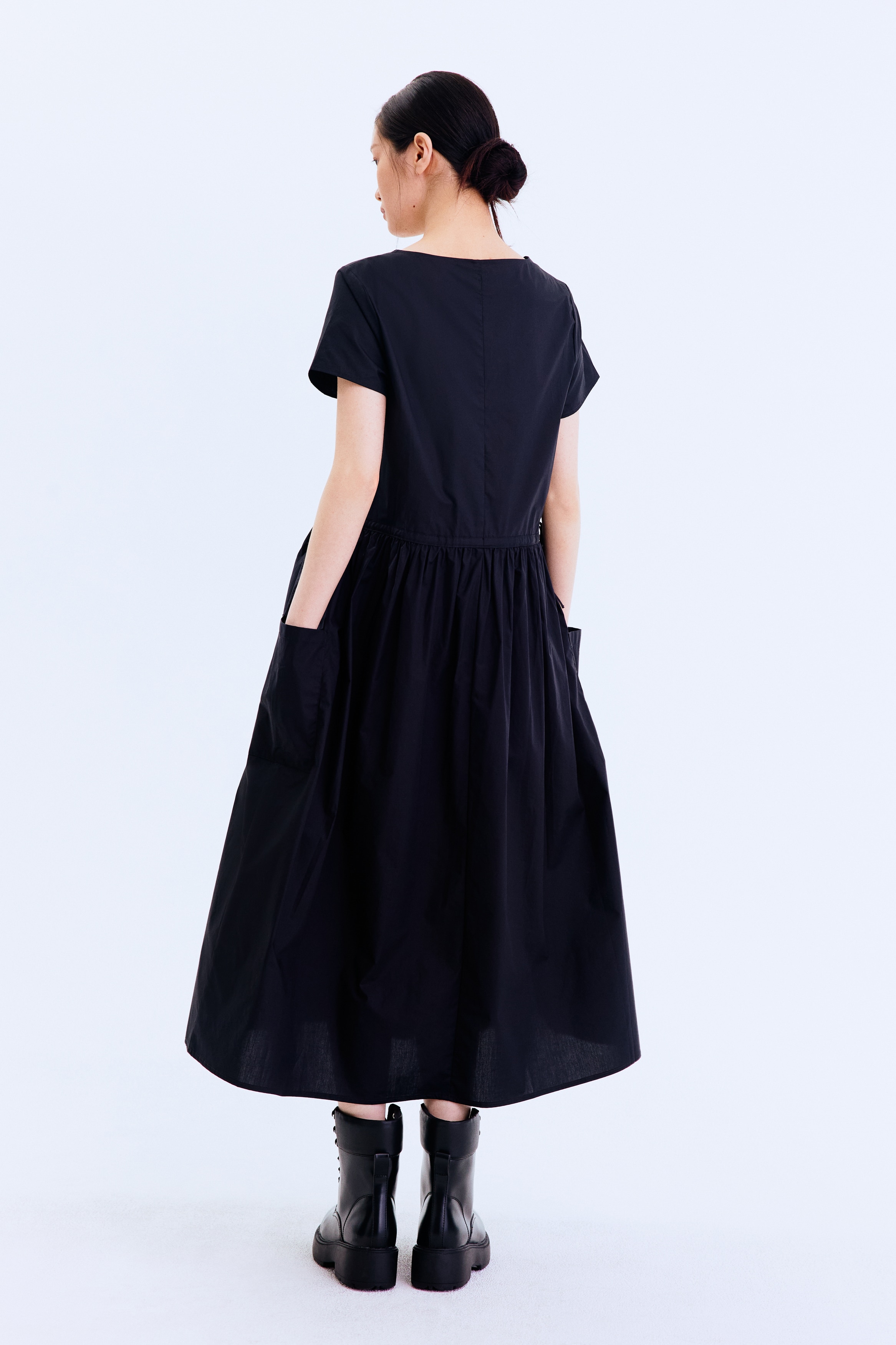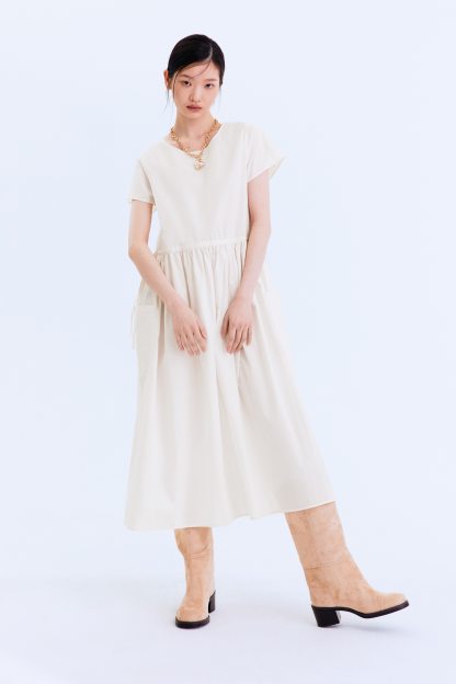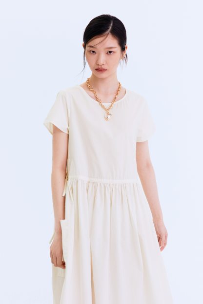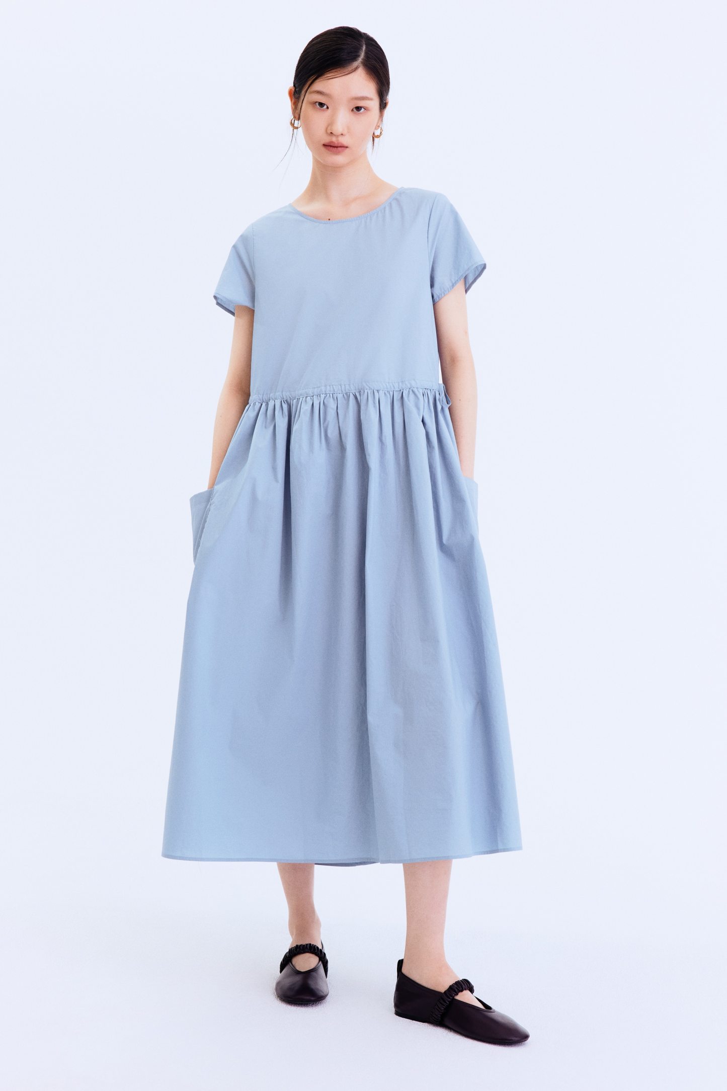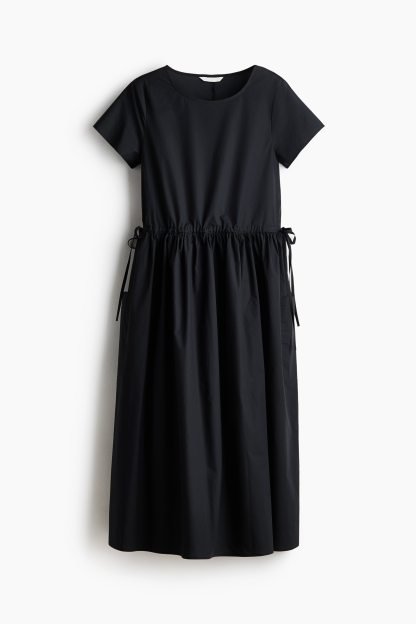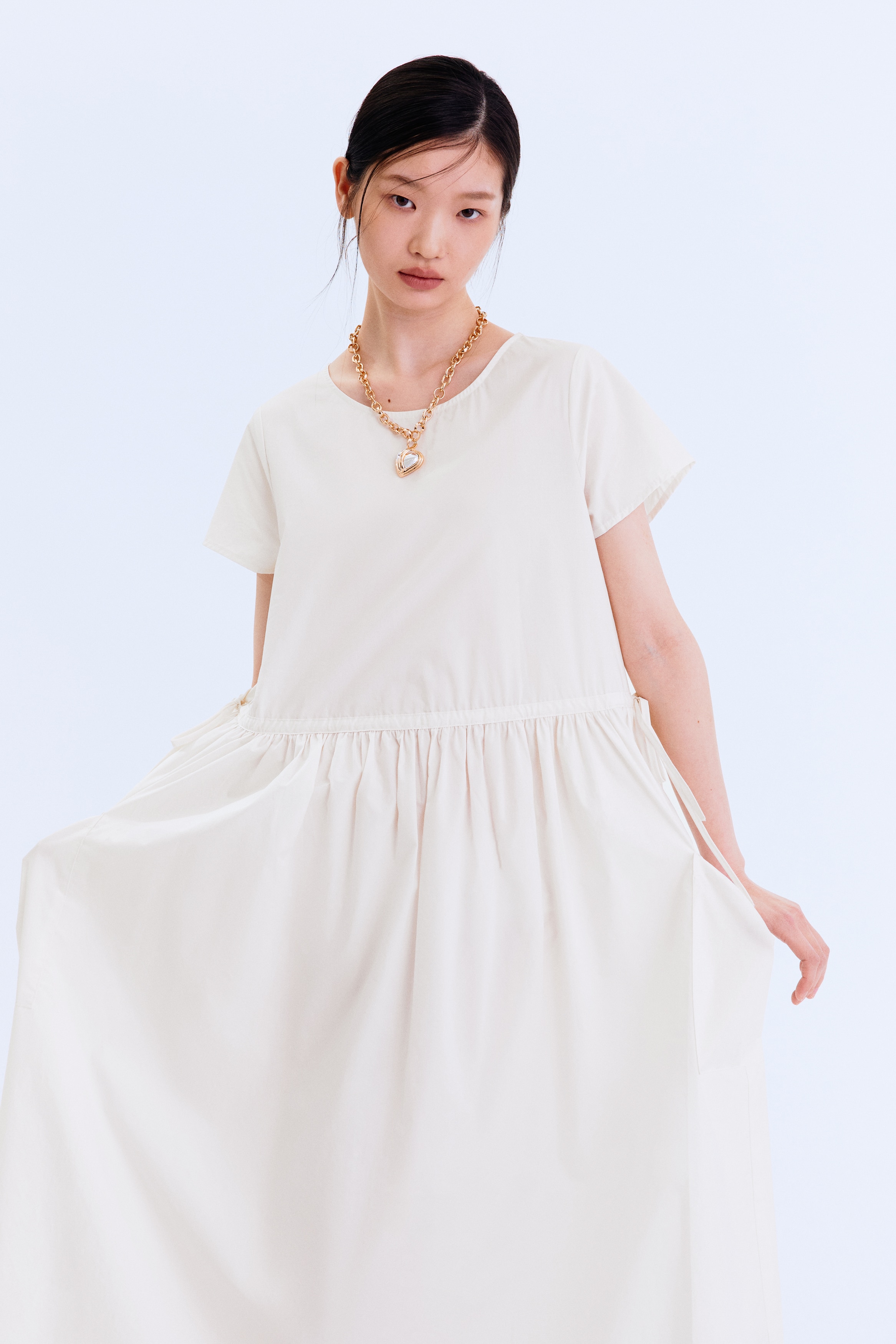 Calf-length dress in crisp cotton poplin. Relaxed fit with a round neckline, short sleeves and double drawstring at the waist with ties at each side. Gently flared skirt with patch pockets at the sides. Unlined.