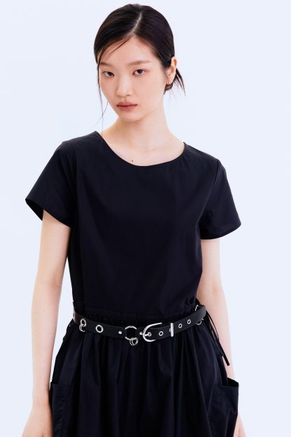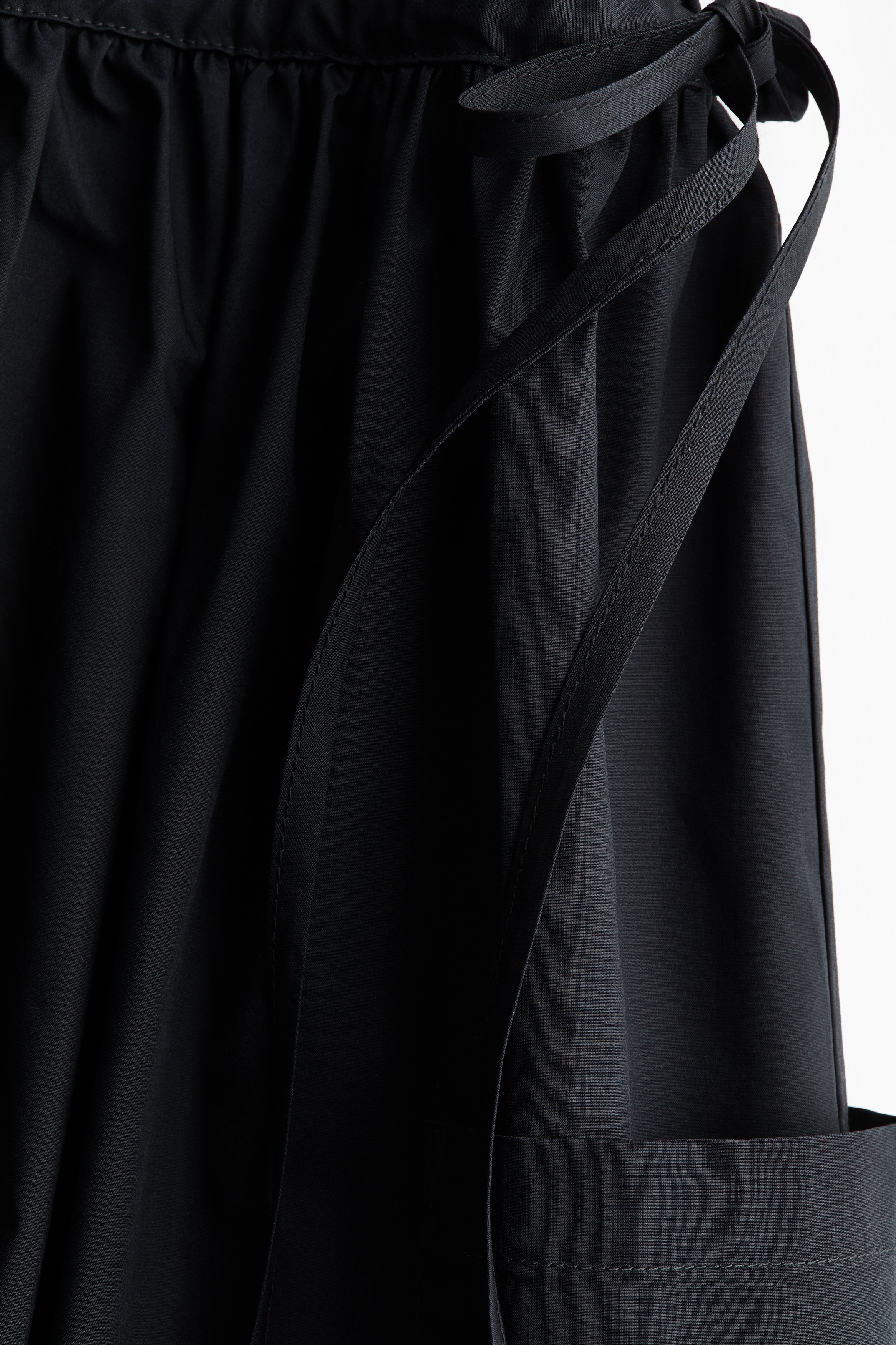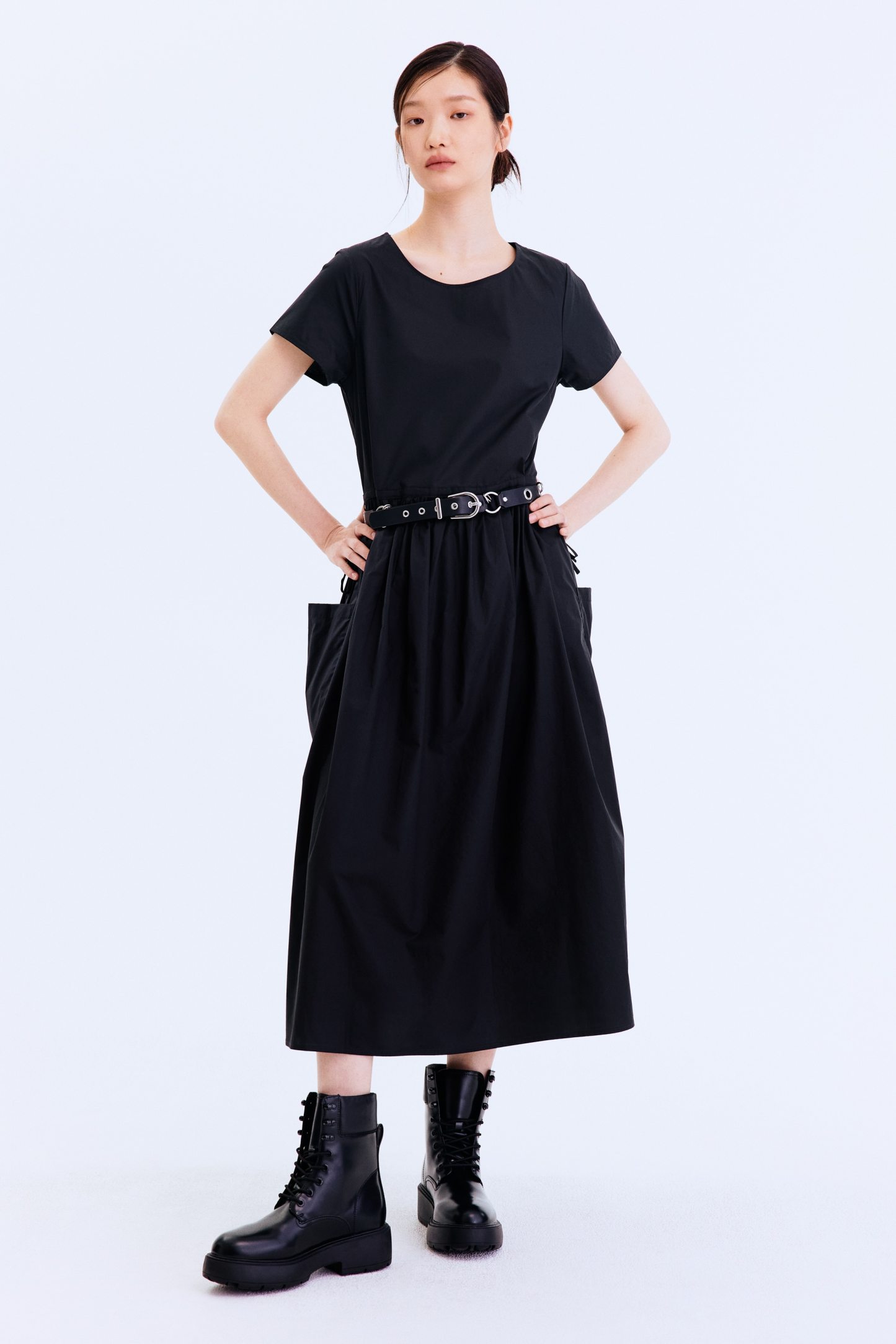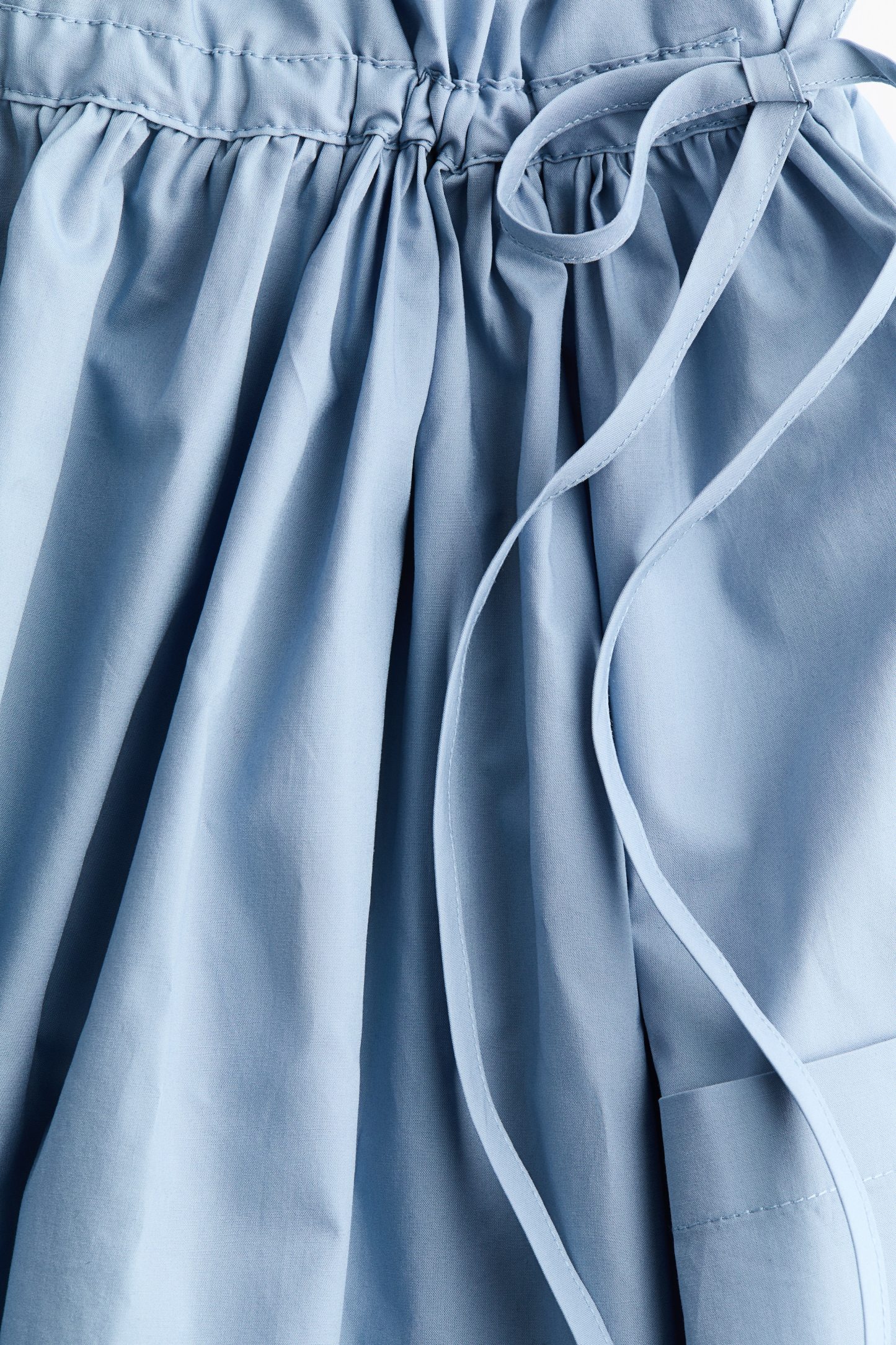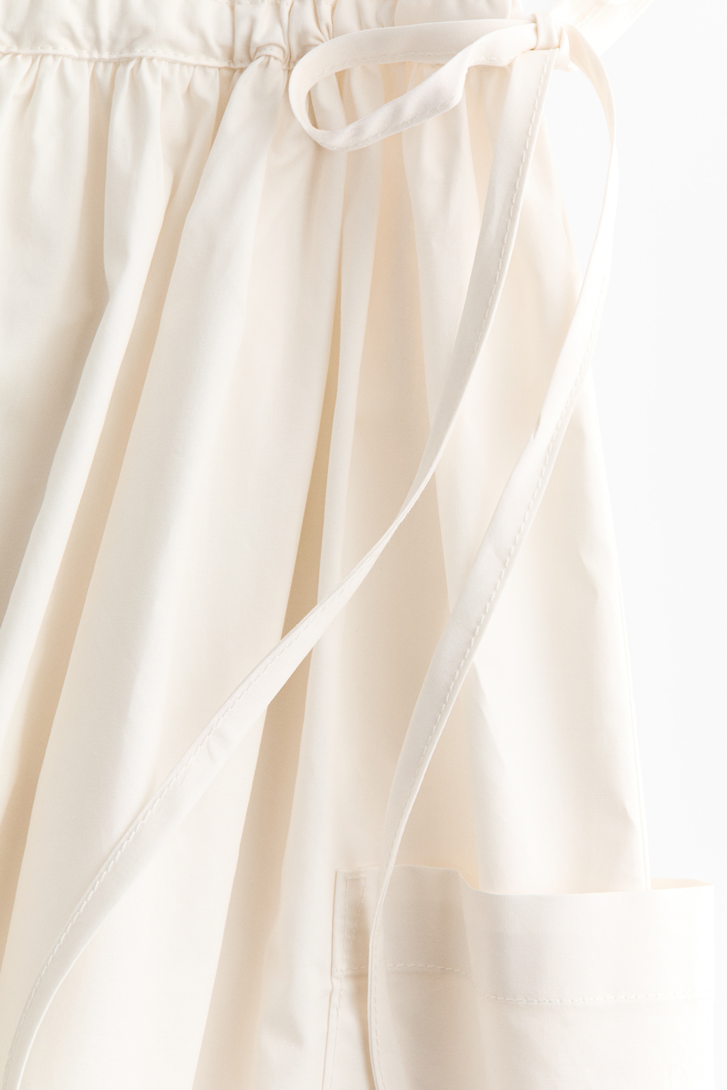 Calf-length dress in crisp cotton poplin. Relaxed fit with a round neckline, short sleeves and double drawstring at the waist with ties at each side. Gently flared skirt with patch pockets at the sides. Unlined.