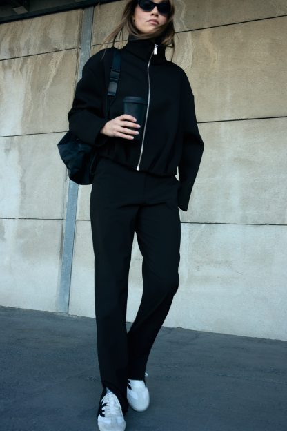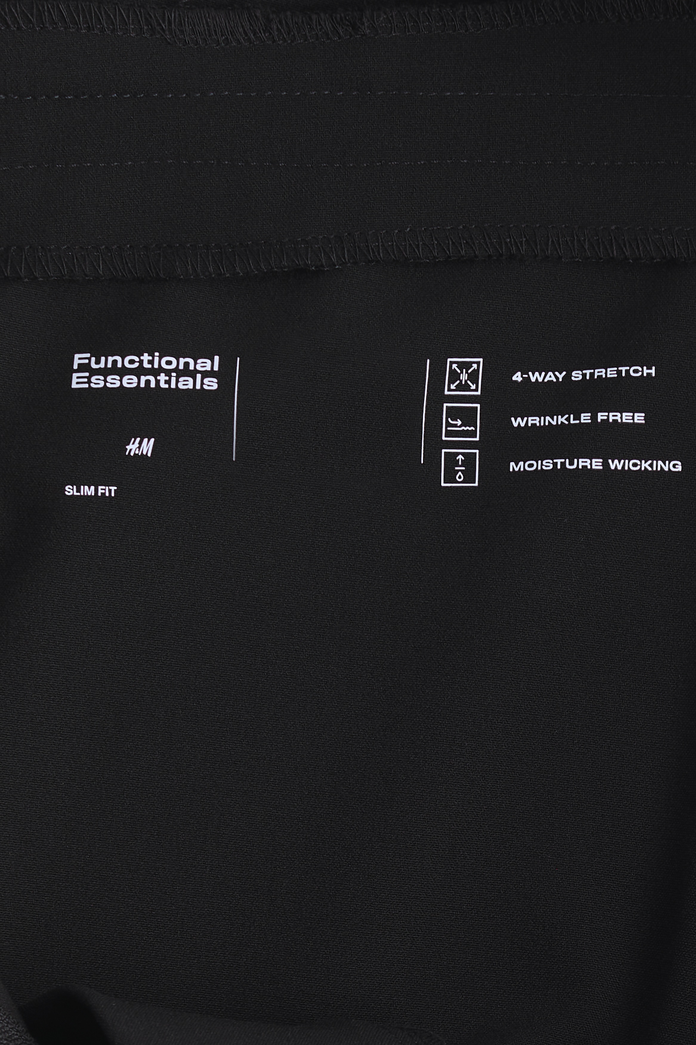 Trousers in a moisture-wicking and wrinkle-resistant fabric with four-way stretch that offers complete flexibility, shape and fluid motion in every direction – ideal for travel or daily commuting. Slim fit featuring a high waist with a zip fly and a concealed div and hook-and-bar fastener. Diagonal side pockets, a decorative back pocket and straight legs with a slit at one side of the hems. Functional Essentials is a curated selection of pieces that incorporates comfort and performance into everyday wear.