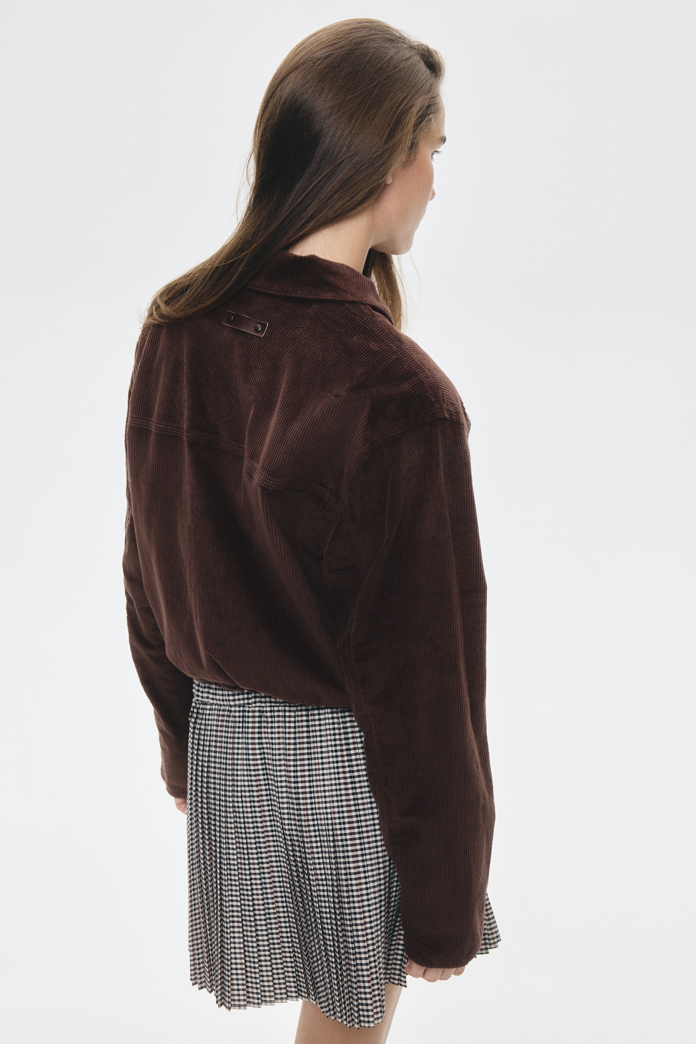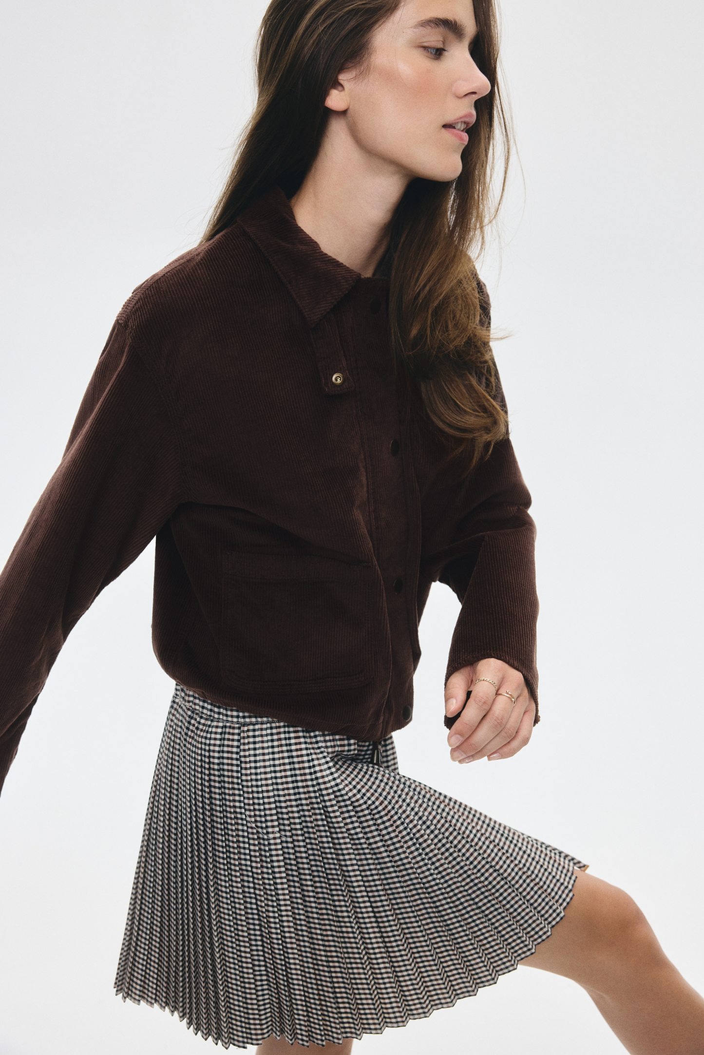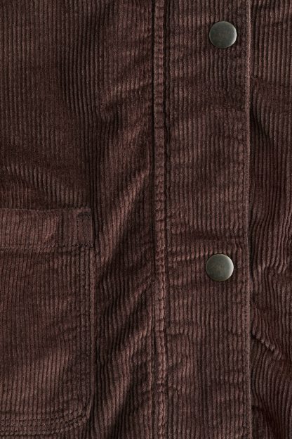 Short jacket in cotton corduroy. Throat latch, wind flap with press-studs and a zip down the front. Long sleeves, jetted chest pocket, open front pockets and a concealed drawstring at the hem. Lined.