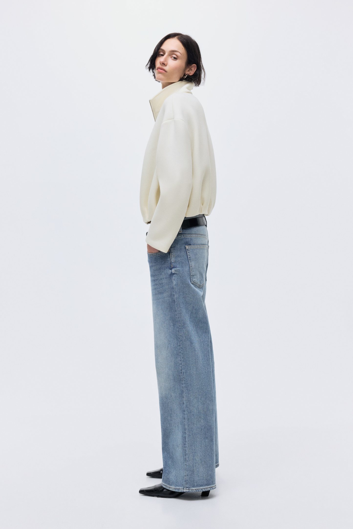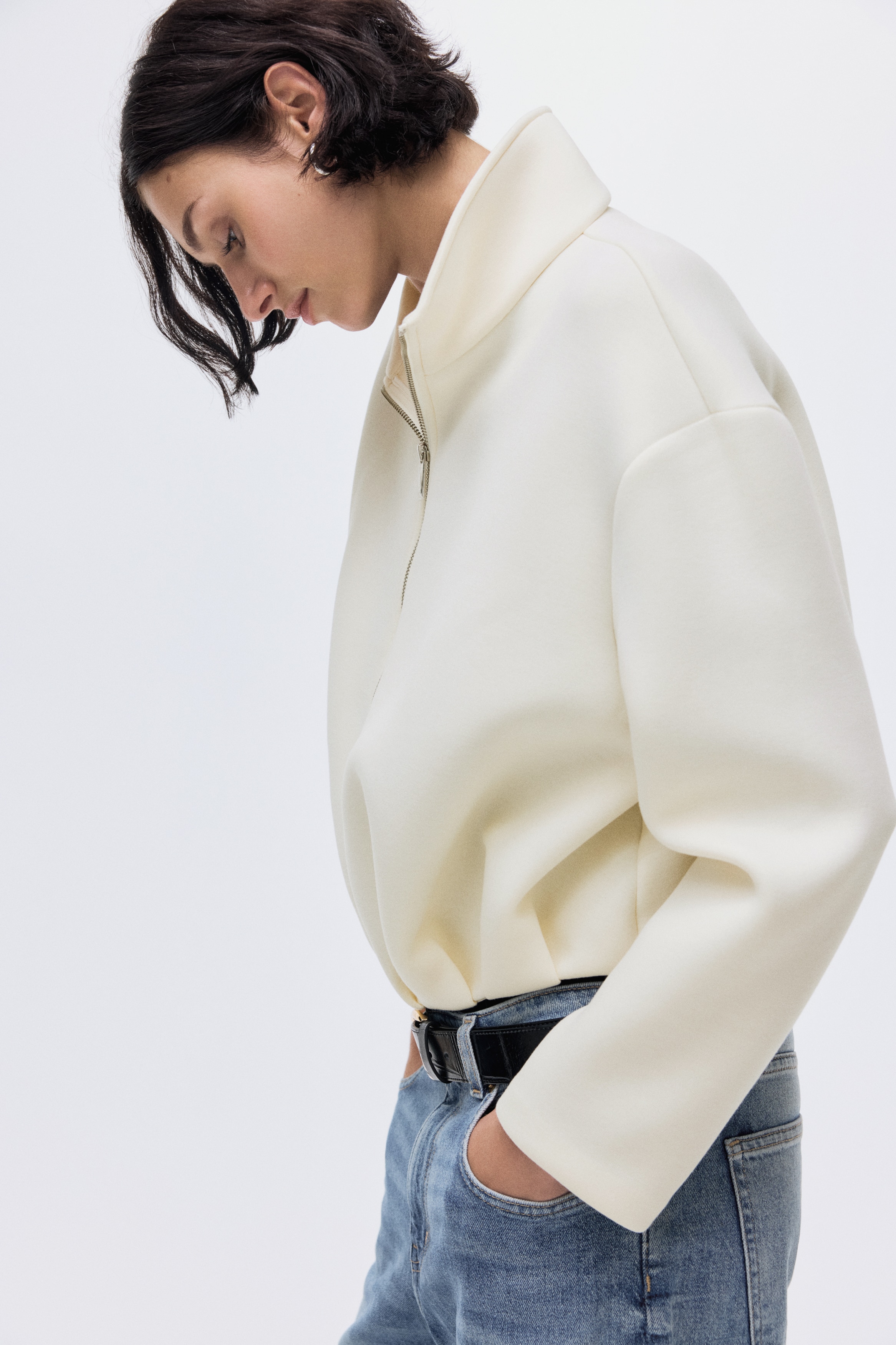 Jacket in scuba fabric with a funnel collar and a zip down the front. Dropped shoulders and pleats around the hem. Unlined.