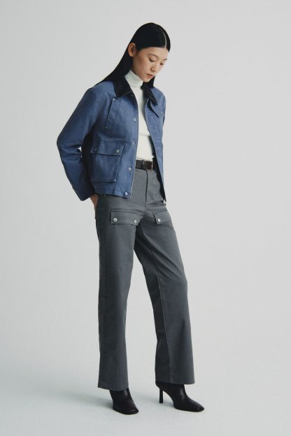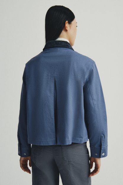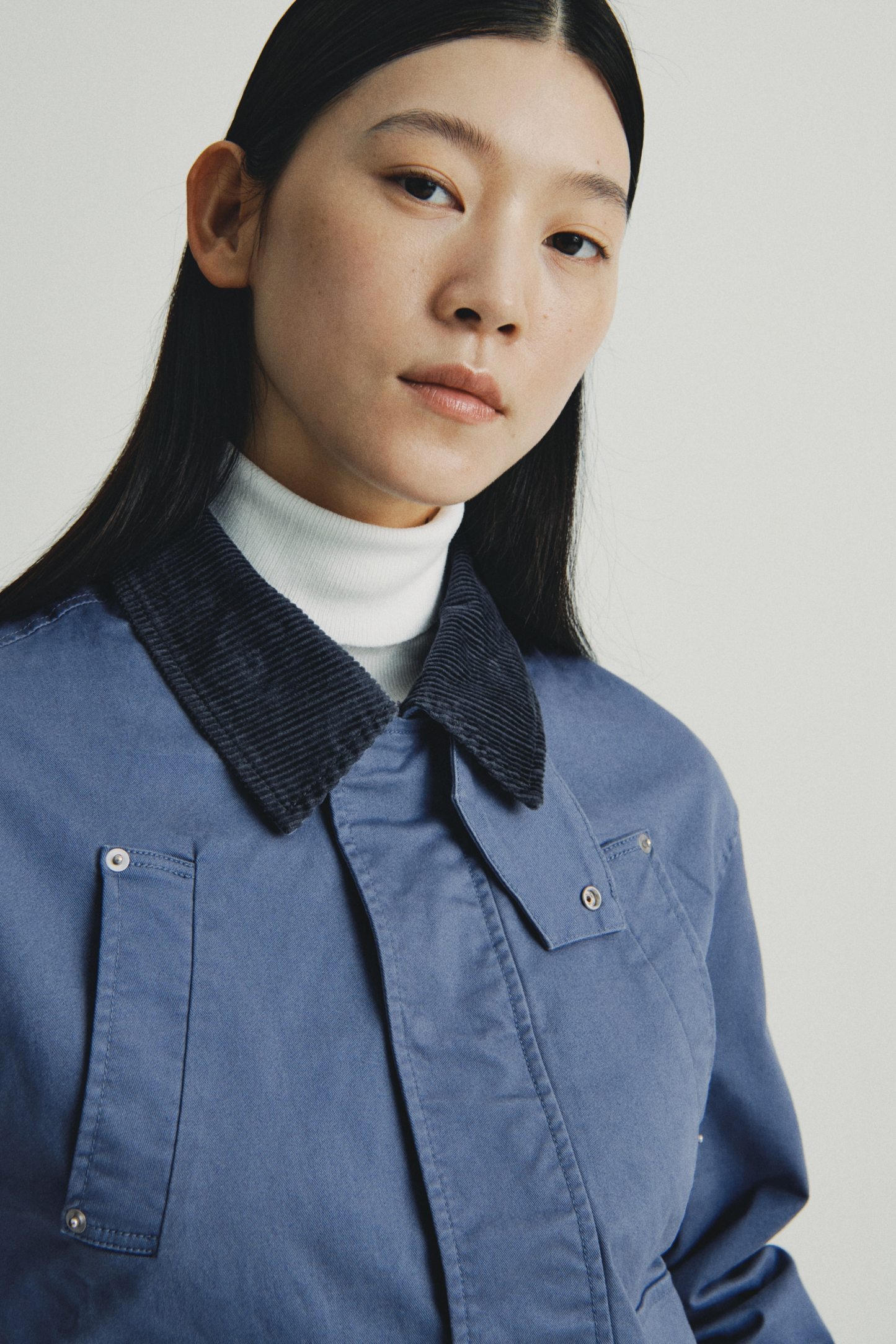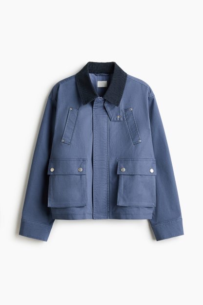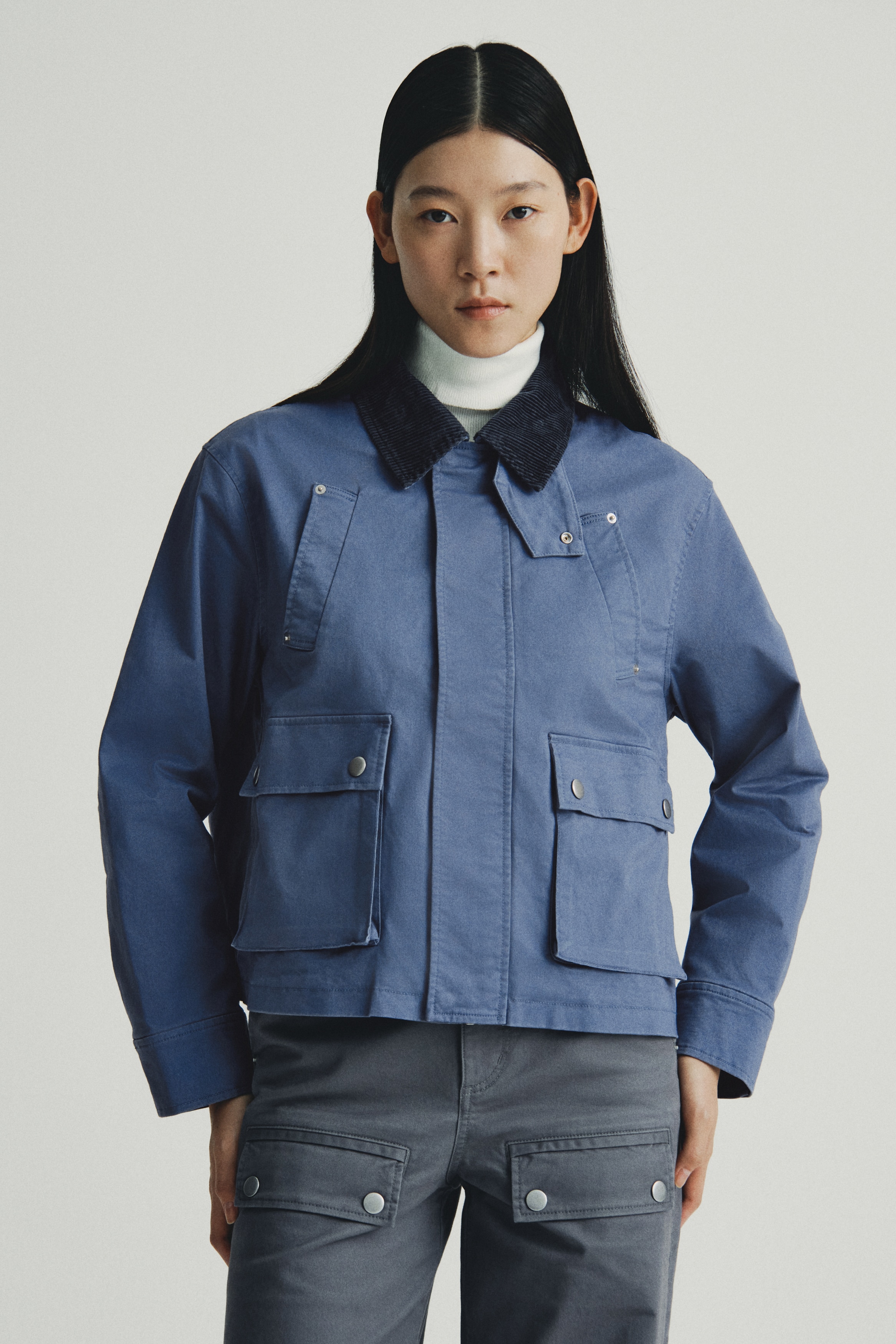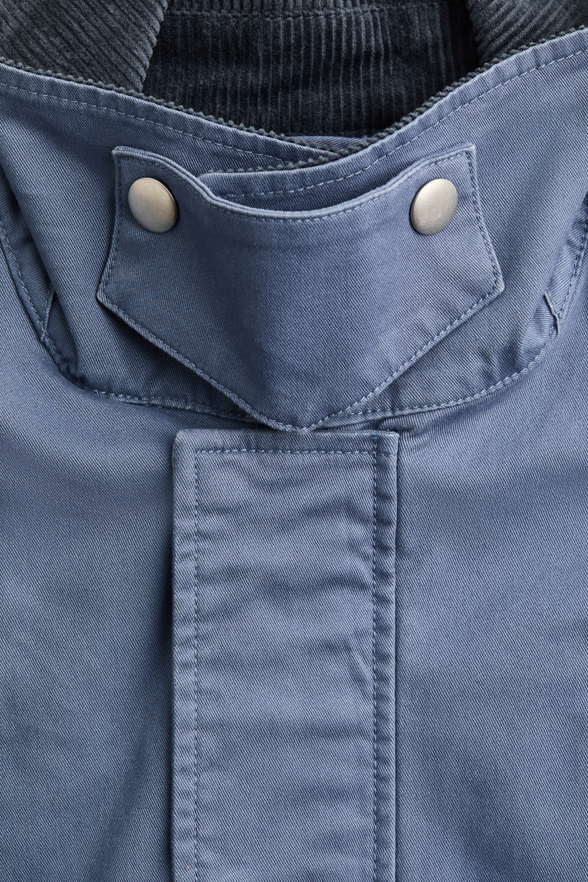 Jacket in cotton twill with a collar in soft corduroy, a detachable throat latch, zip down the front and a wind flap with concealed press-studs. Welt chest pockets, bellows front pockets with a flap and press-studs, and an adjustable press-stud fastening at the cuffs. Yoke and an inverted box pleat at the back. Lined.