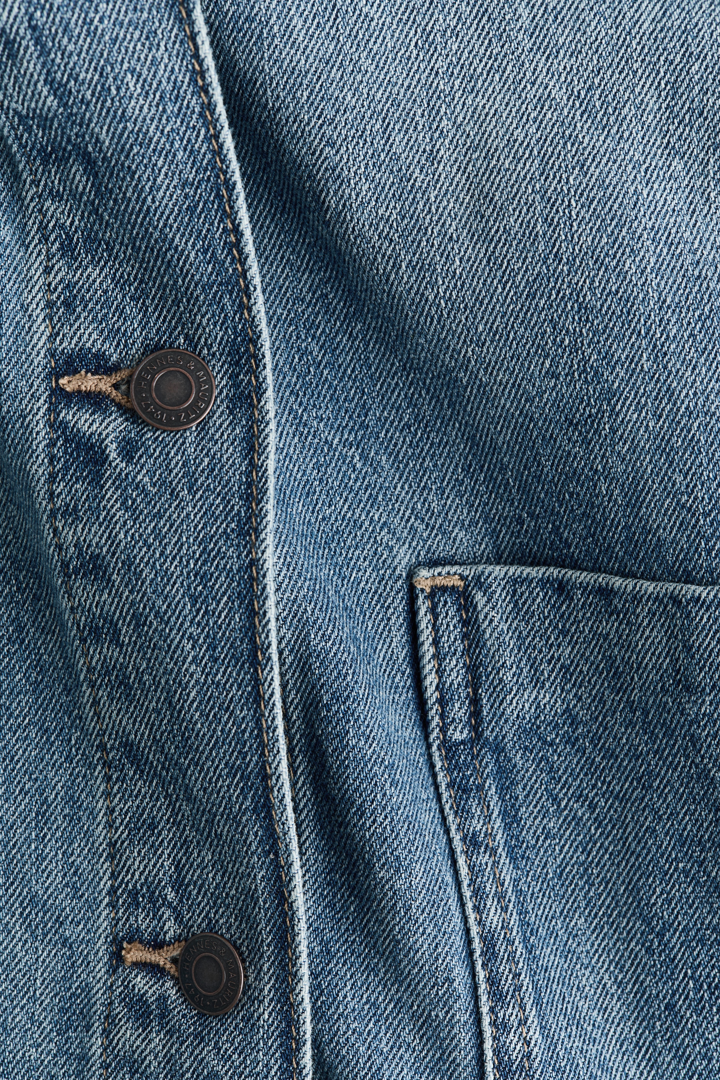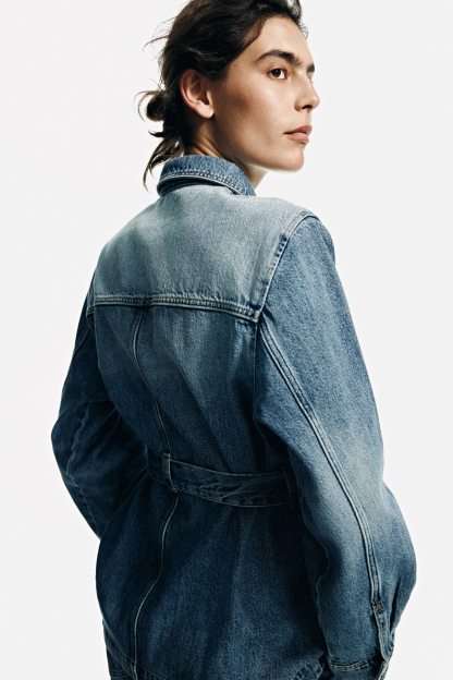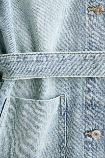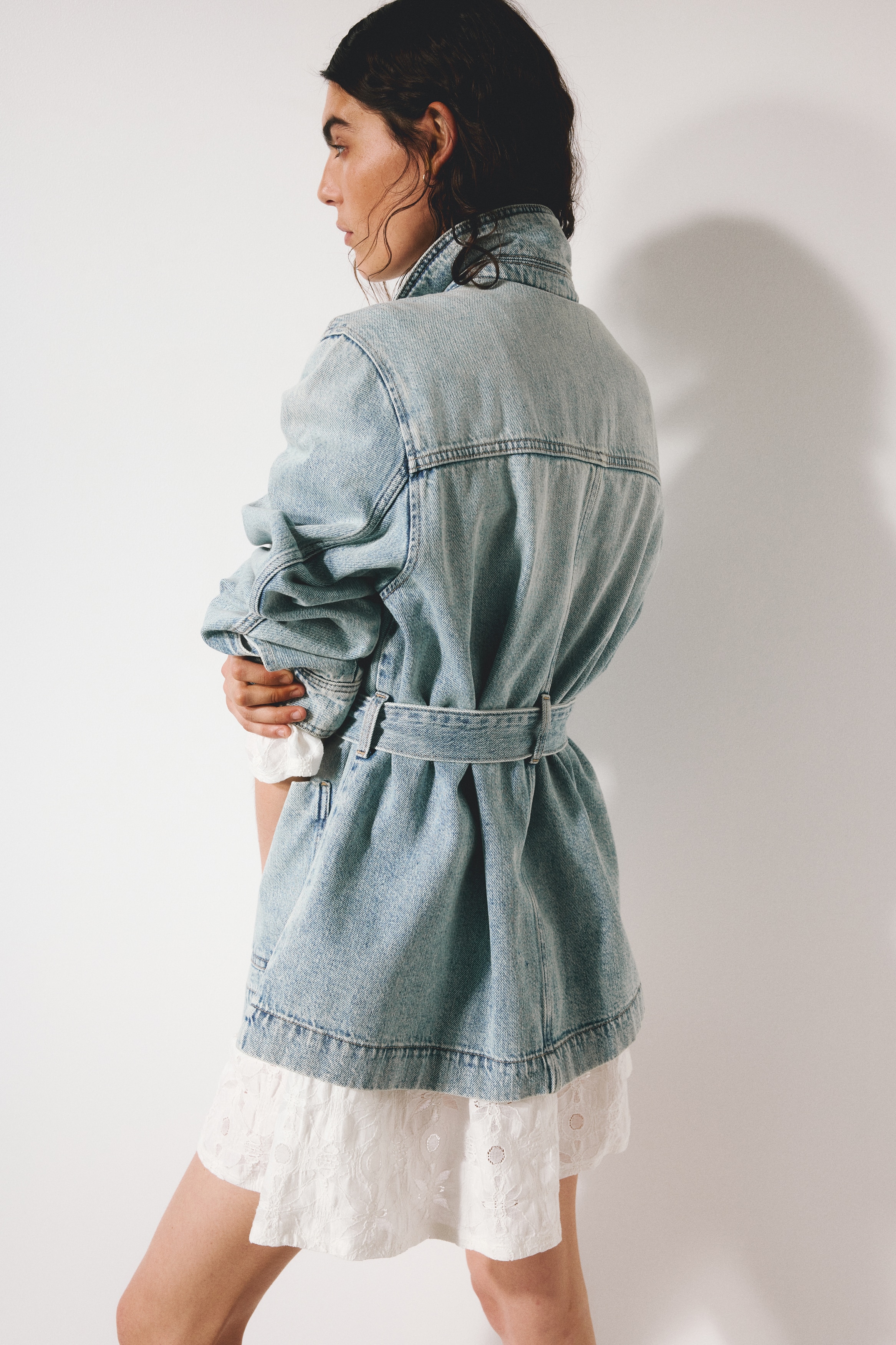 Jacket in rigid cotton denim with a collar, divs down the front and a yoke at the front and back. Buttoned cuffs, patch front pockets and a tie belt at the waist. Unlined.