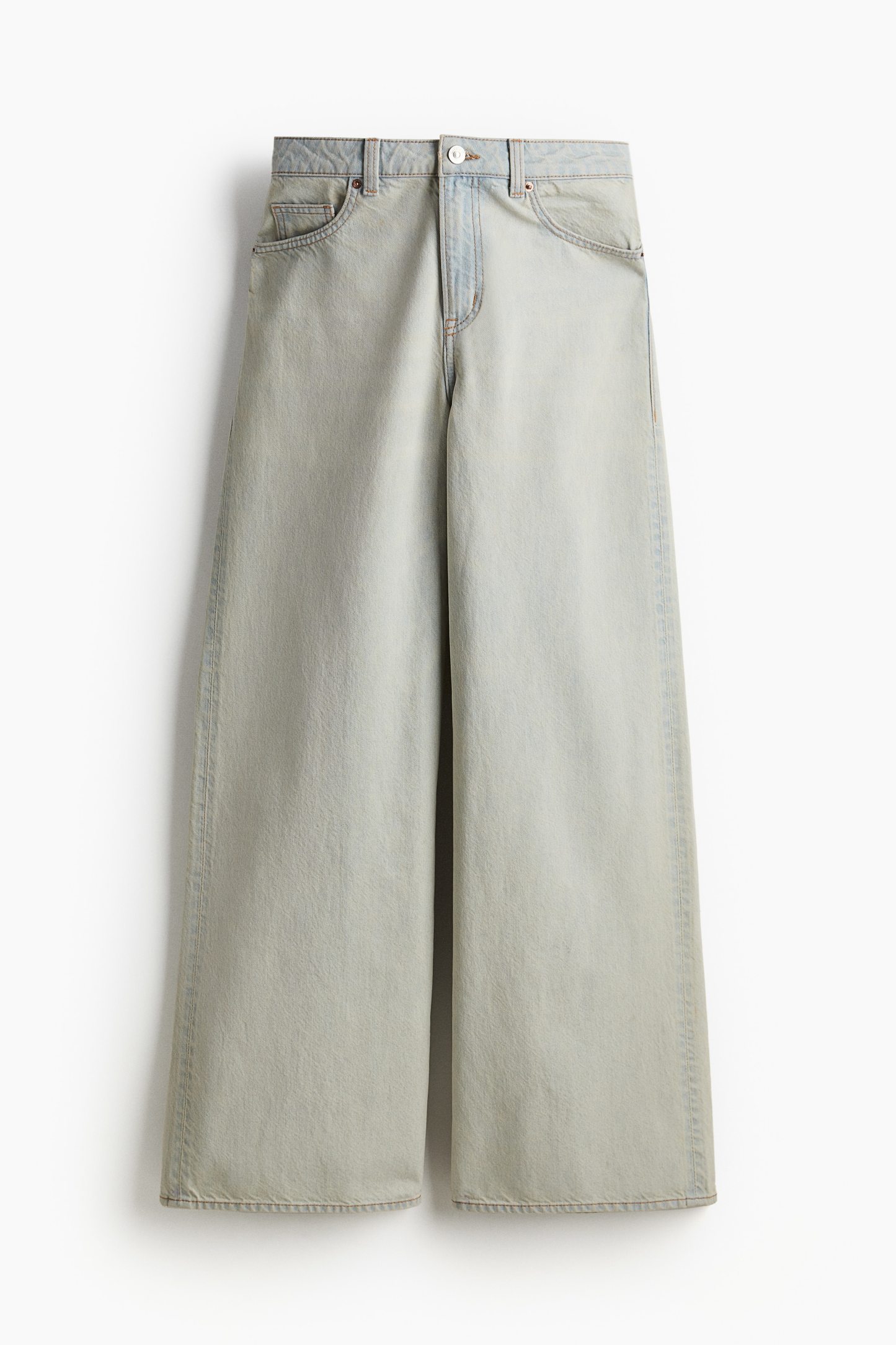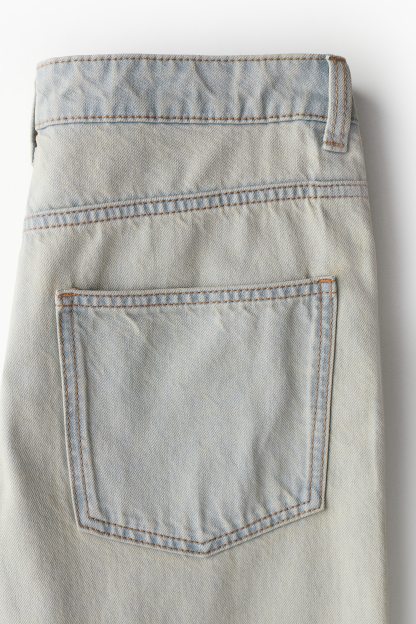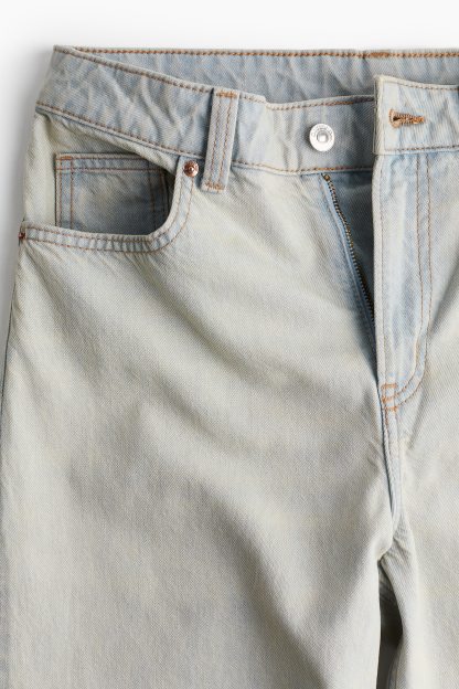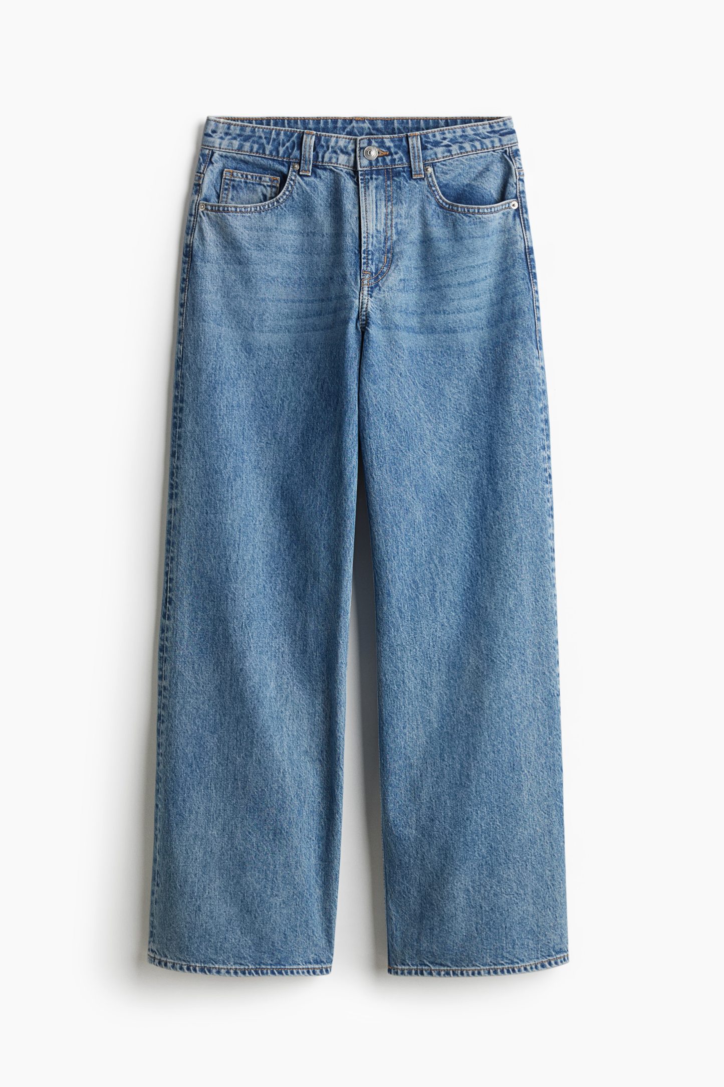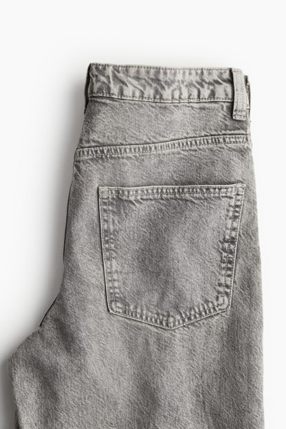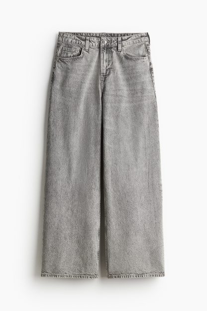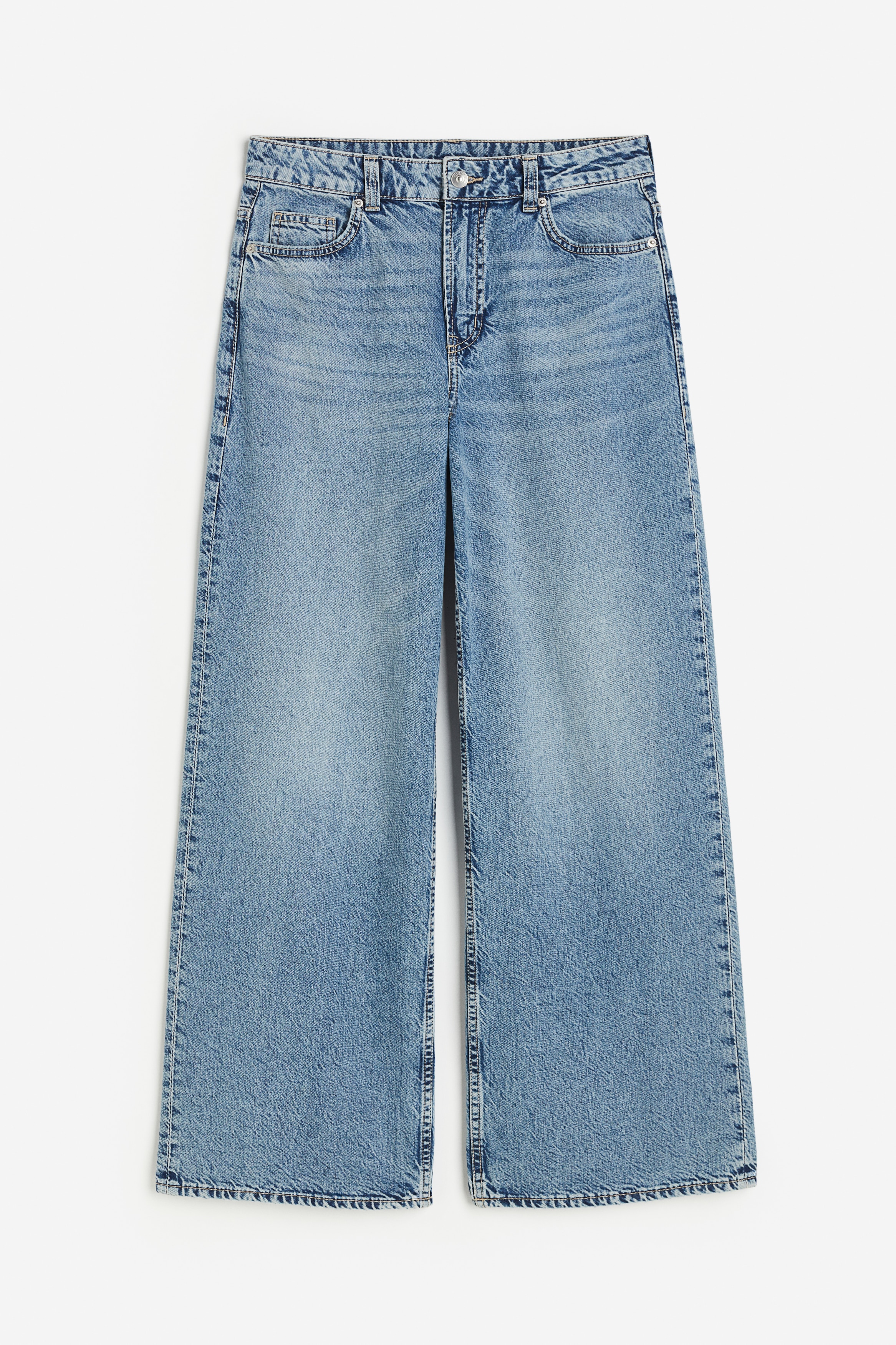 5-pocket jeans in rigid cotton denim that feels firm at first but then softens and loosens with wear. Wide leg with a loose fit from the waist to the hip and a relaxed fit from the thigh to the hem. Regular waist with a zip fly and div. Longer length, designed to fall over the foot with a stacking effect. A relaxed and cool denim statement.