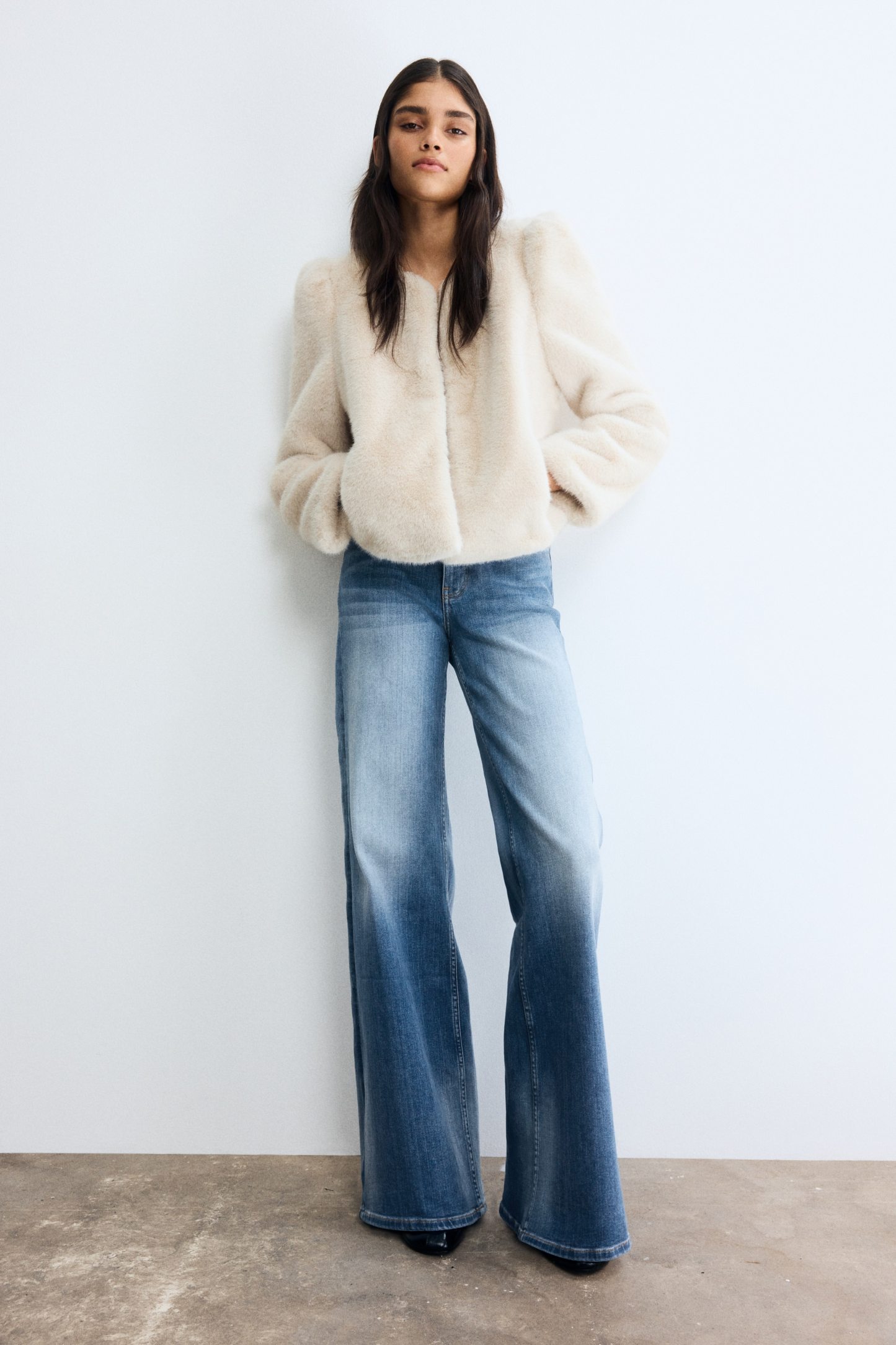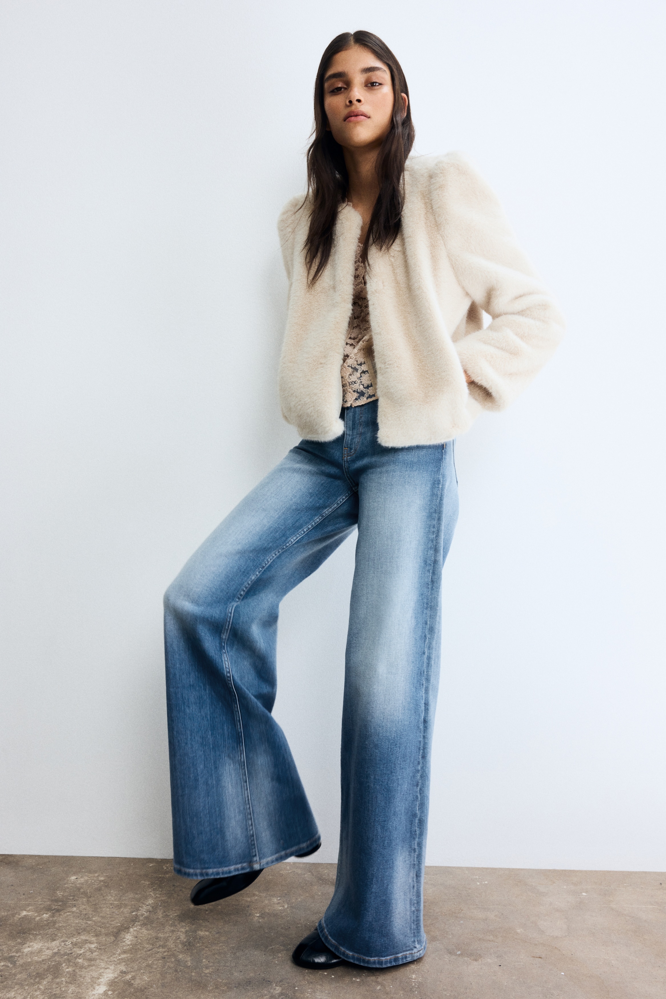 5-pocket jeans in cotton denim with a slight stretch for good comfort. Wide leg with a regular fit from the waist to the hip and a wide cut from the thigh to the hem. High waist with a zip fly and div. Regular length, designed to hit the top of the foot with little or no stacking. Featuring a wide silhouette that's always flattering.