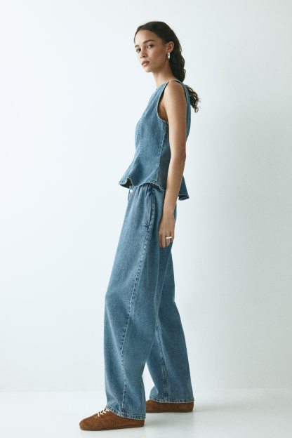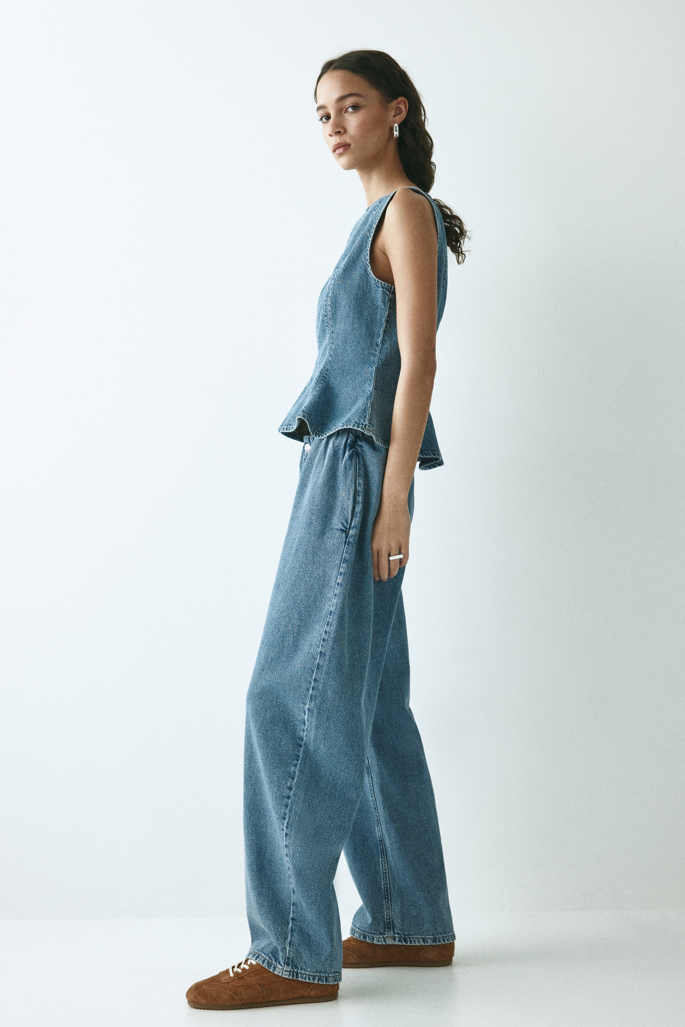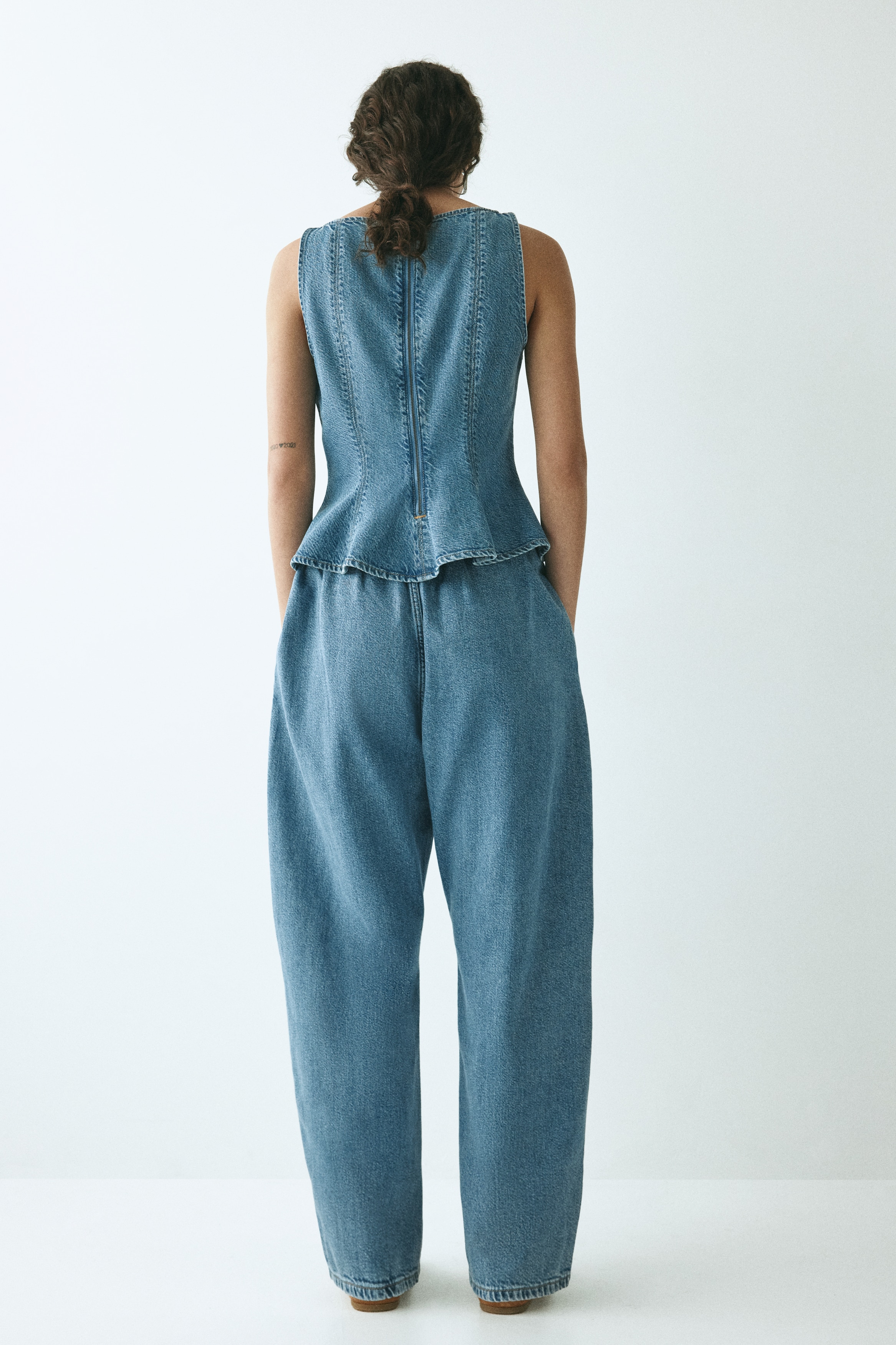 Oversized trousers in rigid cotton denim that feels firm at first but then softens and loosens with wear. Covered elastication at the waist, a zip fly with a div and discreet side pockets. Curved, voluminous leg with a regular fit from the hip to the thigh, that tapers to the hem.