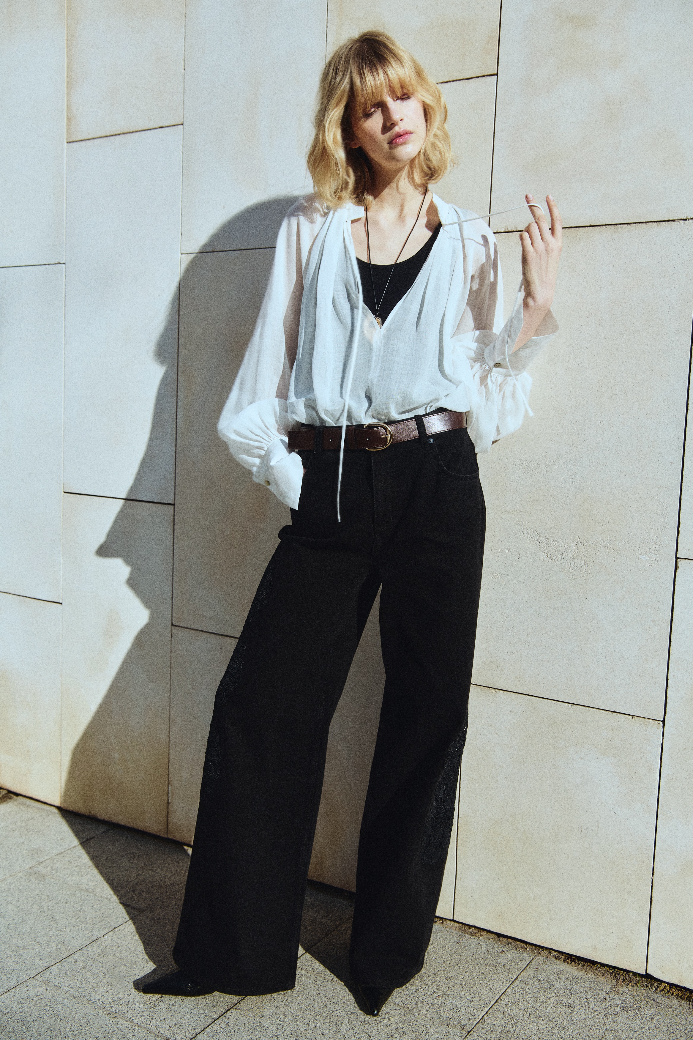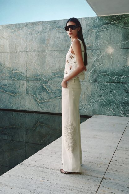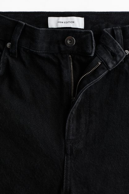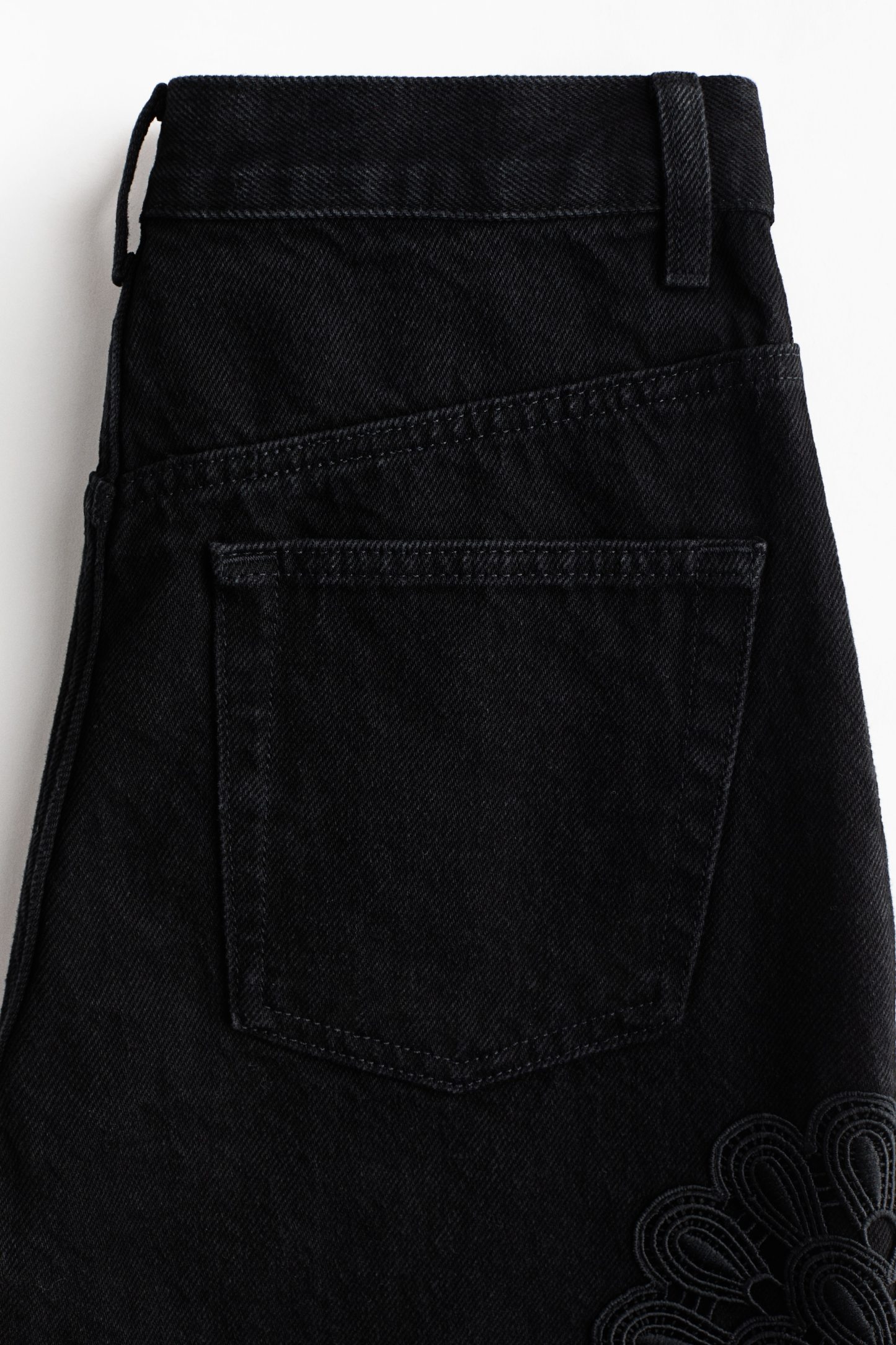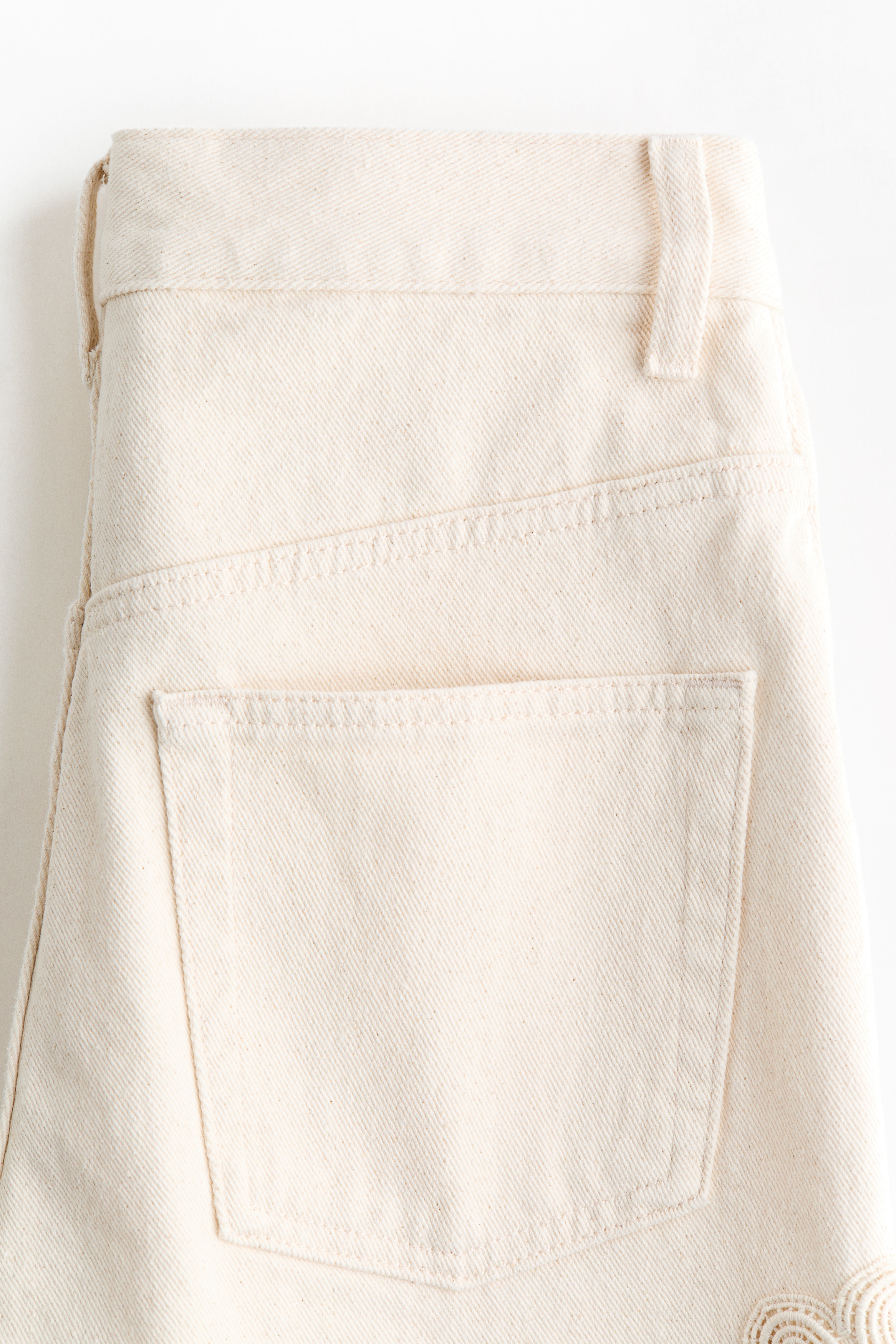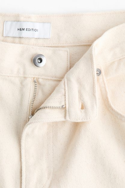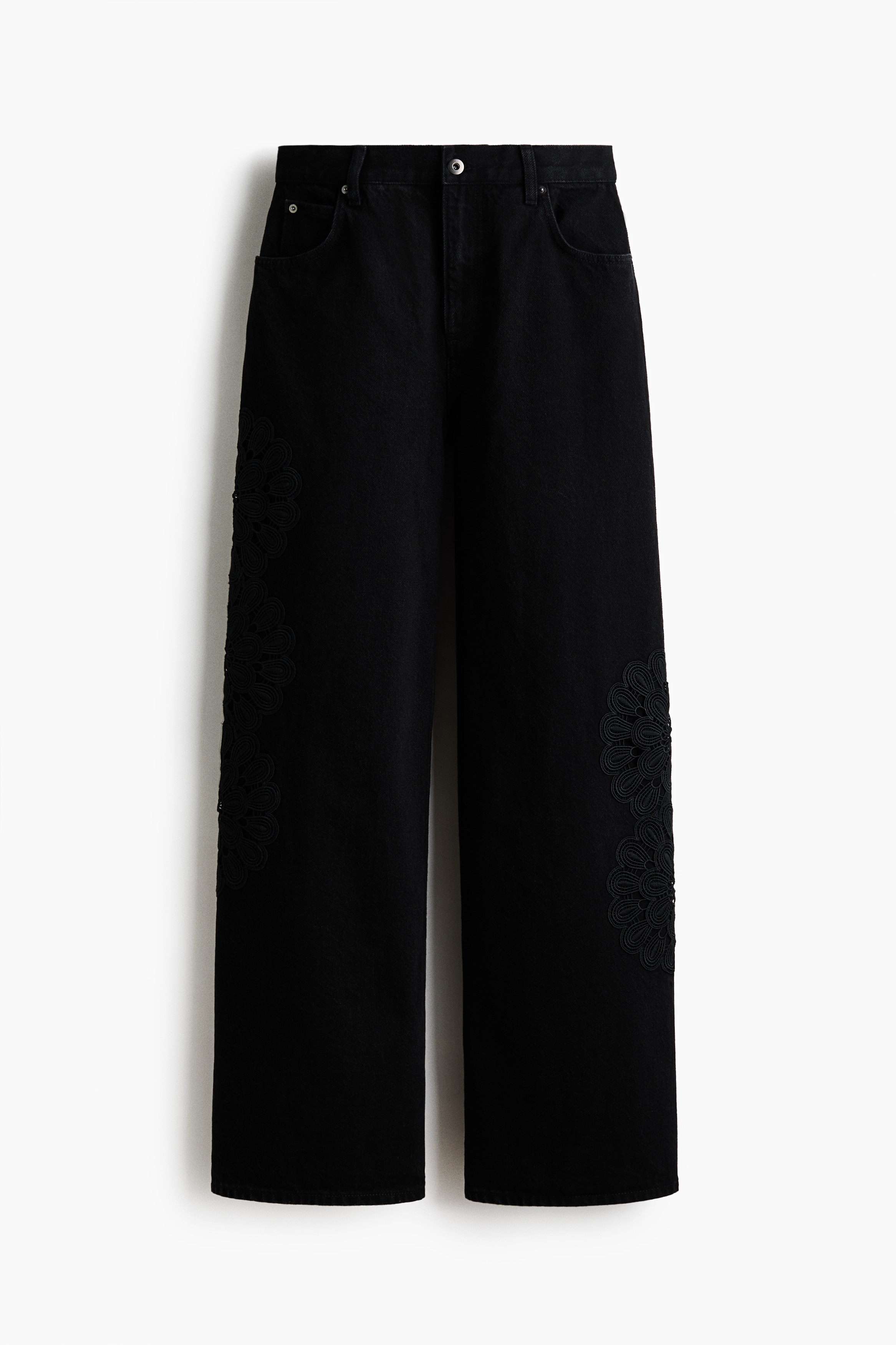 5-pocket jeans in rigid cotton denim that feels firm at first but then softens and loosens with wear, detailed with tone-on-tone crochet-look div at the sides. Wide leg with a regular fit from the waist to the hip and a wide cut from the thigh to the hem. High waist with a zip fly and div. Longer length, designed to fall over the foot with a stacking effect.
