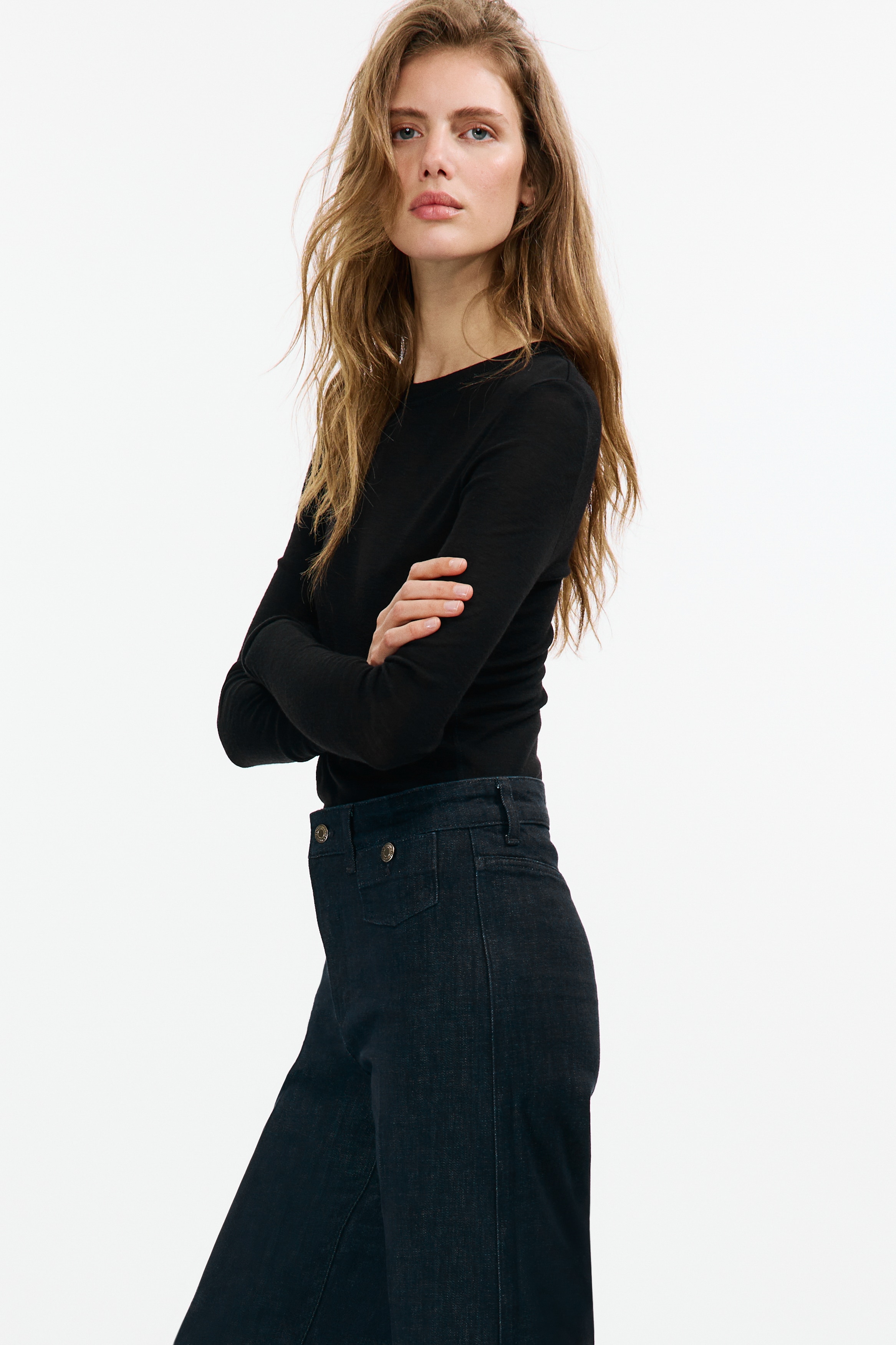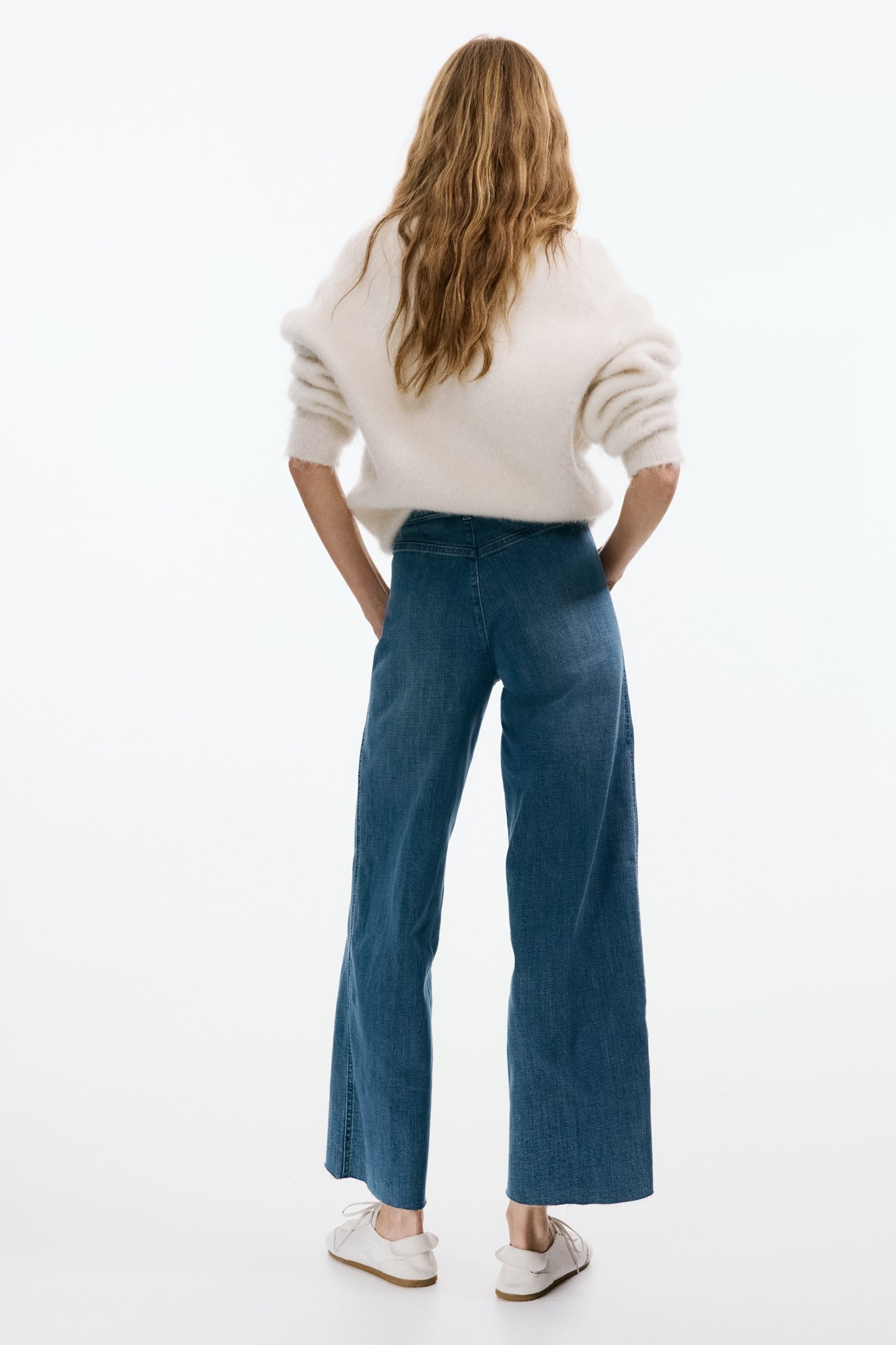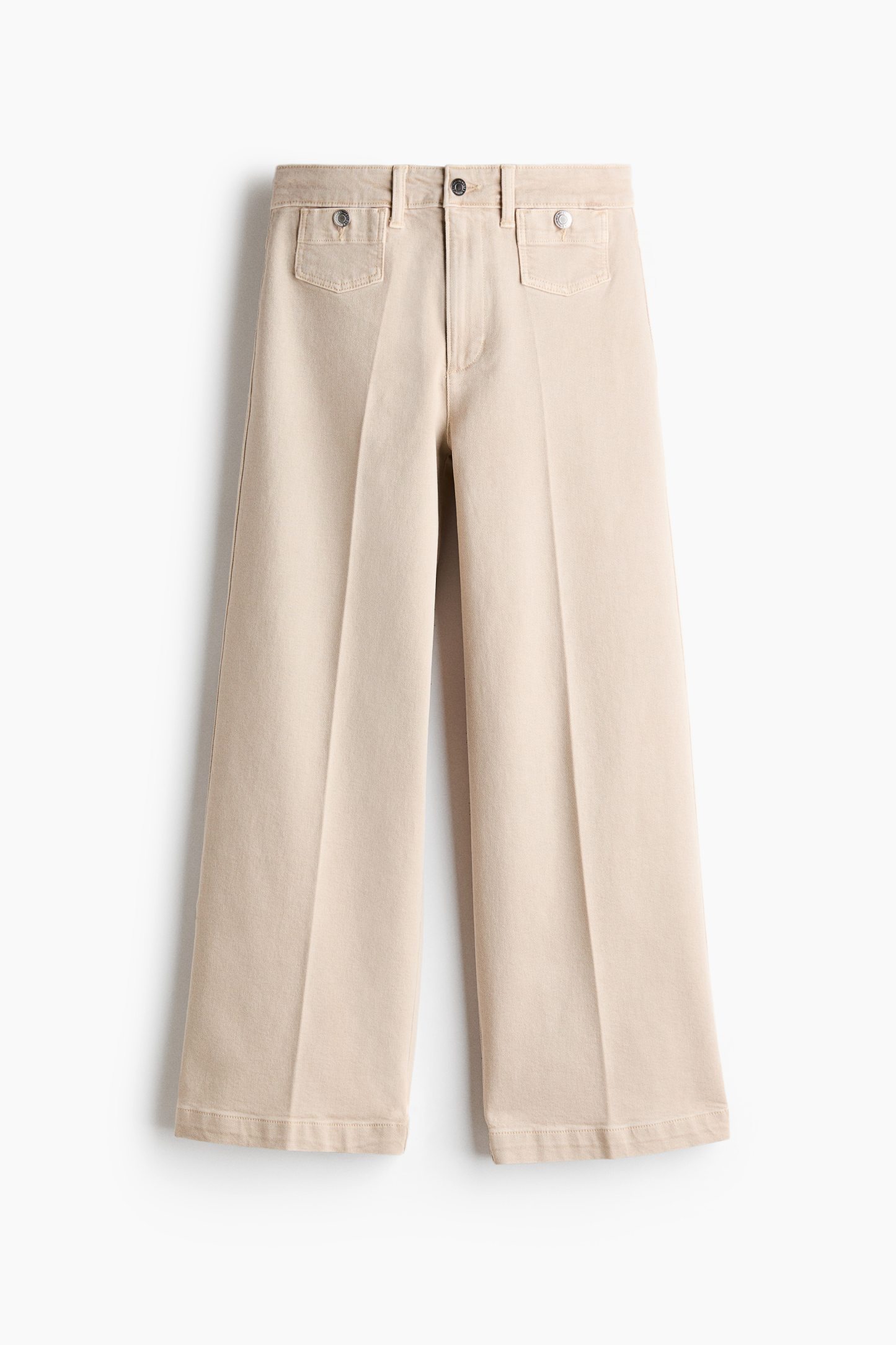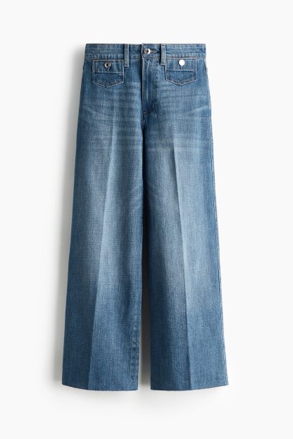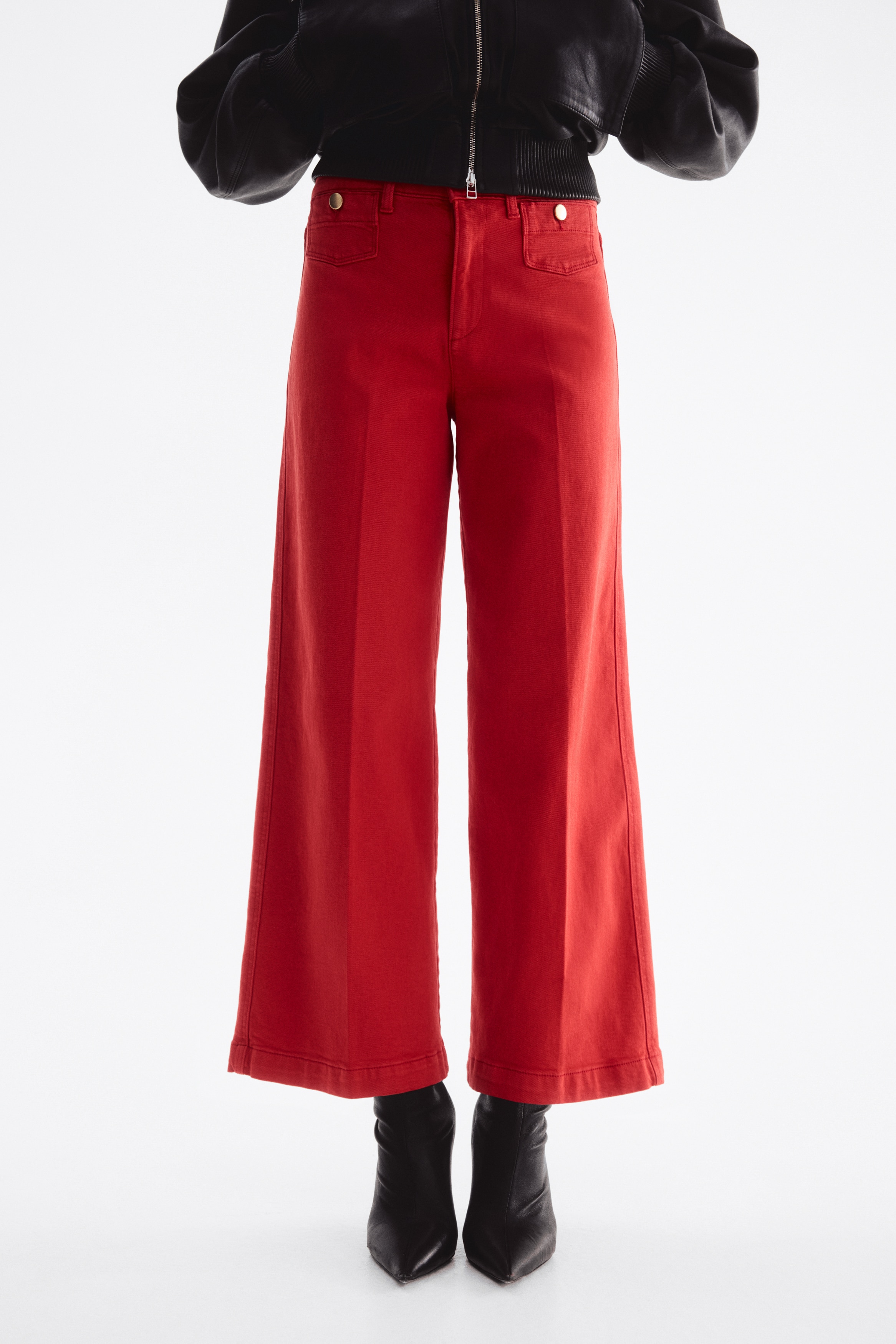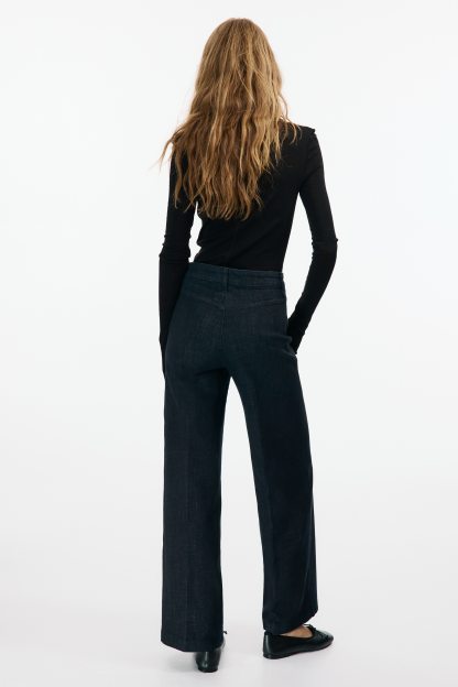 Jeans in cotton denim with a slight stretch for good comfort. Wide leg with a slim fit from the waist to the hip and a wide cut from the thigh to the hem. High waist with a zip fly and div. Patch front pockets with a div, and creases down the front and back. Ankle length, designed to hit at the ankle bone.
