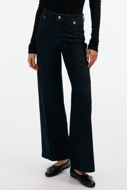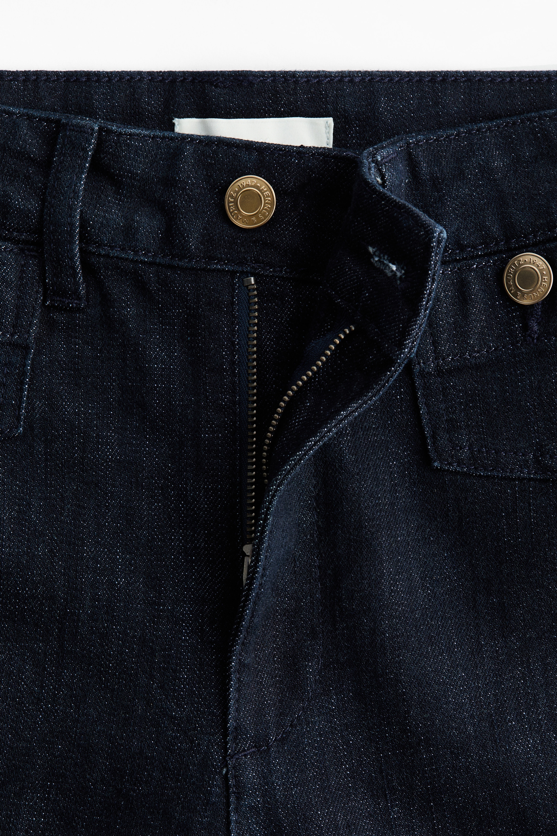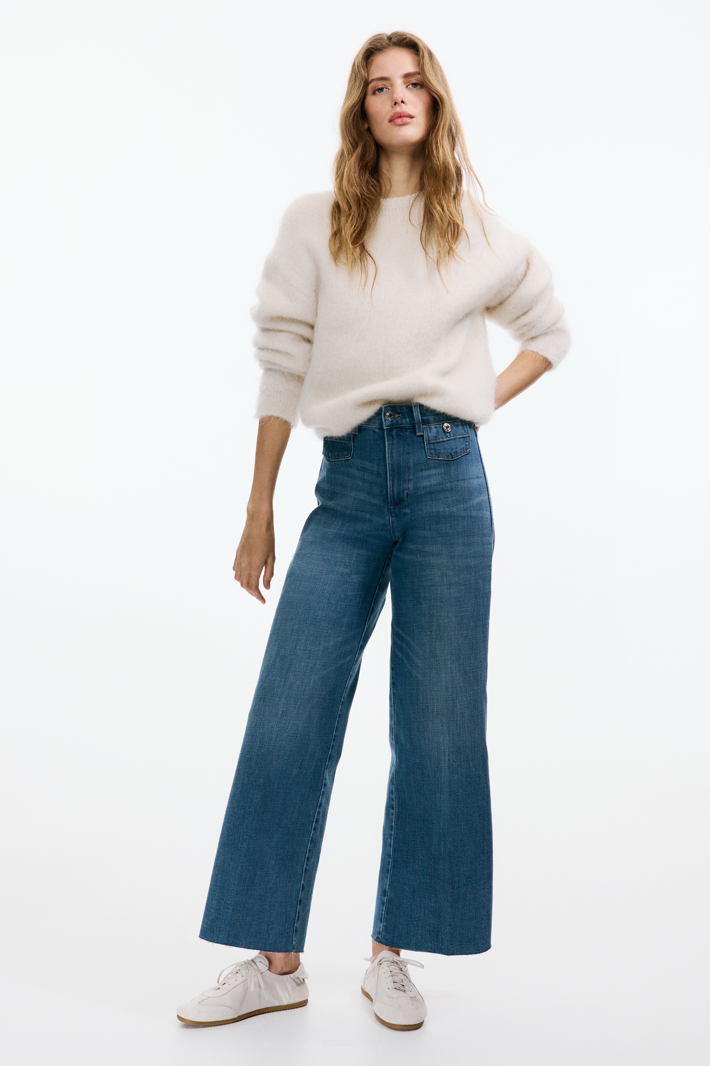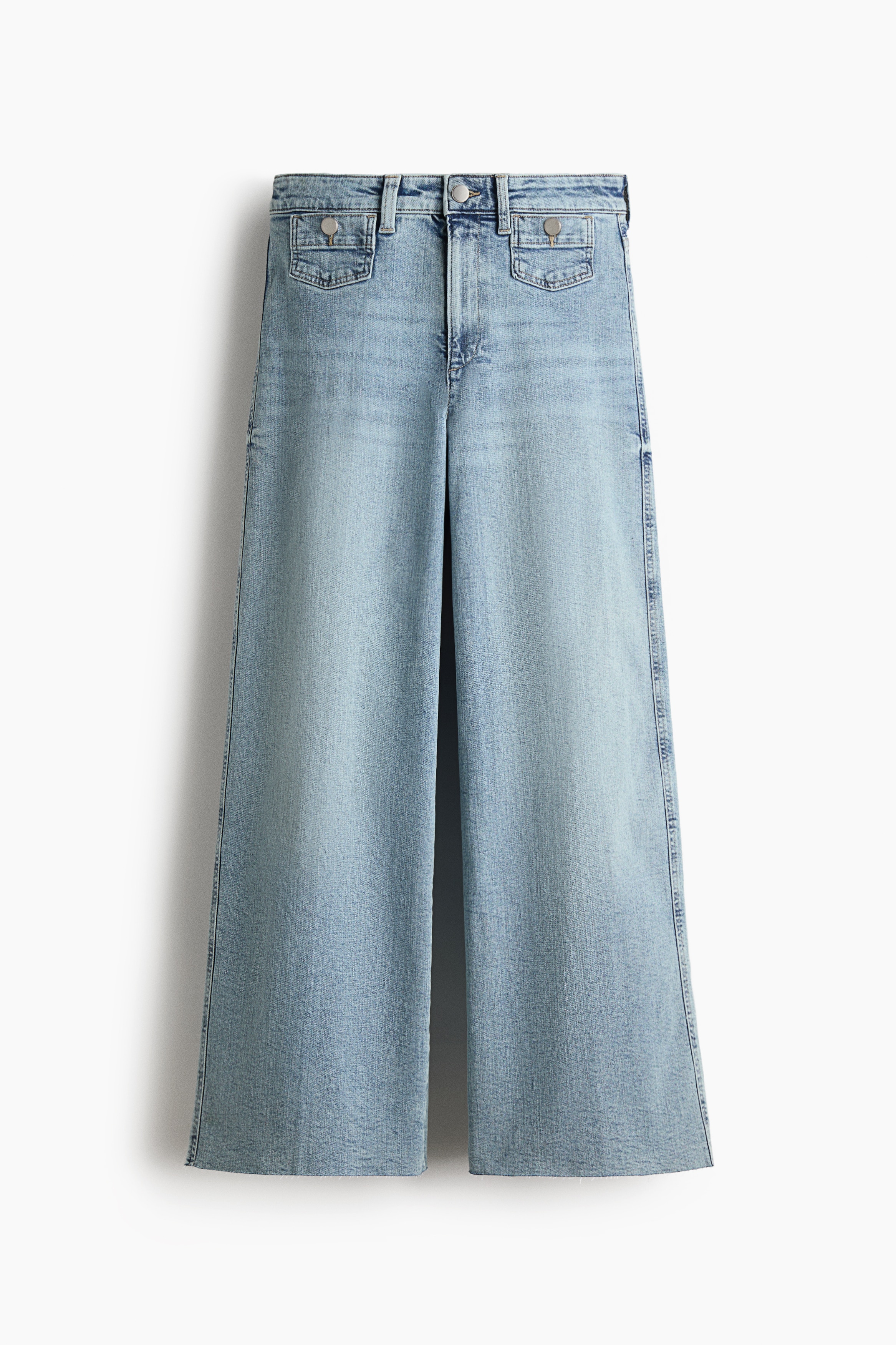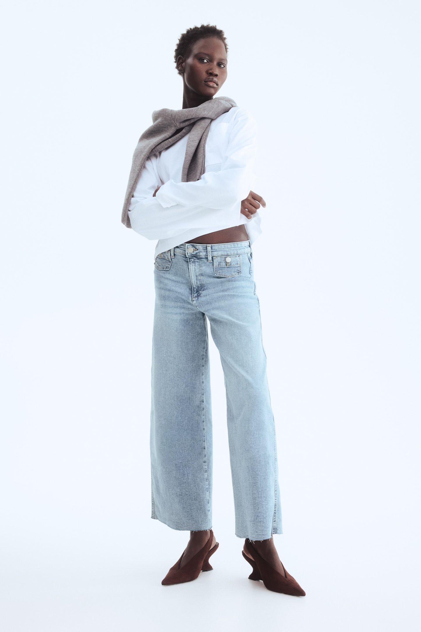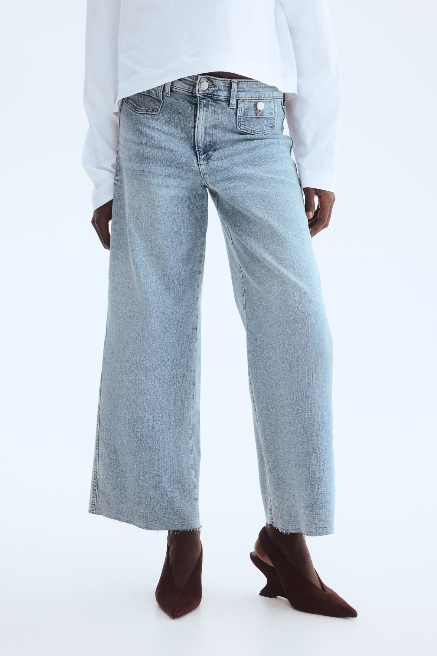 Jeans in cotton denim with a slight stretch for good comfort. Wide leg with a slim fit from the waist to the hip and a wide cut from the thigh to the hem. High waist with a zip fly and div. Patch front pockets with a div, and creases down the front and back. Ankle length, designed to hit at the ankle bone.
