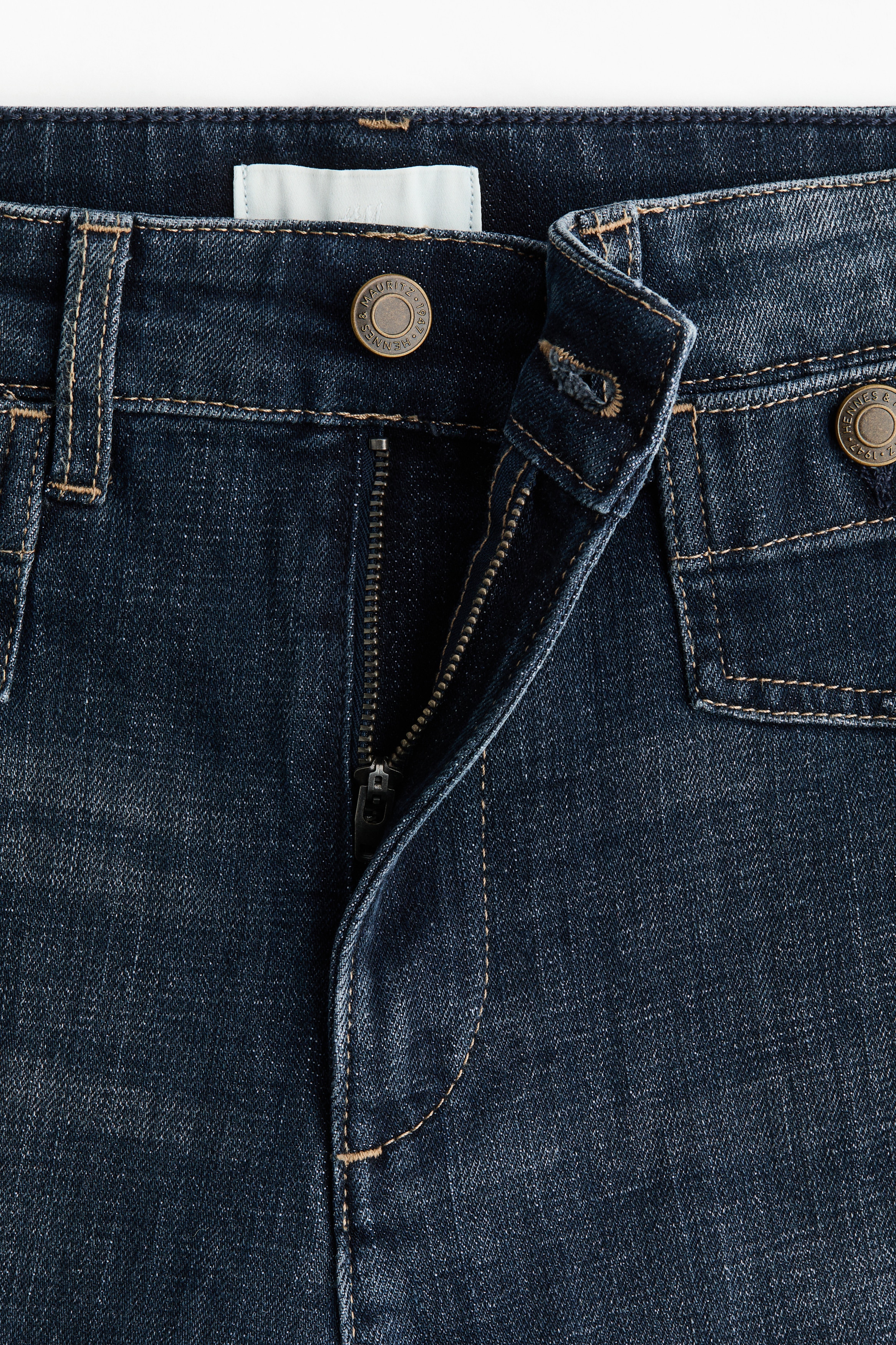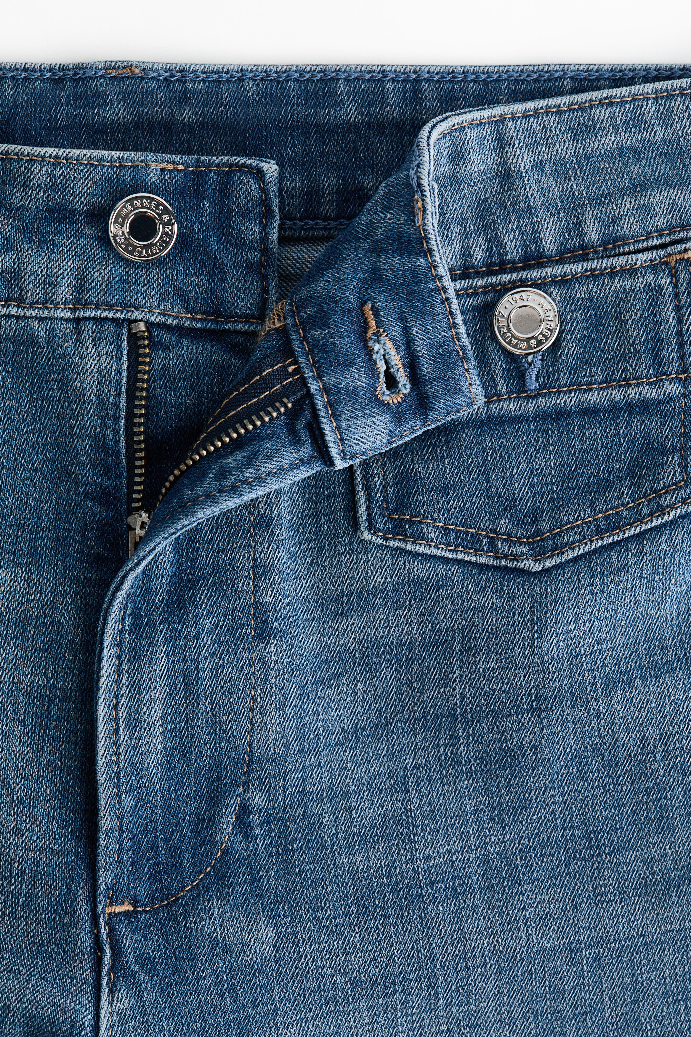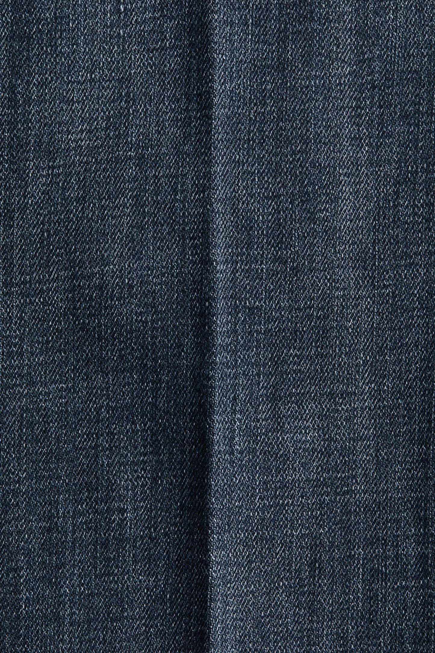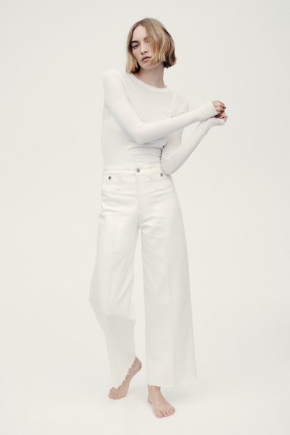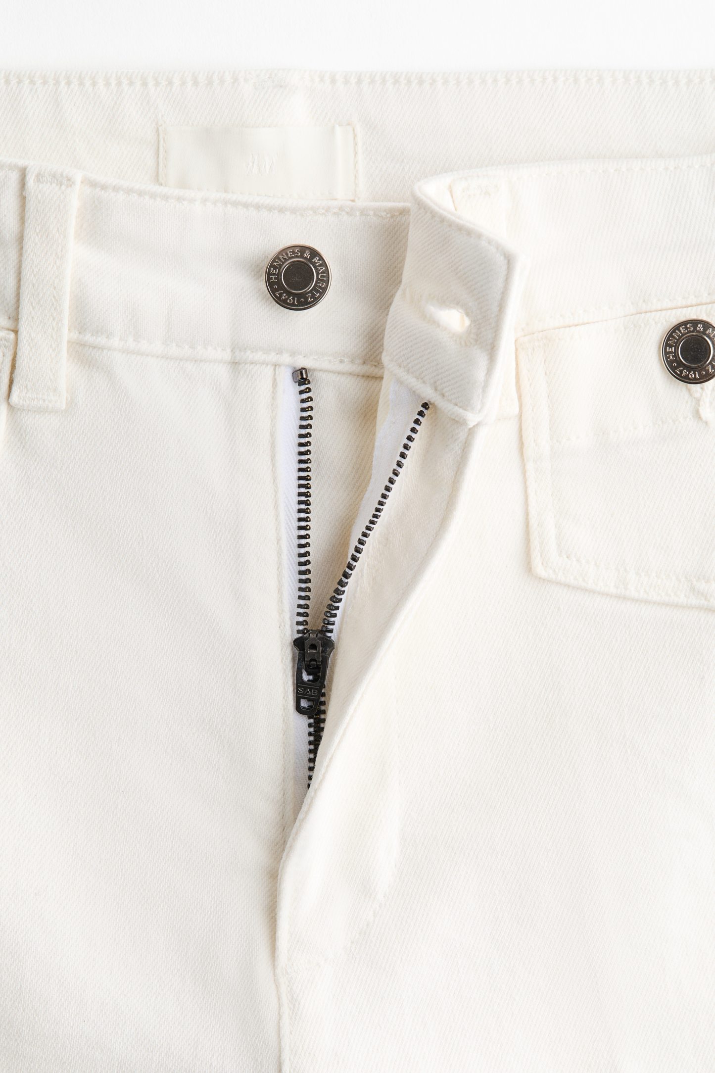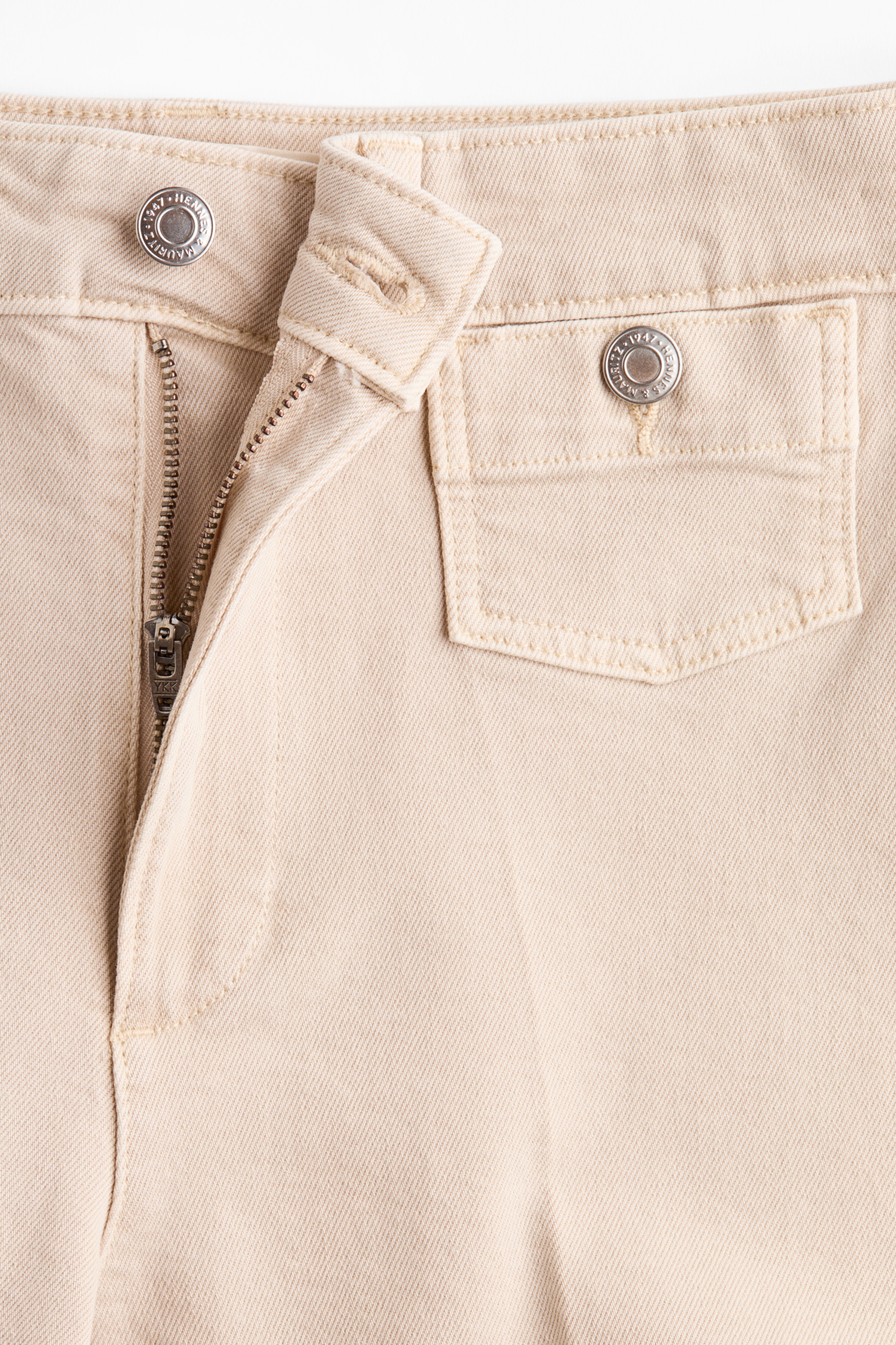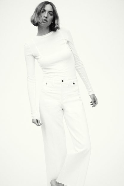 Jeans in cotton denim with a slight stretch for good comfort. Wide leg with a slim fit from the waist to the hip and a wide cut from the thigh to the hem. High waist with a zip fly and div. Patch front pockets with a div, and creases down the front and back. Ankle length, designed to hit at the ankle bone.
