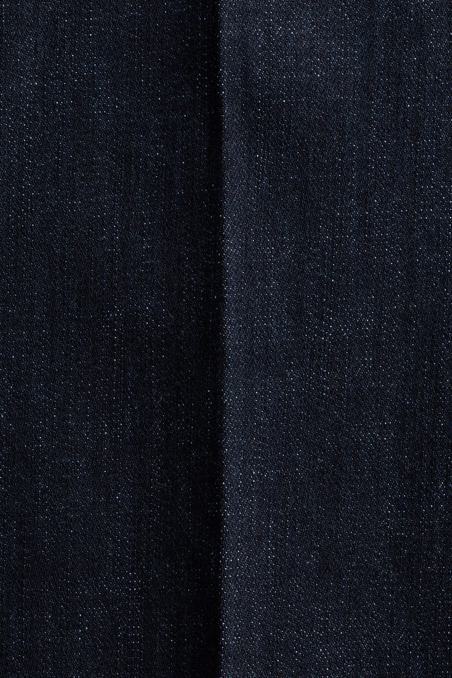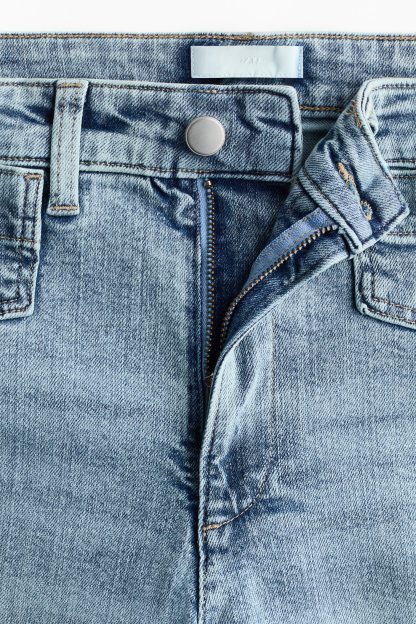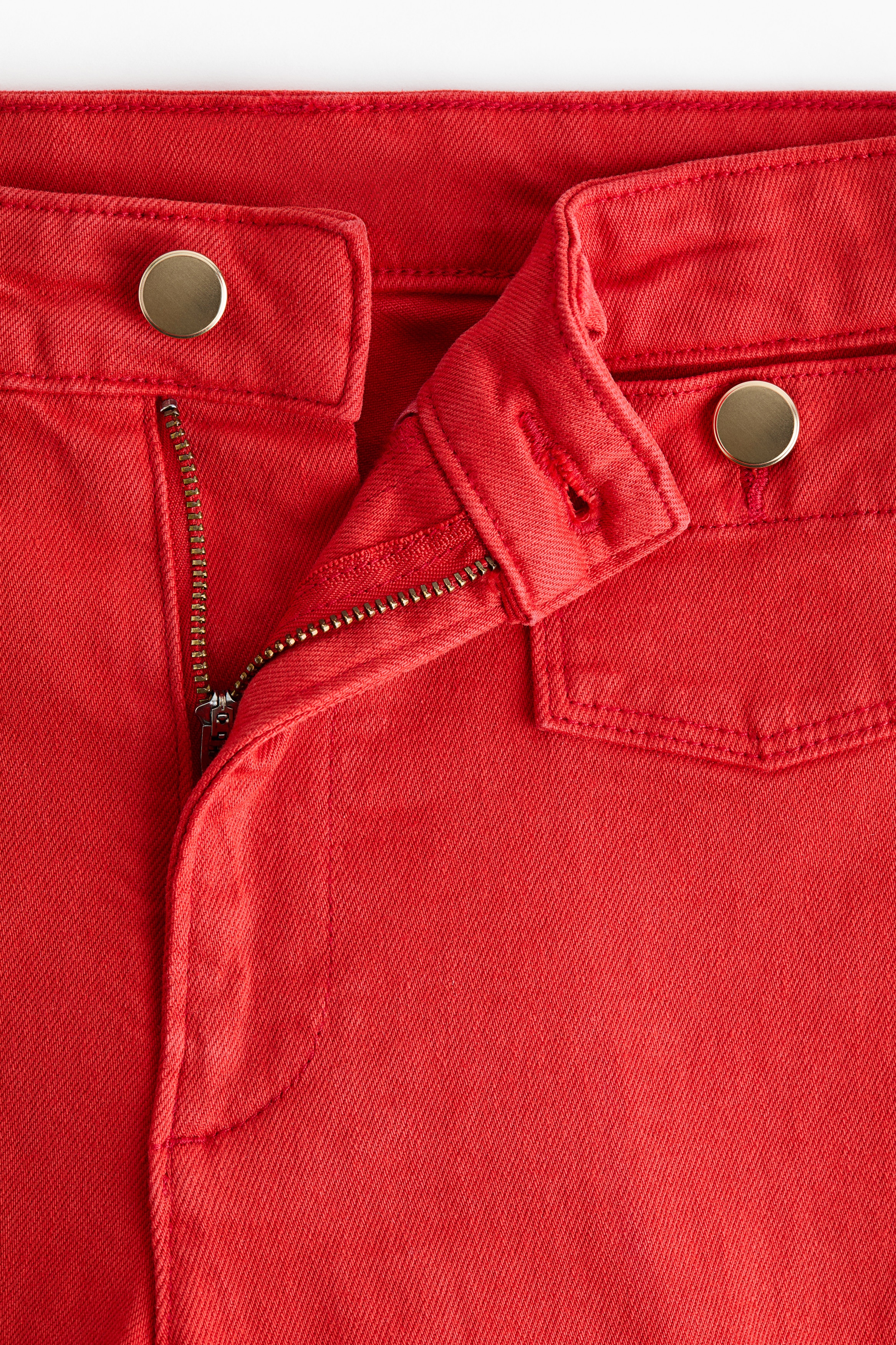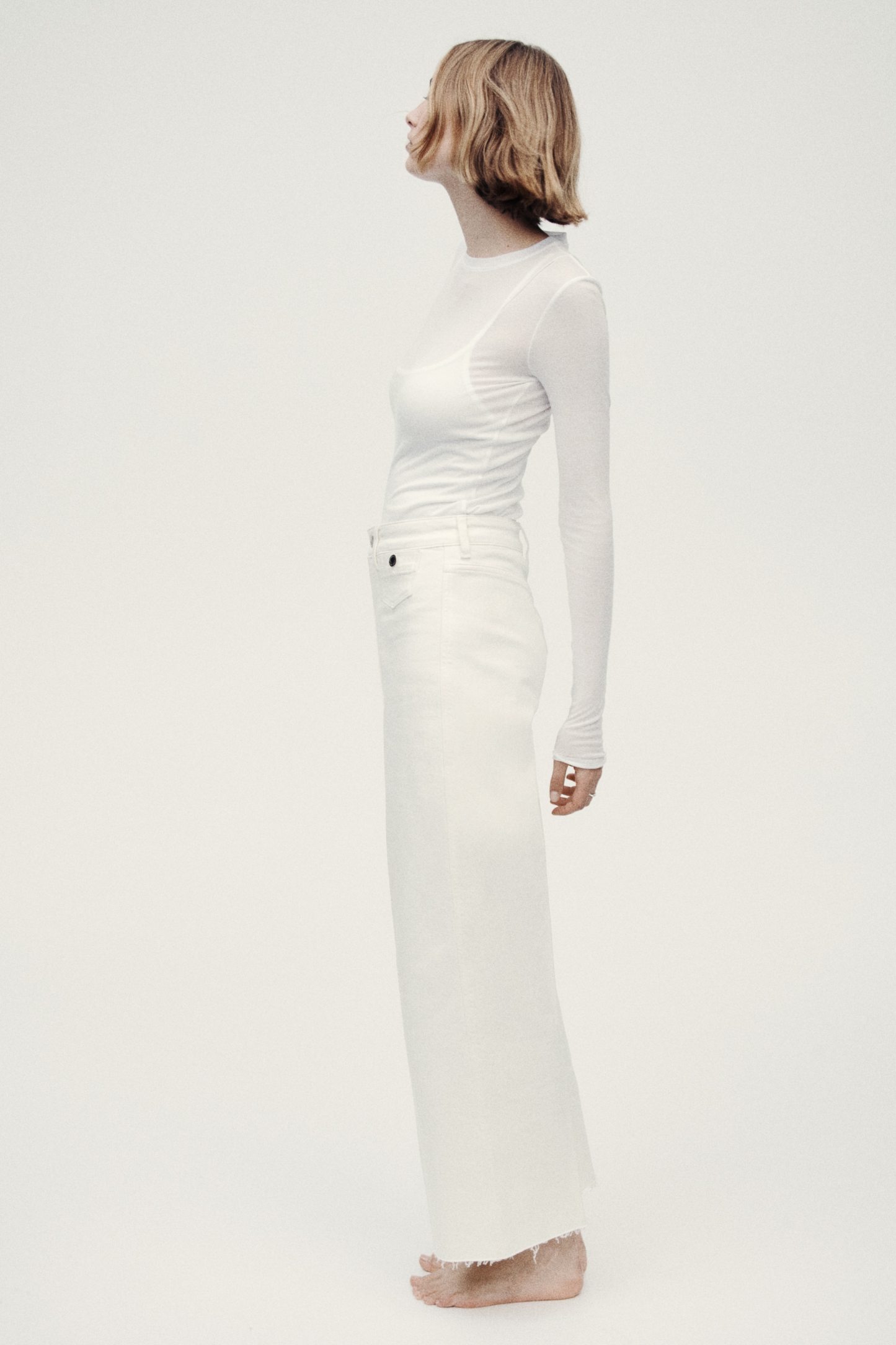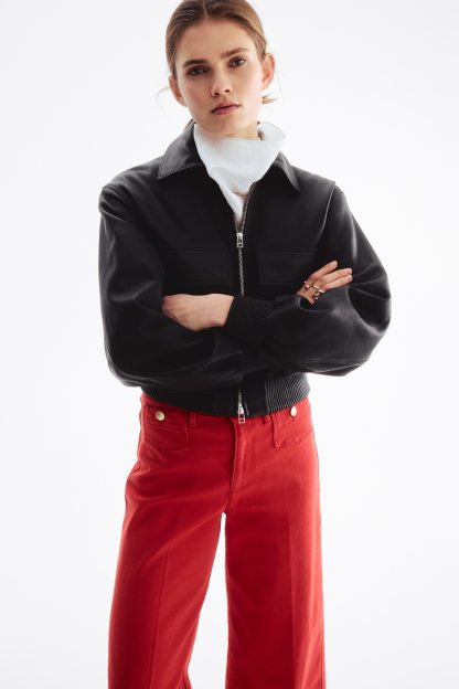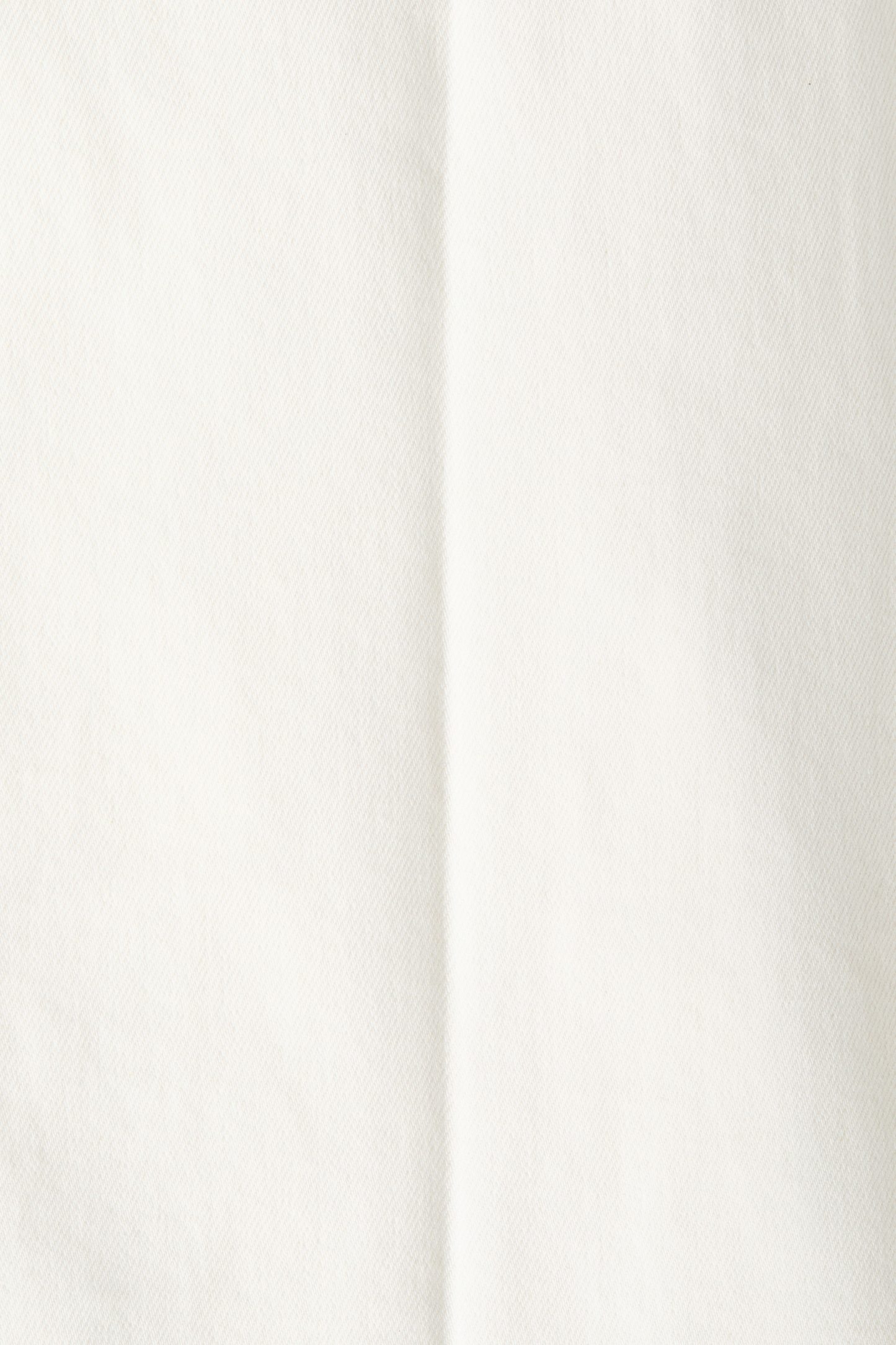 Jeans in cotton denim with a slight stretch for good comfort. Wide leg with a slim fit from the waist to the hip and a wide cut from the thigh to the hem. High waist with a zip fly and div. Patch front pockets with a div, and creases down the front and back. Ankle length, designed to hit at the ankle bone.