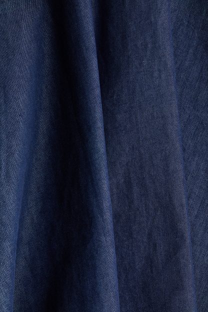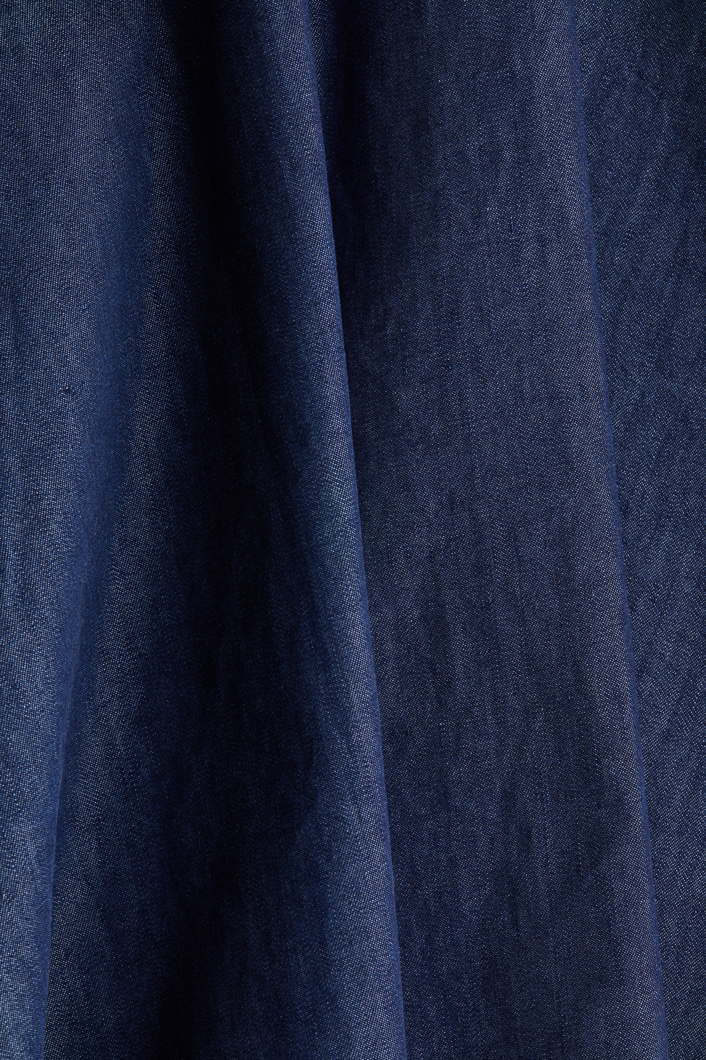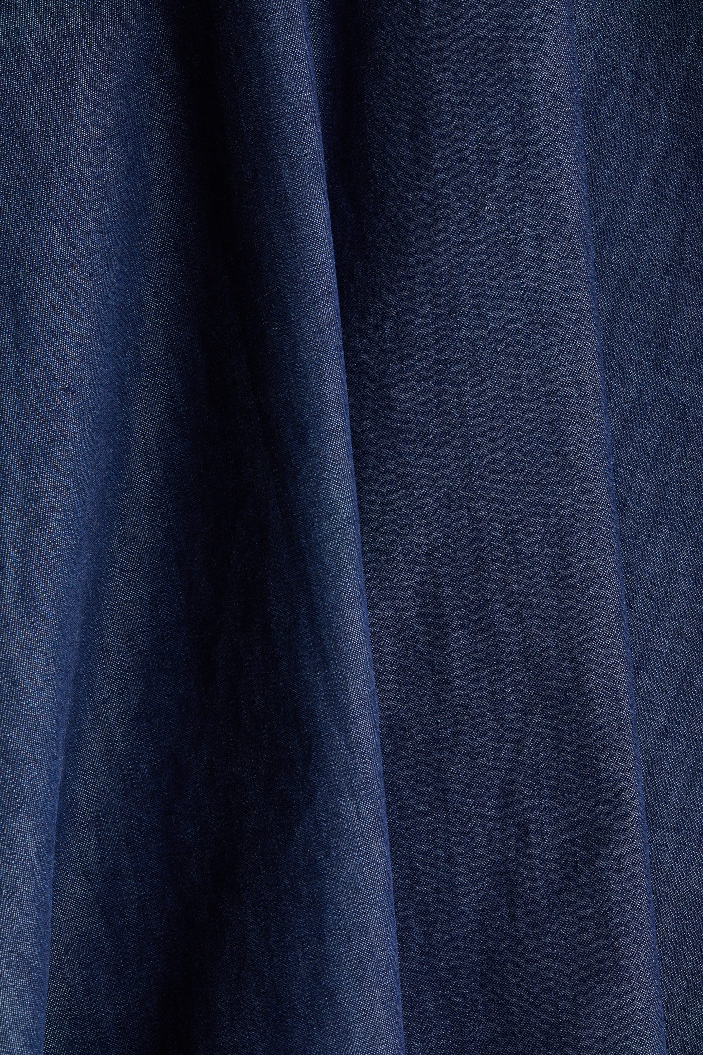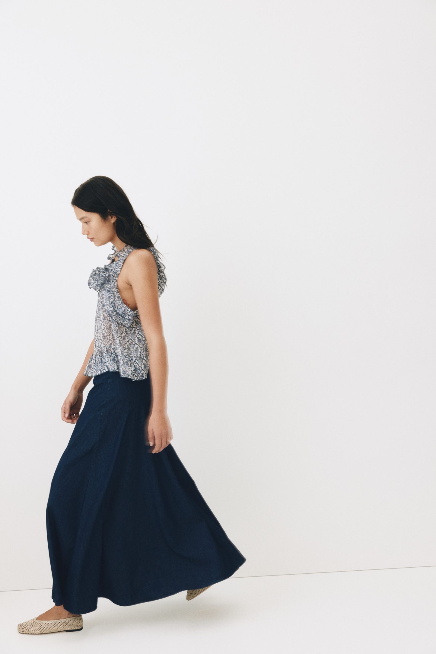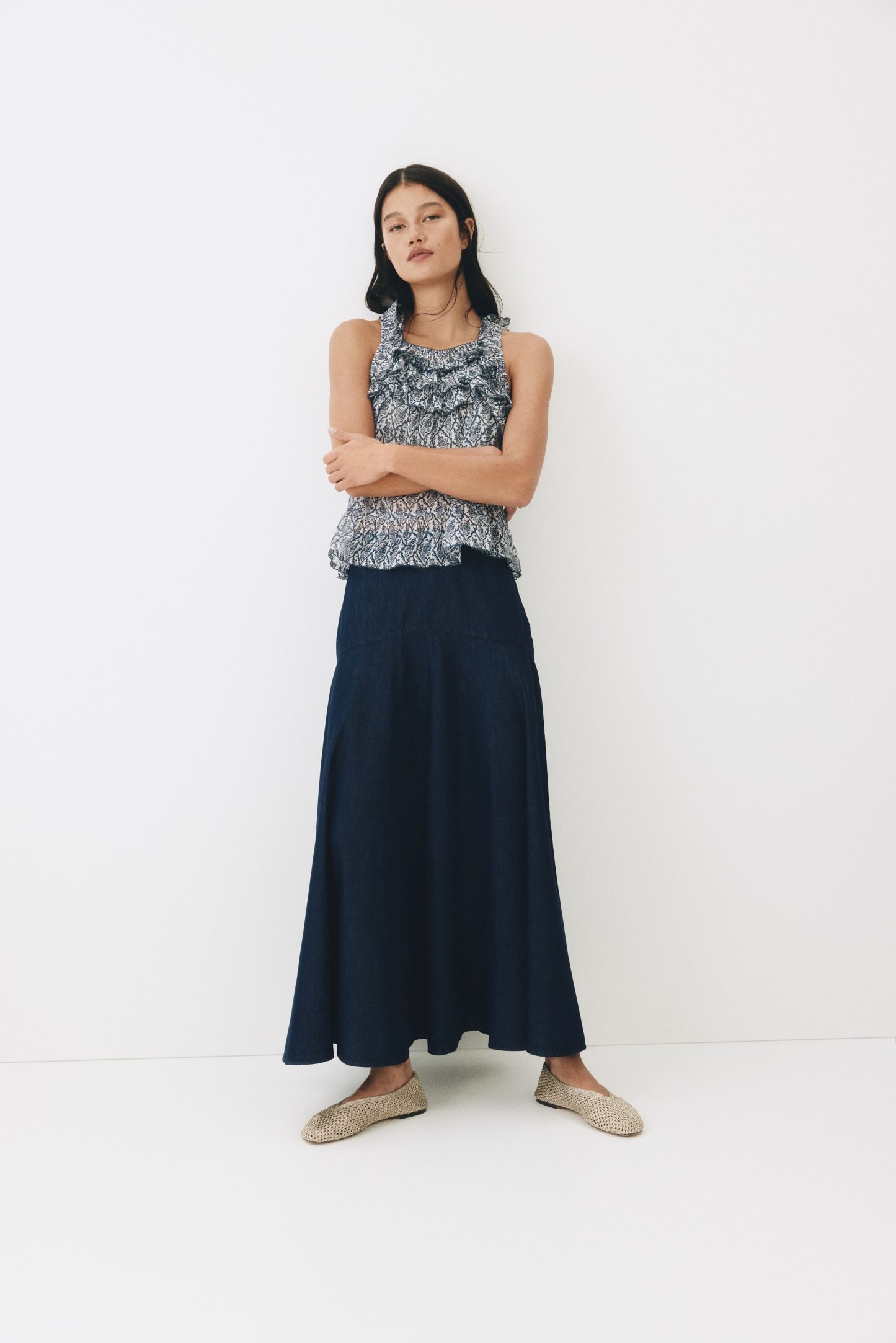 Ankle-length skirt in cotton denim featuring a regular waist and a zip at the back. Curved seam at the hips and a flared skirt.
