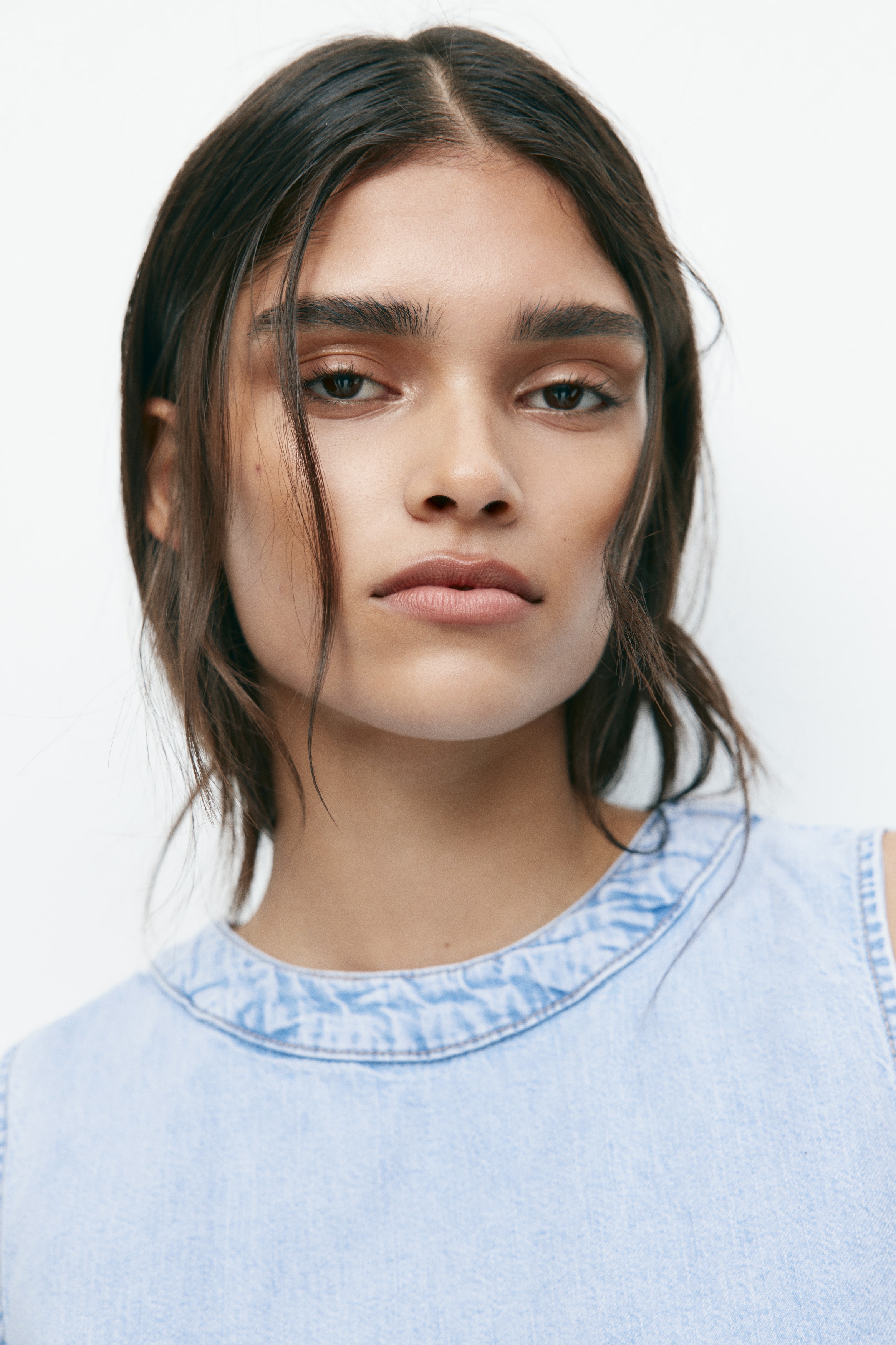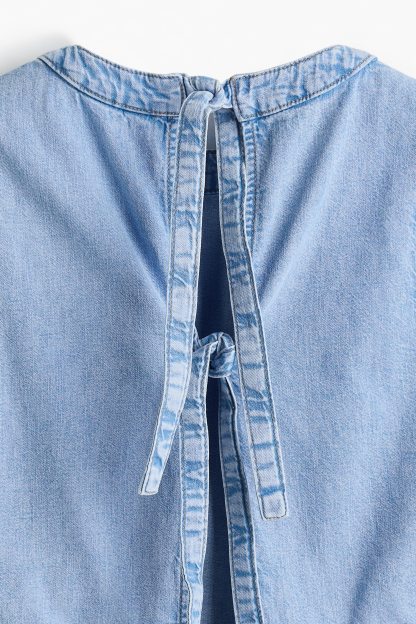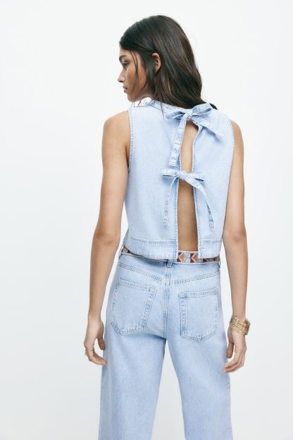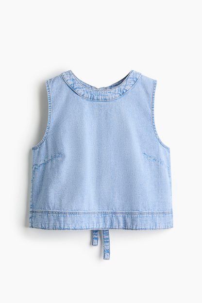 Short, sleeveless top in cotton denim with a round neckline, bust darts and an open back with two sets of ties.