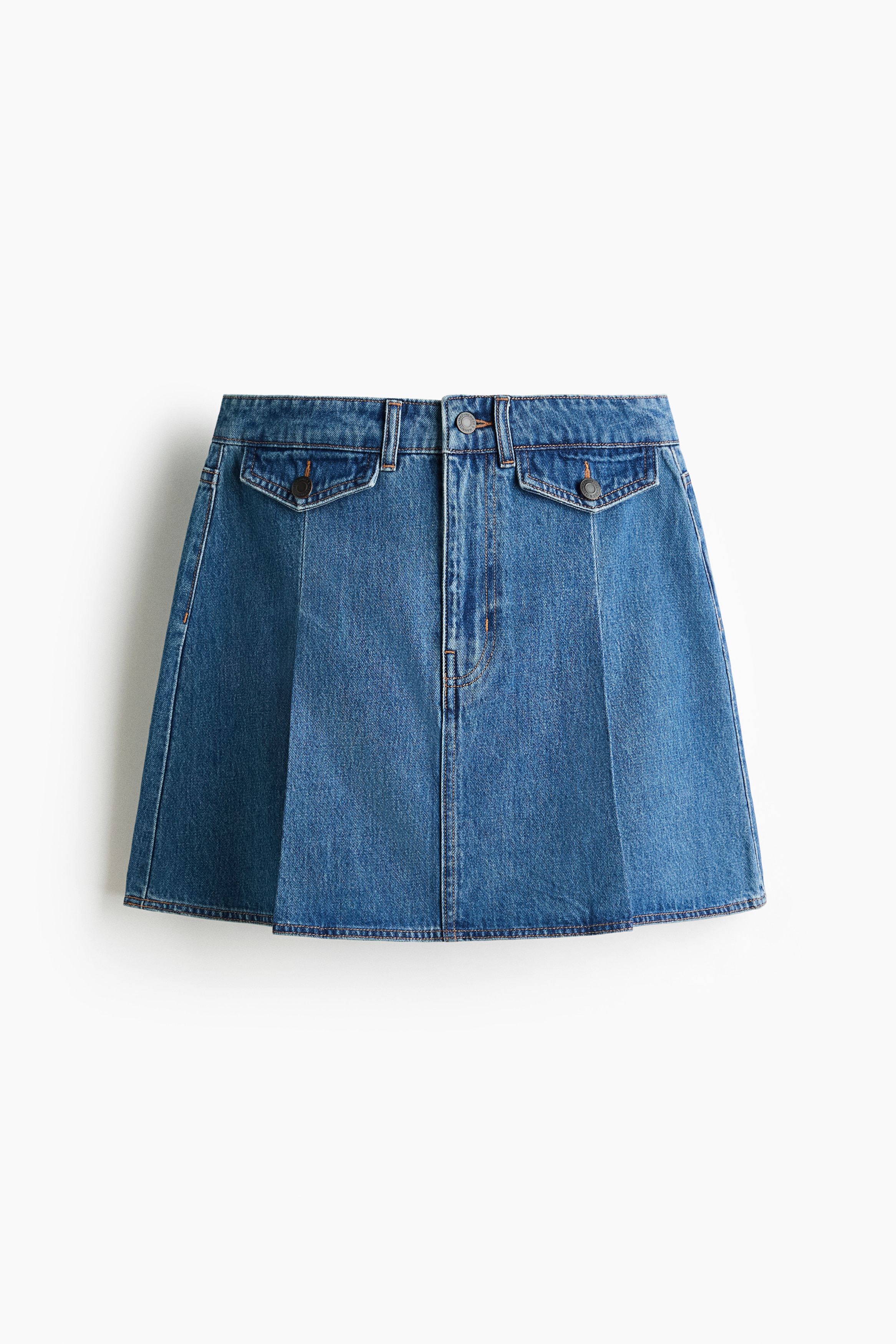 Short, A-line skirt in cotton denim. High waist, fake front pockets with a flap and div, real back pockets and pleats at the front.