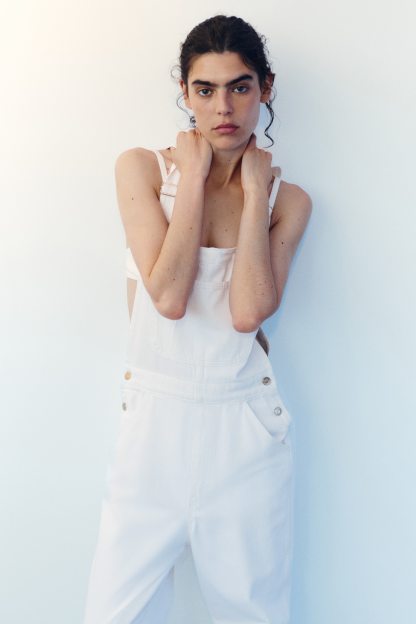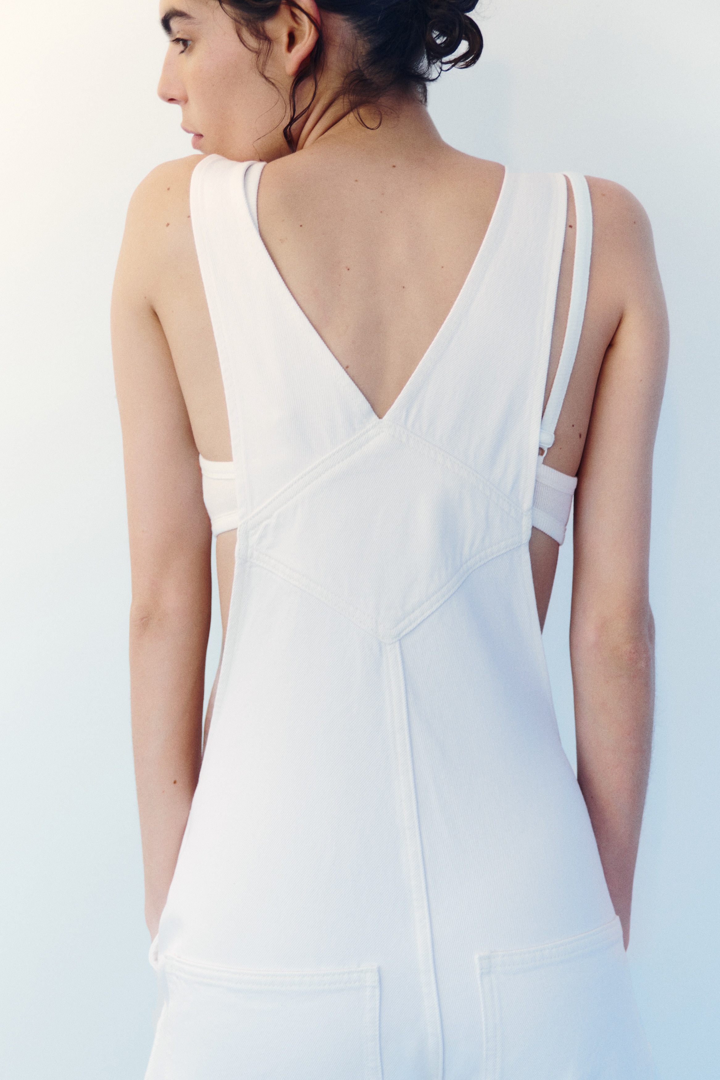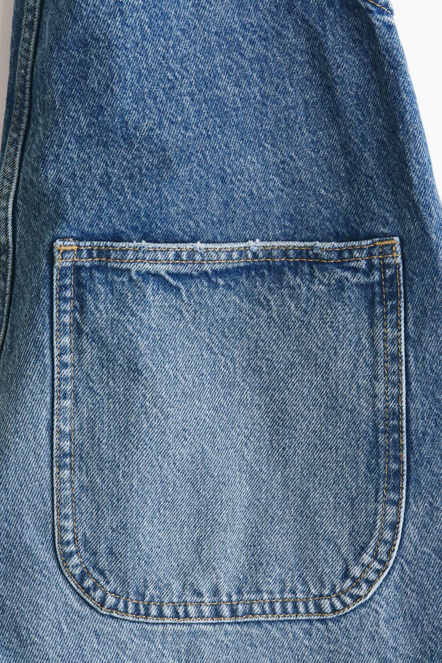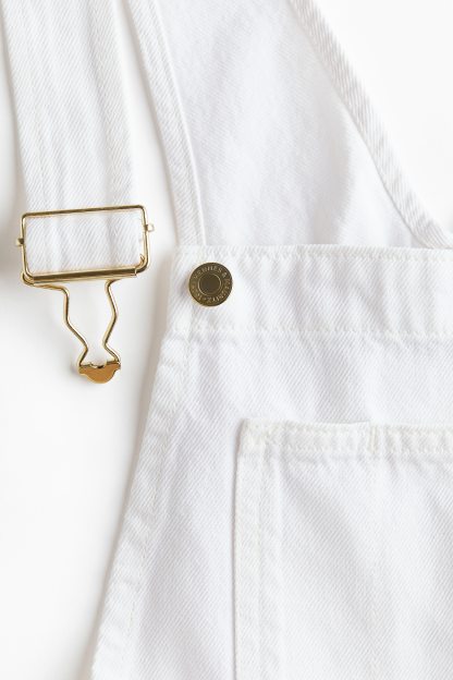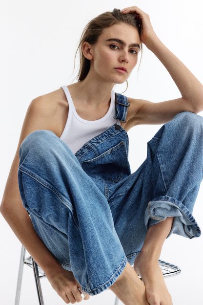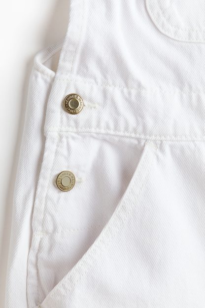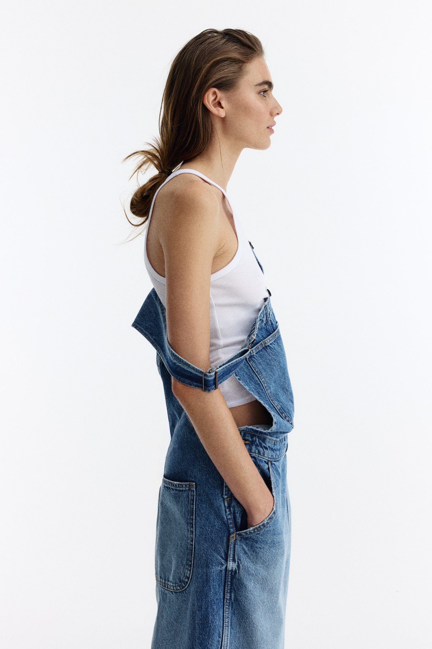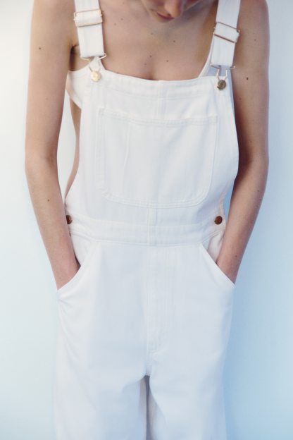 Dungarees in rigid cotton denim with adjustable shoulder straps, a patch chest pocket, diagonal side pockets and open back pockets. Buttons at the sides and straight legs.