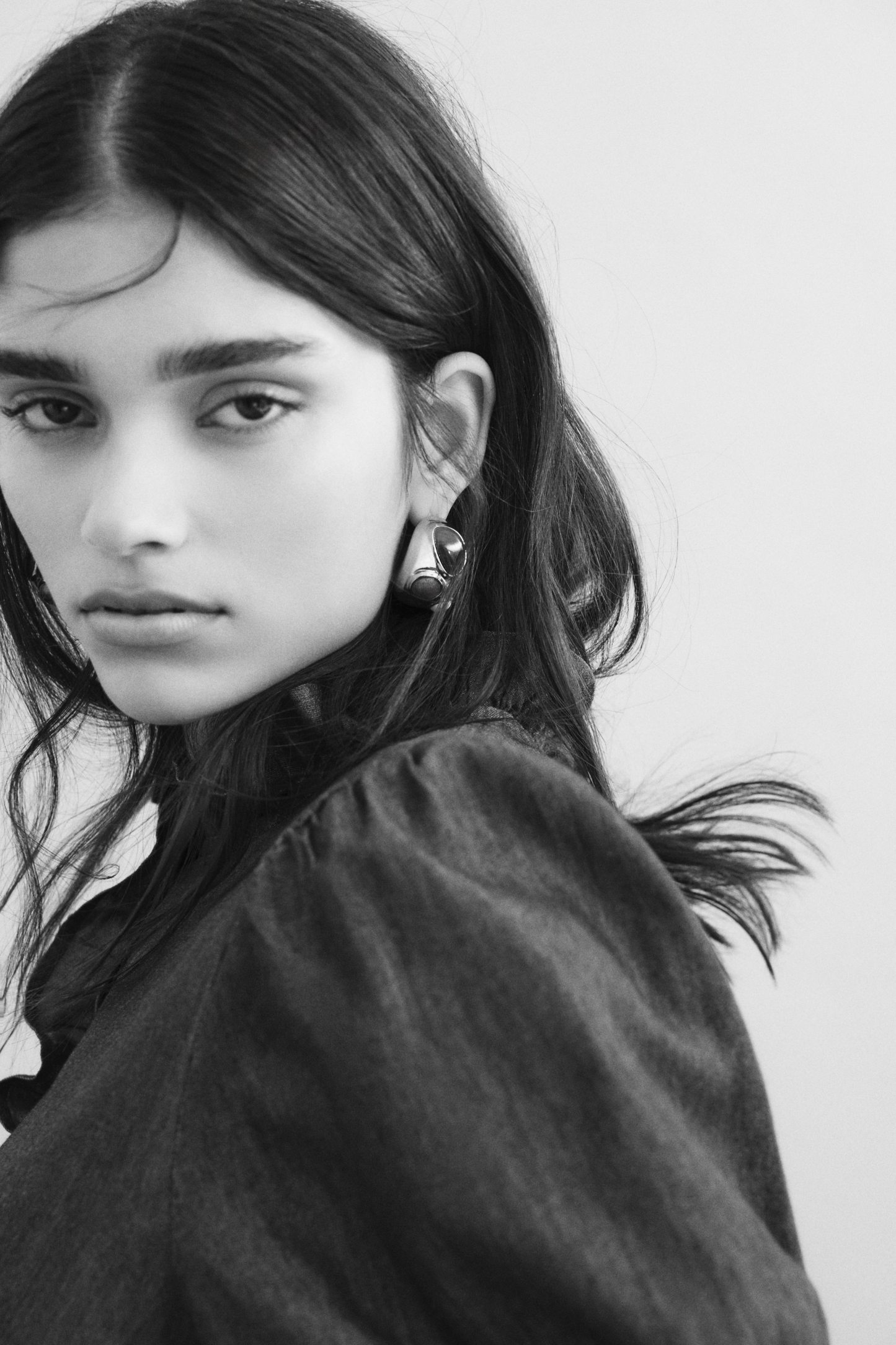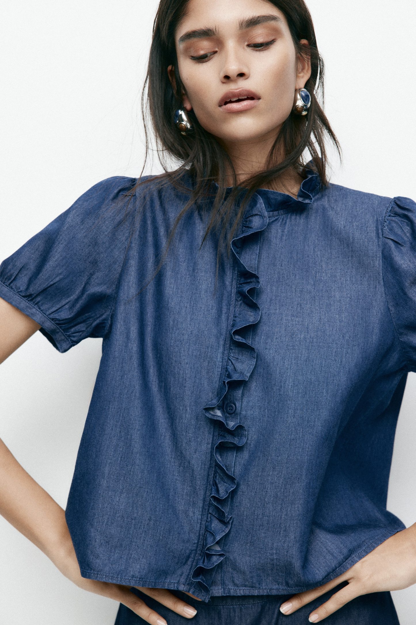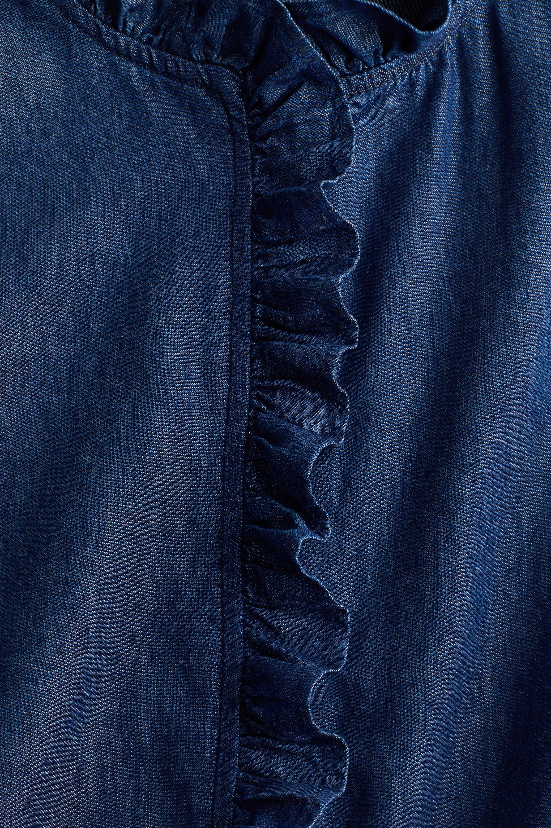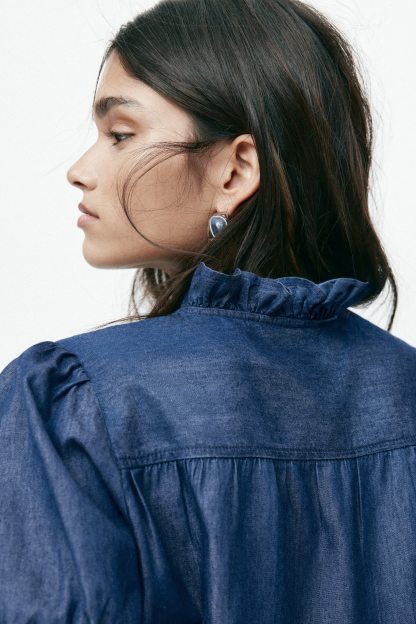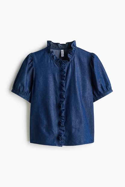 Blouse in lightweight denim with a frill collar and concealed divs down the front with a frill-trimmed div band. Short puff sleeves and a straight-cut hem.