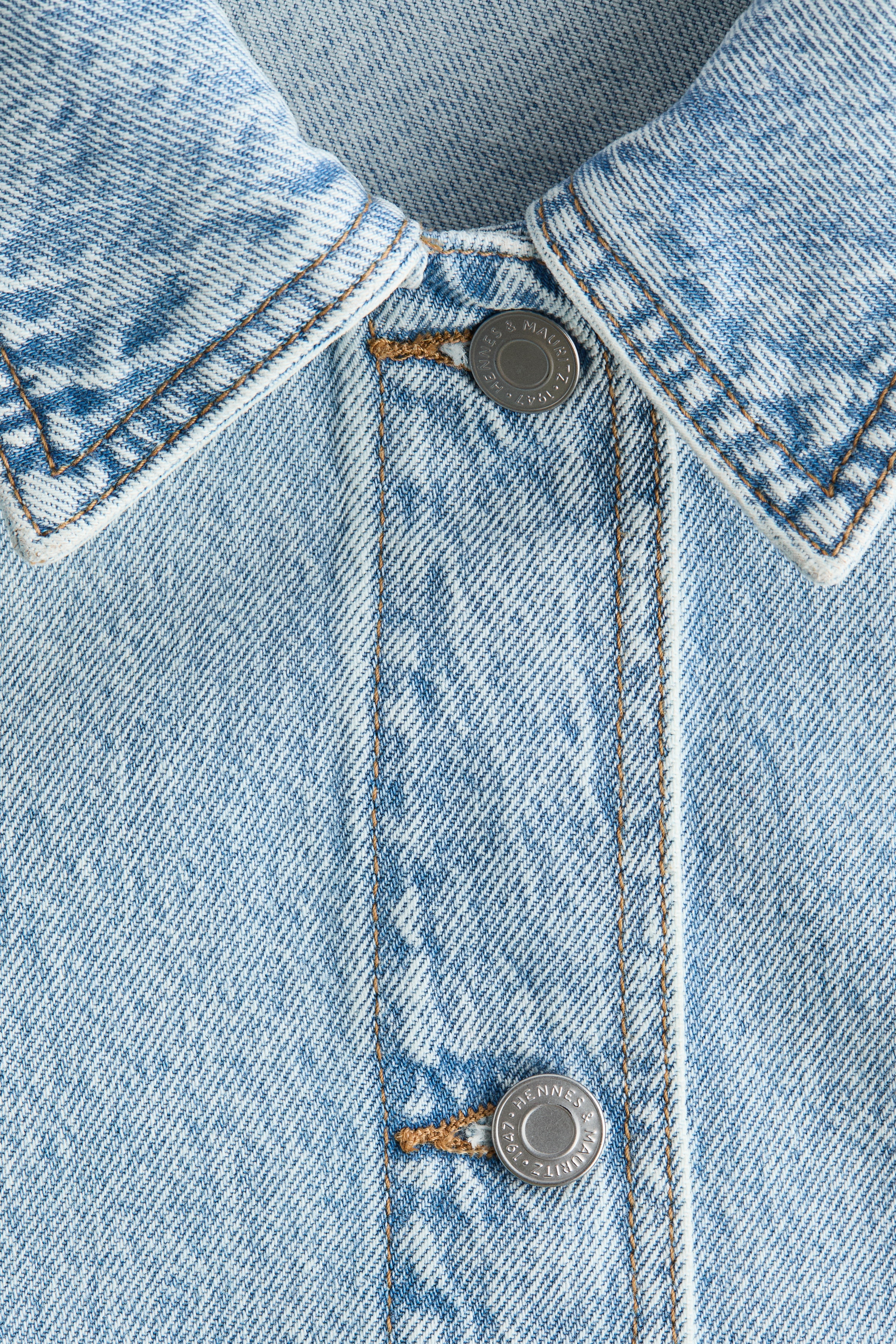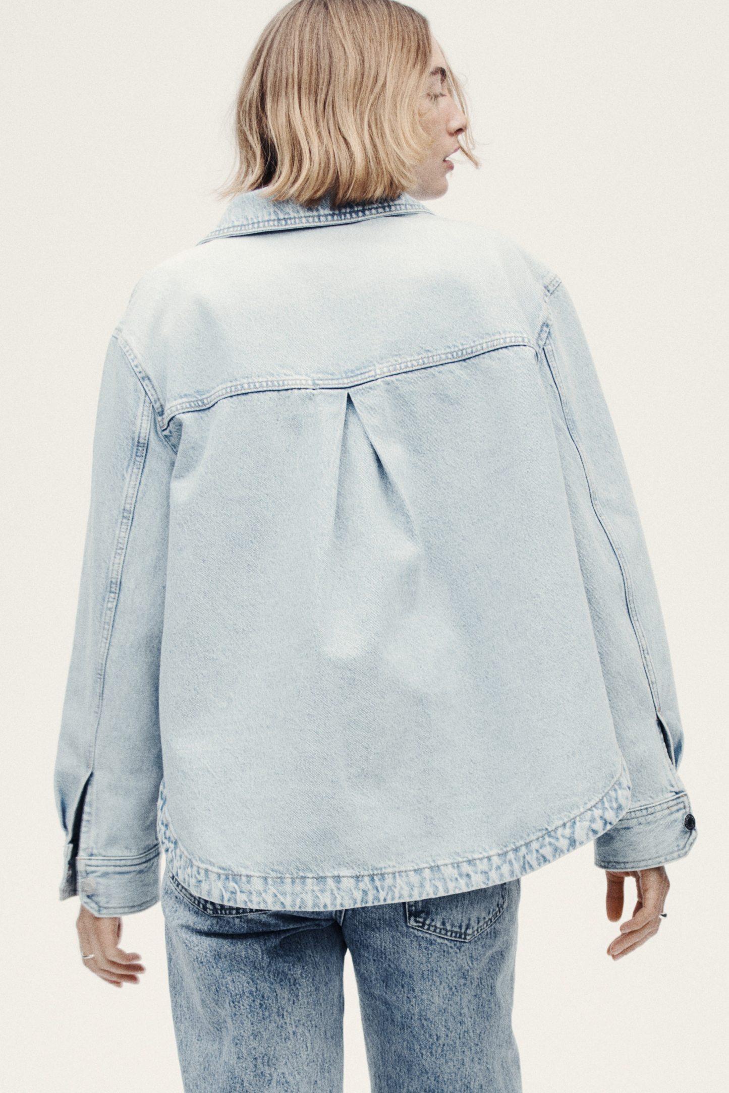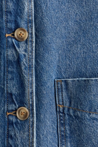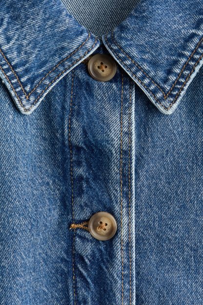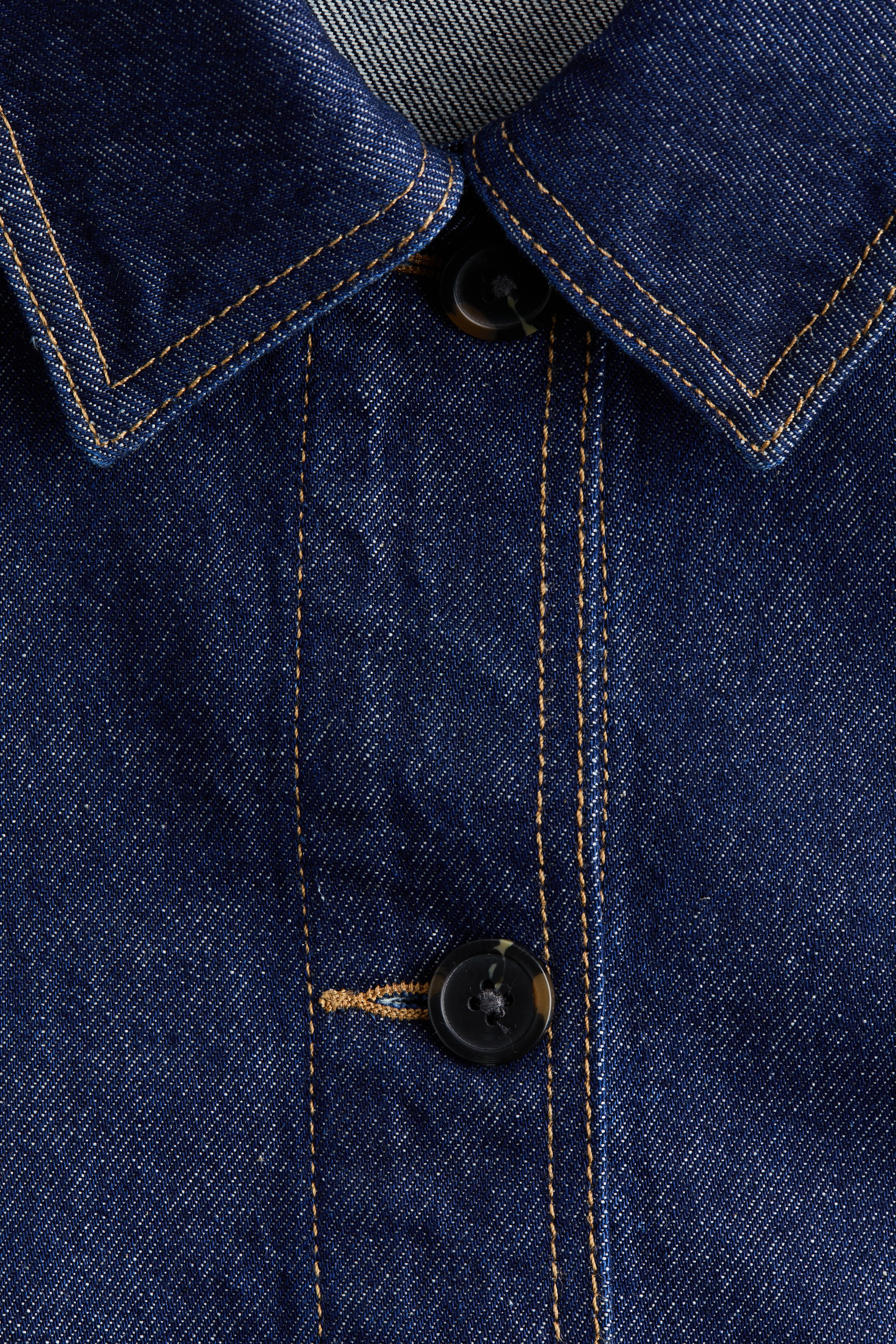 Fitted shacket in rigid denim with a collar and divs down the front. Yoke at the back with an inverted box pleat, and long sleeves with dived cuffs. Patch front pockets and a rounded hem.