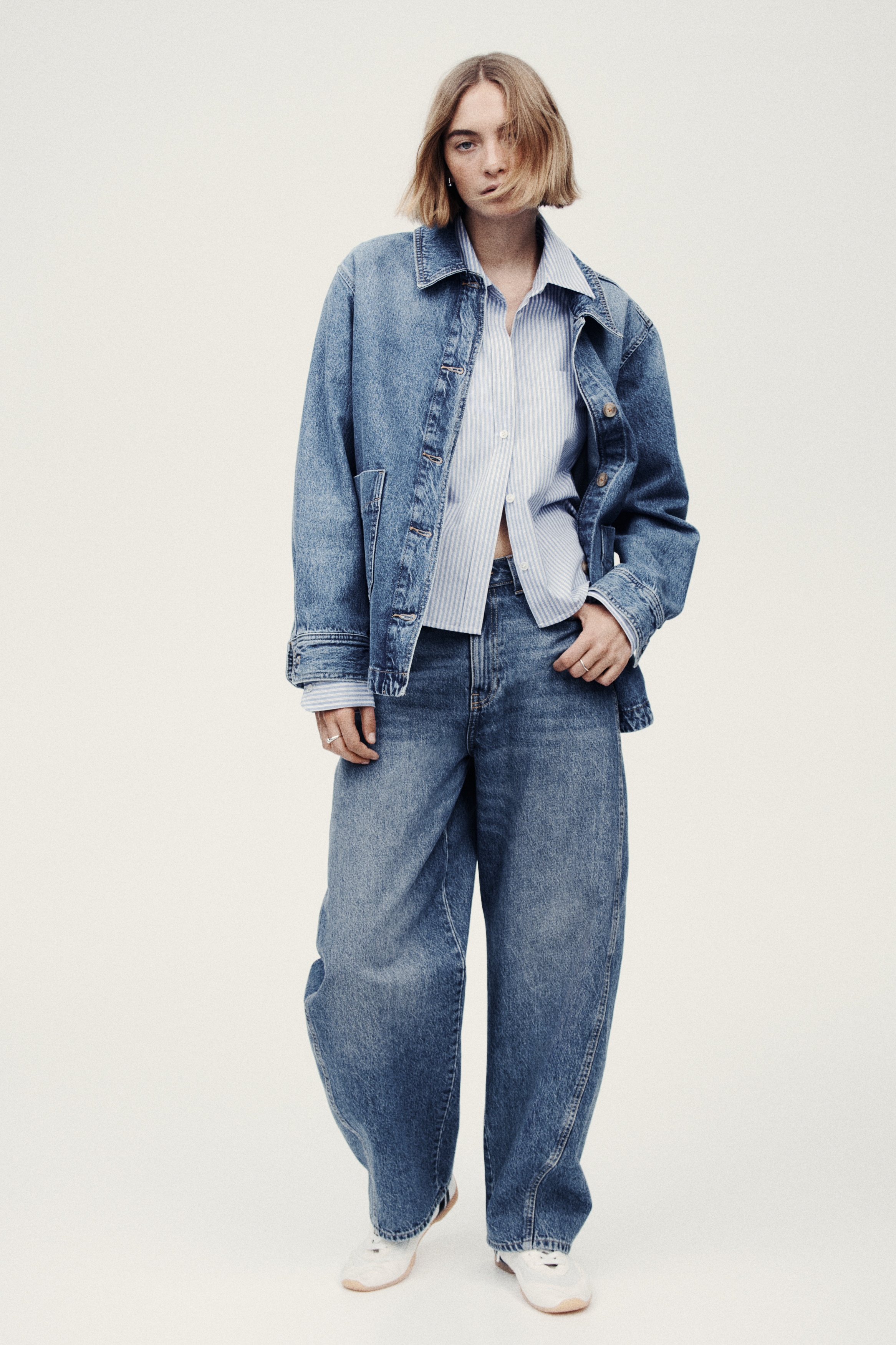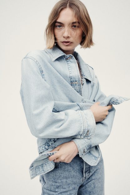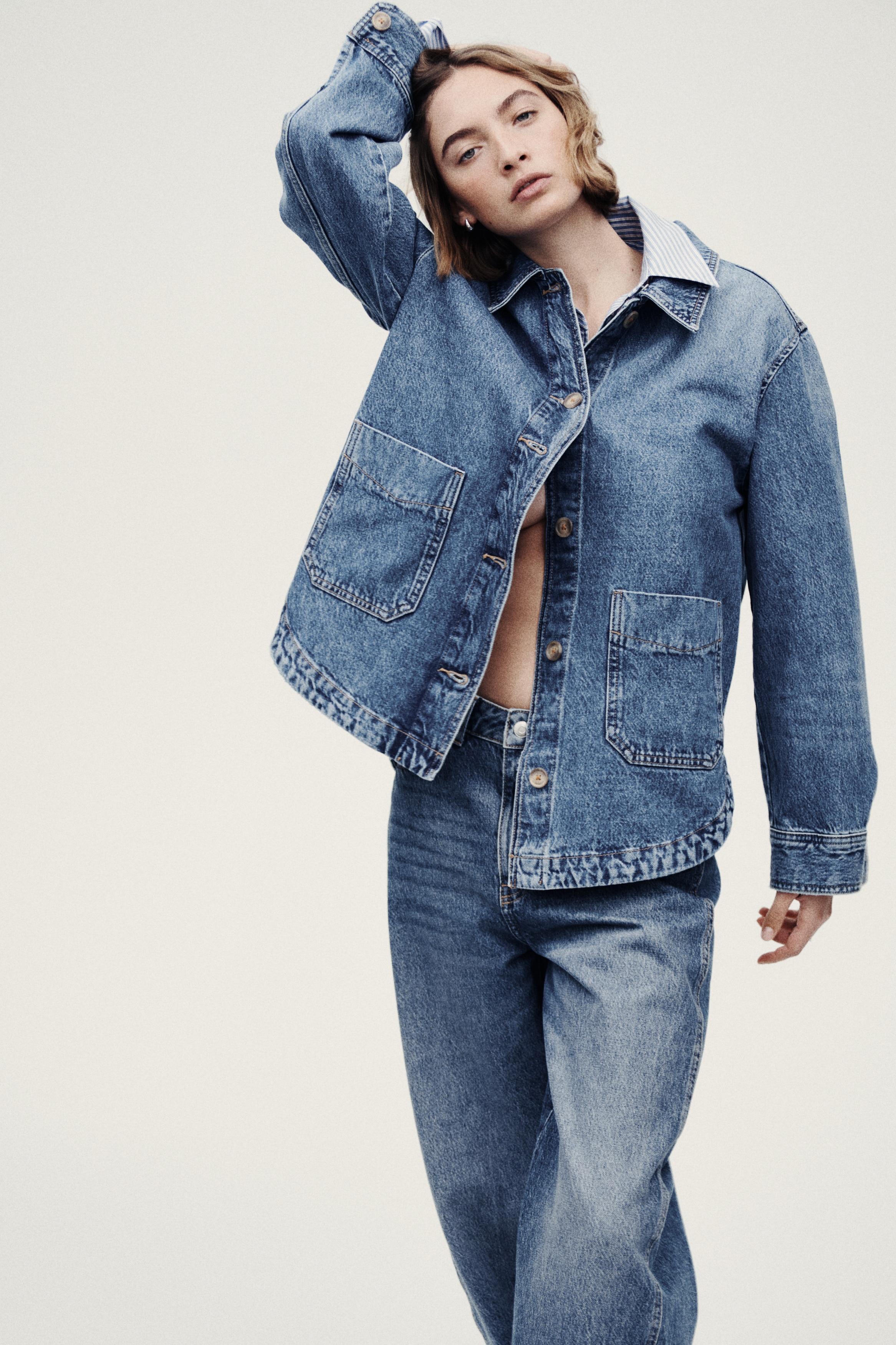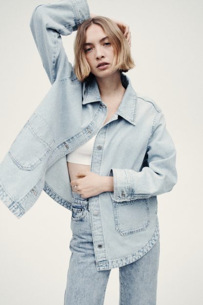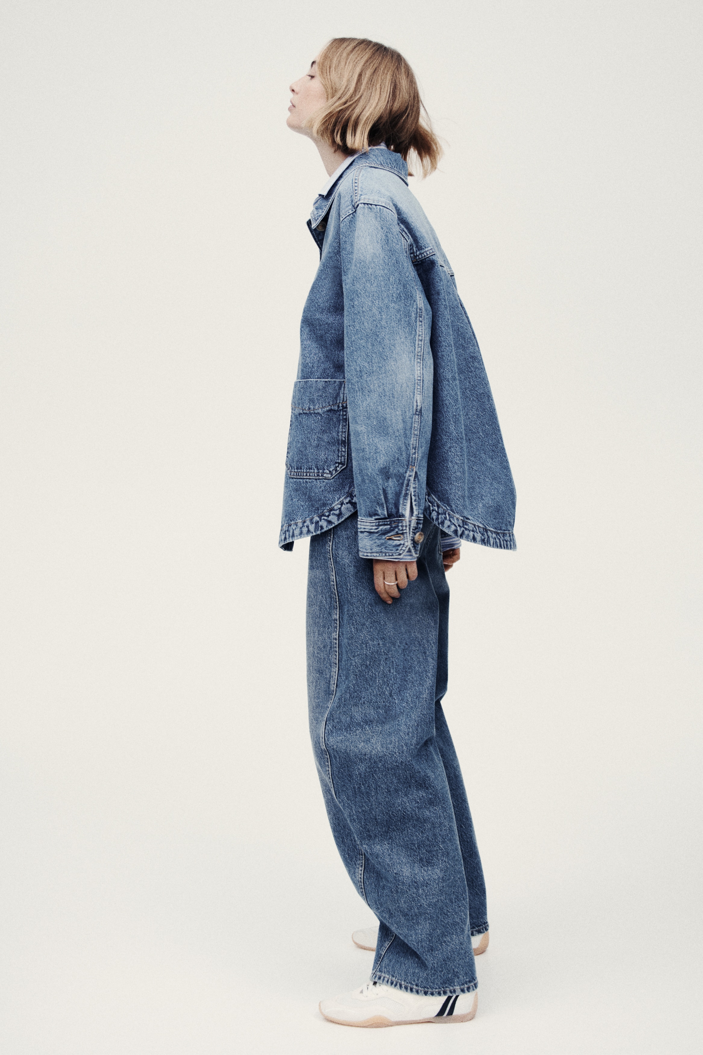 Fitted shacket in rigid denim with a collar and divs down the front. Yoke at the back with an inverted box pleat, and long sleeves with dived cuffs. Patch front pockets and a rounded hem.