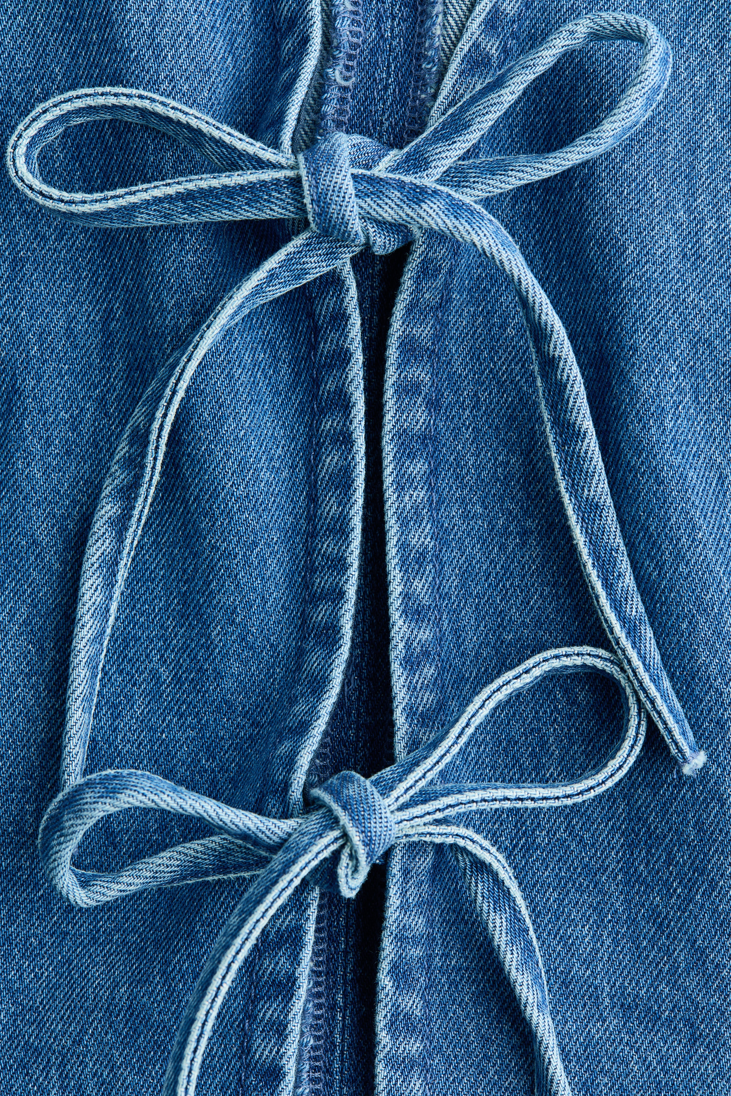 Fitted waistcoat in cotton denim with a V-neckline and two sets of narrow ties at the front.