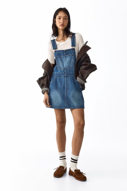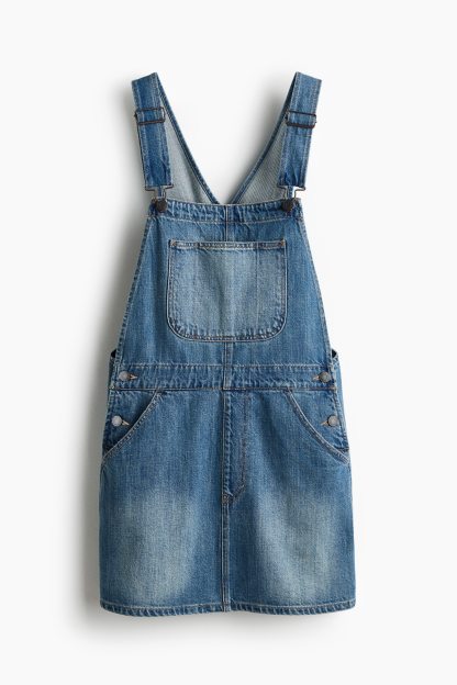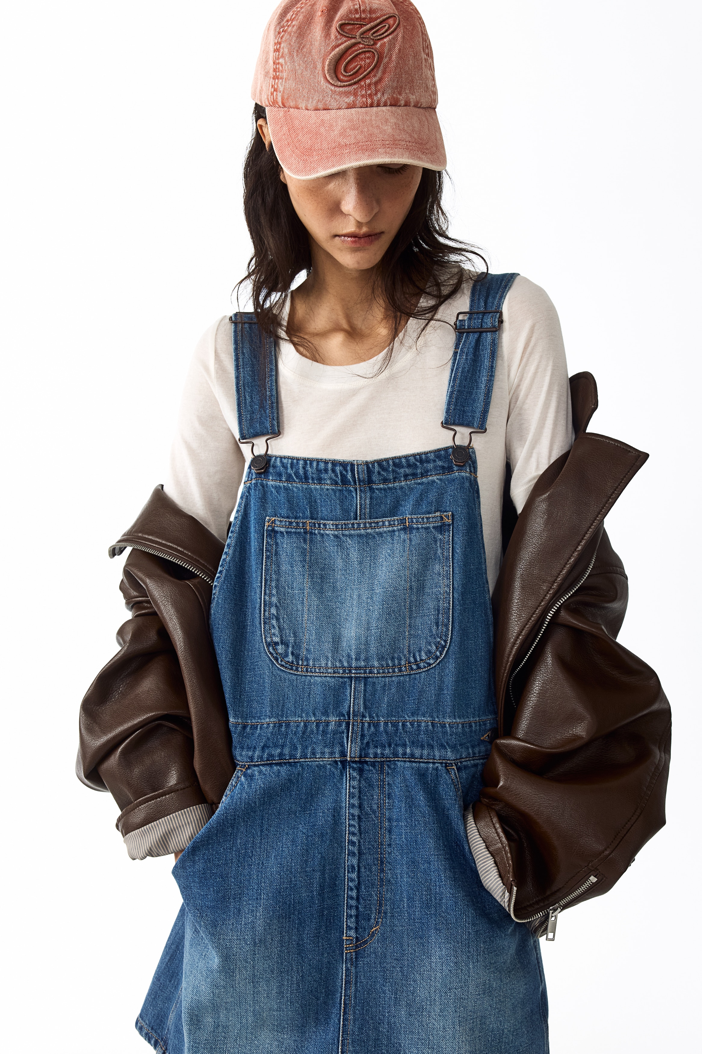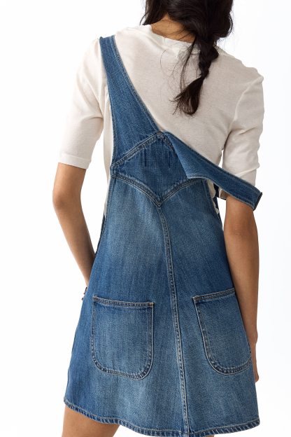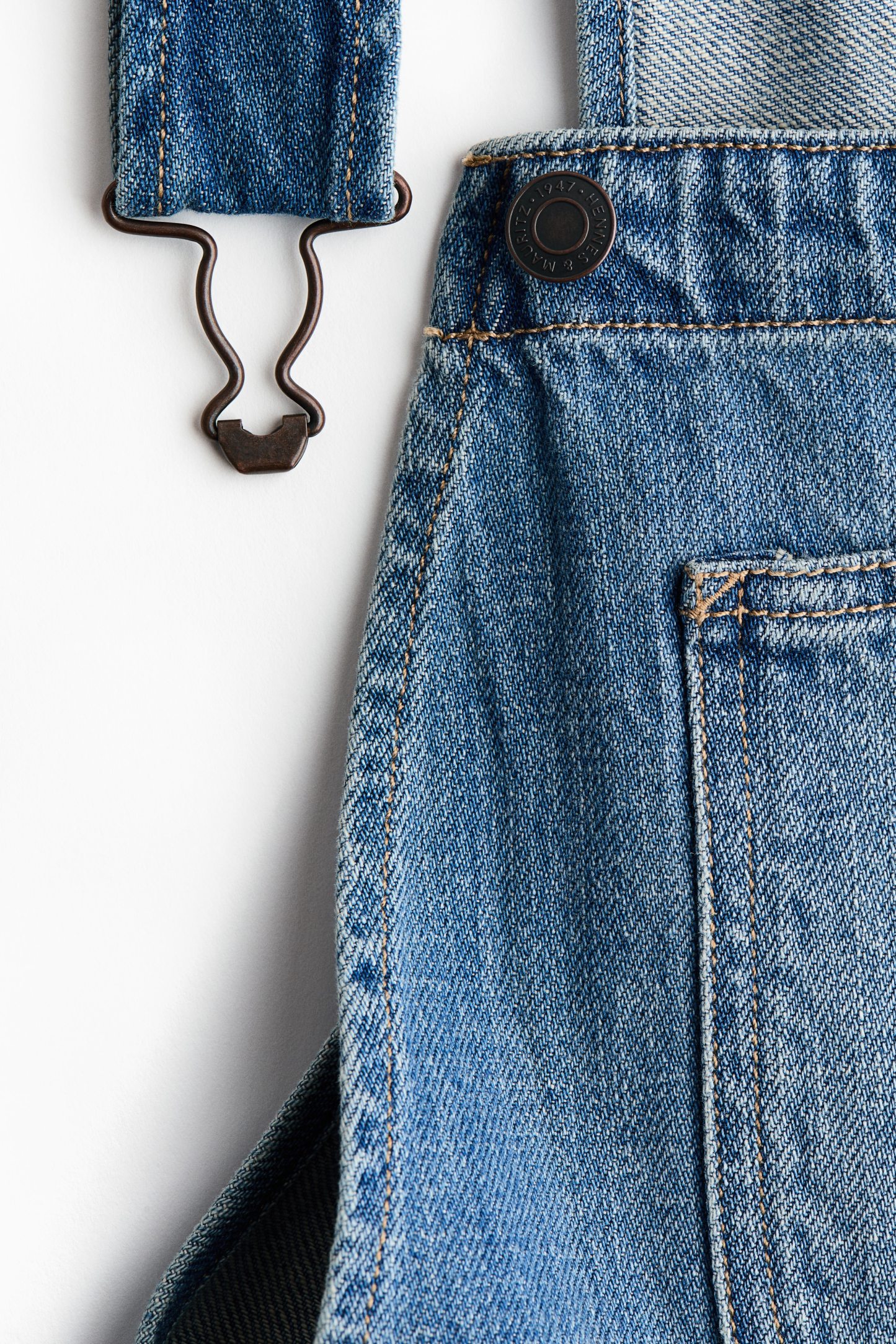 Short, loose-fit dungaree dress in cotton denim featuring adjustable straps with metal fasteners, divs at the sides and a fake fly. Chest pocket, diagonal side pockets and patch back pockets.