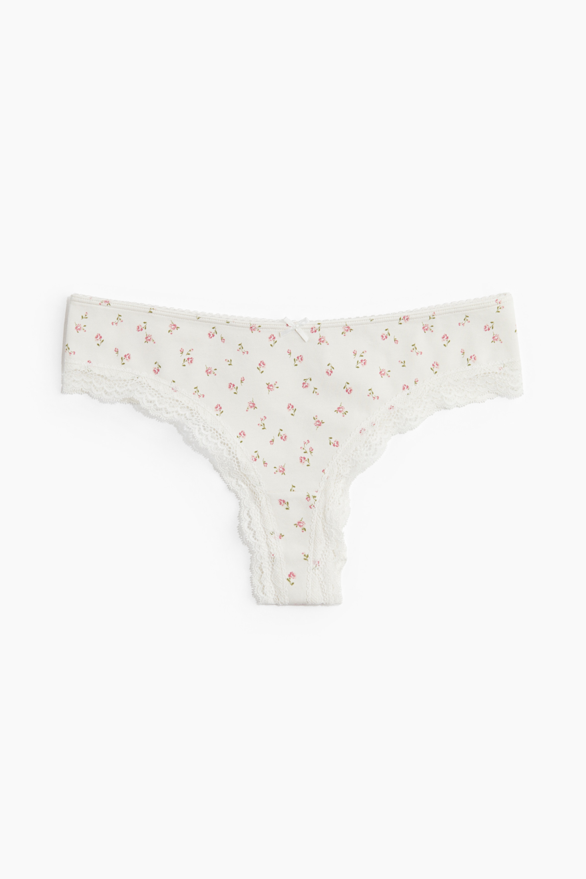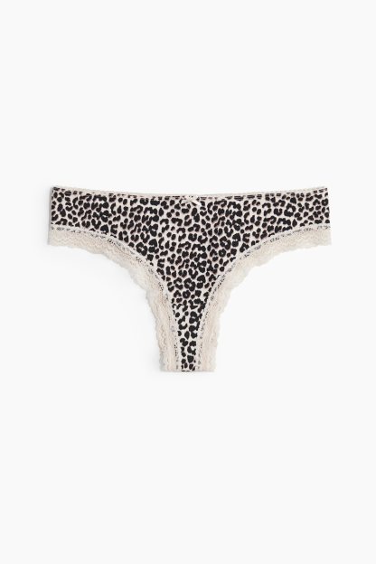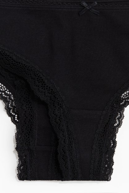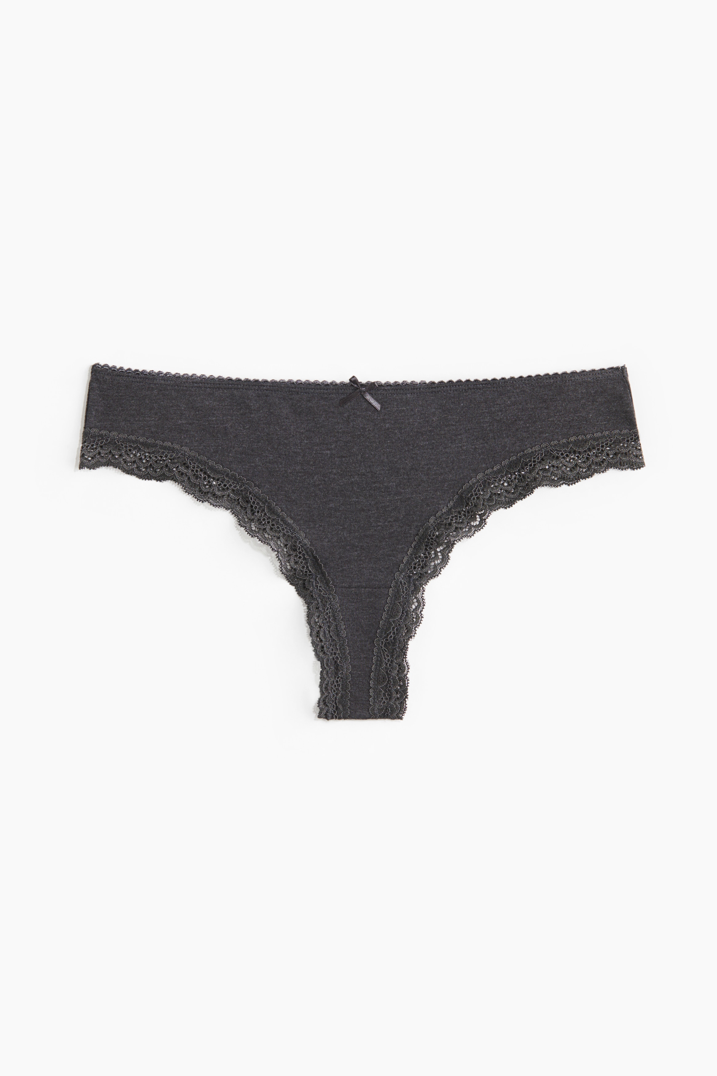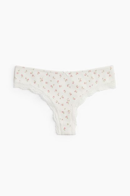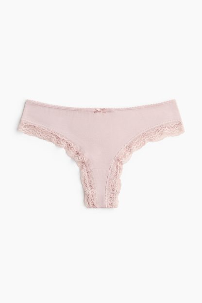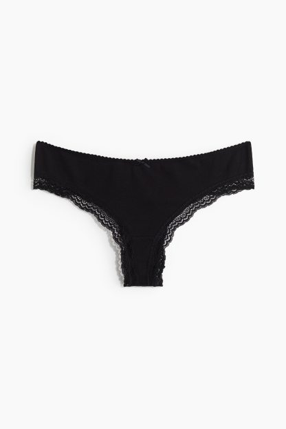 Brazilian briefs with lace trims. Low waist, lined gusset and a high cut at the back.
