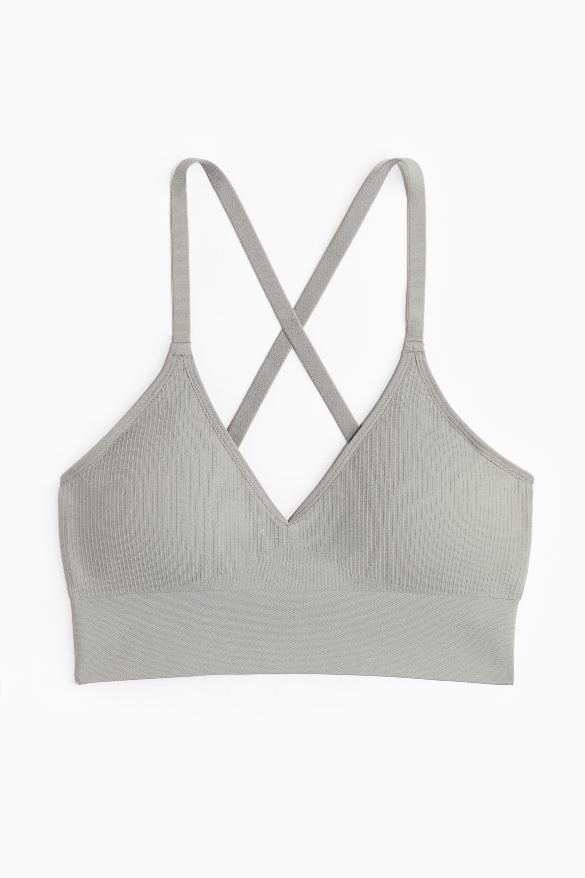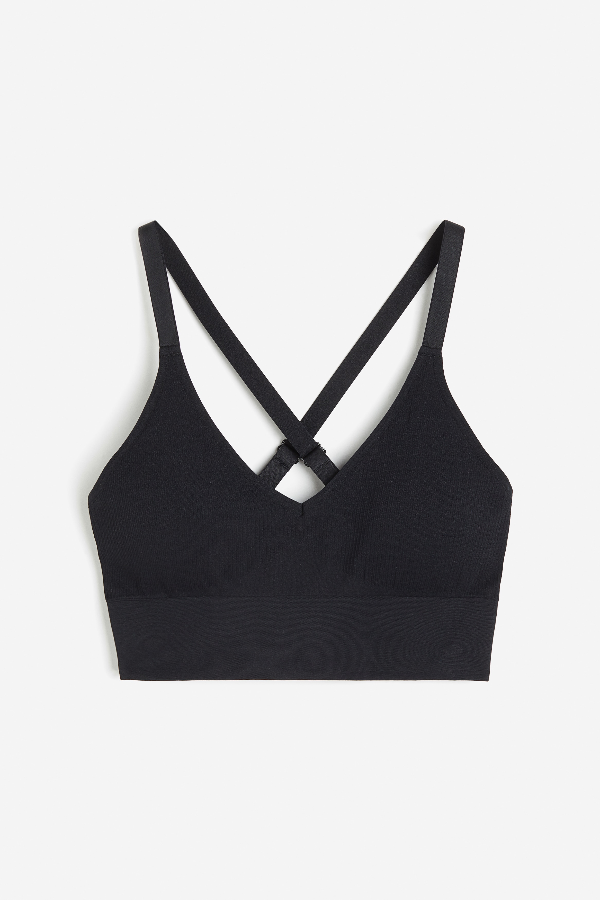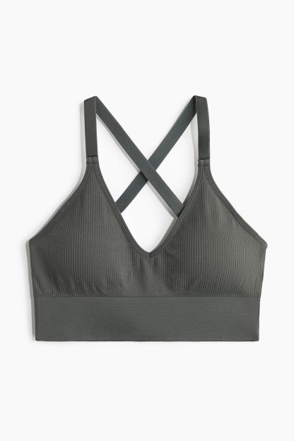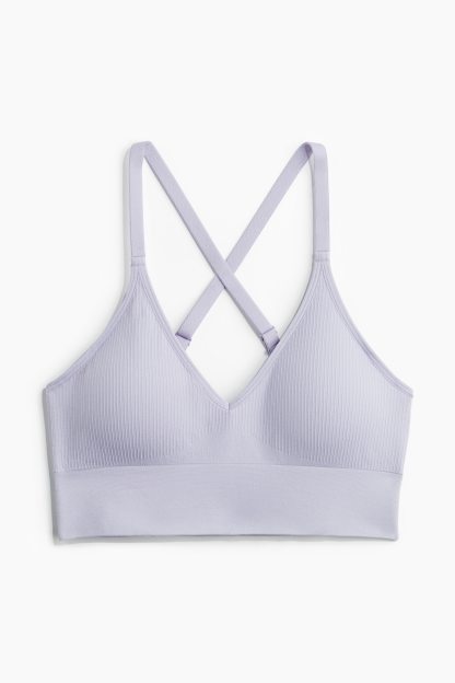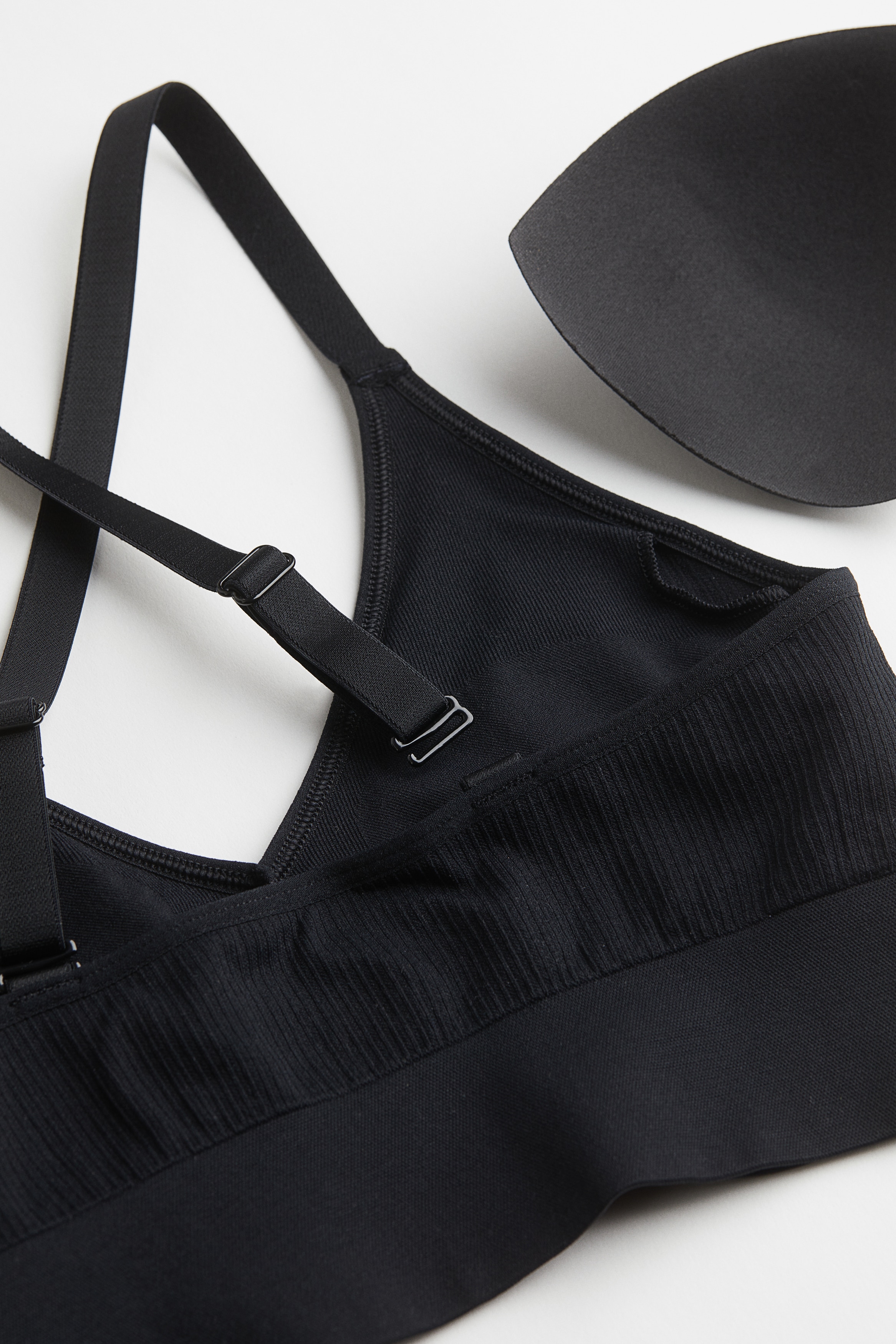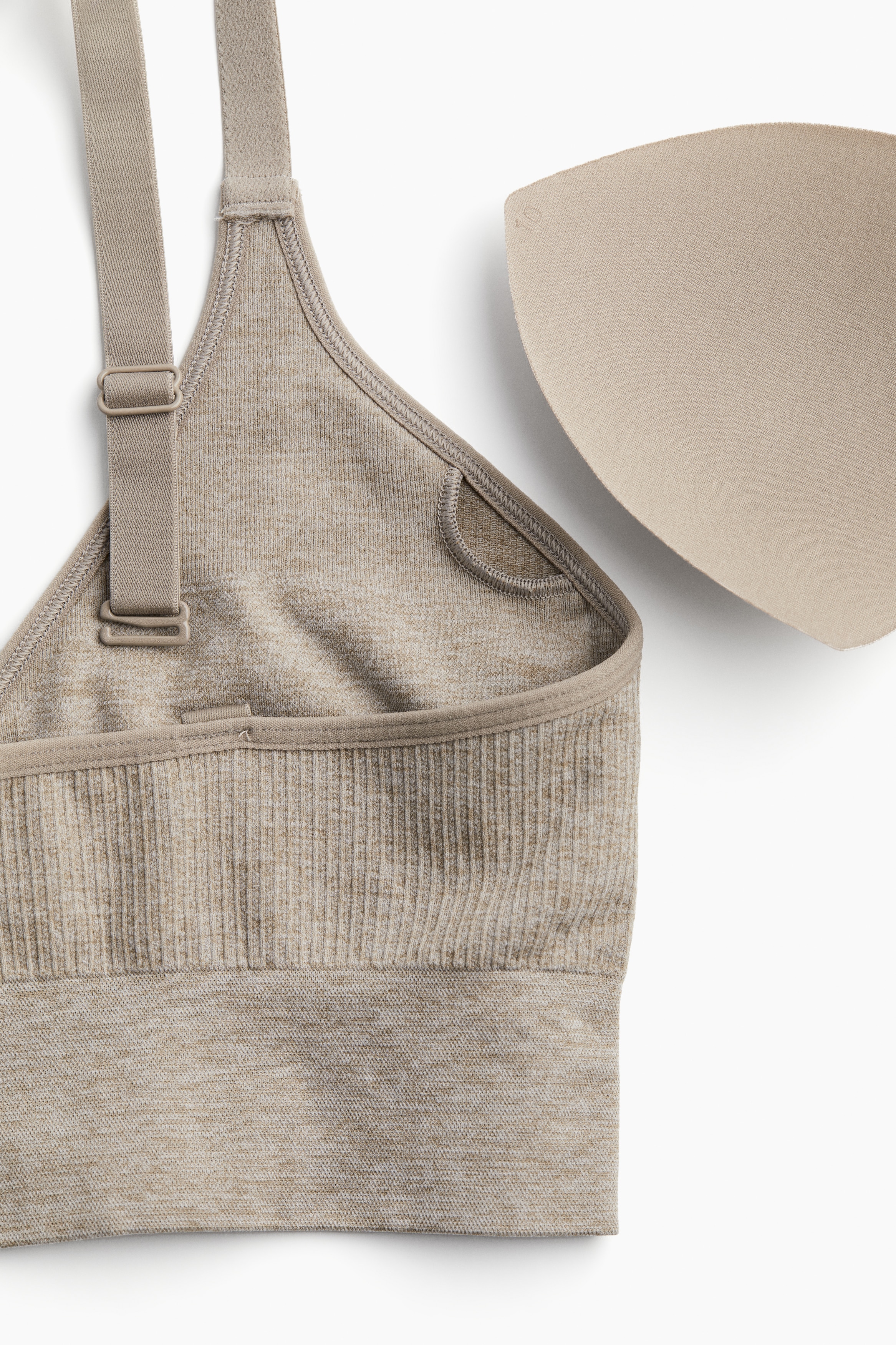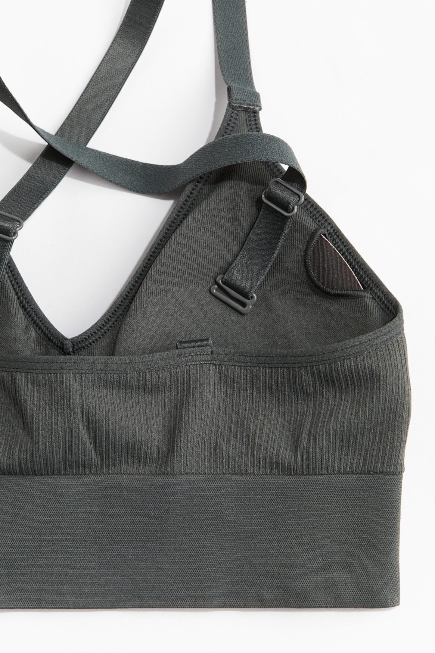 Sports bra in functional fabric made with DryMove™, which helps pull moisture away from your skin, keeping you comfortably dry while moving. Adjustable shoulder straps that can be fastened in various ways at the back, lined cups with removable inserts for an adjustable fit and to shape the bust, and wide elastication at the hem. Medium support suitable for moderate-intensity workouts. The bra is designed with the minimum number of seams for a more comfortable fit and increased mobility.