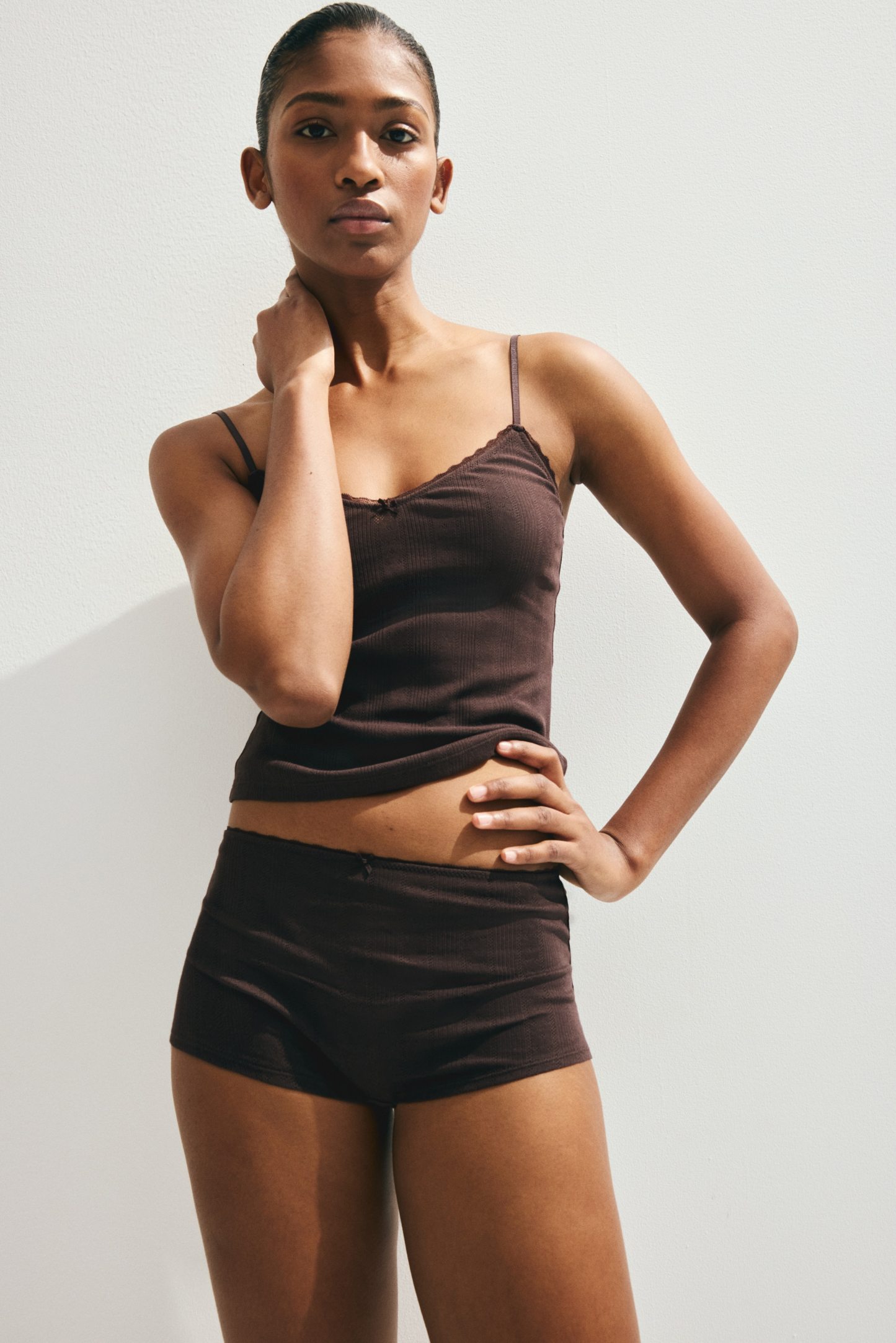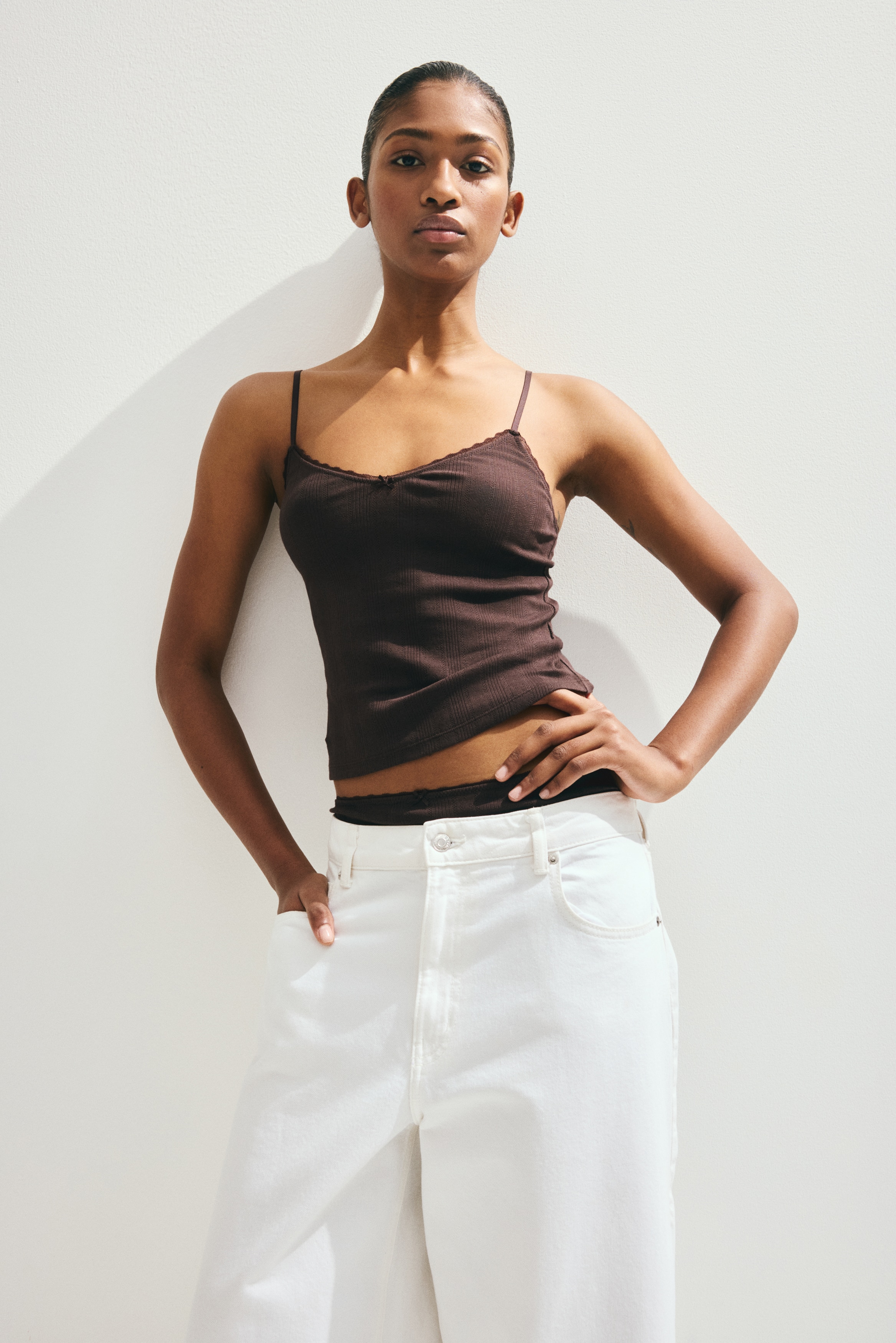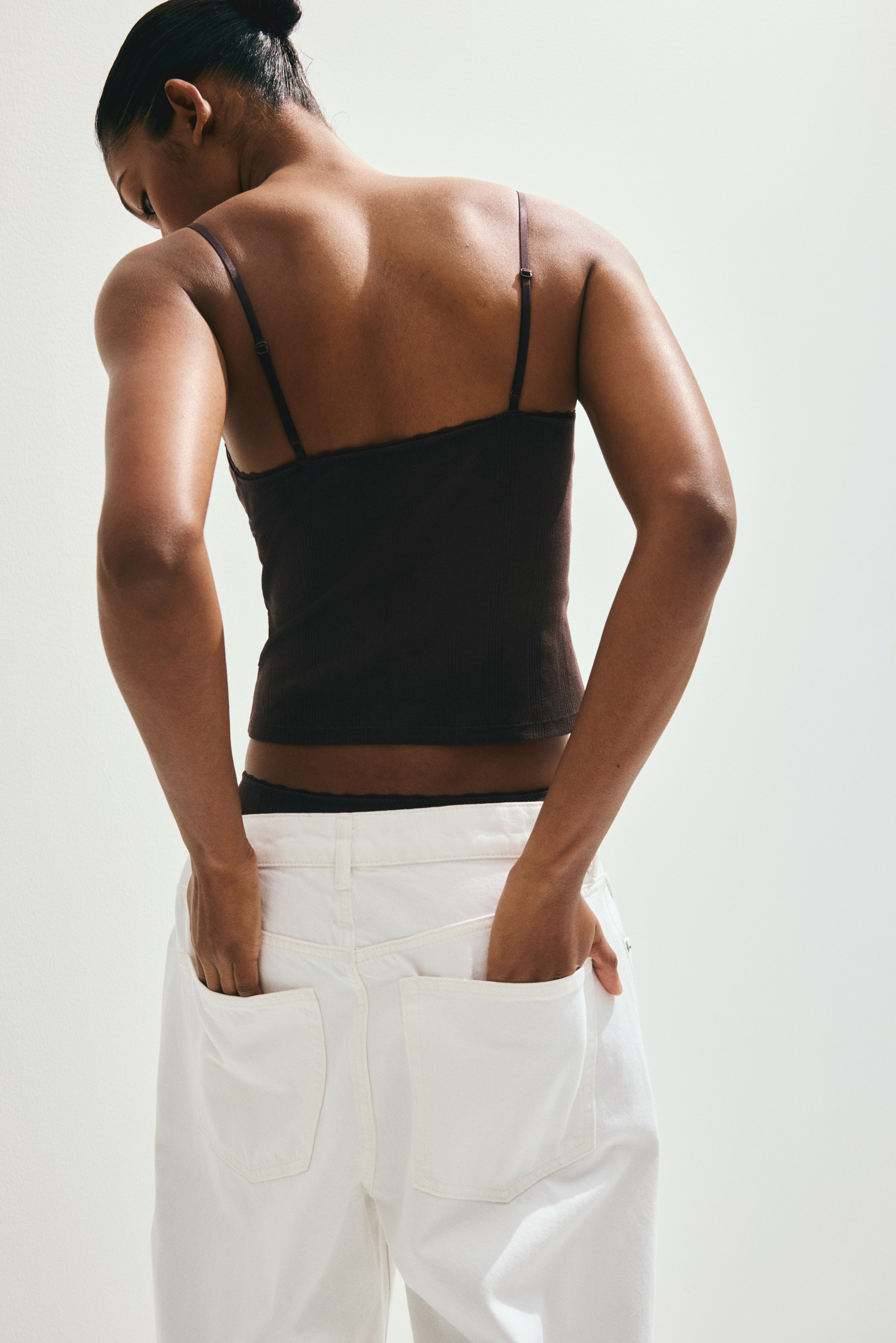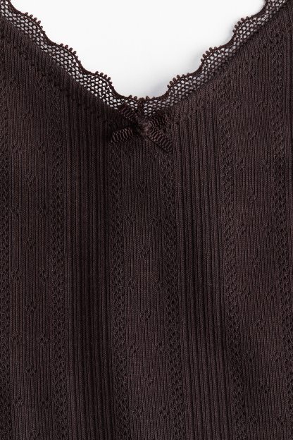 Short top in cotton pointelle jersey with adjustable shoulder straps and a V-shaped neckline.