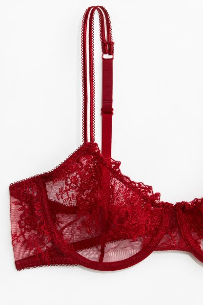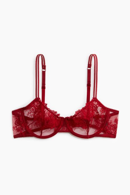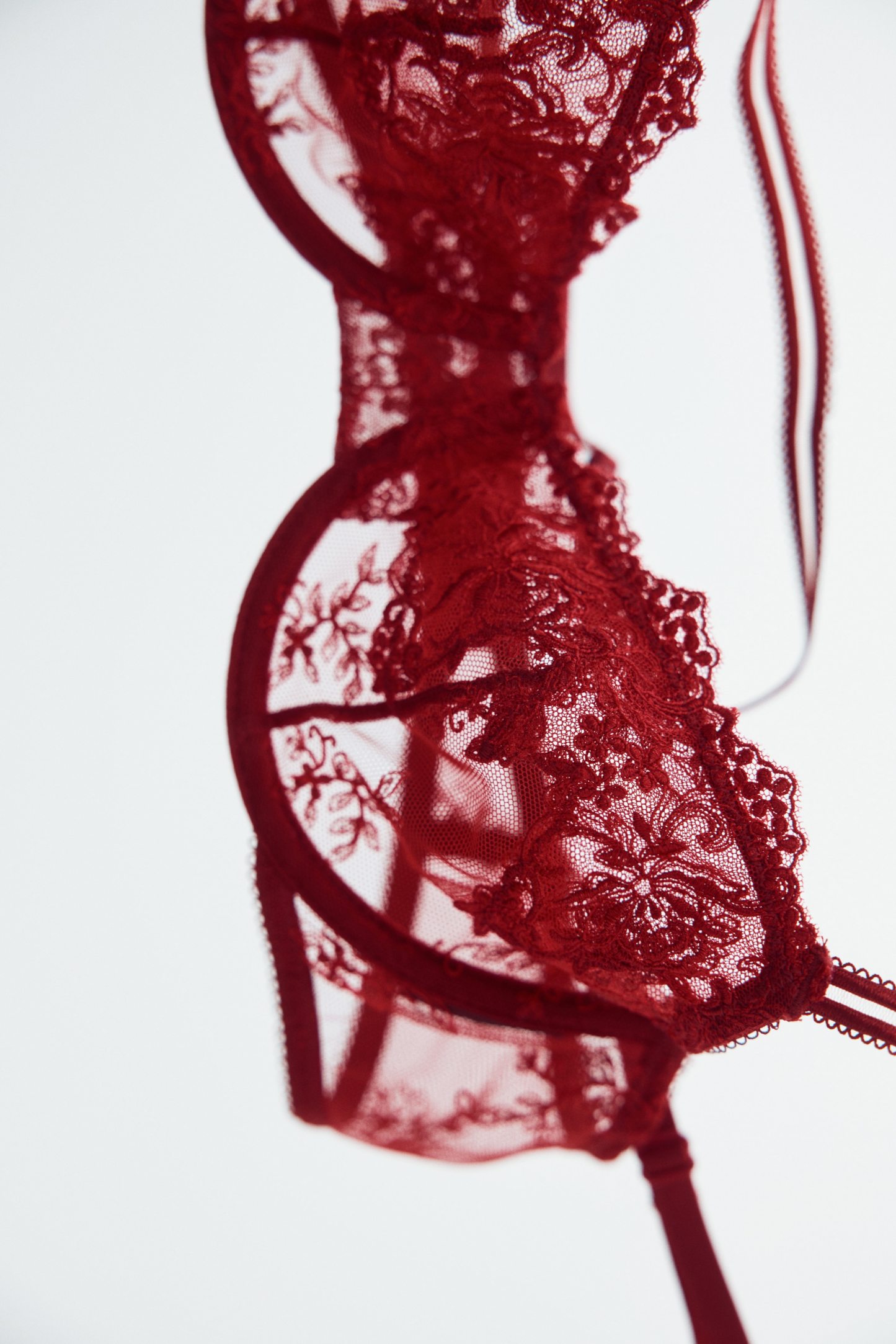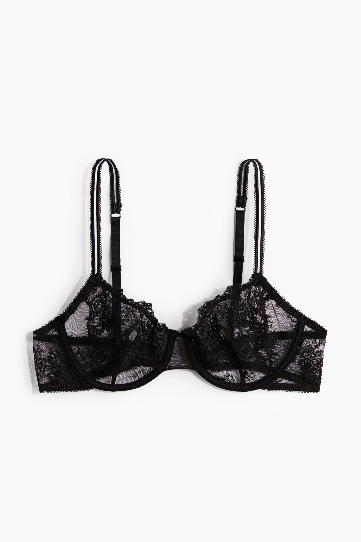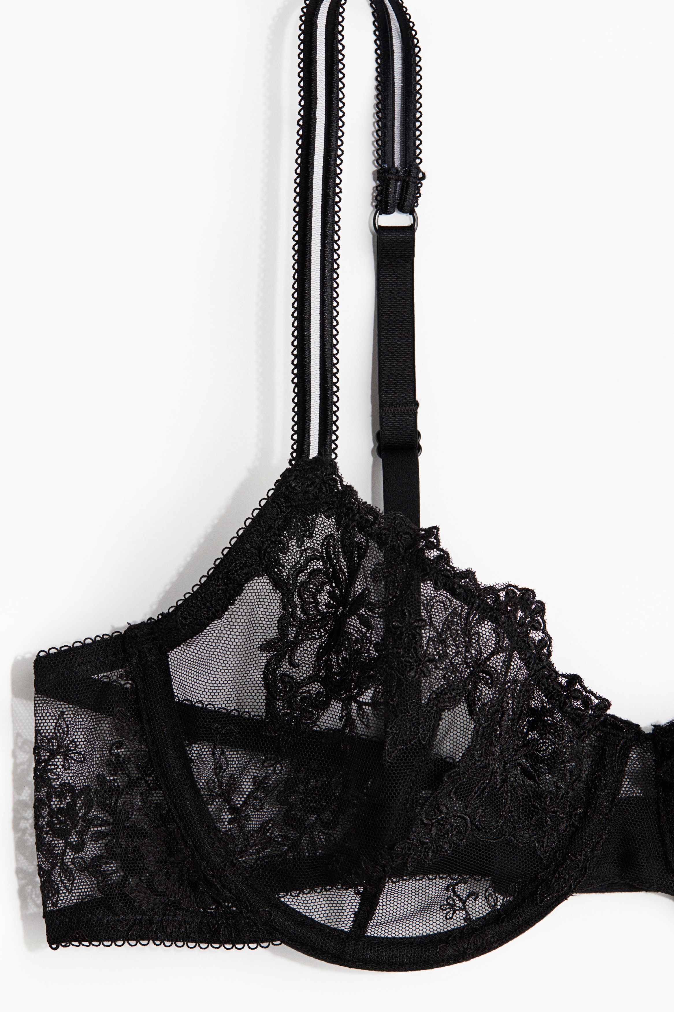 Bra in embroidered mesh with adjustable shoulder straps and underwired cups that give the bust a natural shape and provide light support. Hook-and-eye fastening at the back.
