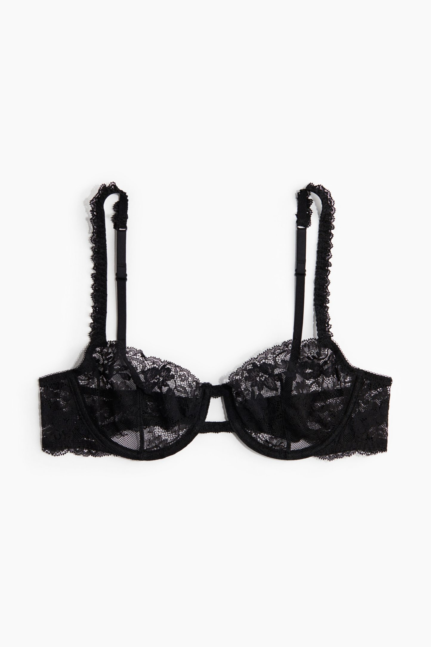 Bra in lace with adjustable shoulder straps and underwired, unlined cups that give the bust a natural shape and provide light support. Hook-and-eye fastening at the back.
